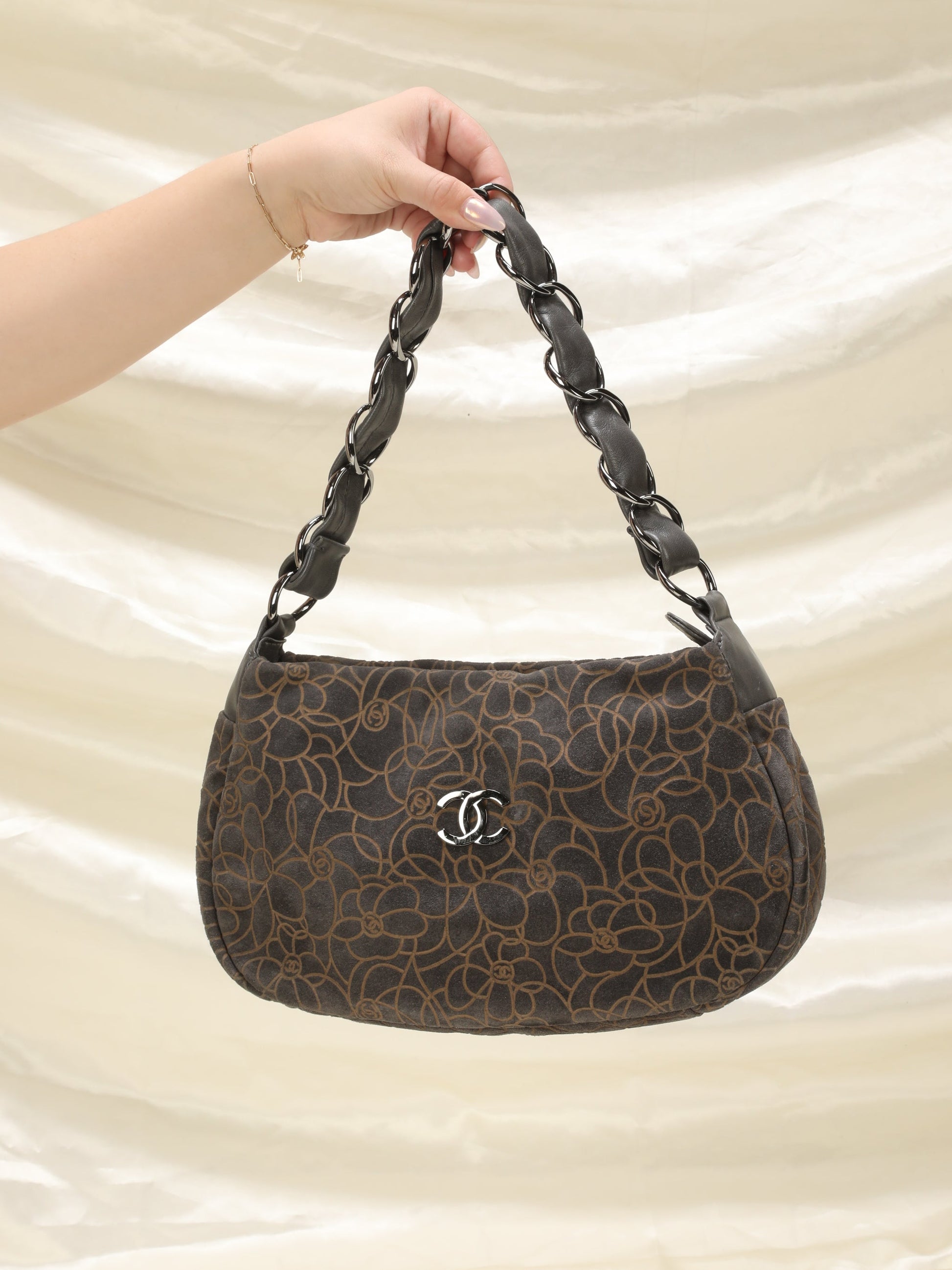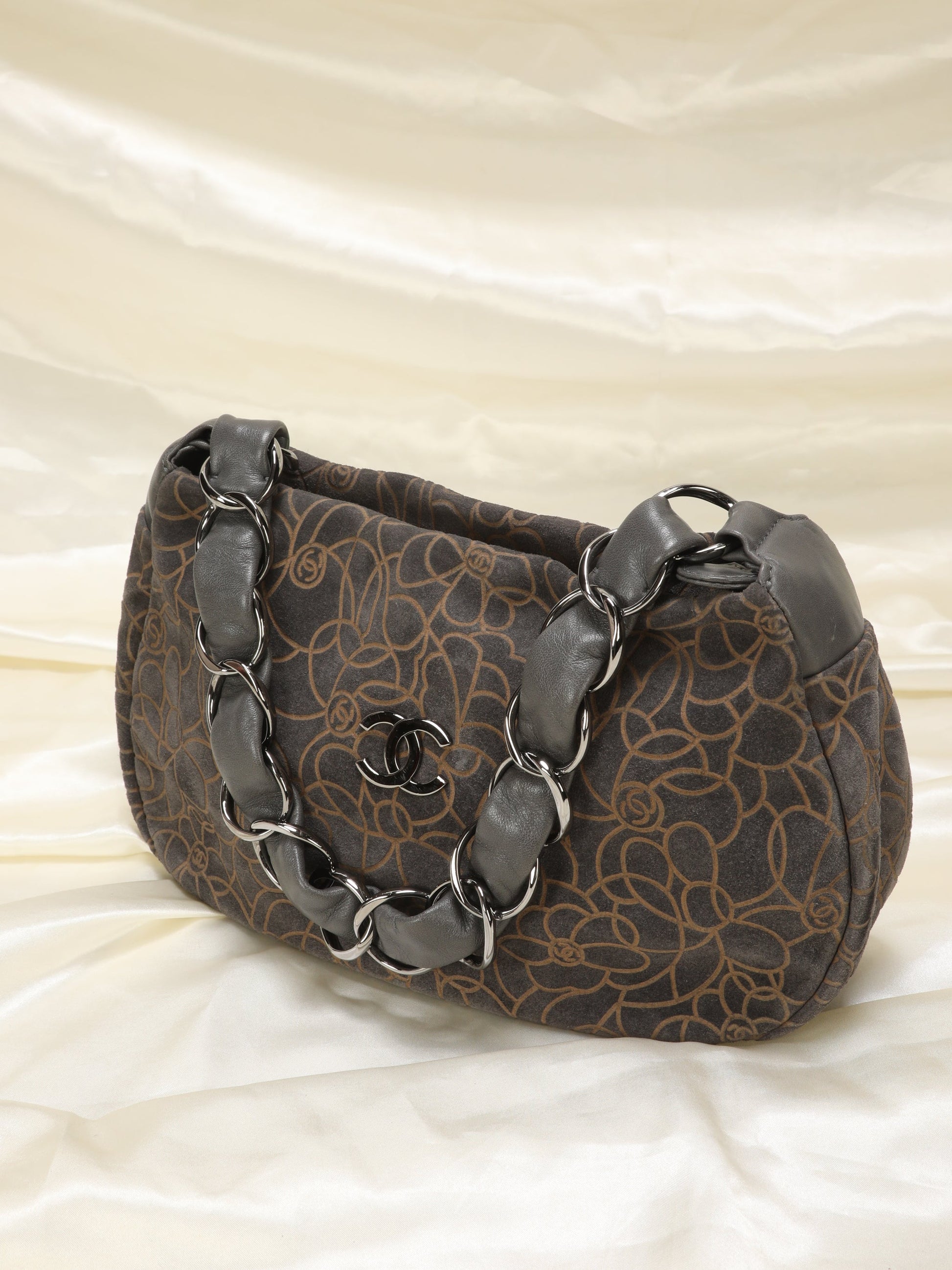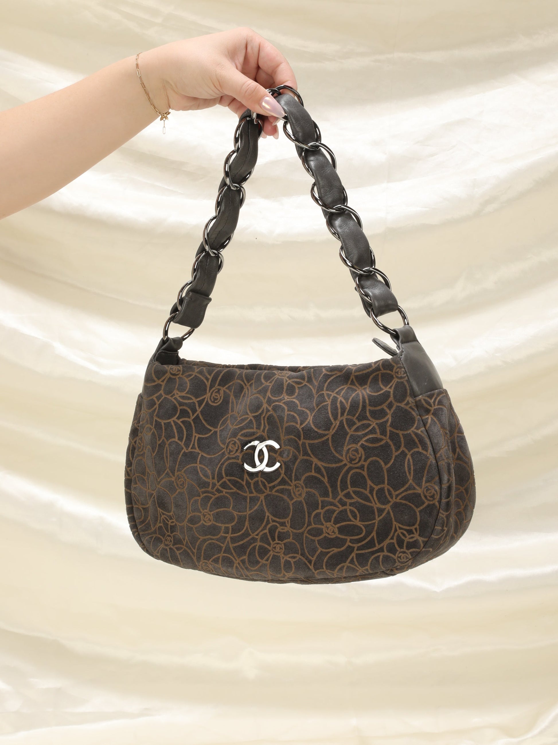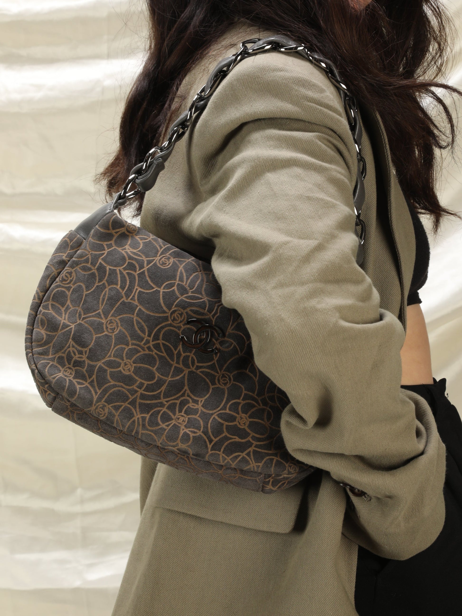 Stunning suede Chanel adorned in the Camellia and CC motifs. Beautiful chunky silver chain hardware. Perfect??size to??fit??just everything you need for the day.