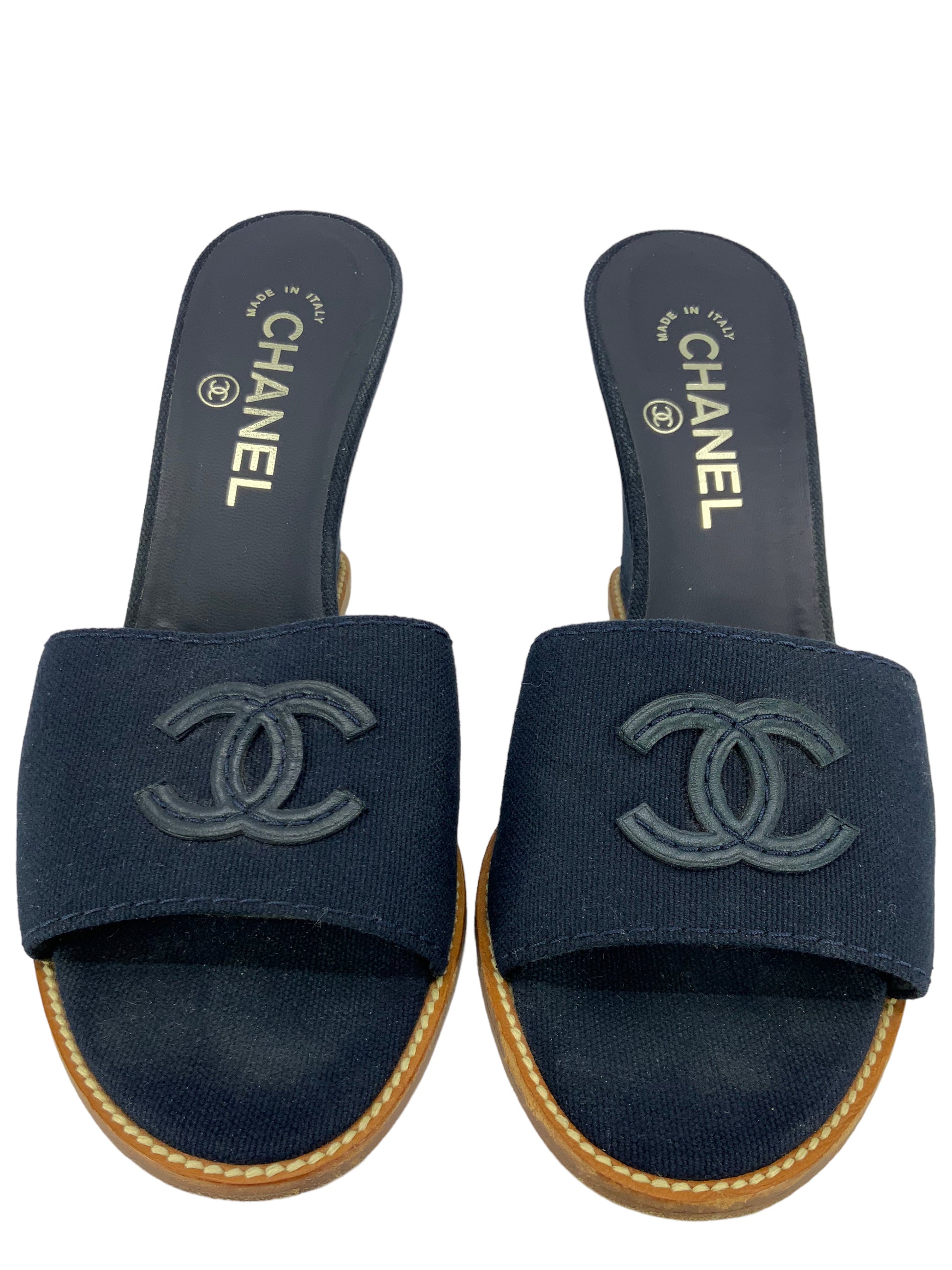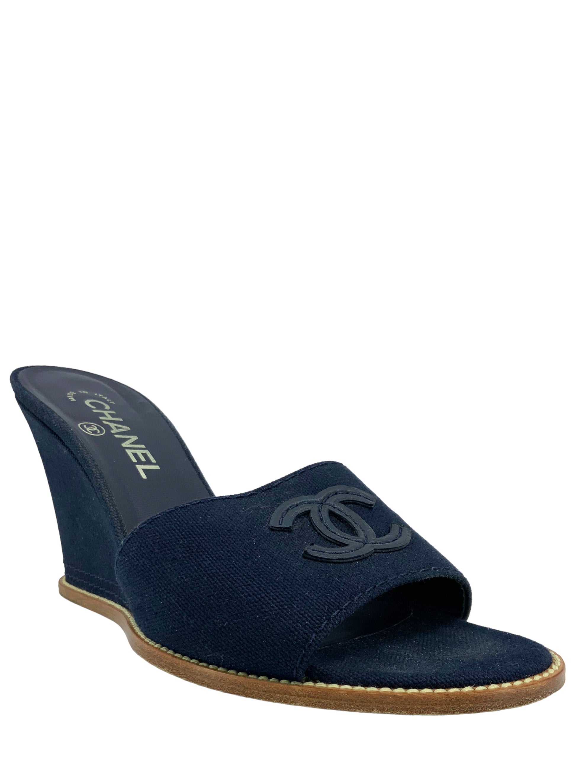 CHANEL Canvas CC Logo Wedge Sandals Size 8.5
