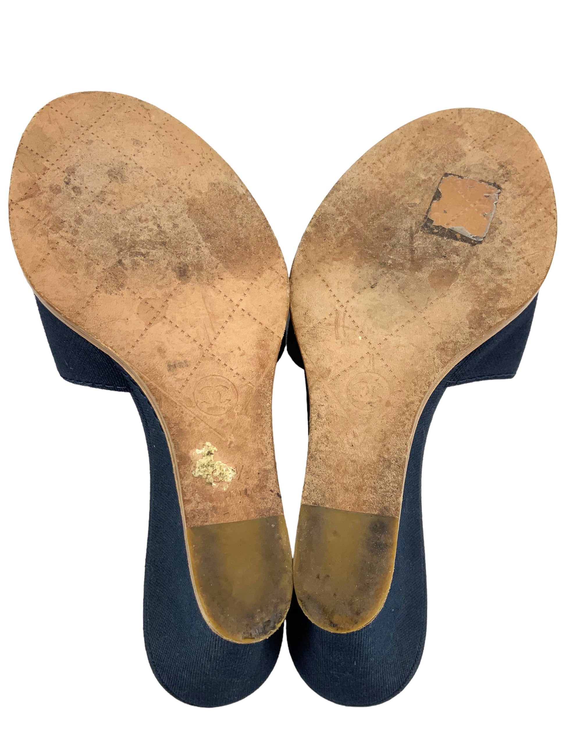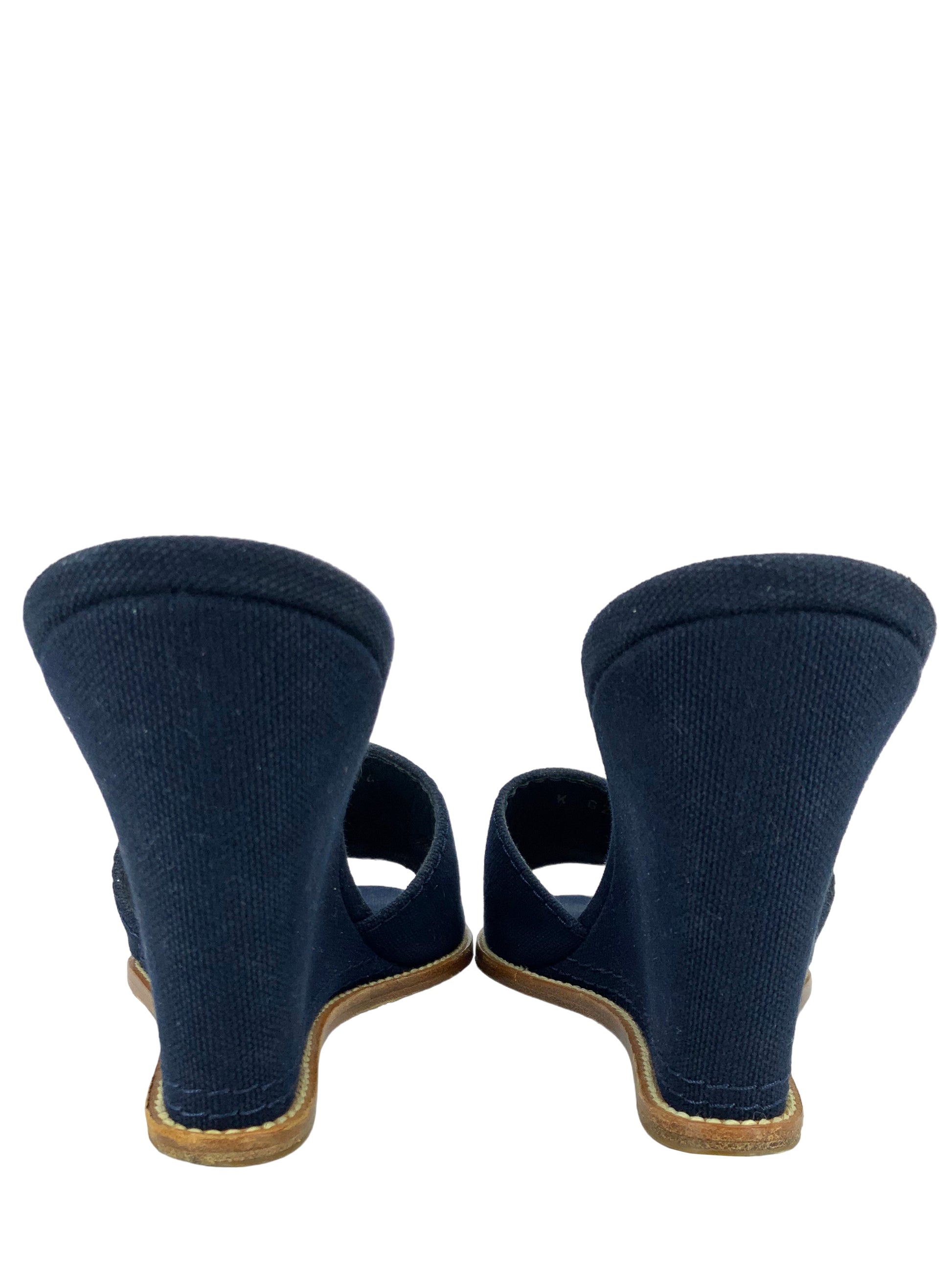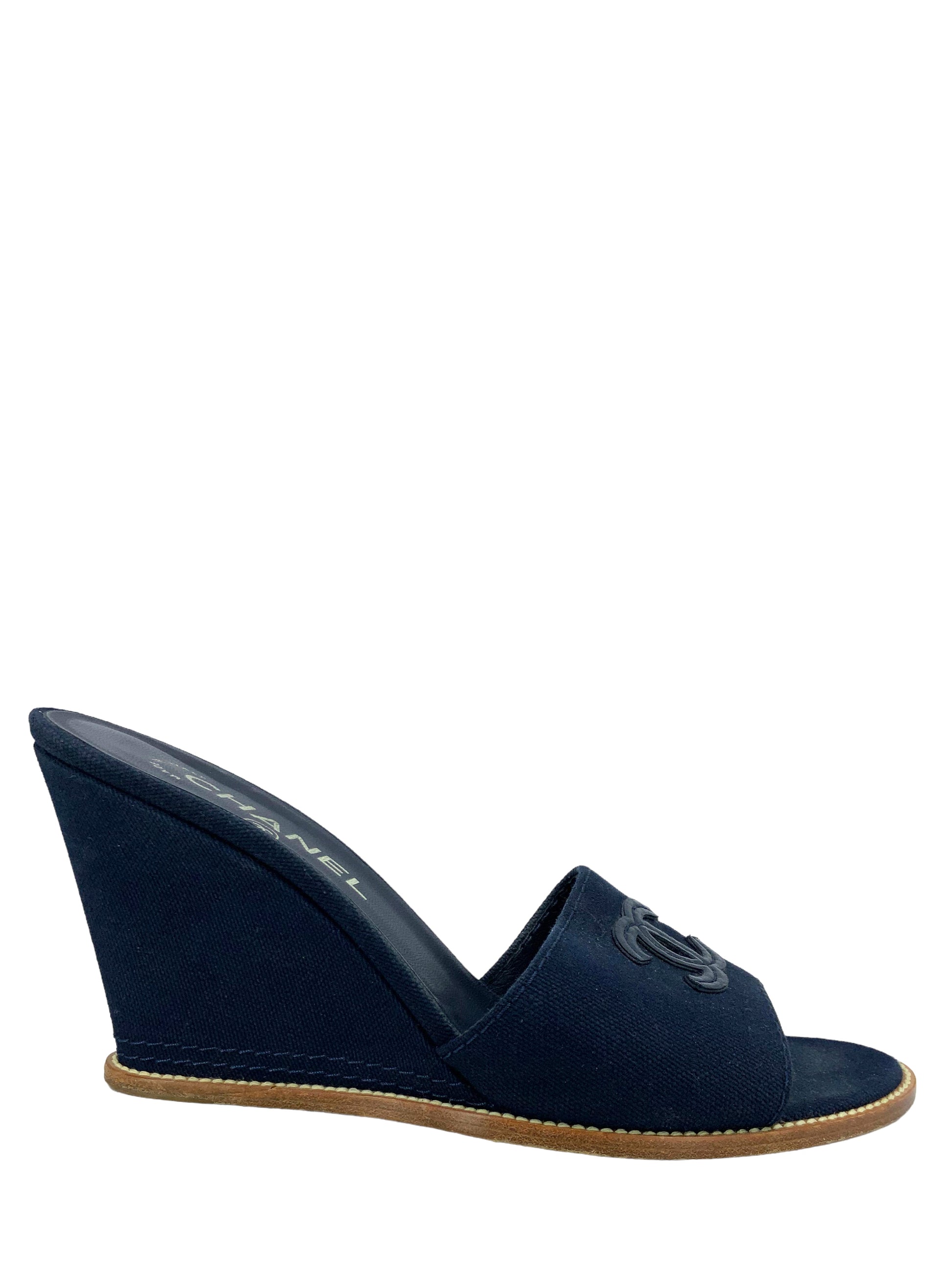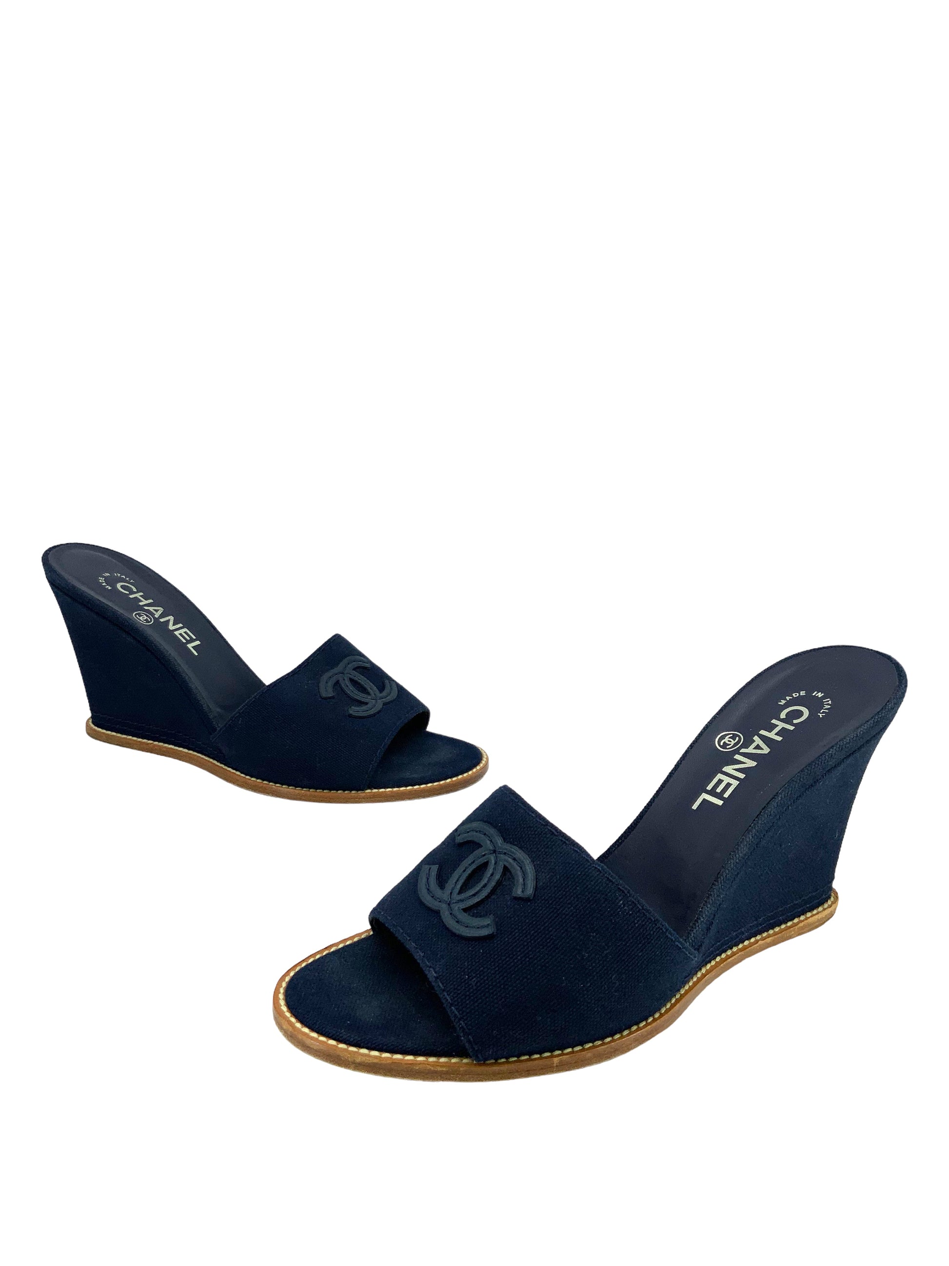Step out in style with this pair of CHANEL Canvas CC Logo Wedge Sandals Size 8.5 | 38.5 crafted from navy canvas.?Featuring a signature 'CC' stitched accent?on the vamp?and a self-covered wedge heel.