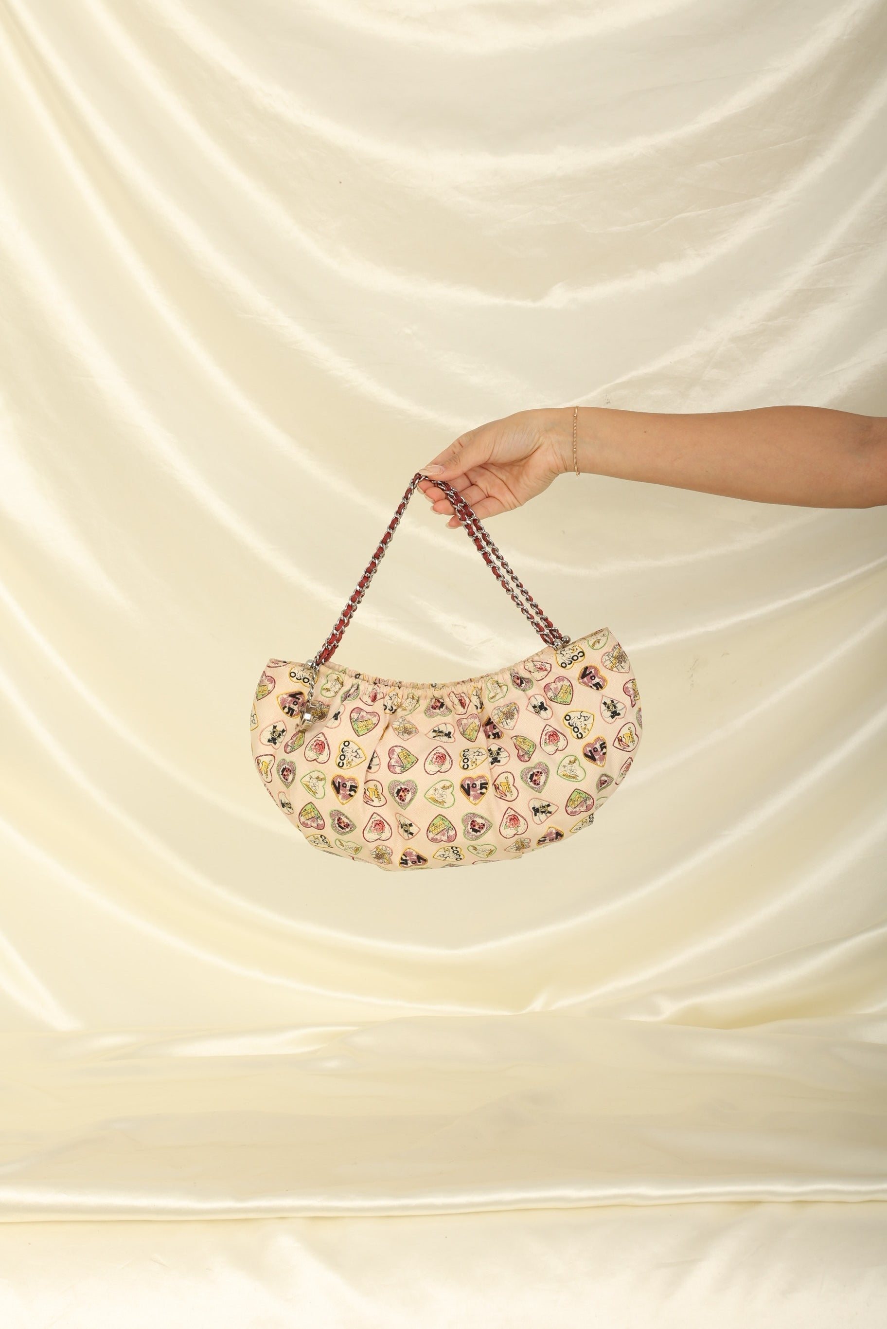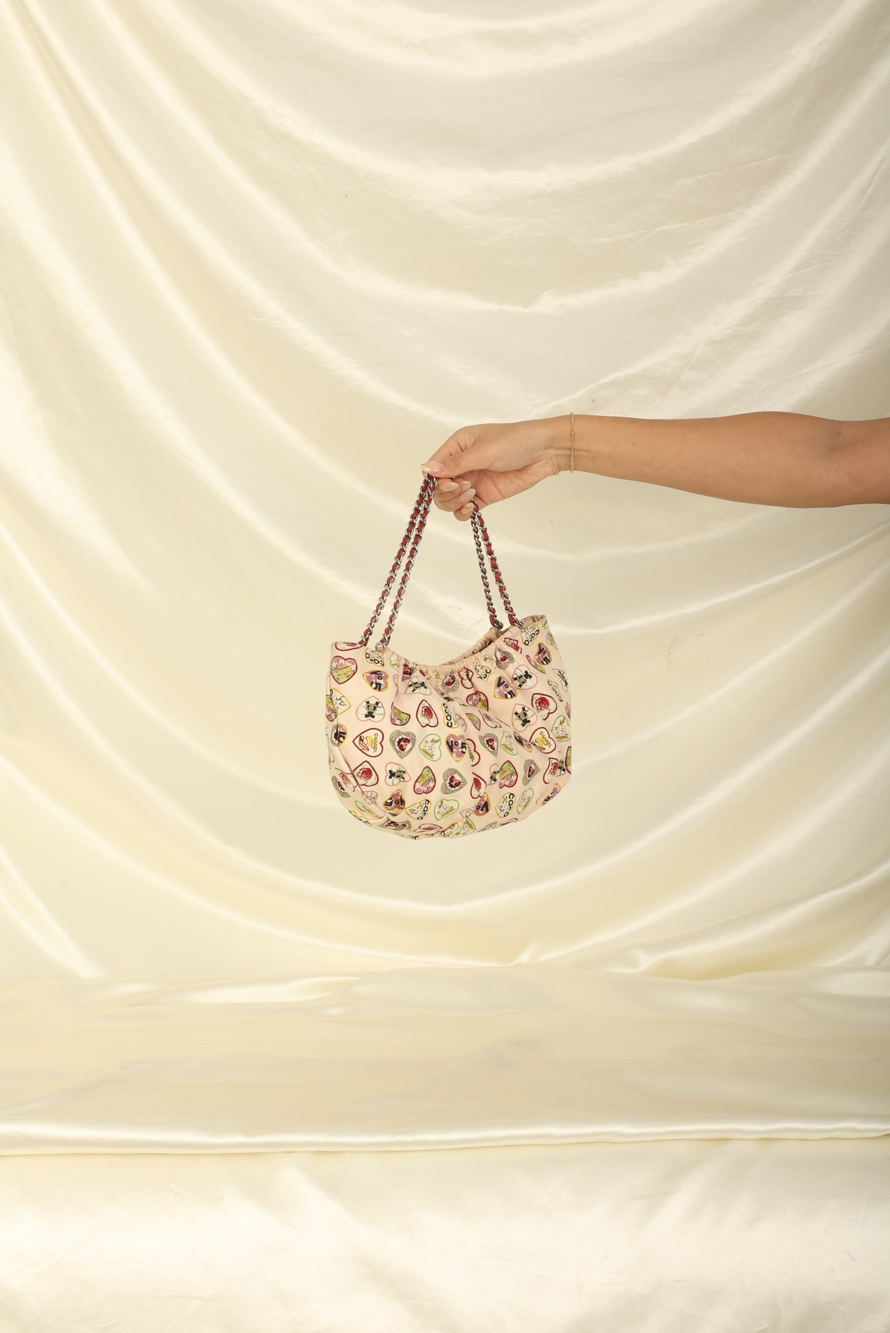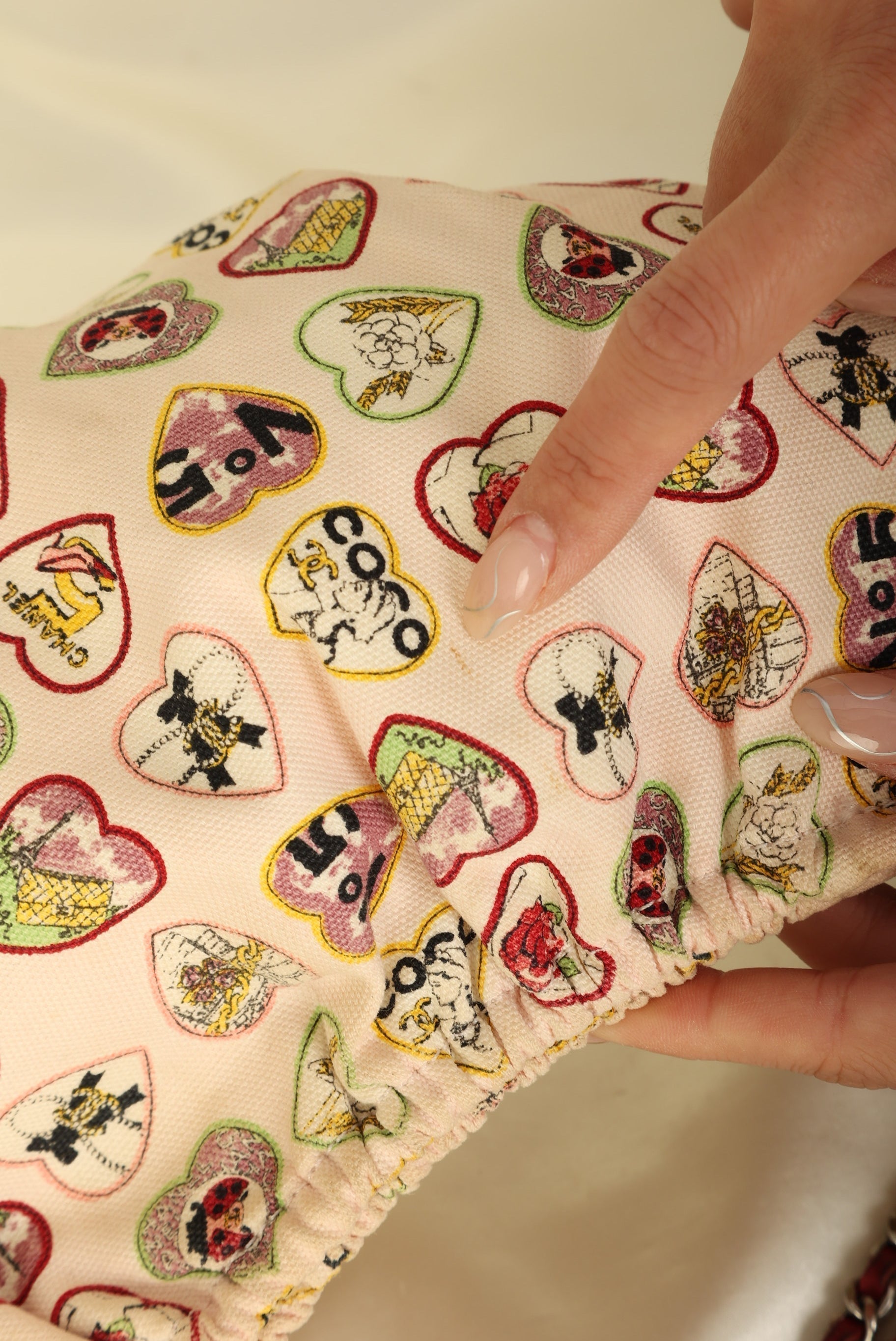 Dropping in the shop is this fun Chanel Canvas Heart Icon Pochette! A collector's piece that will add such charm to your collection! Crafted from canvas material, the bag features?adorable Chanel "Coco heart" motifs laid out on a baby pink canvas with a dark red leather strap and silver hardware. The bag closes with a magnetic closure and is large enough to fit your phone, keys, wallet, sunglasses, and a few other smaller essentials.?