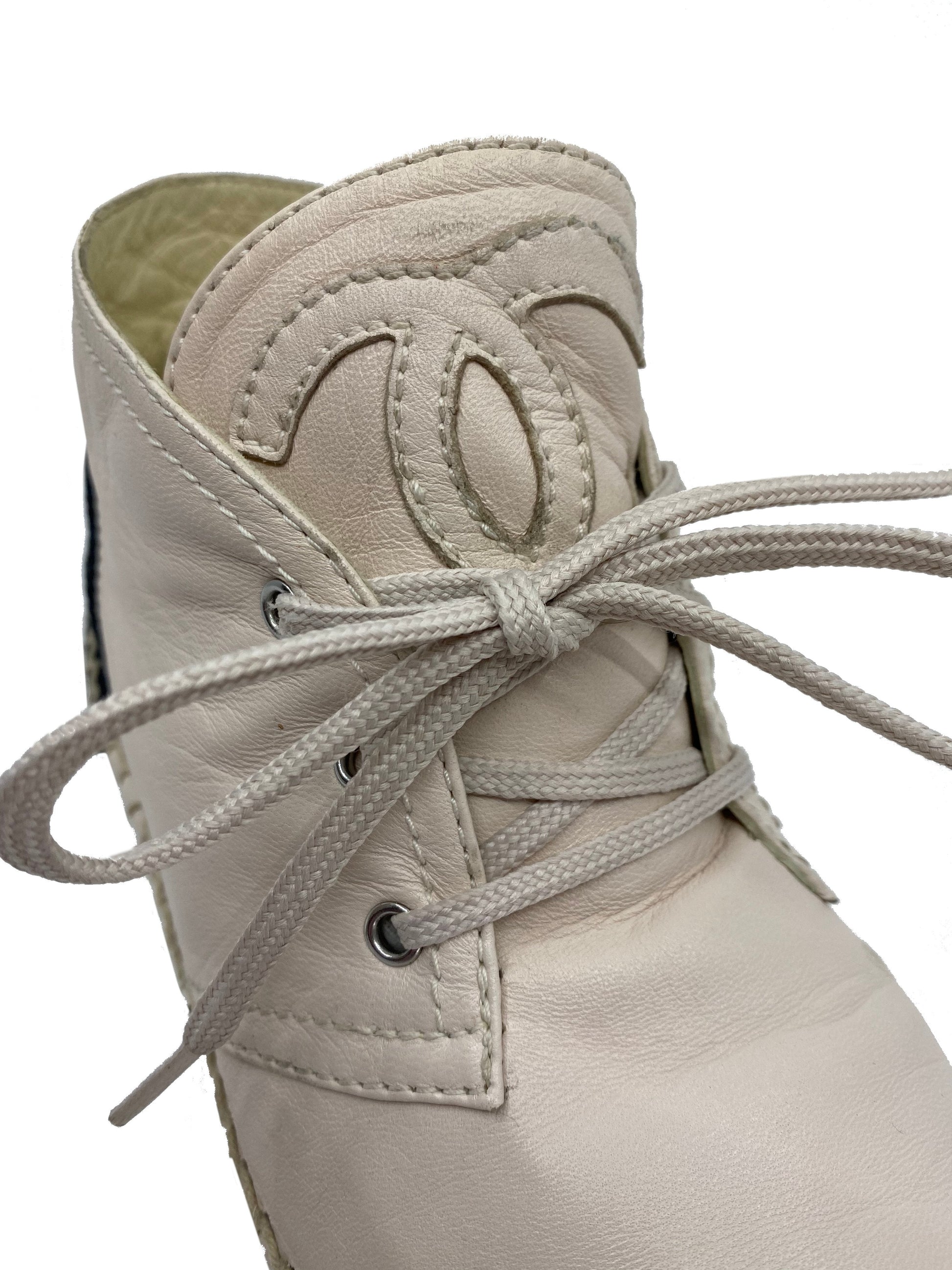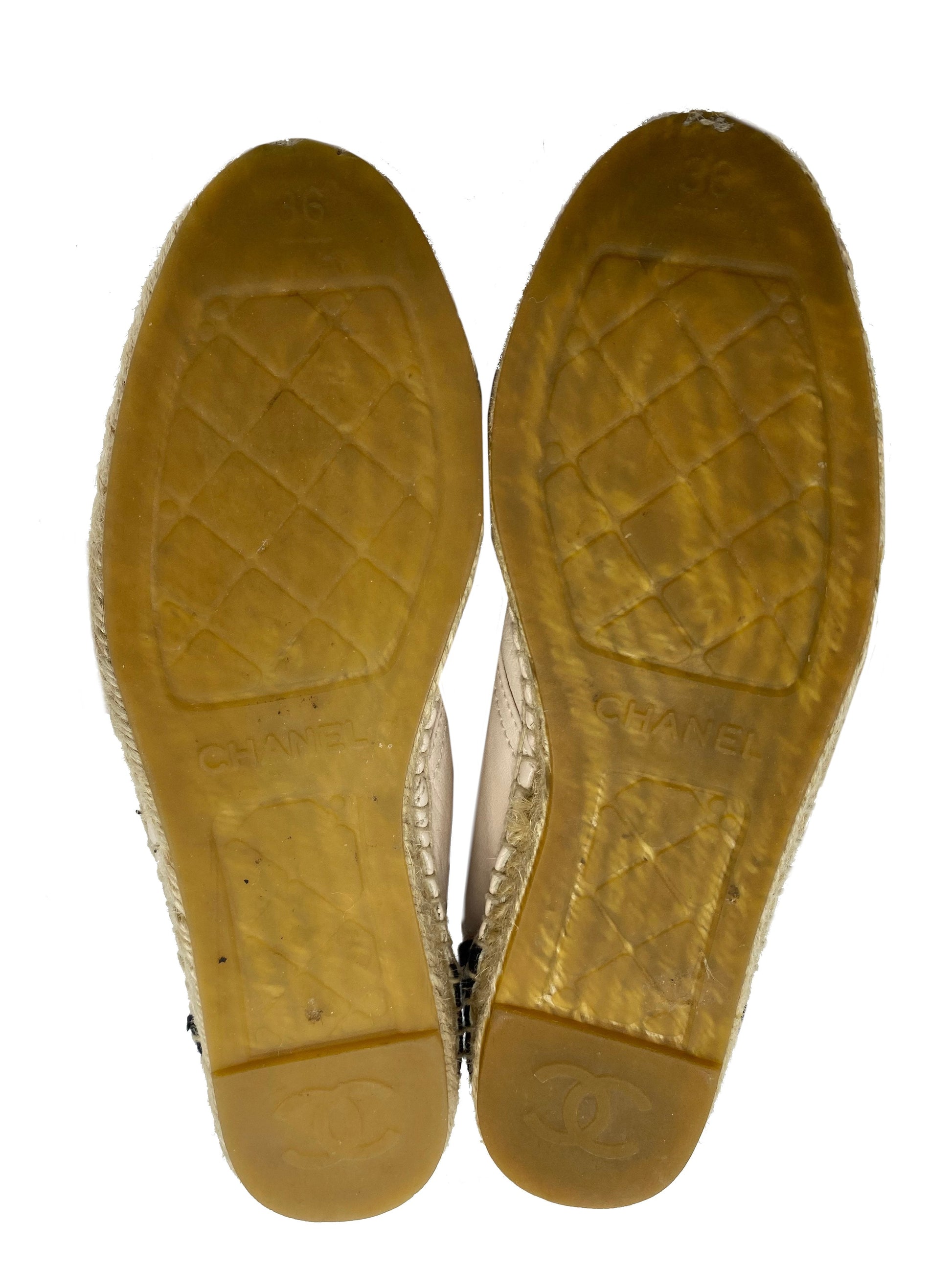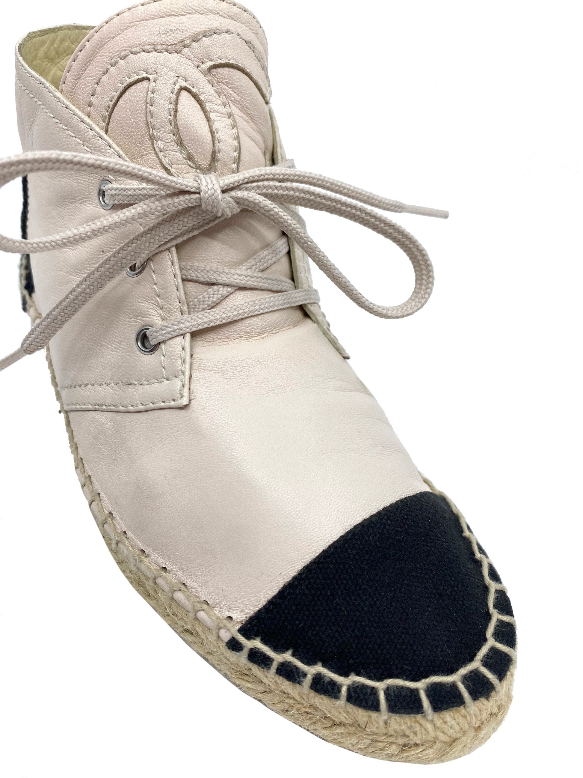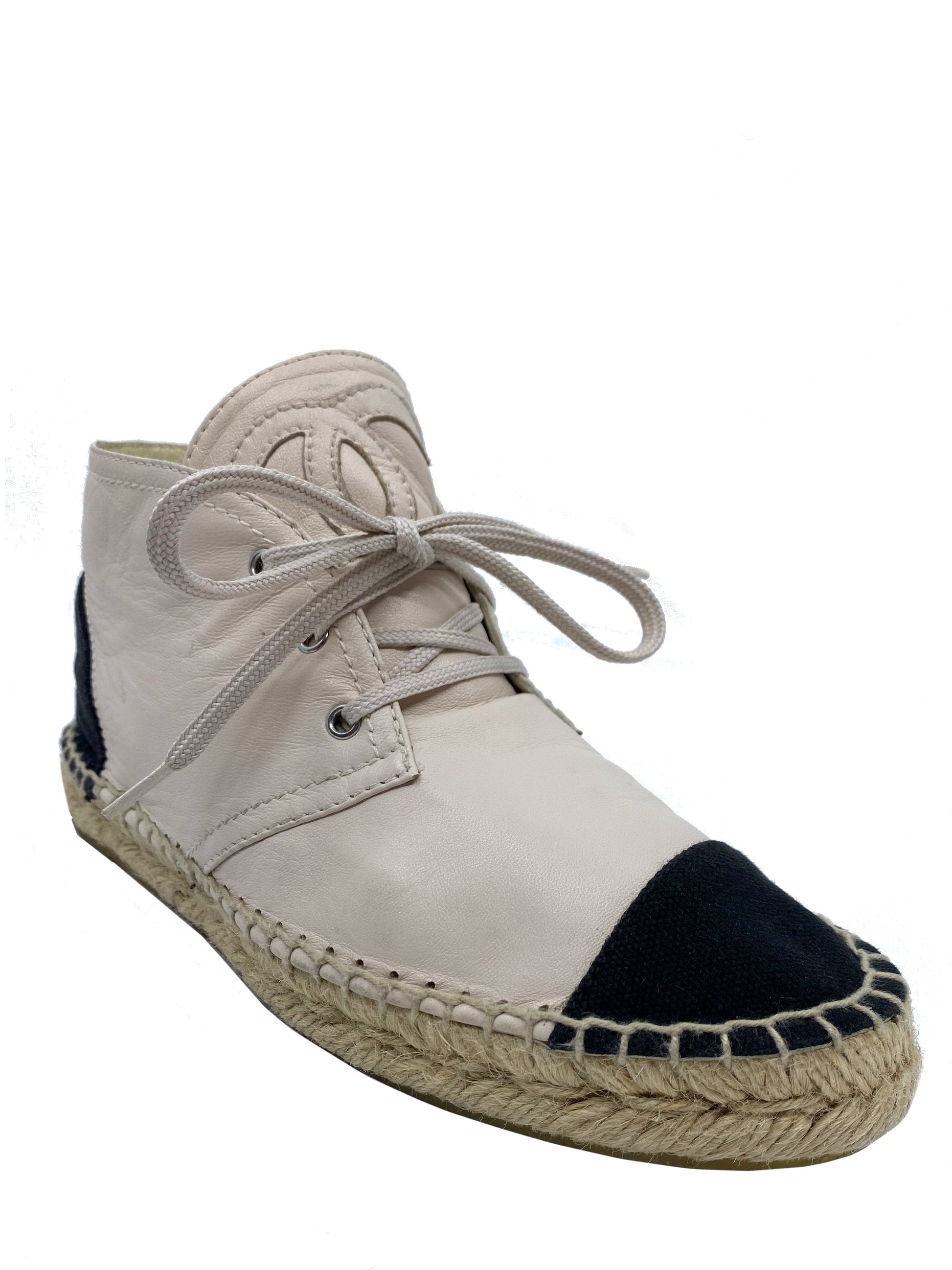 We the ity of these Chanel Cap Toe CC Espadrille Sneakers Size 6 | 36 crafted from supple beige leather with a well-rounded black?canvas cap toe and espadrille trim. Featuring?a?signature CC logo on the tongues, Chanel-labeled insoles and?lace-up closures.