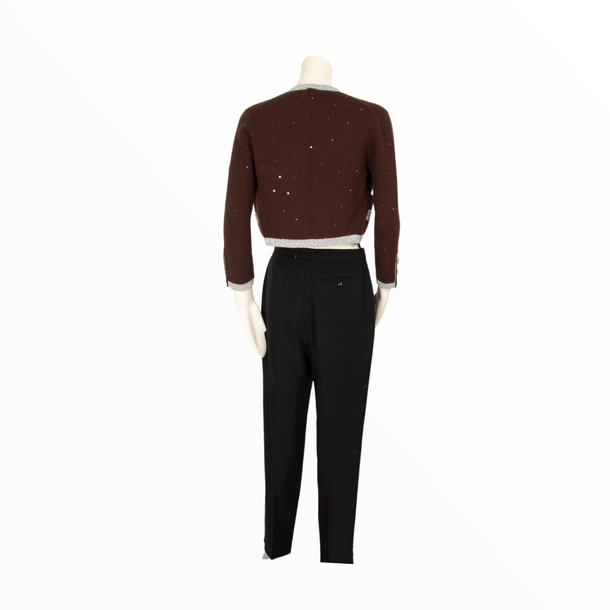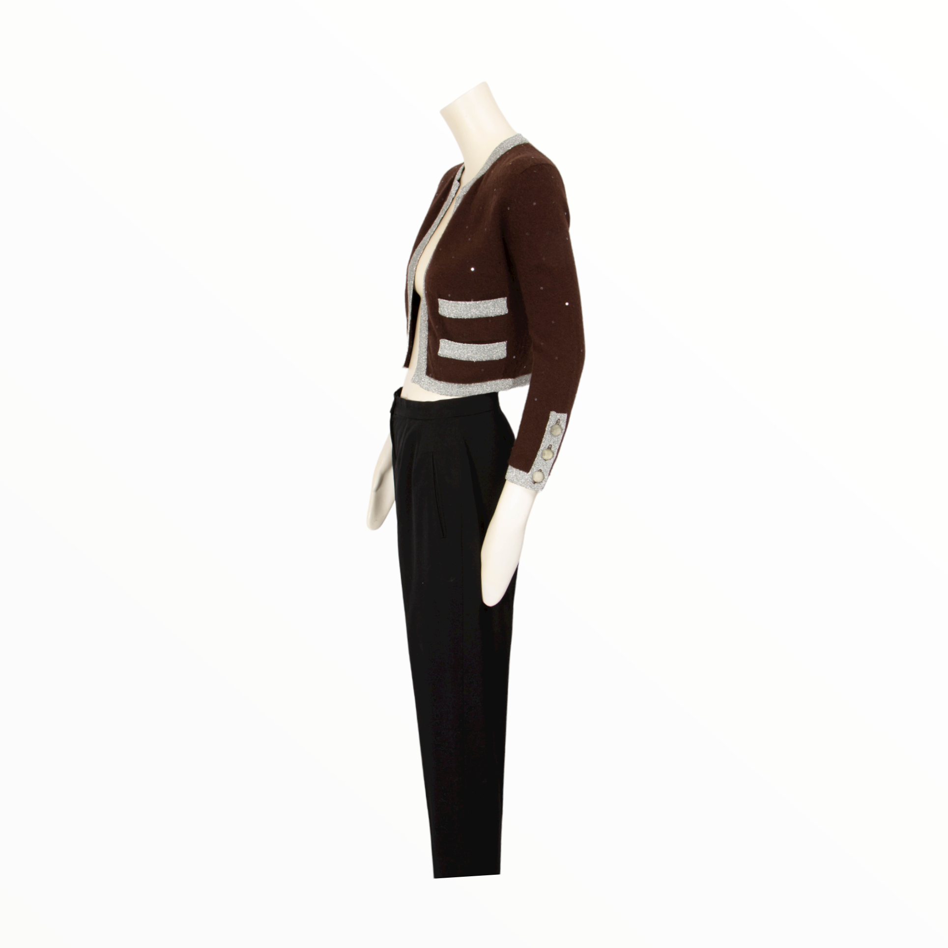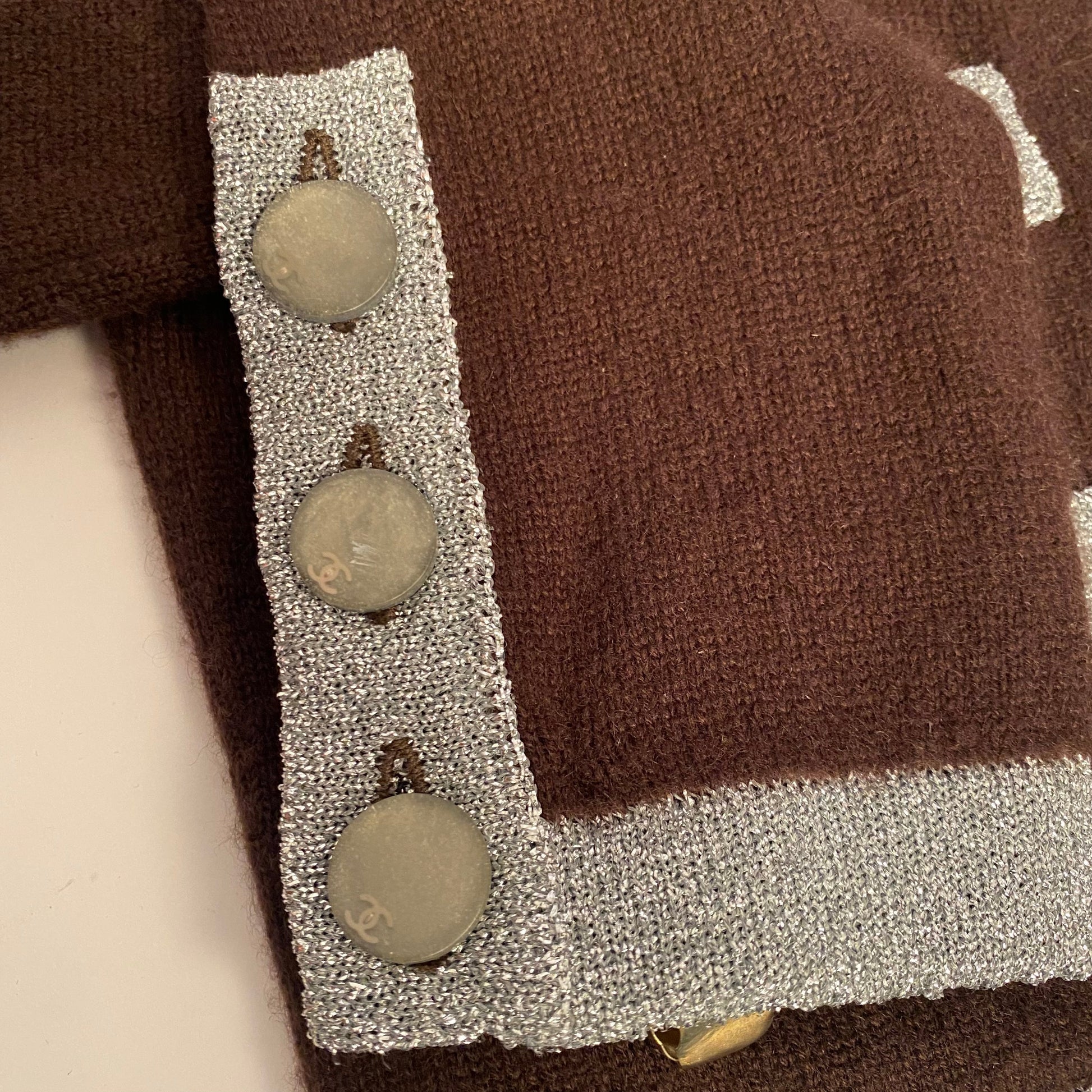 DESCRIPTION: Chanel vintage cropped cashmere brown and silver cardigan embellished with small sequins and silver trim. 3 buttons on the sleeves, signed with CC logo.