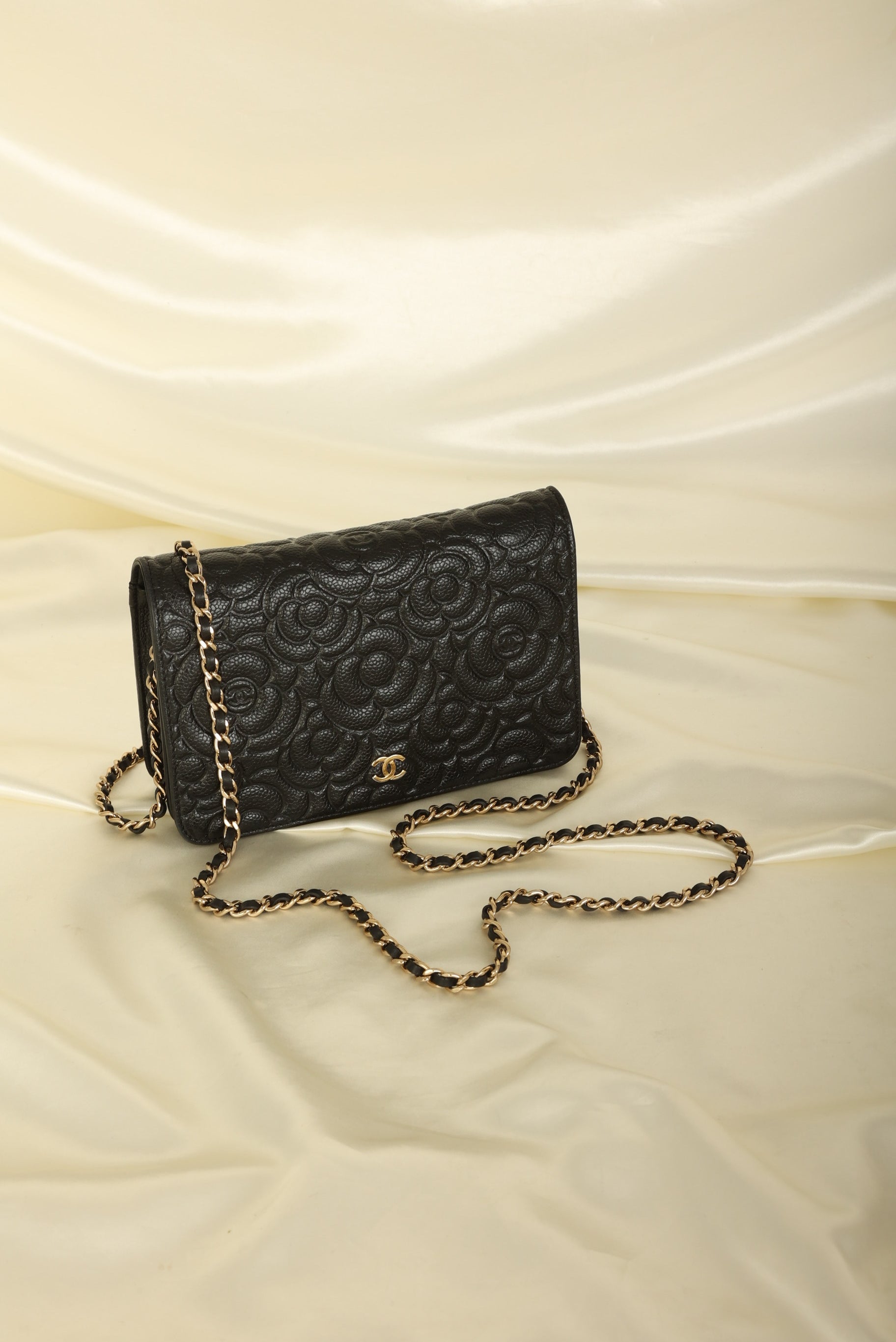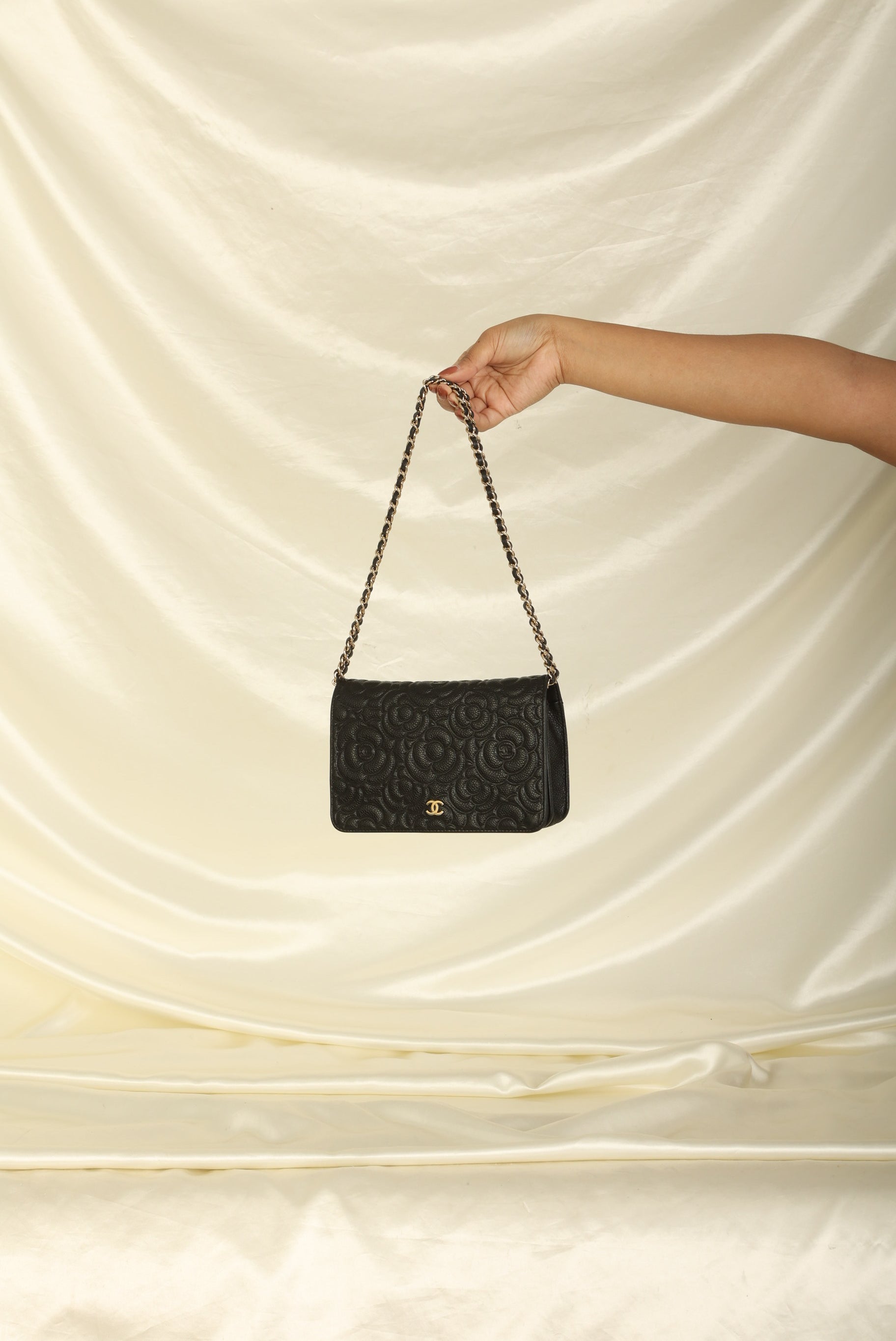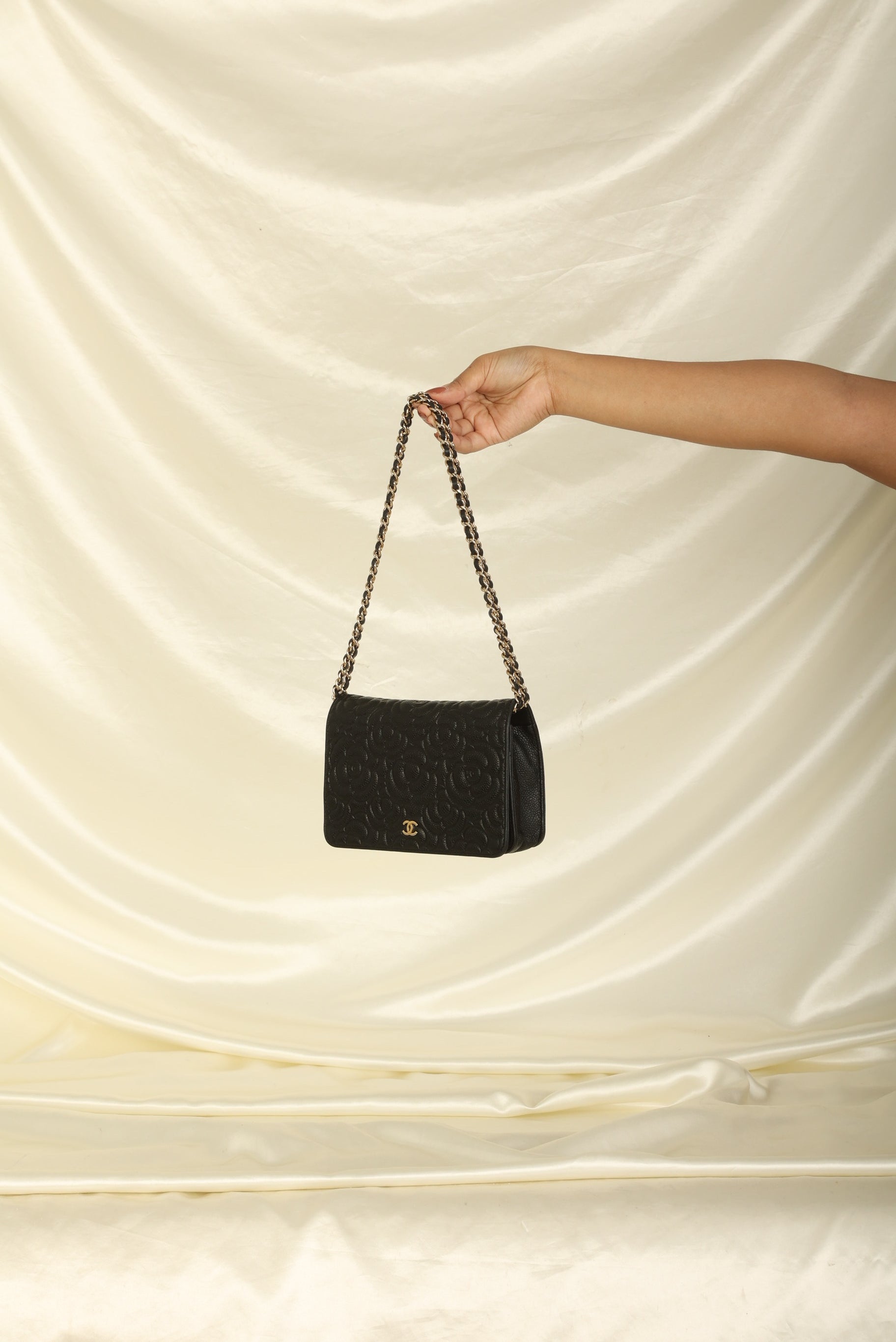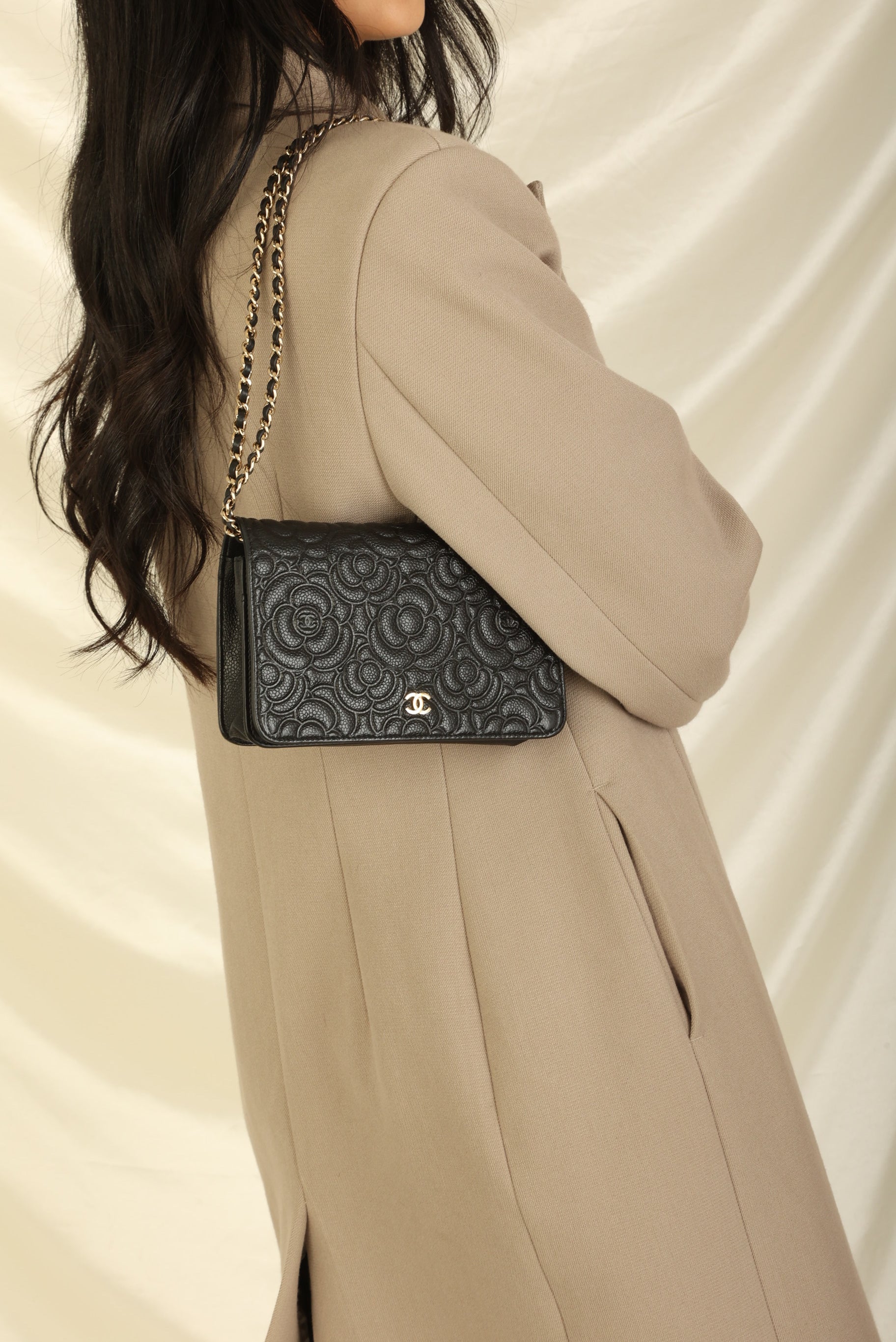 A?timeless accessory that combines luxury and practicality in one stunning design. Crafted from?caviar leather, this wallet on chain features the iconic Chanel Camellia flower in a subtle yet eye-catching design, while the?gold hardware adds a touch of elegance and sophistication.