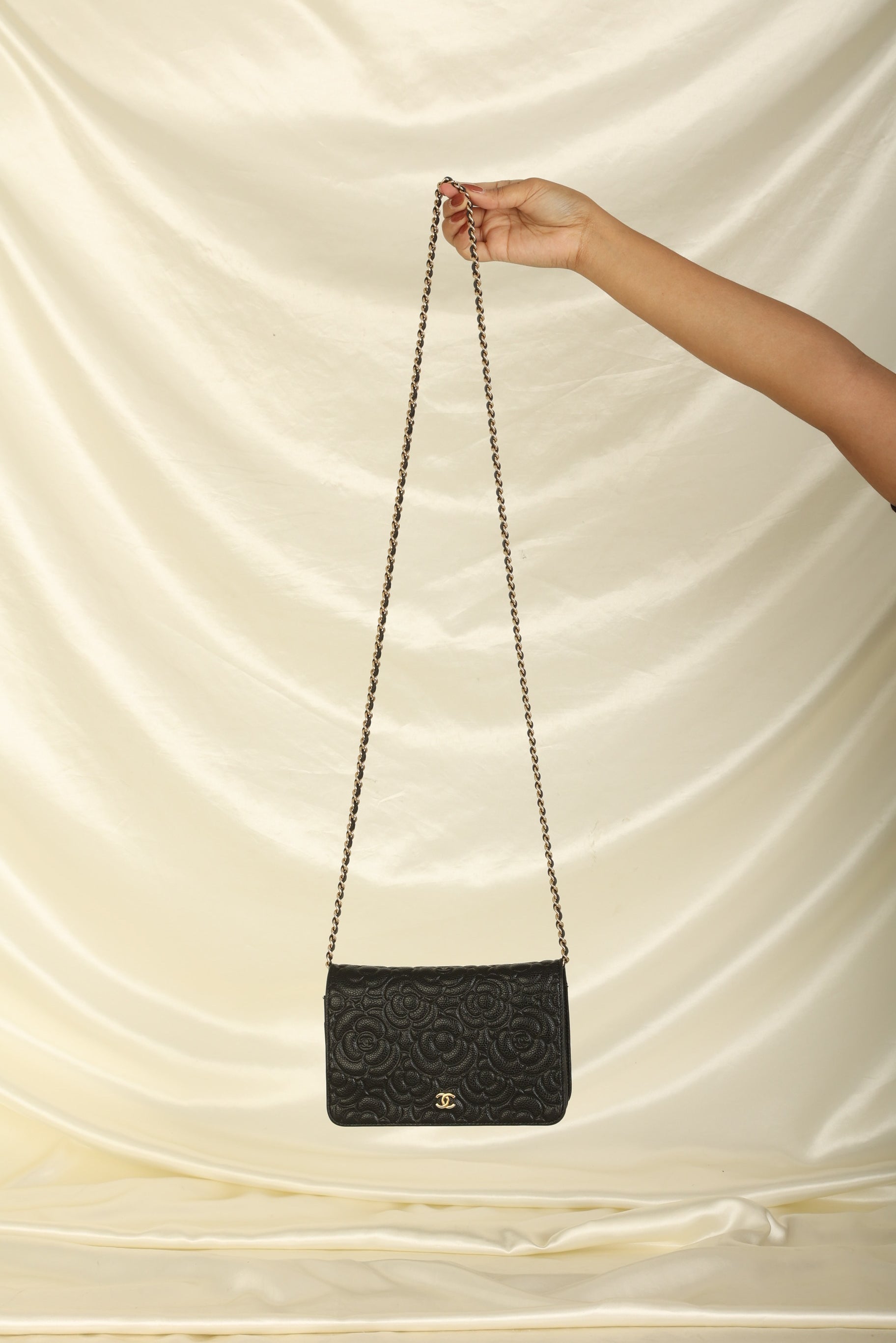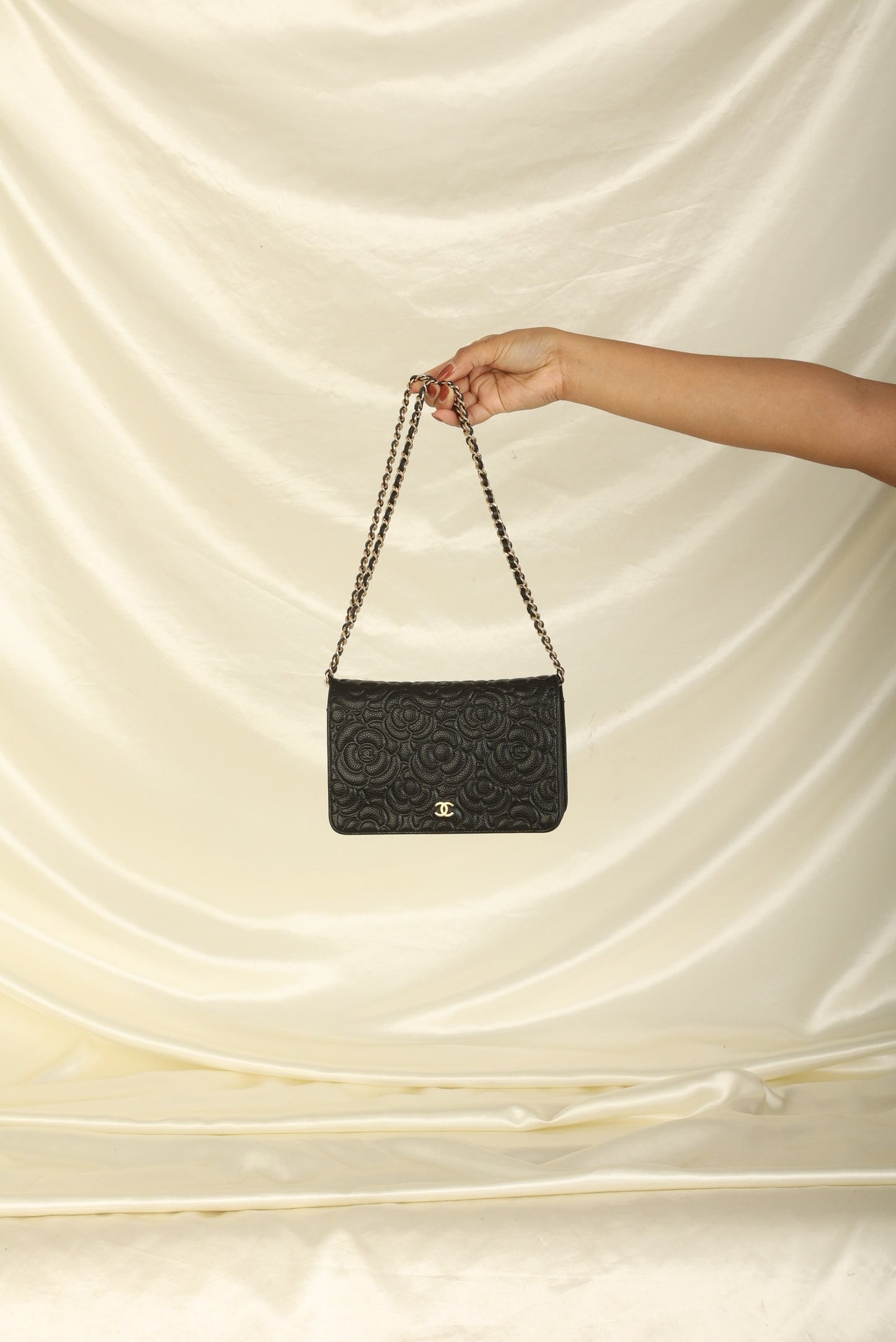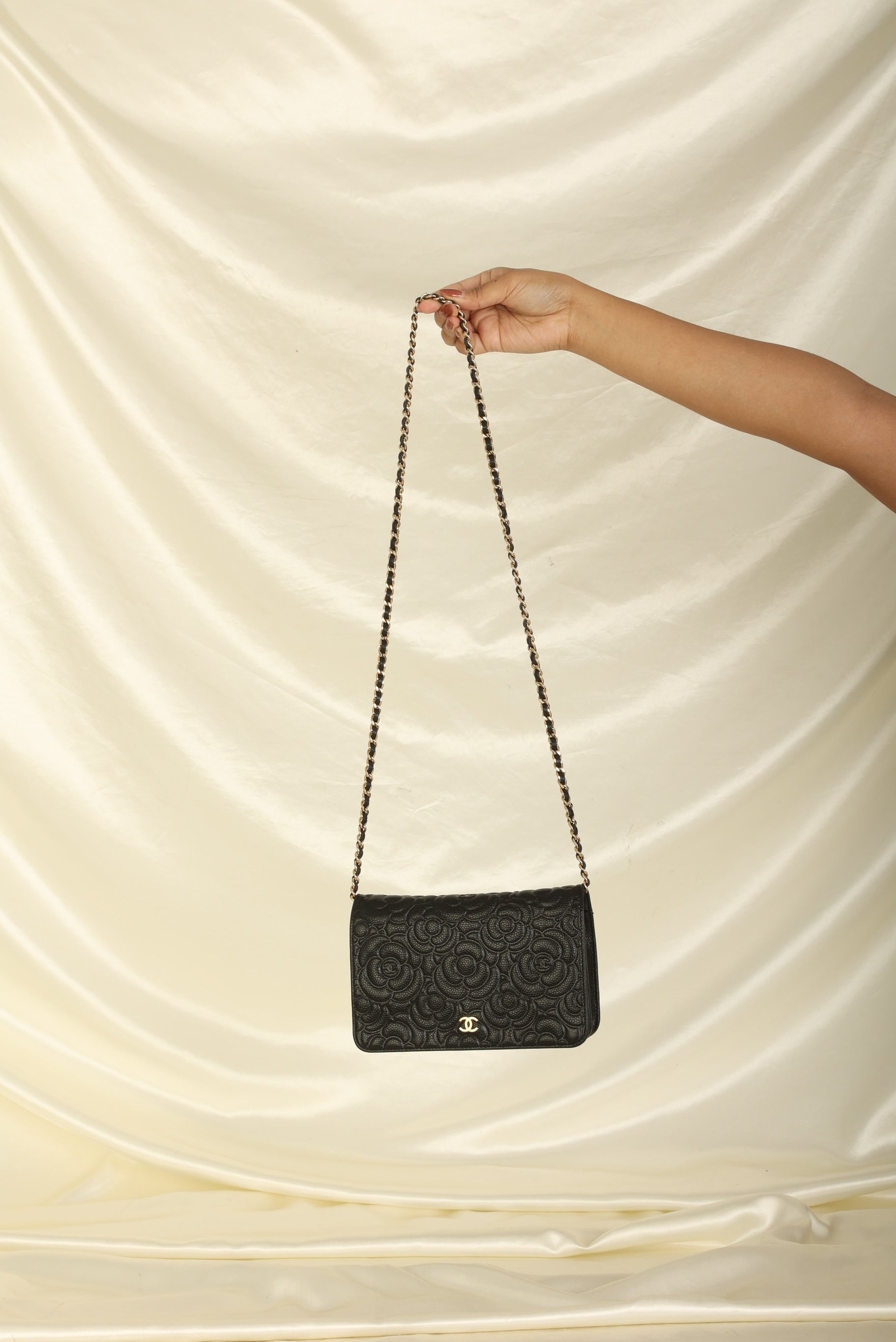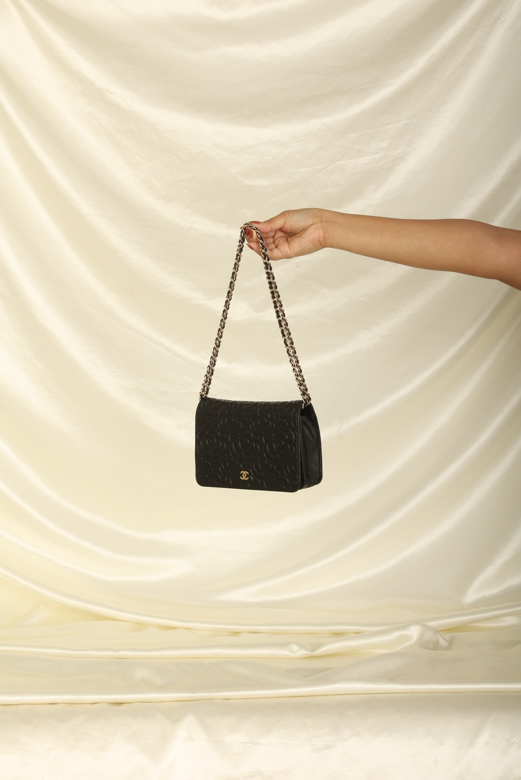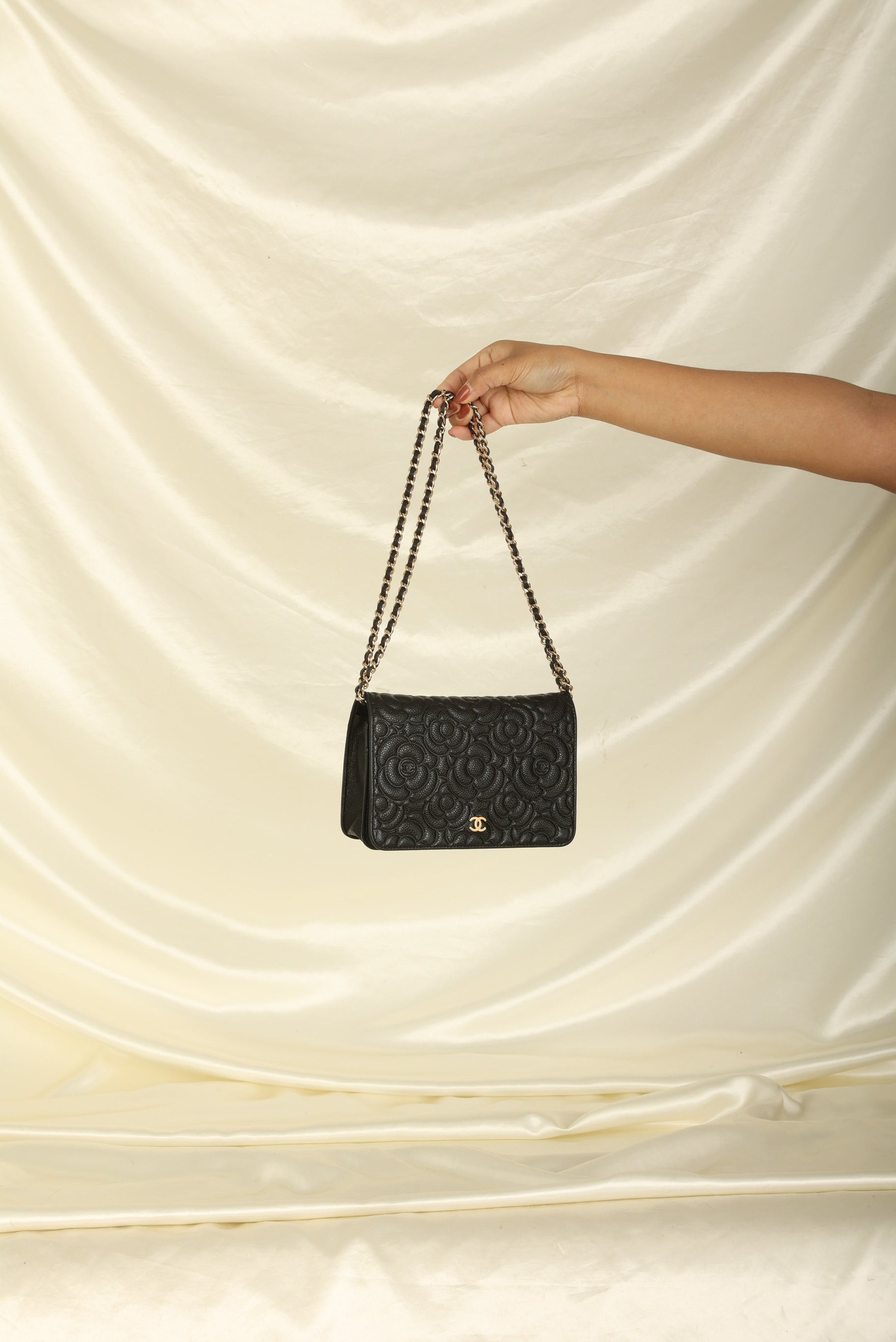 A?timeless accessory that combines luxury and practicality in one stunning design. Crafted from?caviar leather, this wallet on chain features the iconic Chanel Camellia flower in a subtle yet eye-catching design, while the?gold hardware adds a touch of elegance and sophistication.