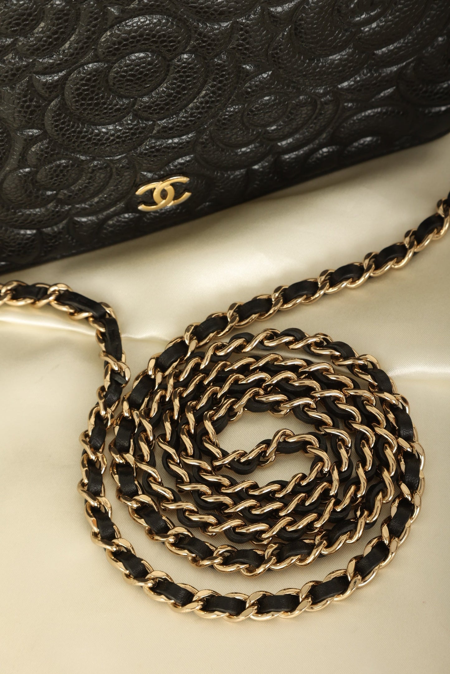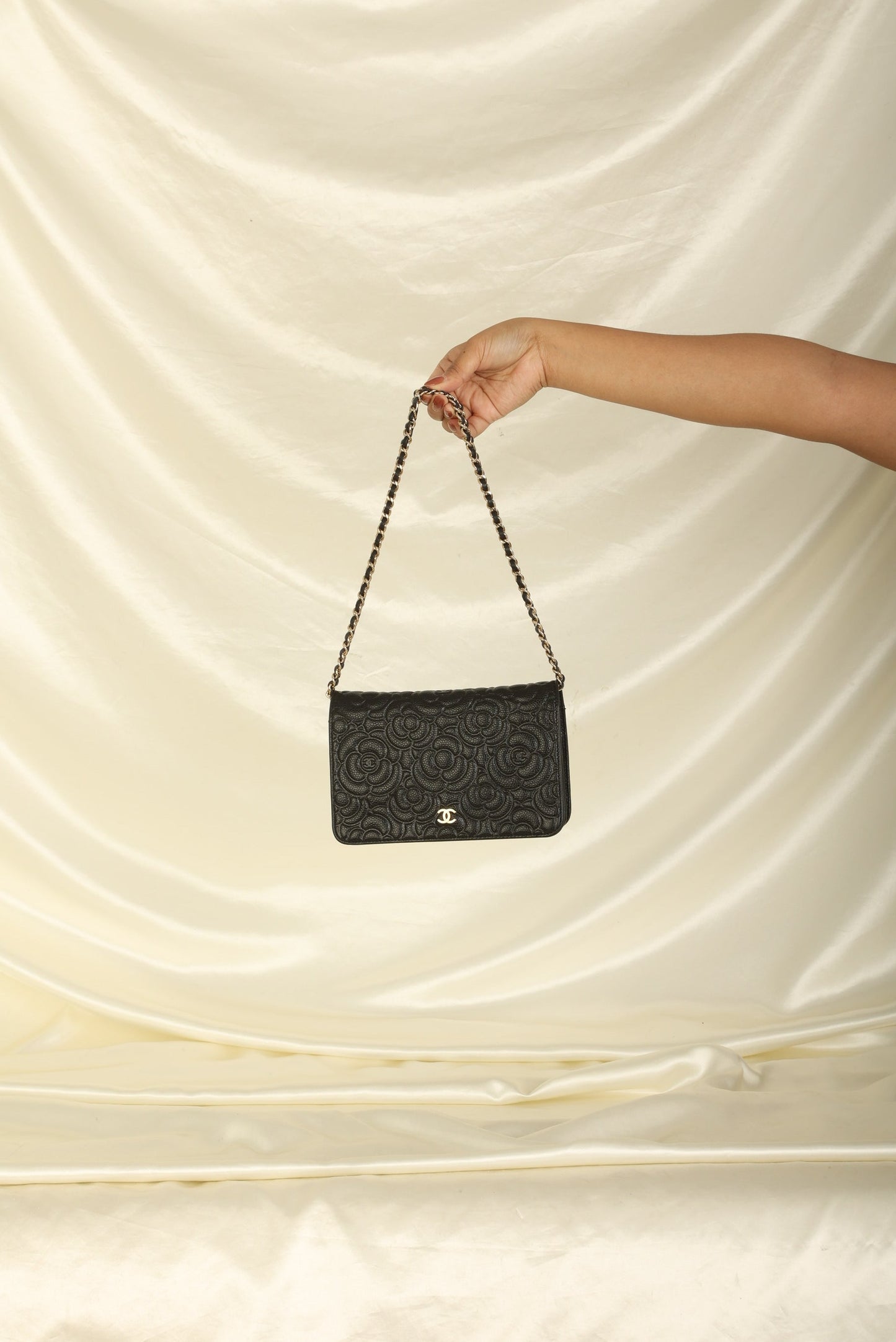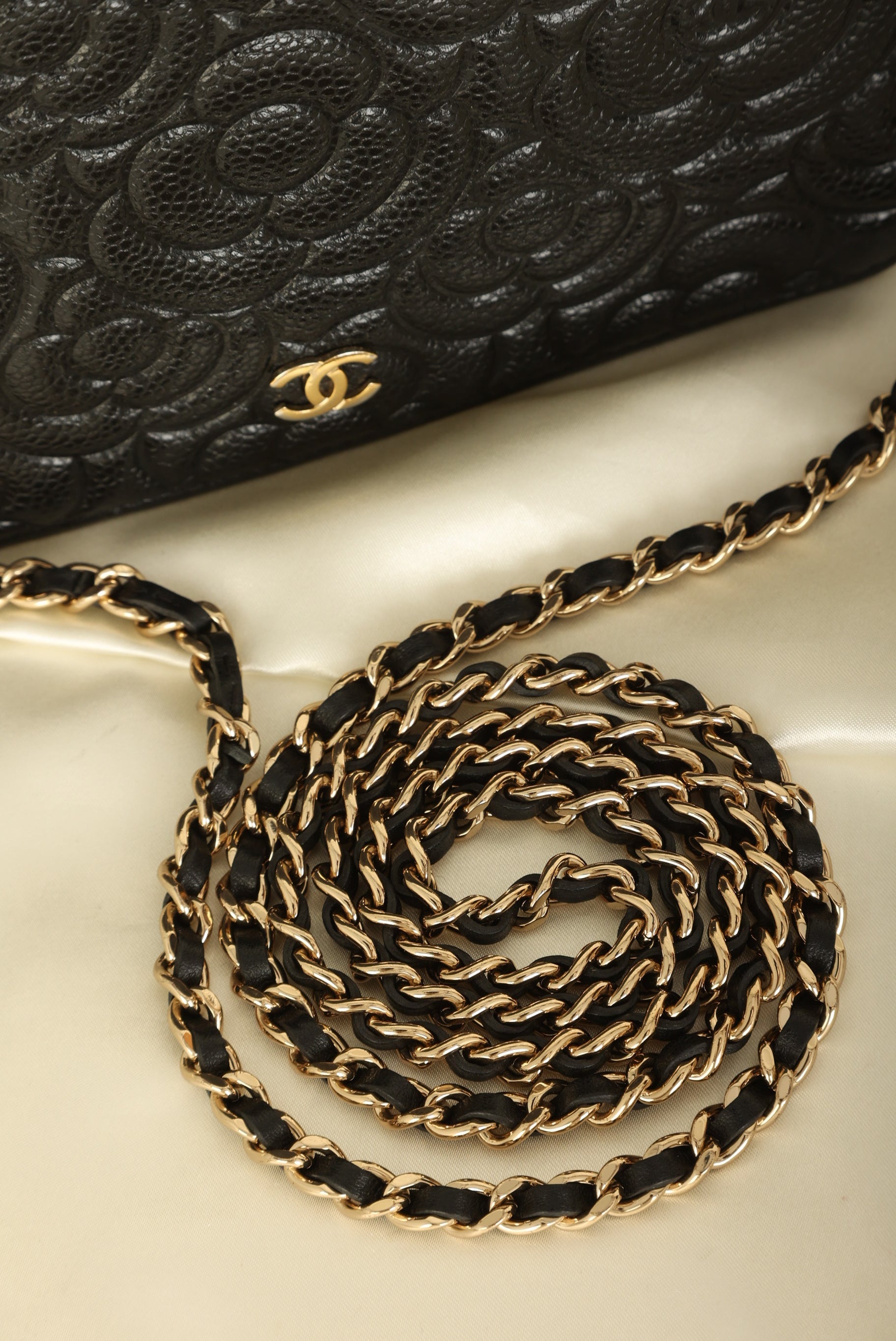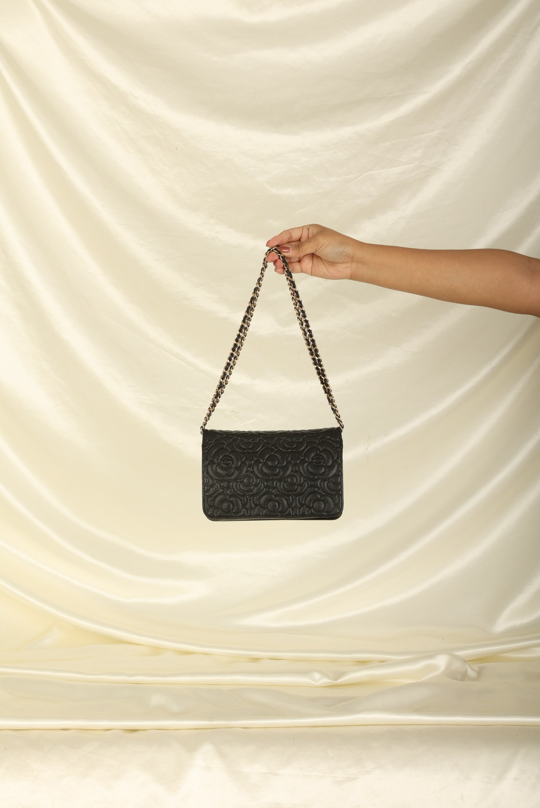 A?timeless accessory that combines luxury and practicality in one stunning design. Crafted from?caviar leather, this wallet on chain features the iconic Chanel Camellia flower in a subtle yet eye-catching design, while the?gold hardware adds a touch of elegance and sophistication.