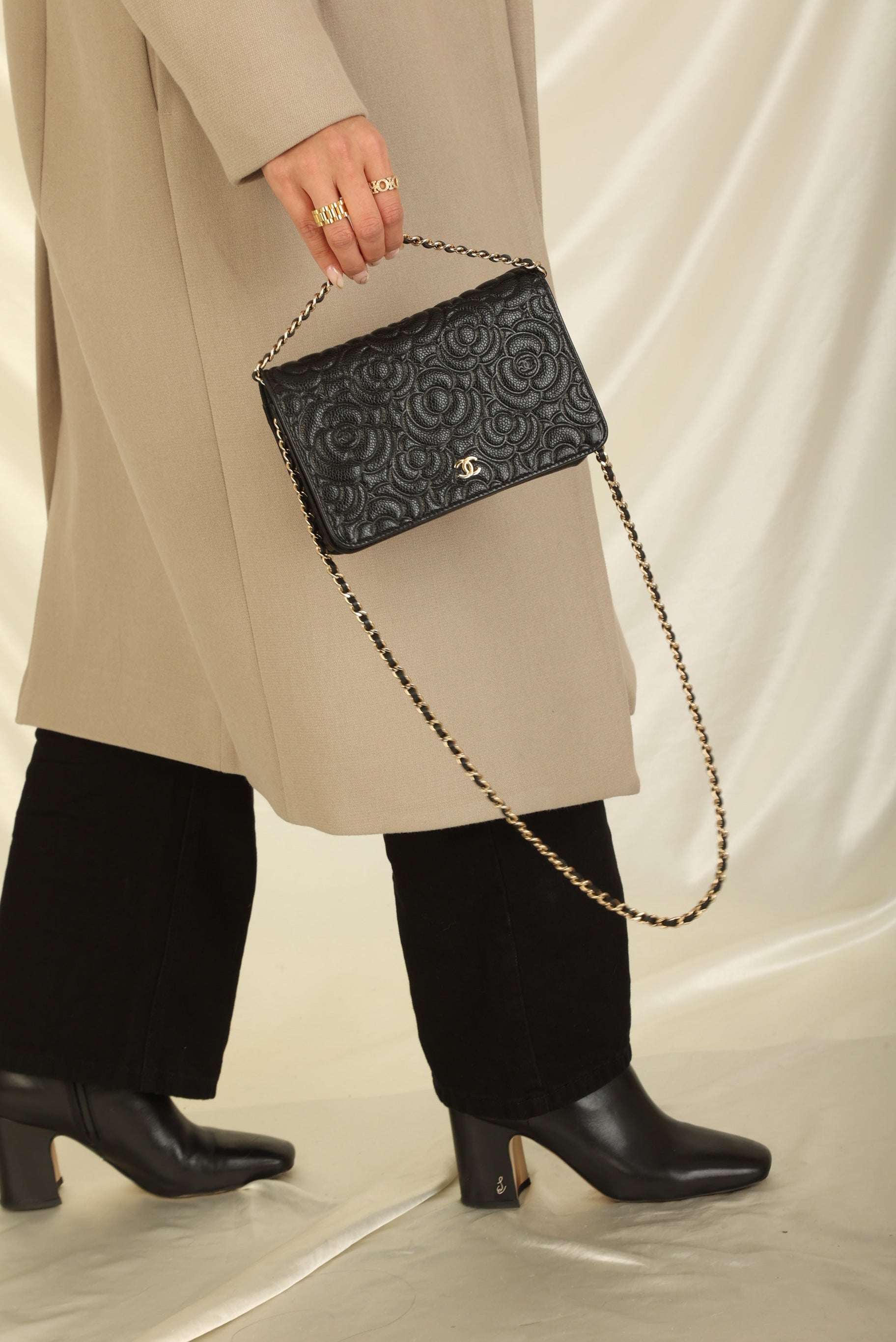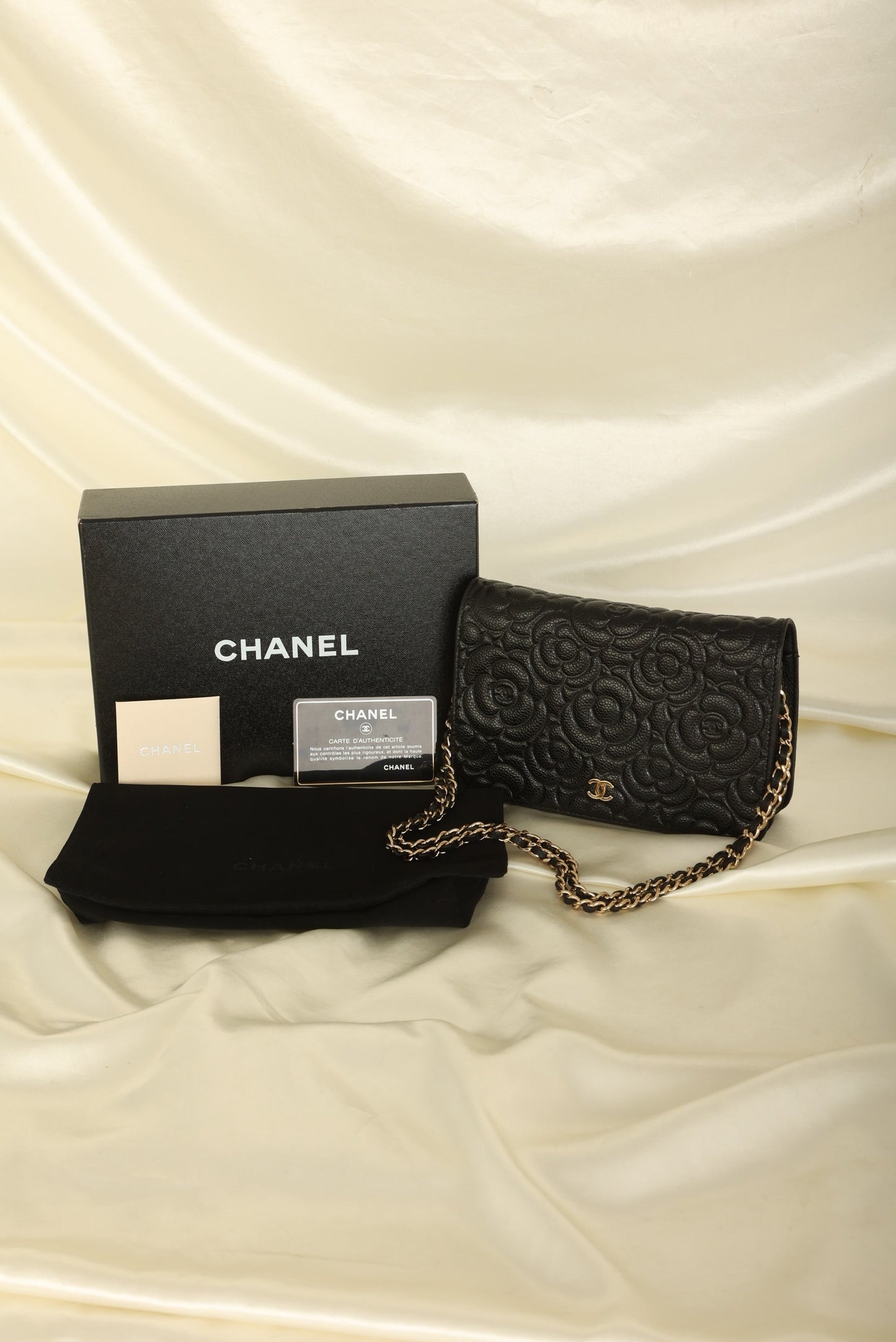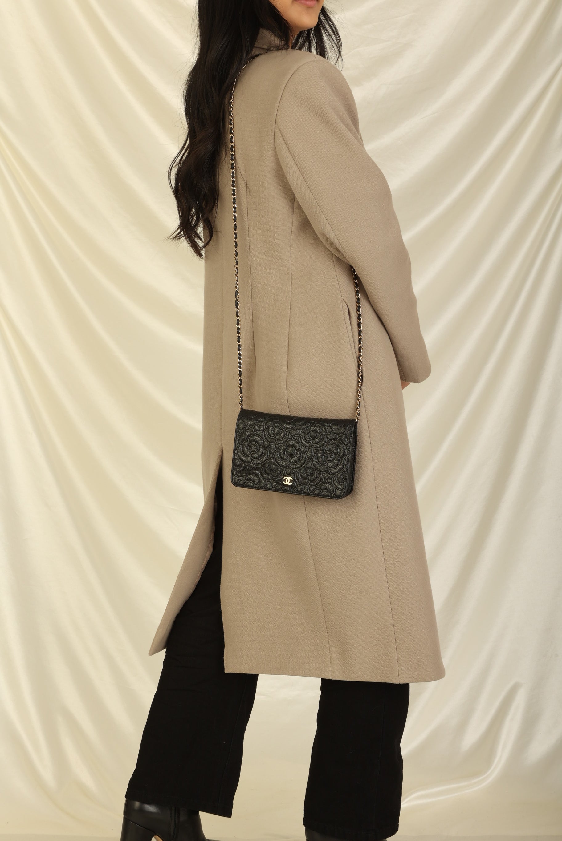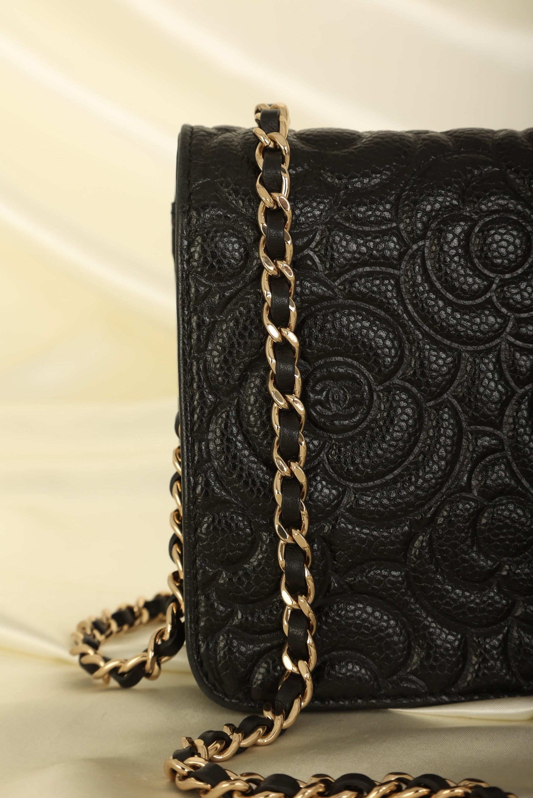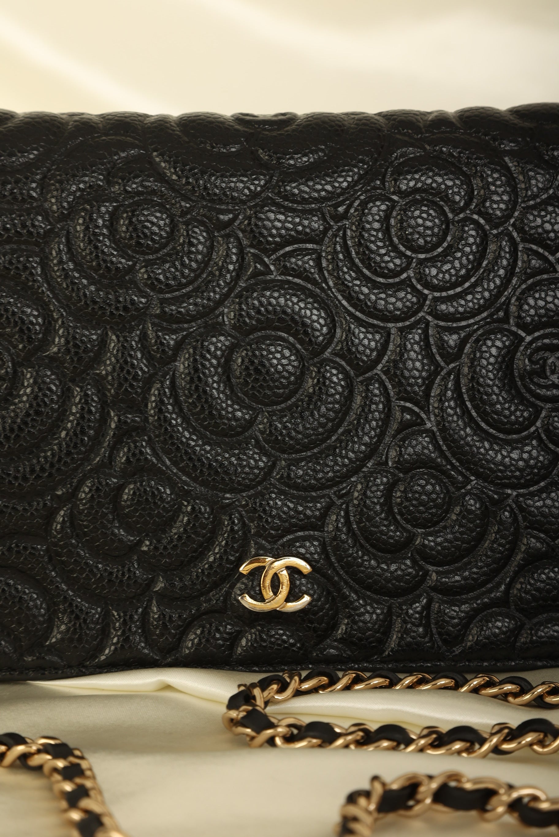 A?timeless accessory that combines luxury and practicality in one stunning design. Crafted from?caviar leather, this wallet on chain features the iconic Chanel Camellia flower in a subtle yet eye-catching design, while the?gold hardware adds a touch of elegance and sophistication.