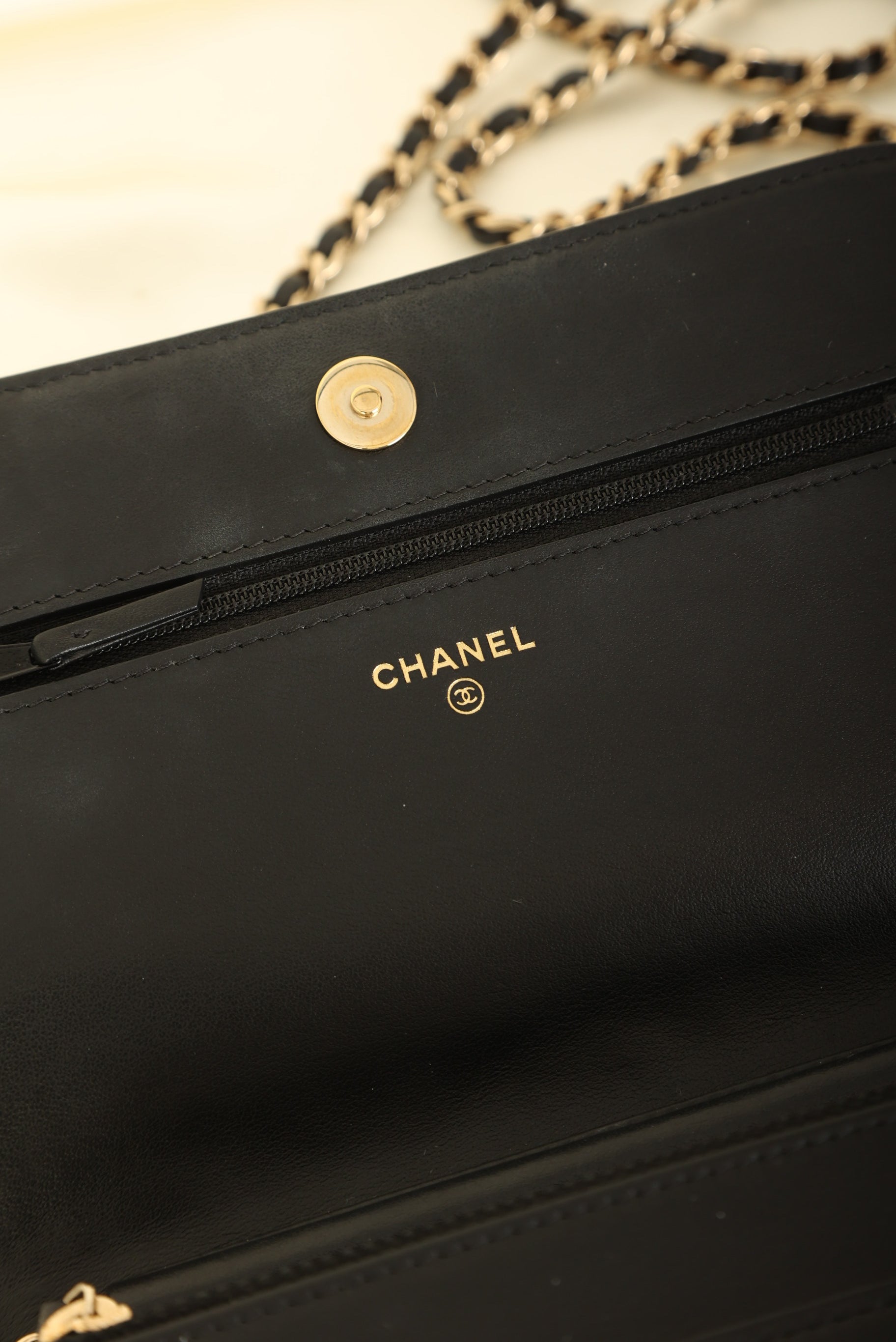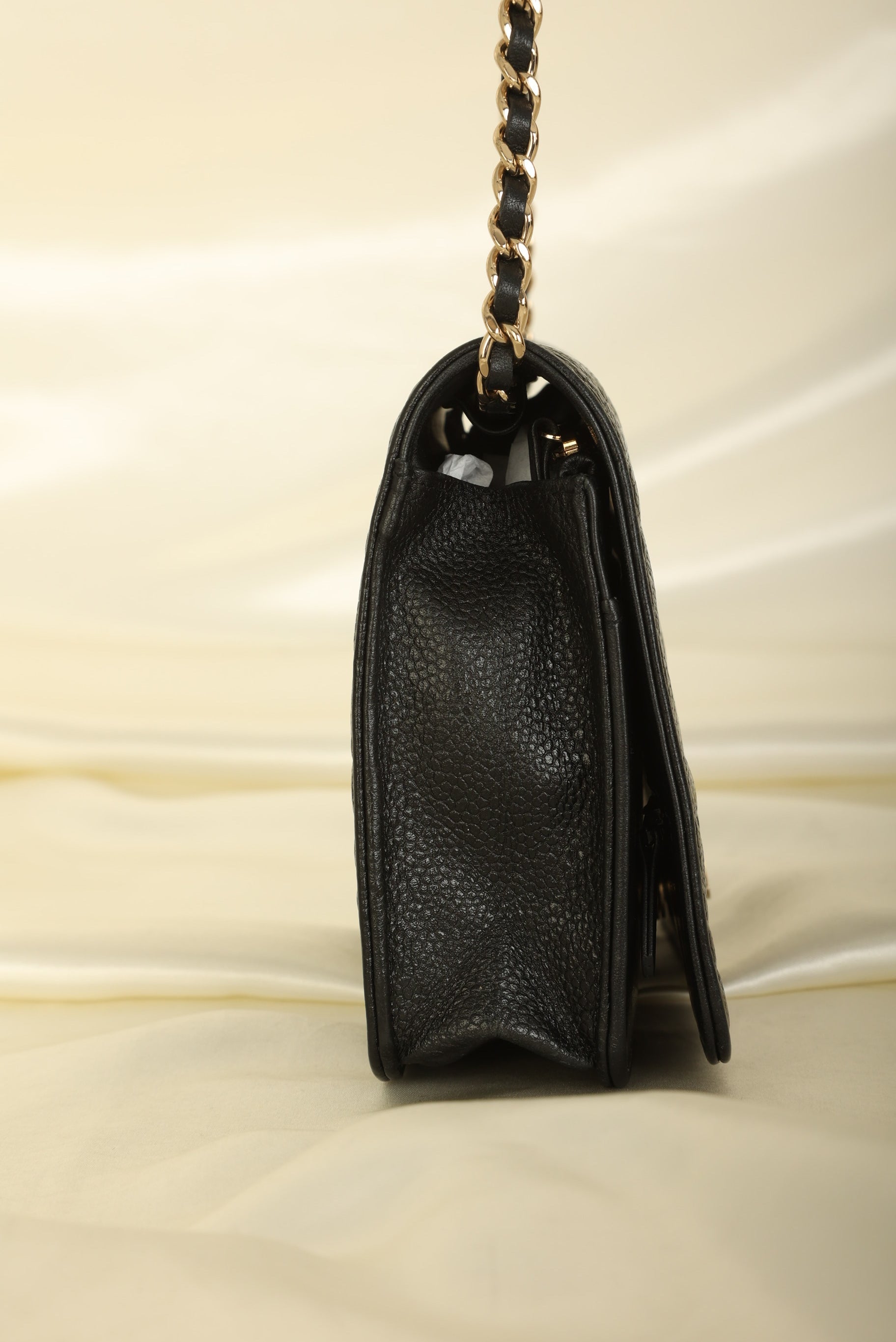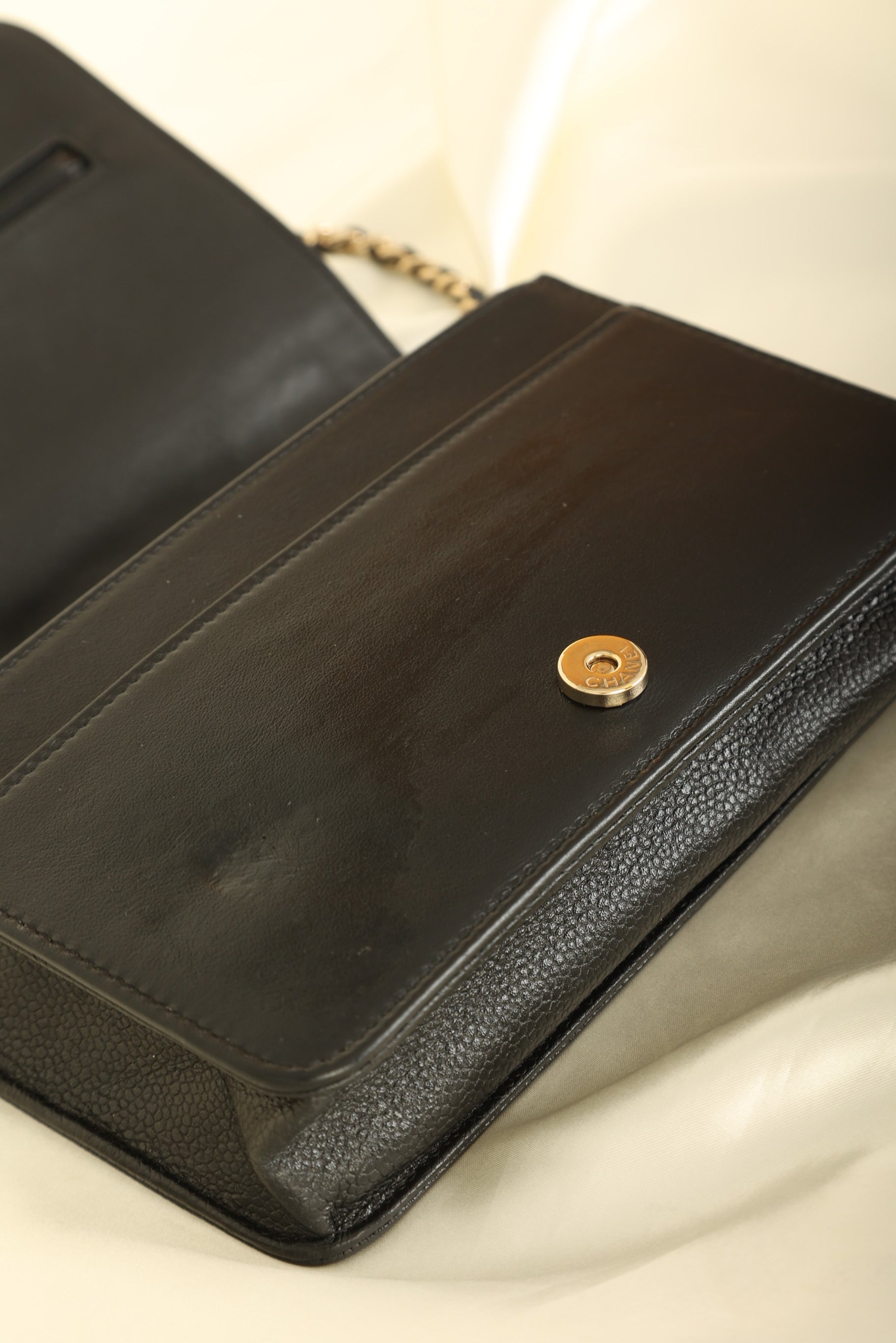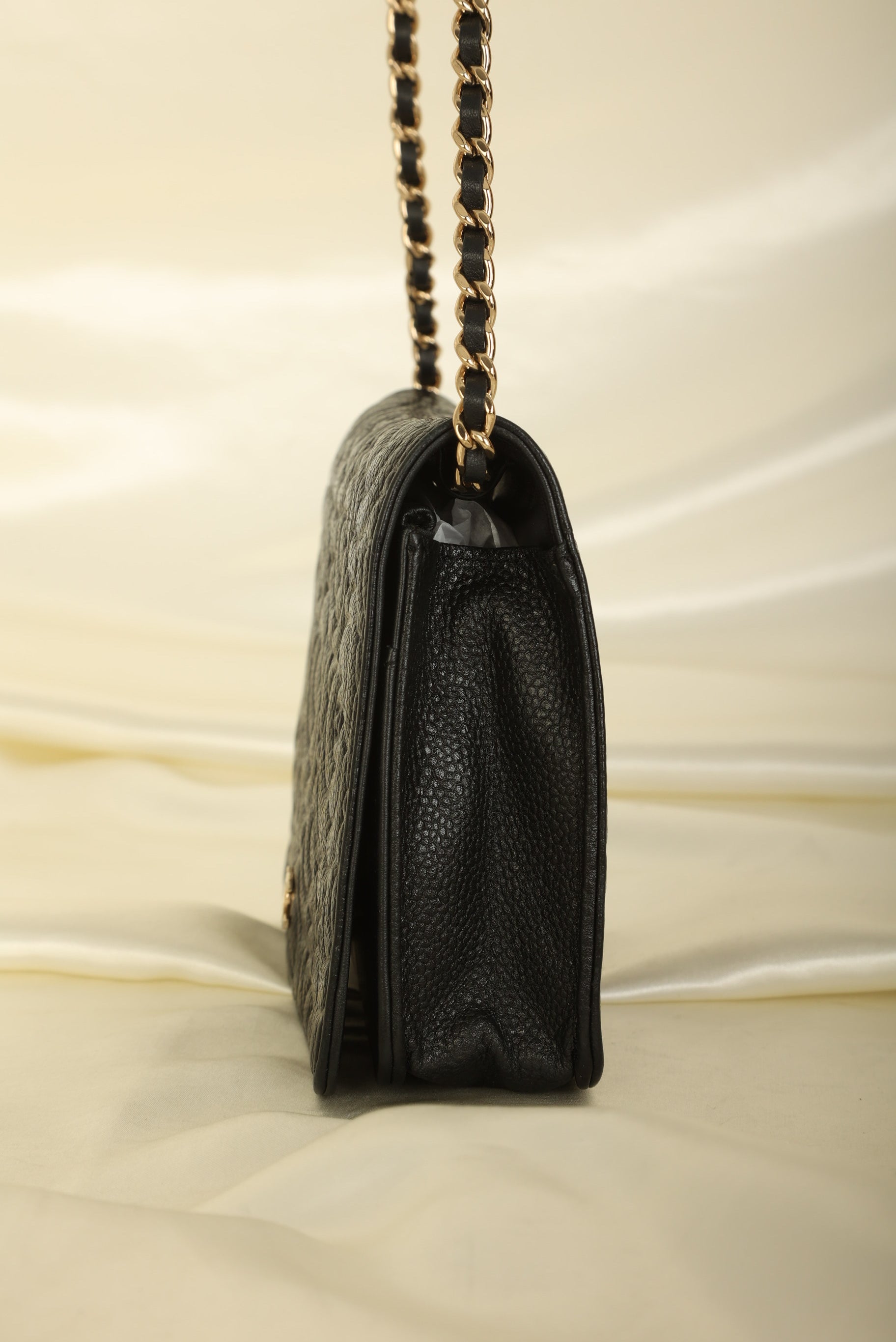 A?timeless accessory that combines luxury and practicality in one stunning design. Crafted from?caviar leather, this wallet on chain features the iconic Chanel Camellia flower in a subtle yet eye-catching design, while the?gold hardware adds a touch of elegance and sophistication.
