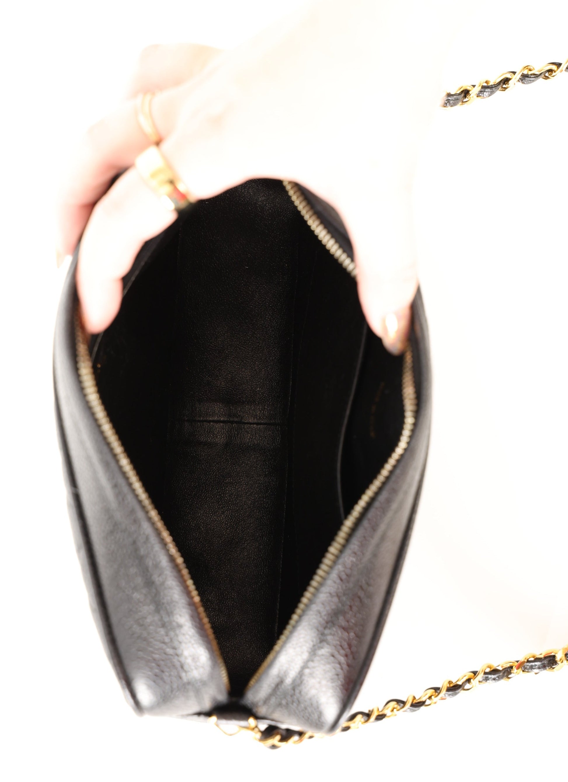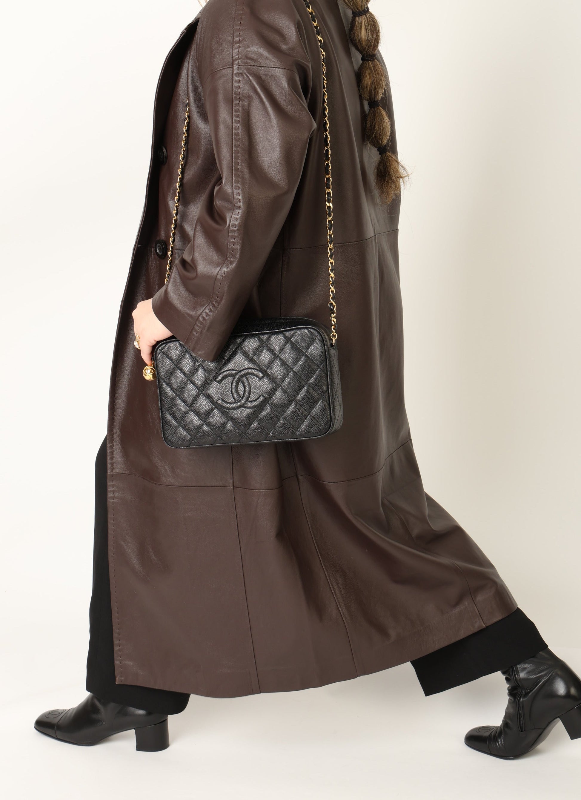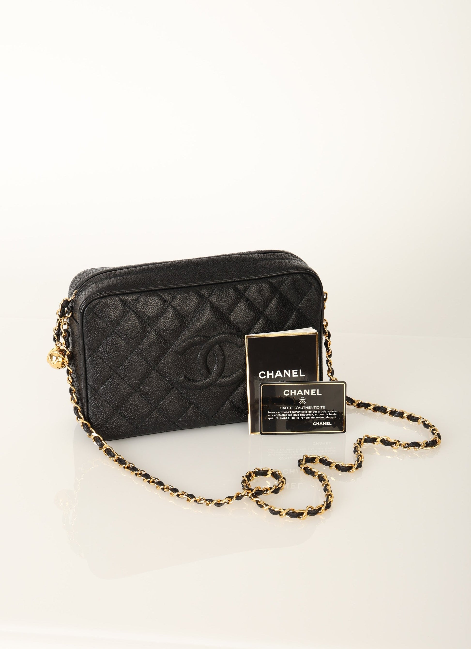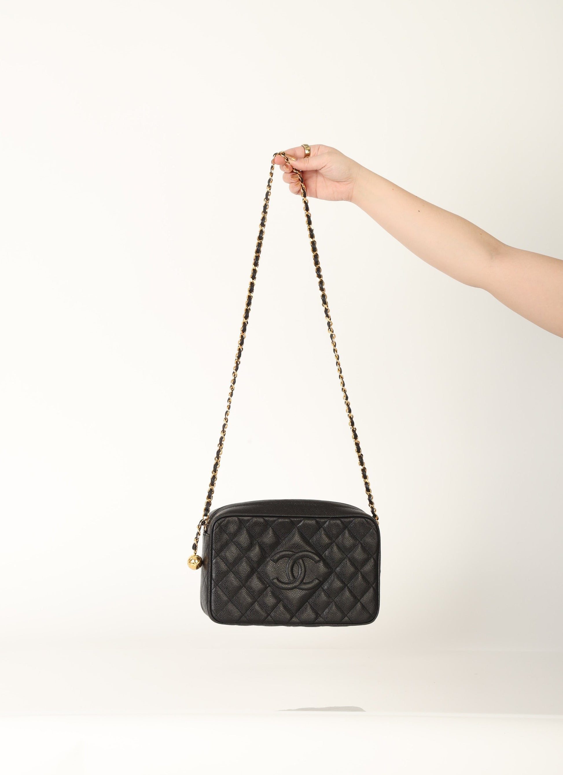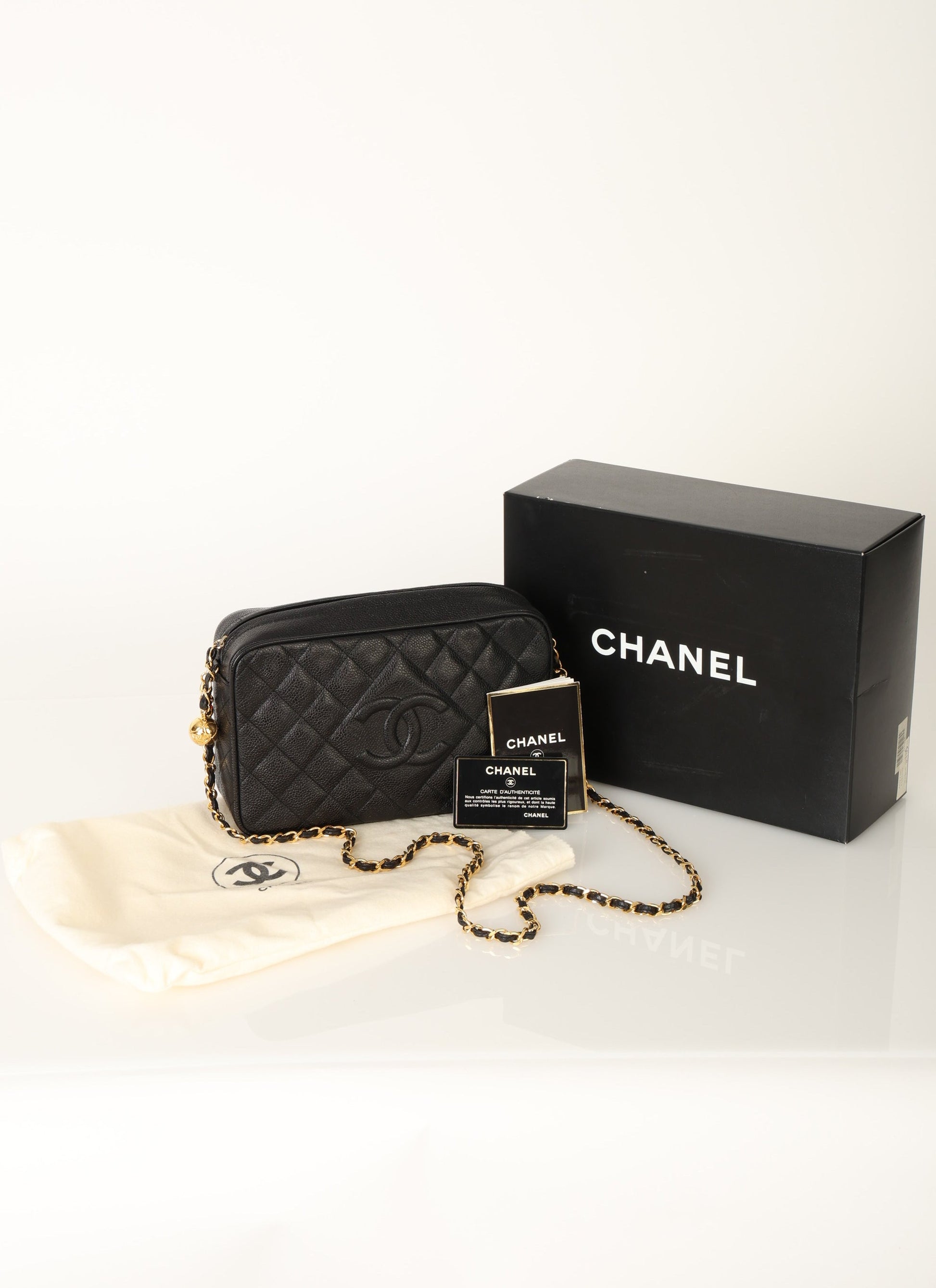 A gorgeous Chanel camera bag with the iconic timeless logo on the front. Can be as a crossbody or long shoulder bag. Crafted with black caviar leather and 24K gold plated hardware, this bag is perfect for everyday use, and fits all of your essential items!