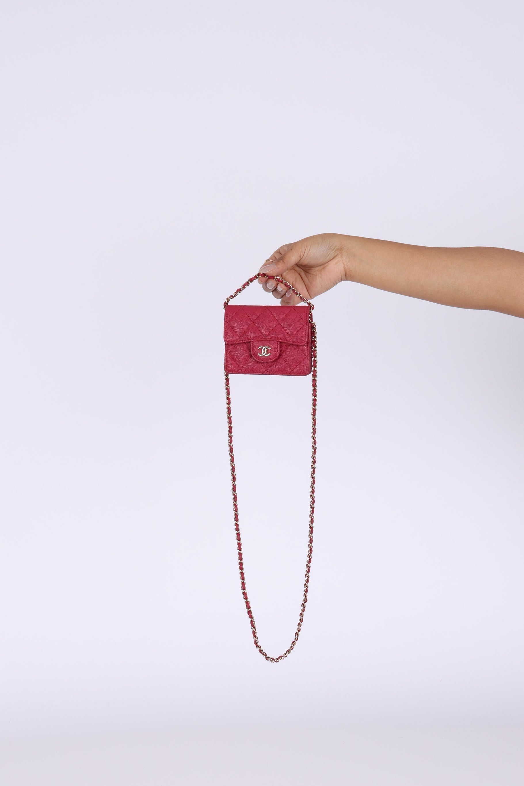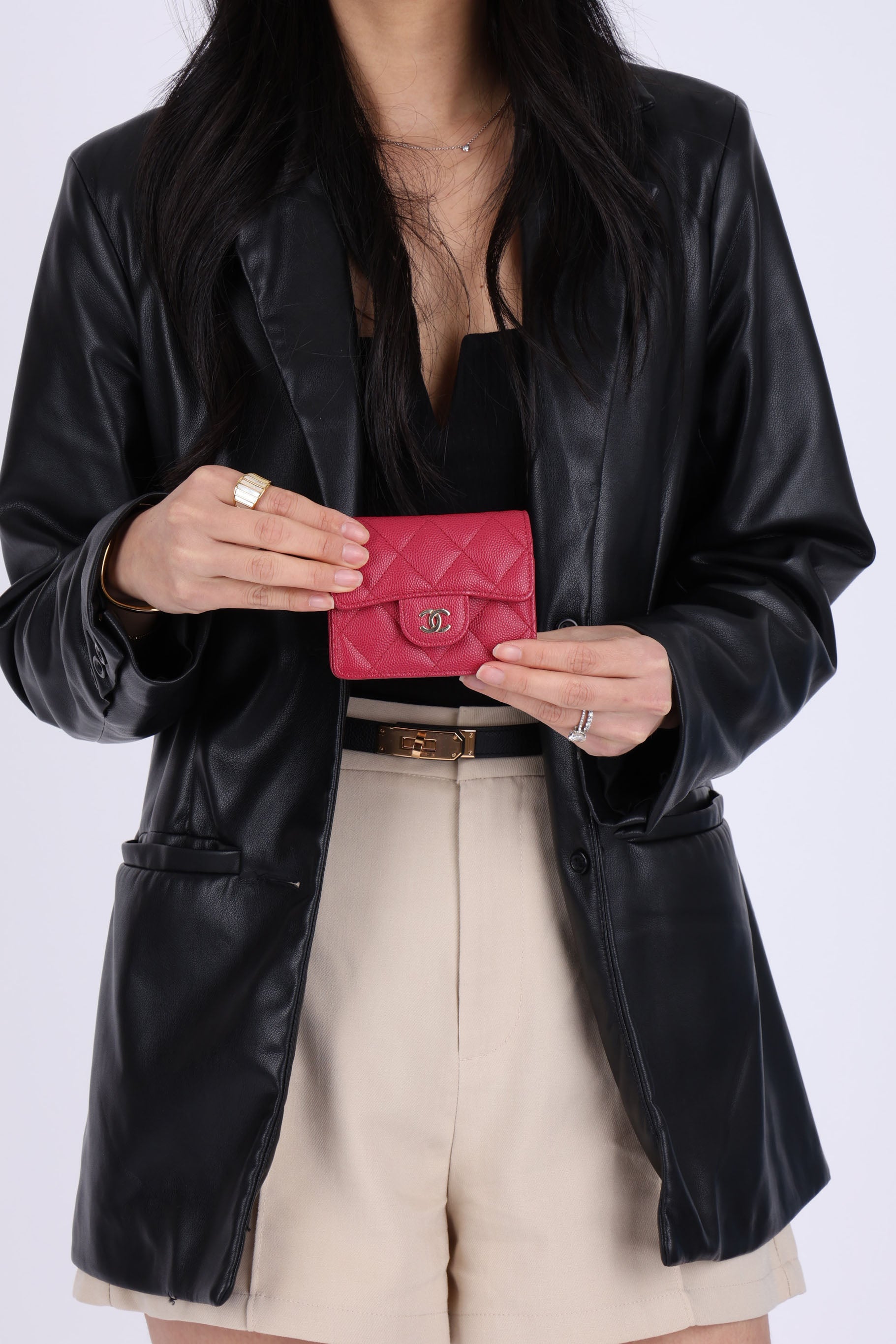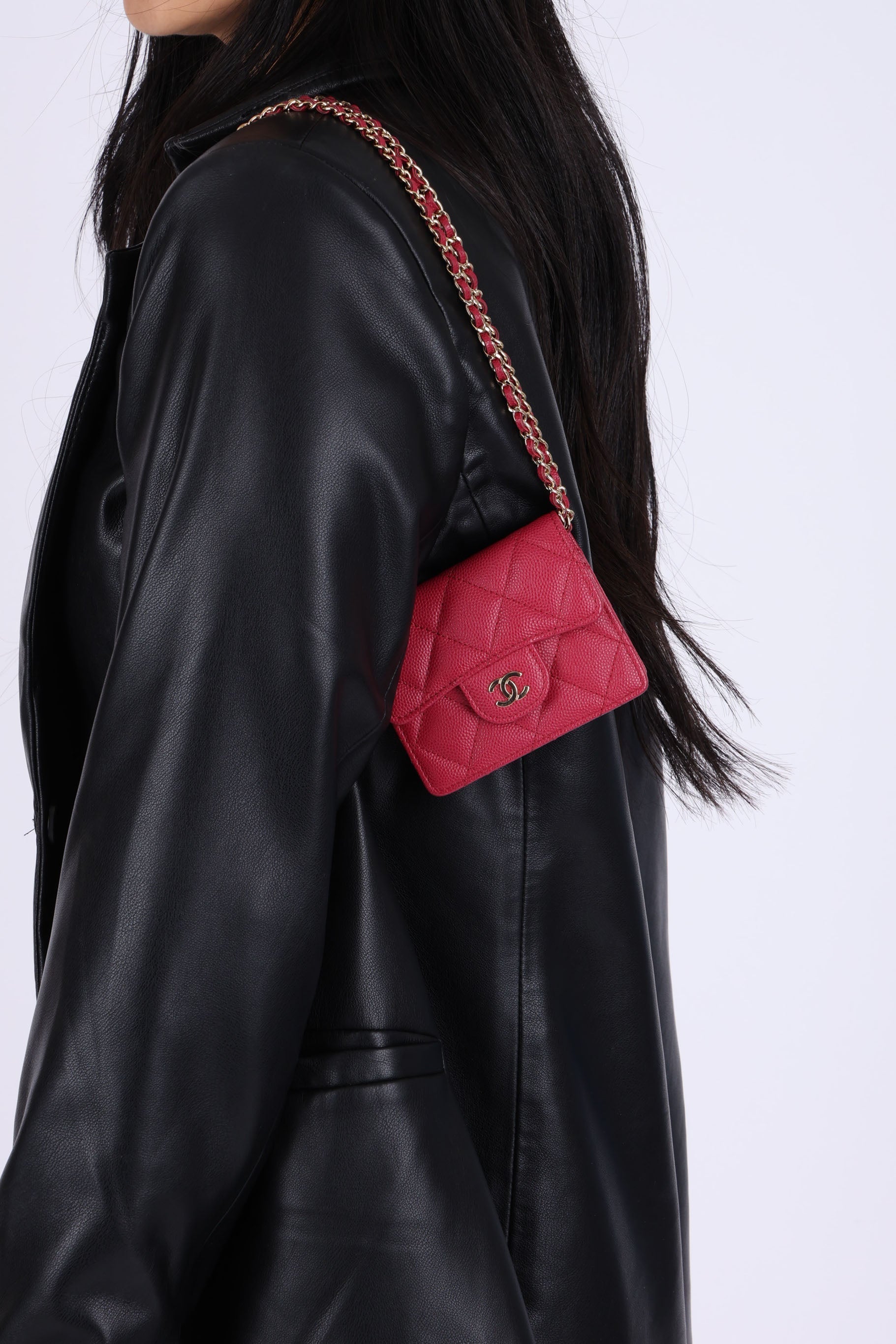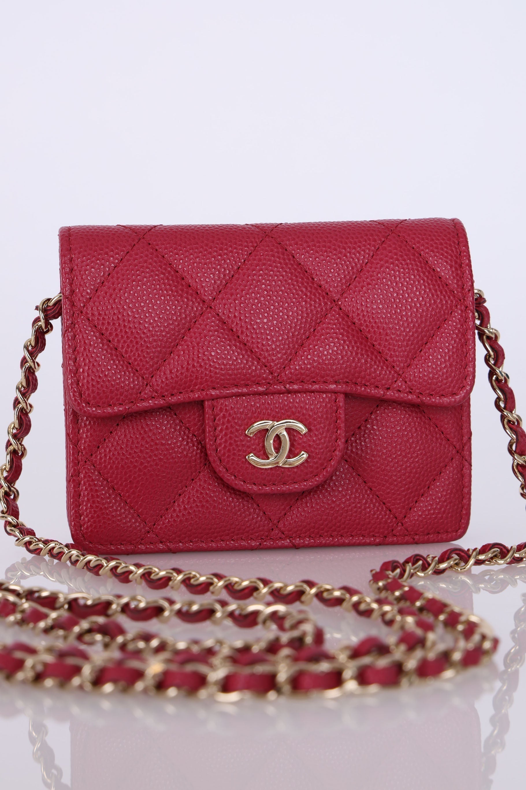 Dropping in the shop is a classic Chanel Caviar Cardholder on Chain in a stunning raspberry color with gold hardware! Perfect mini size for traveling or everyday errands.