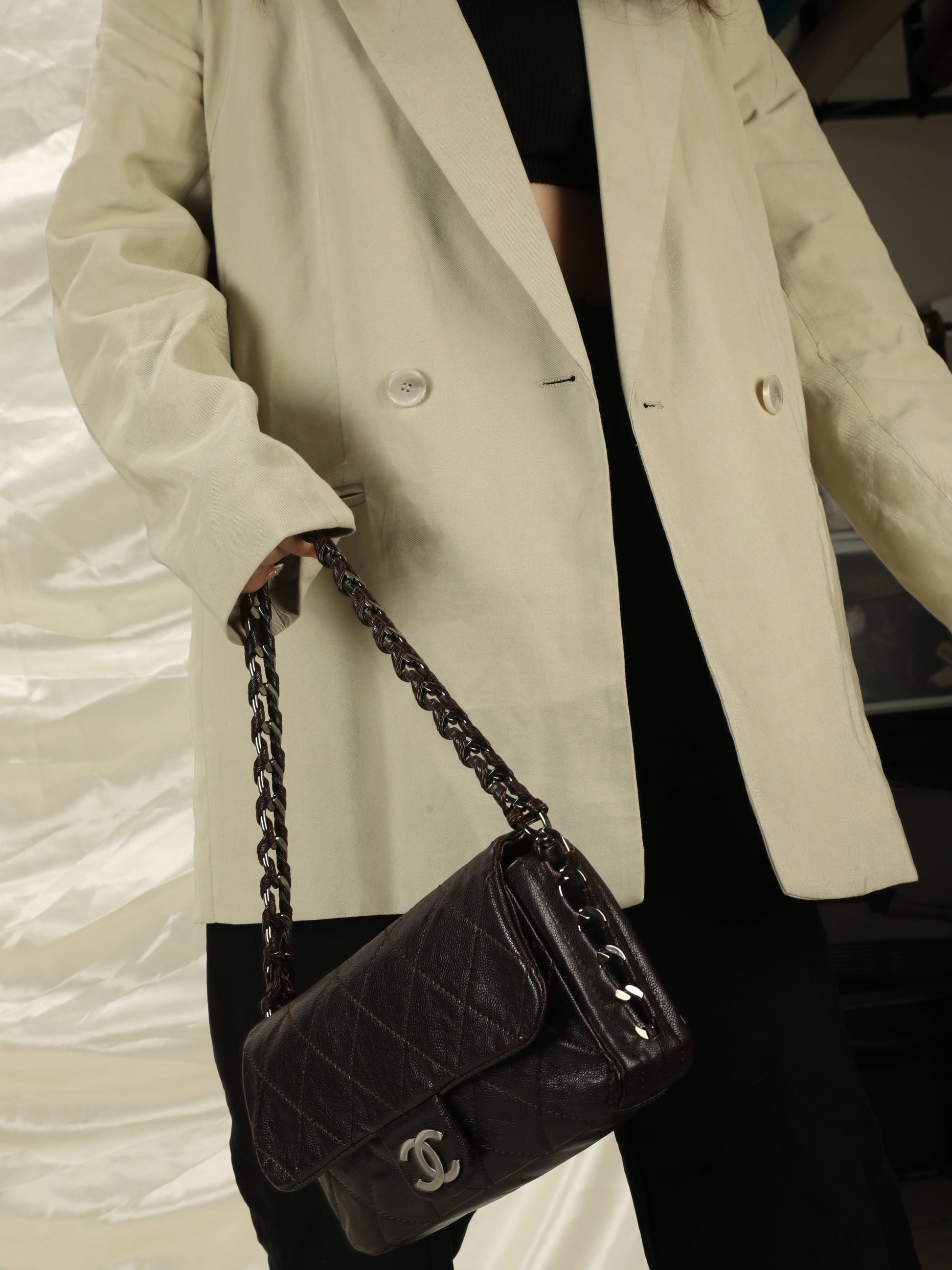 Bringing a unique take on a Chanel caviar piece to the shop! The sides of this bag are comprised of the caviar leather??braided with individual chain grommets adding edge to any outfit. Stunning metallic interior matches hardware.??Crafted between 2006-2008.