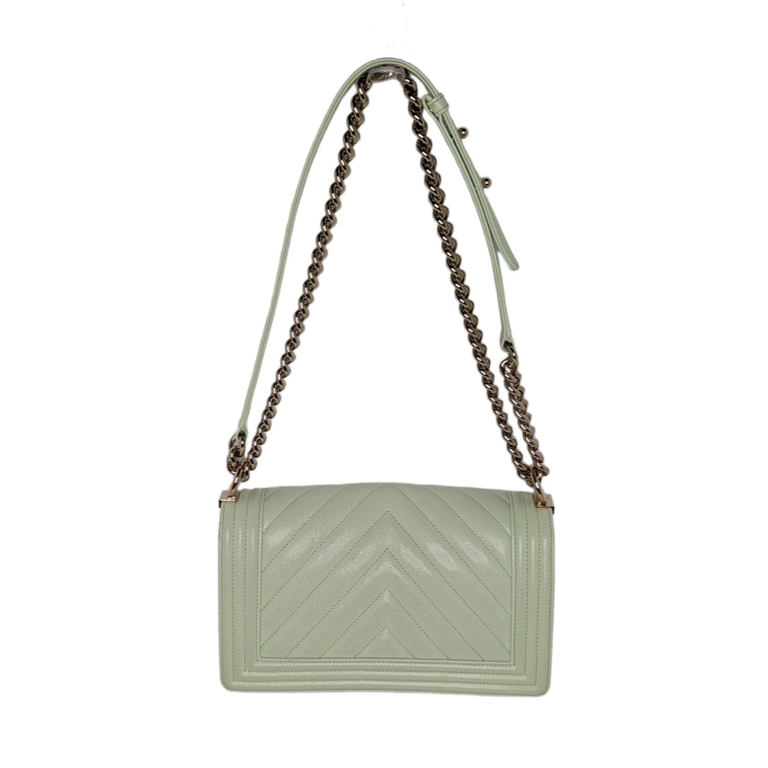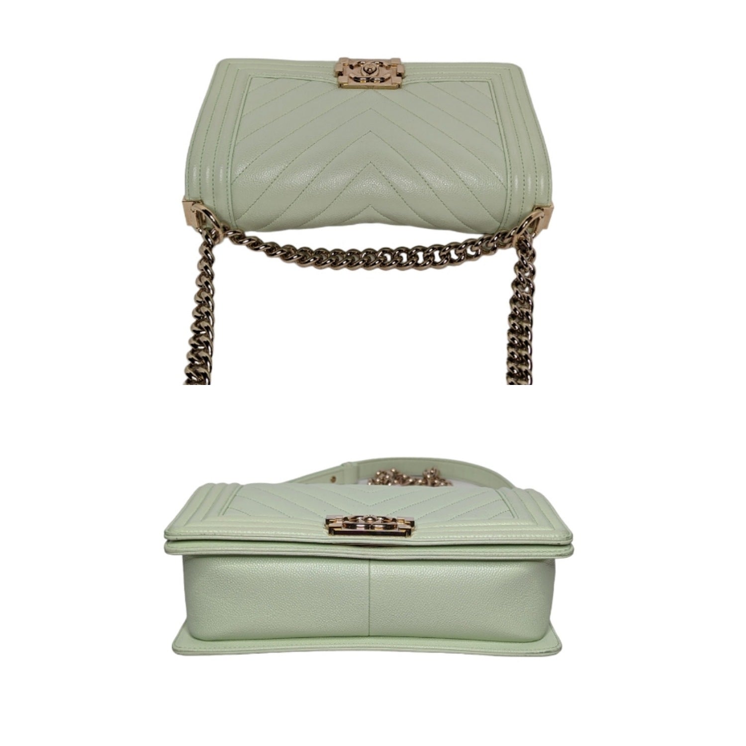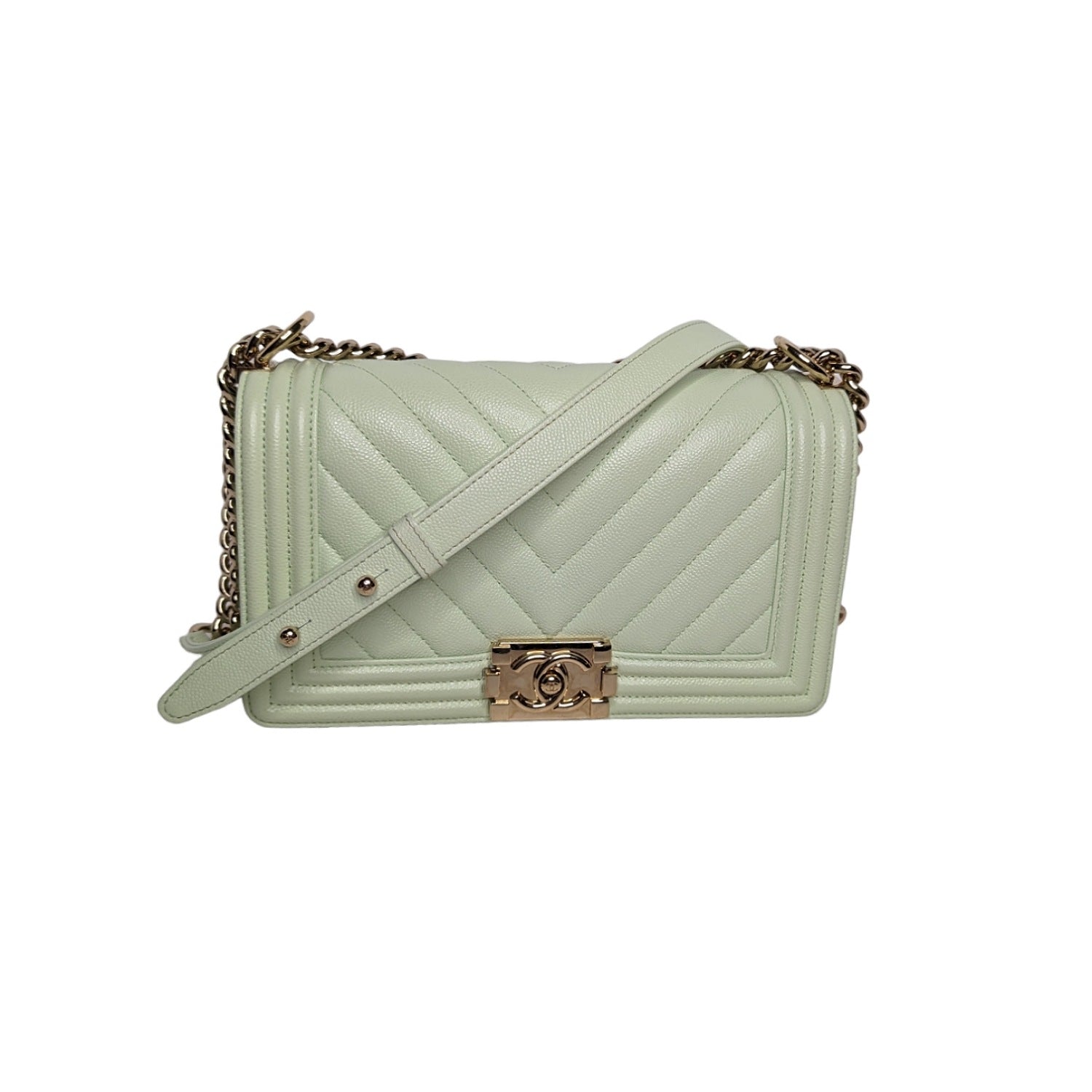 Chanel Caviar Chevron Quilted Medium Boy Flap in Light Green. This chic shoulder bag features luxurious chevron quilted caviar leather framed by linear quilting in green. The bag features a polished gold chain link strap with a leather shoulder pad and a polished gold facing Chanel CC Boy lock on the front flap. This opens to a green fabric interior with a patch pocket. 5,900.