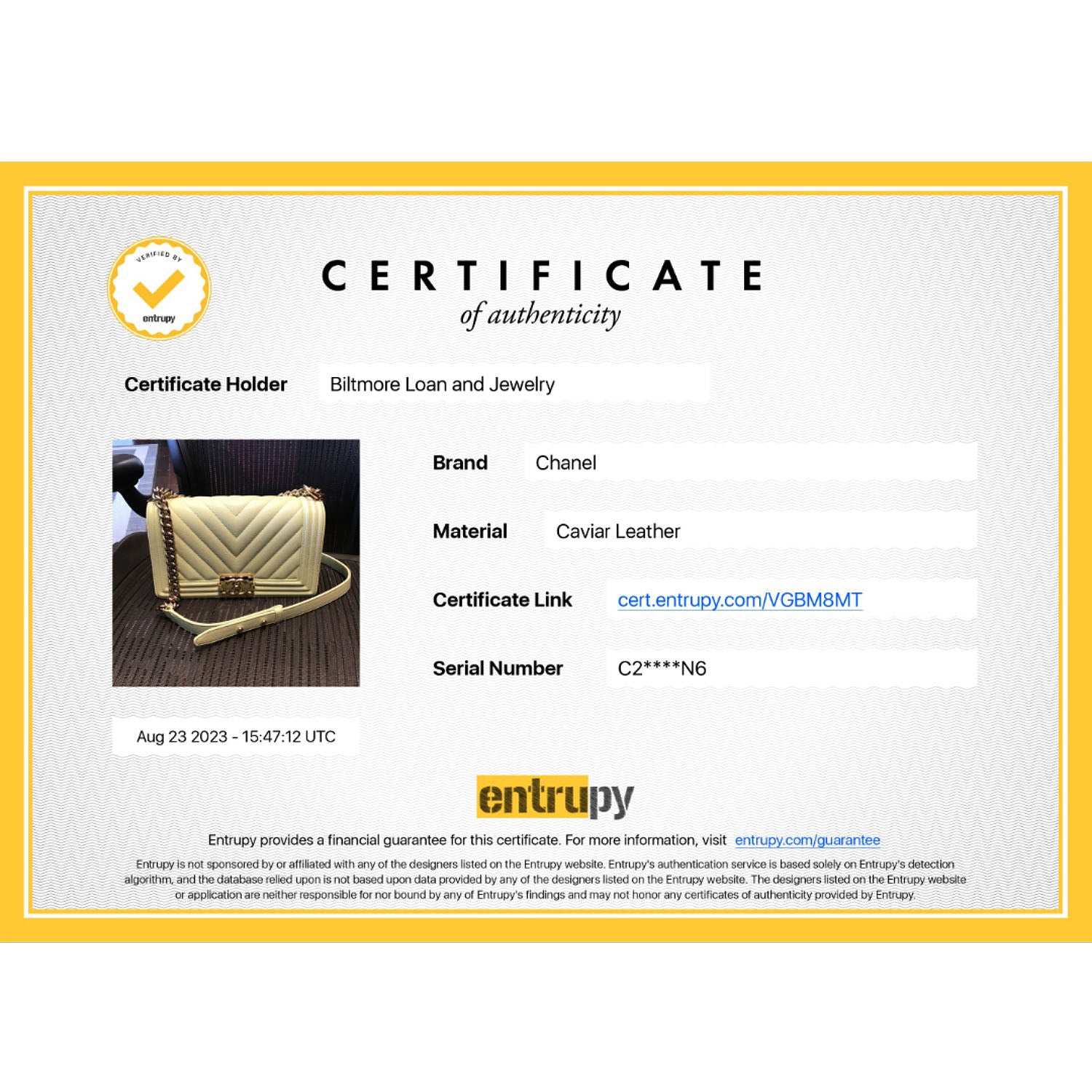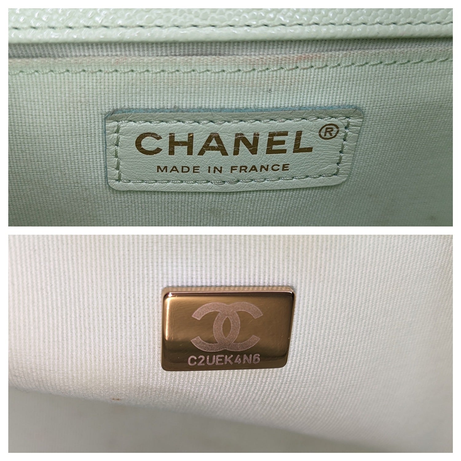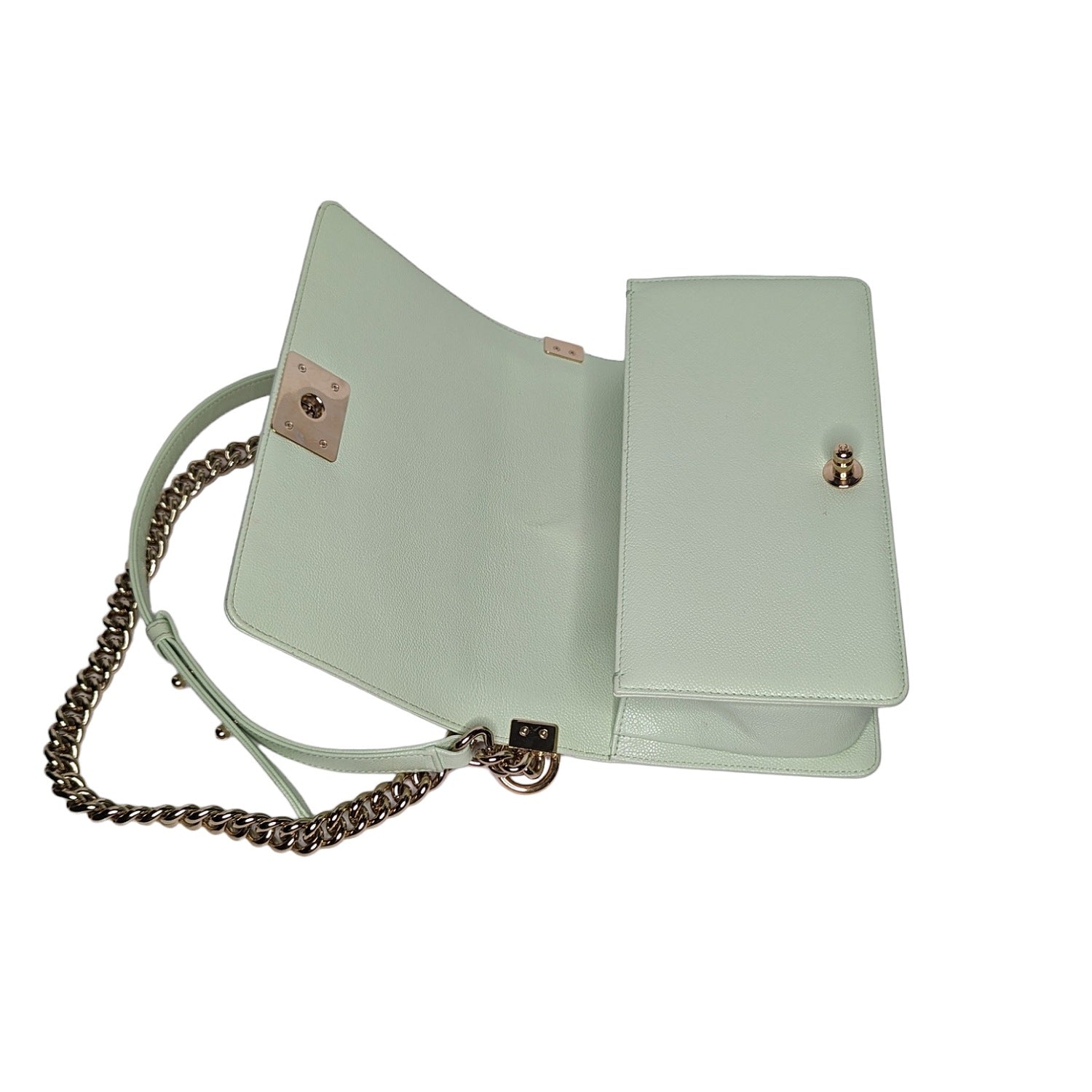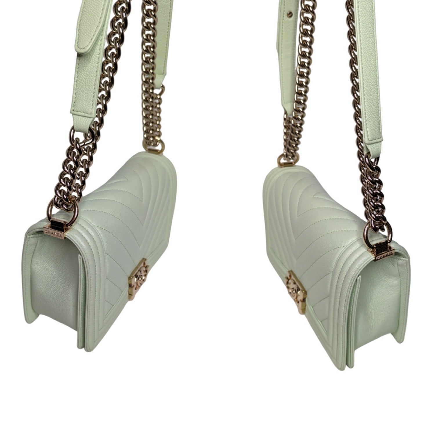 Chanel Caviar Chevron Quilted Medium Boy Flap in Light Green. This chic shoulder bag features luxurious chevron quilted caviar leather framed by linear quilting in green. The bag features a polished gold chain link strap with a leather shoulder pad and a polished gold facing Chanel CC Boy lock on the front flap. This opens to a green fabric interior with a patch pocket. 5,900.
