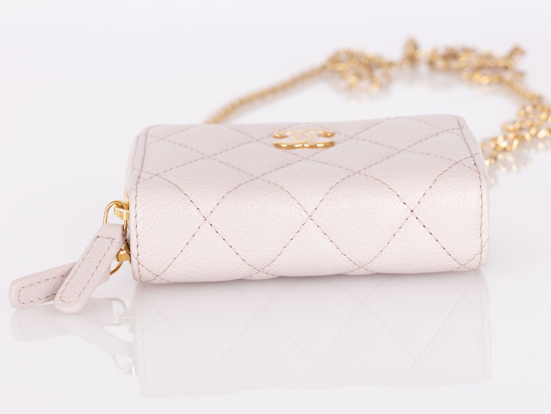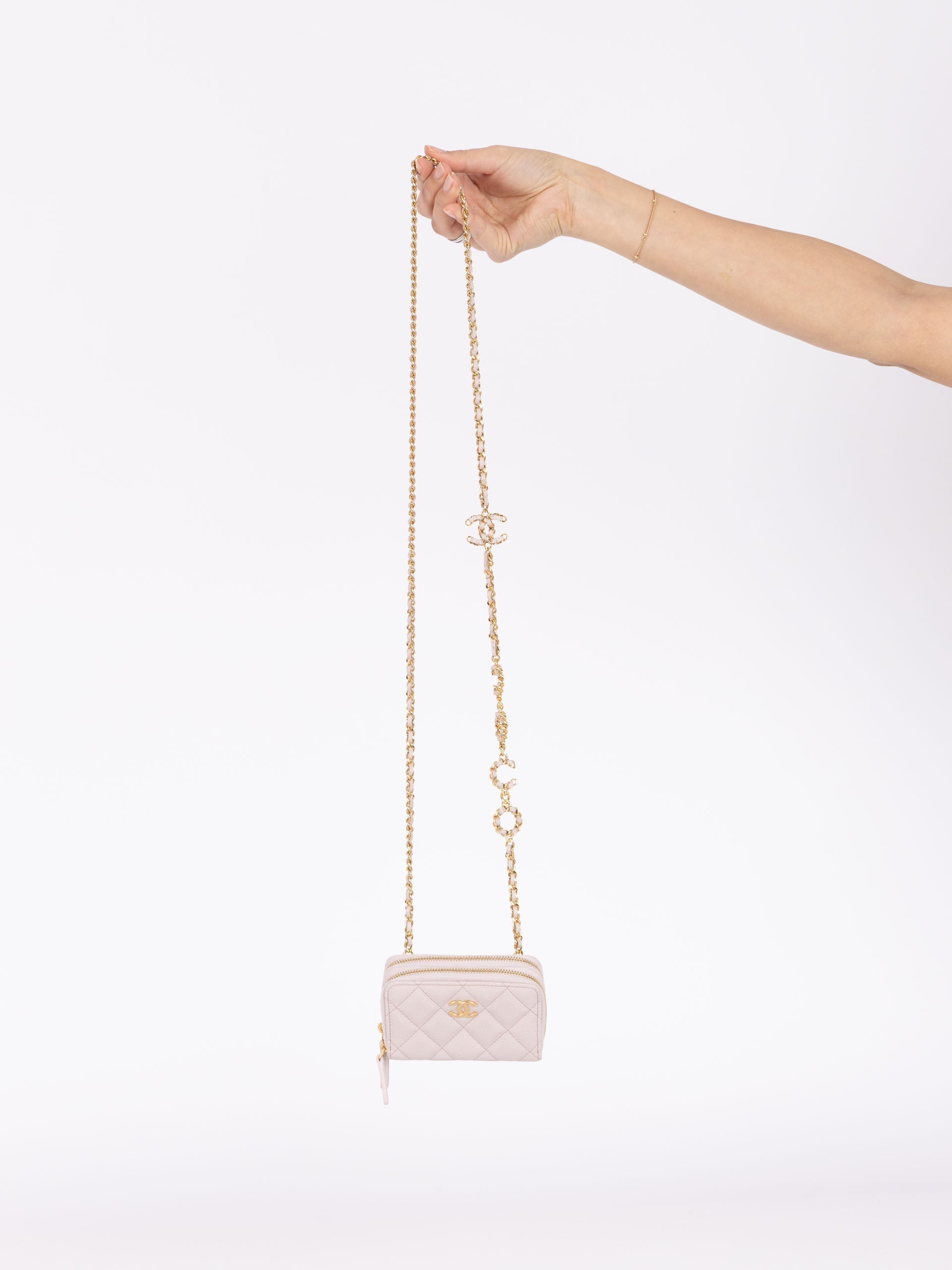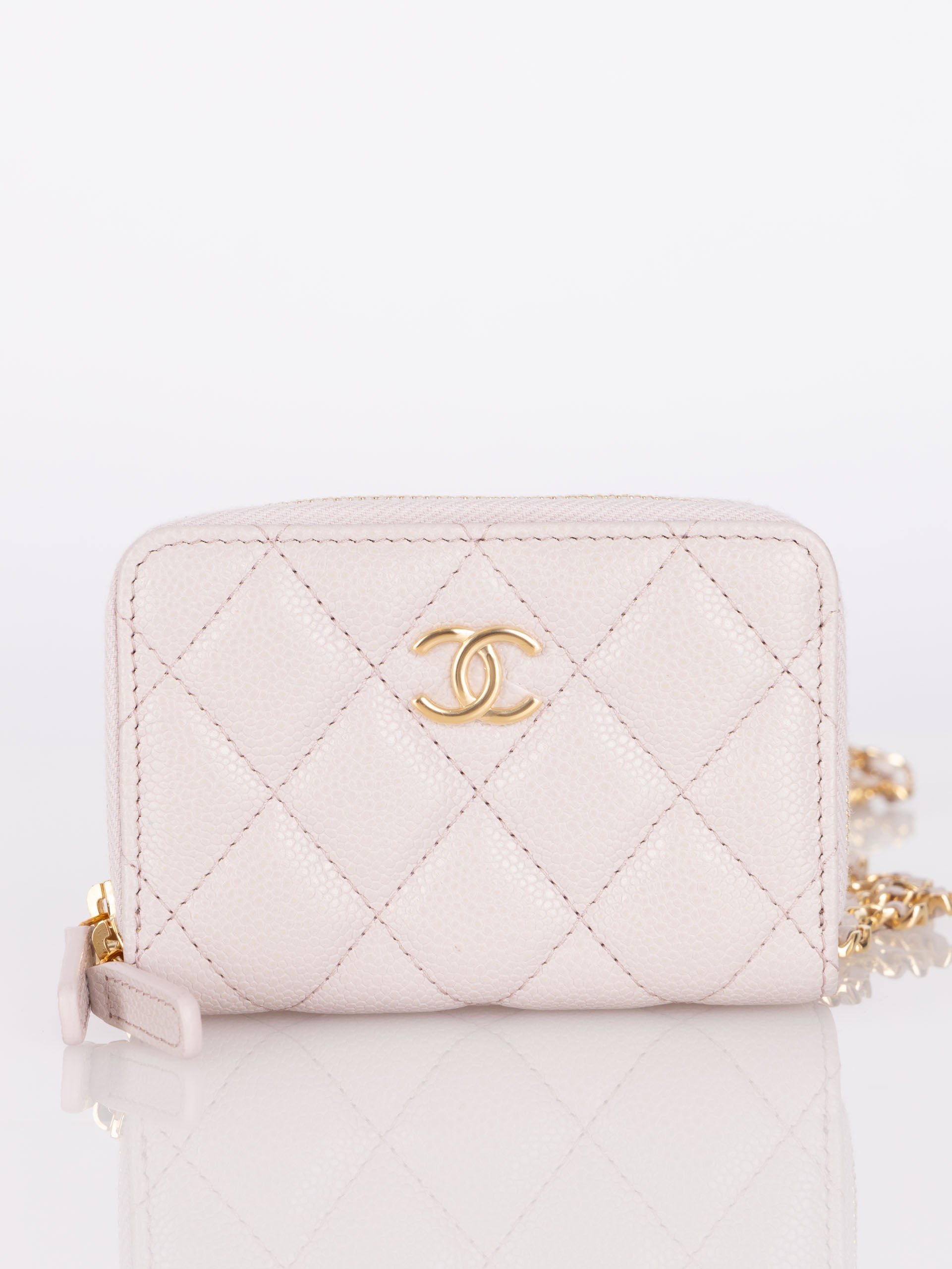 Dropping a chic Chanel caviar cardholder, but with a stunning COCO chain! This very light lilac and gold hardware piece is a collector's item, and will definitely turn heads at any event this season.