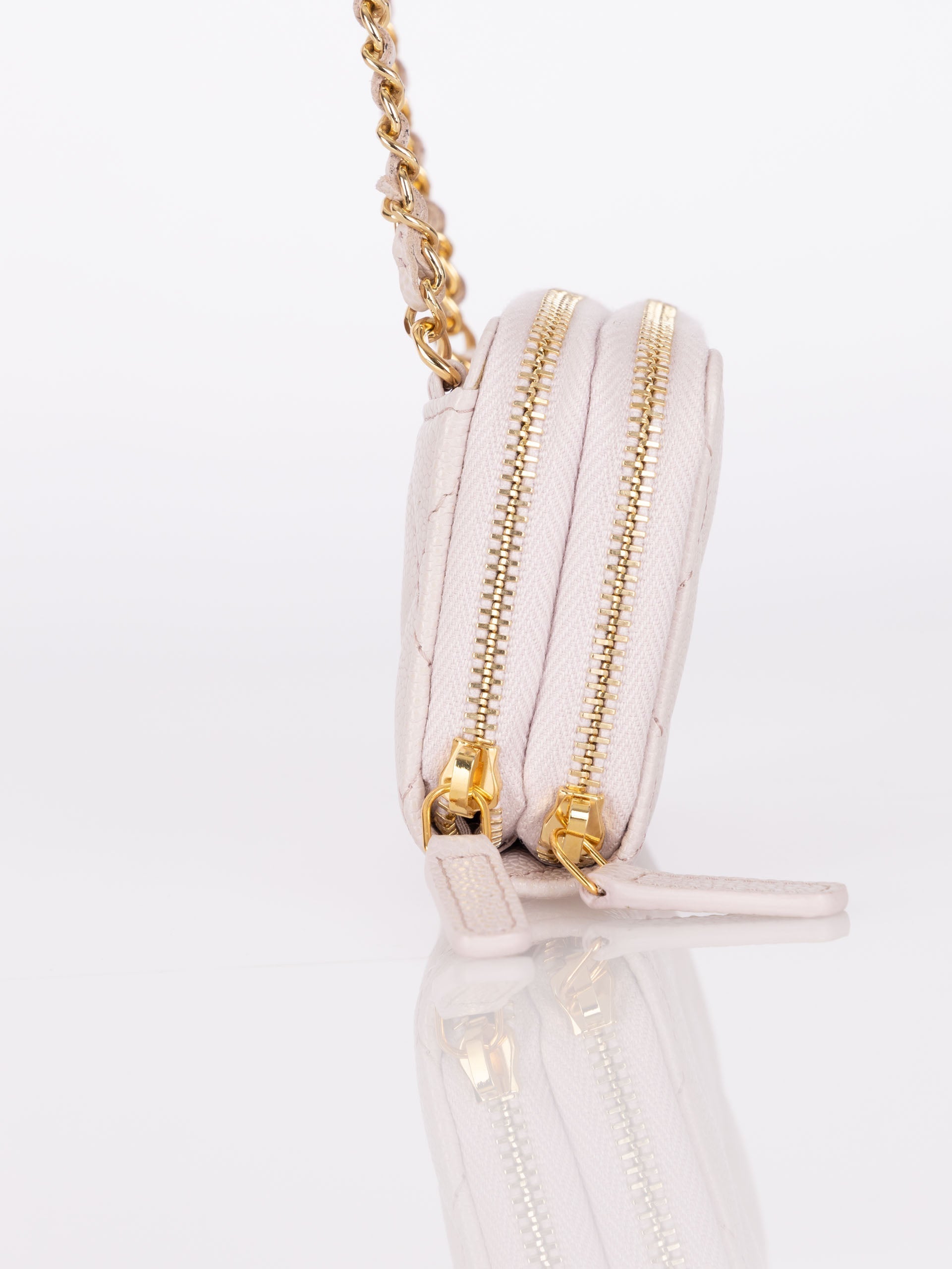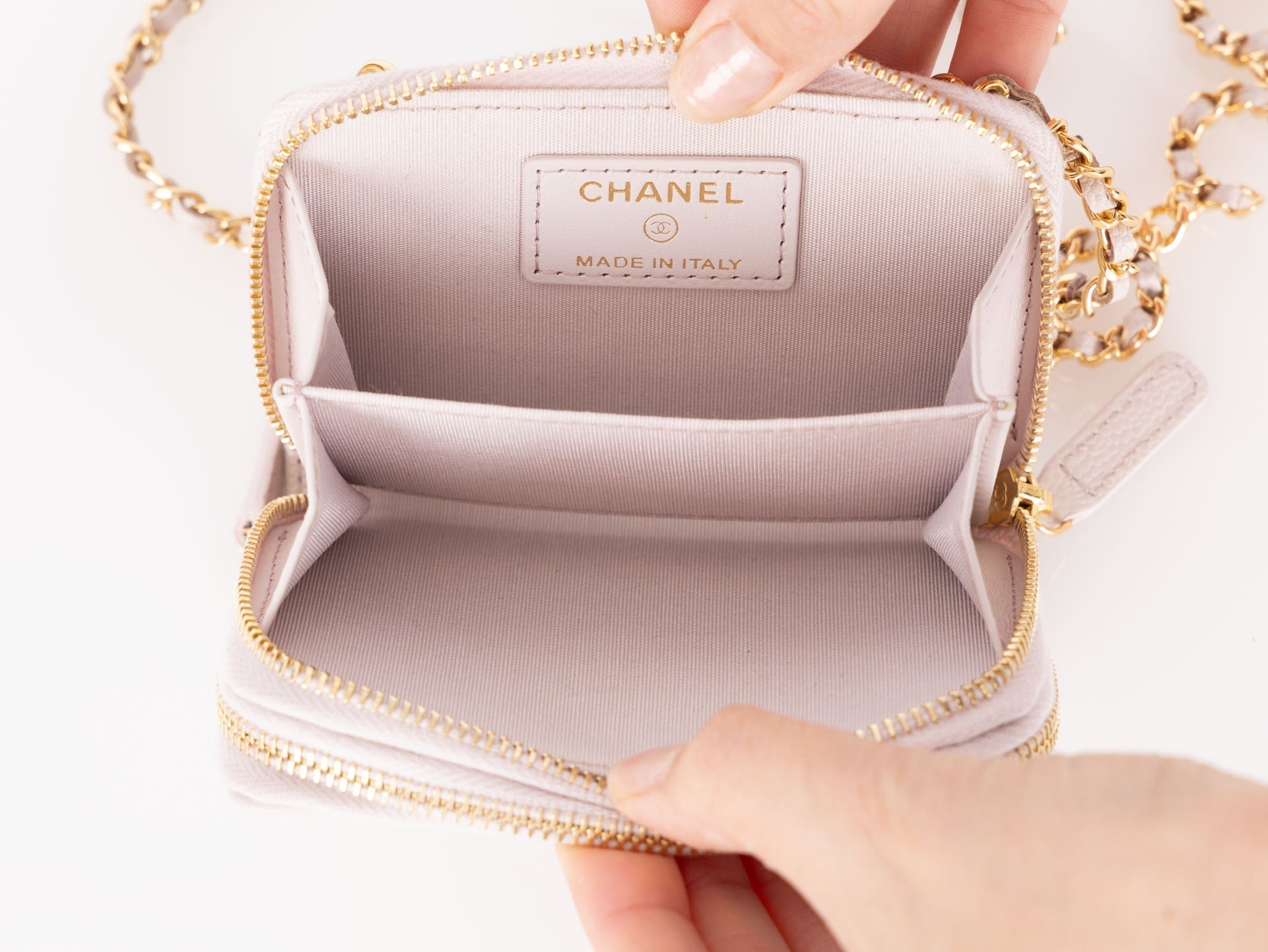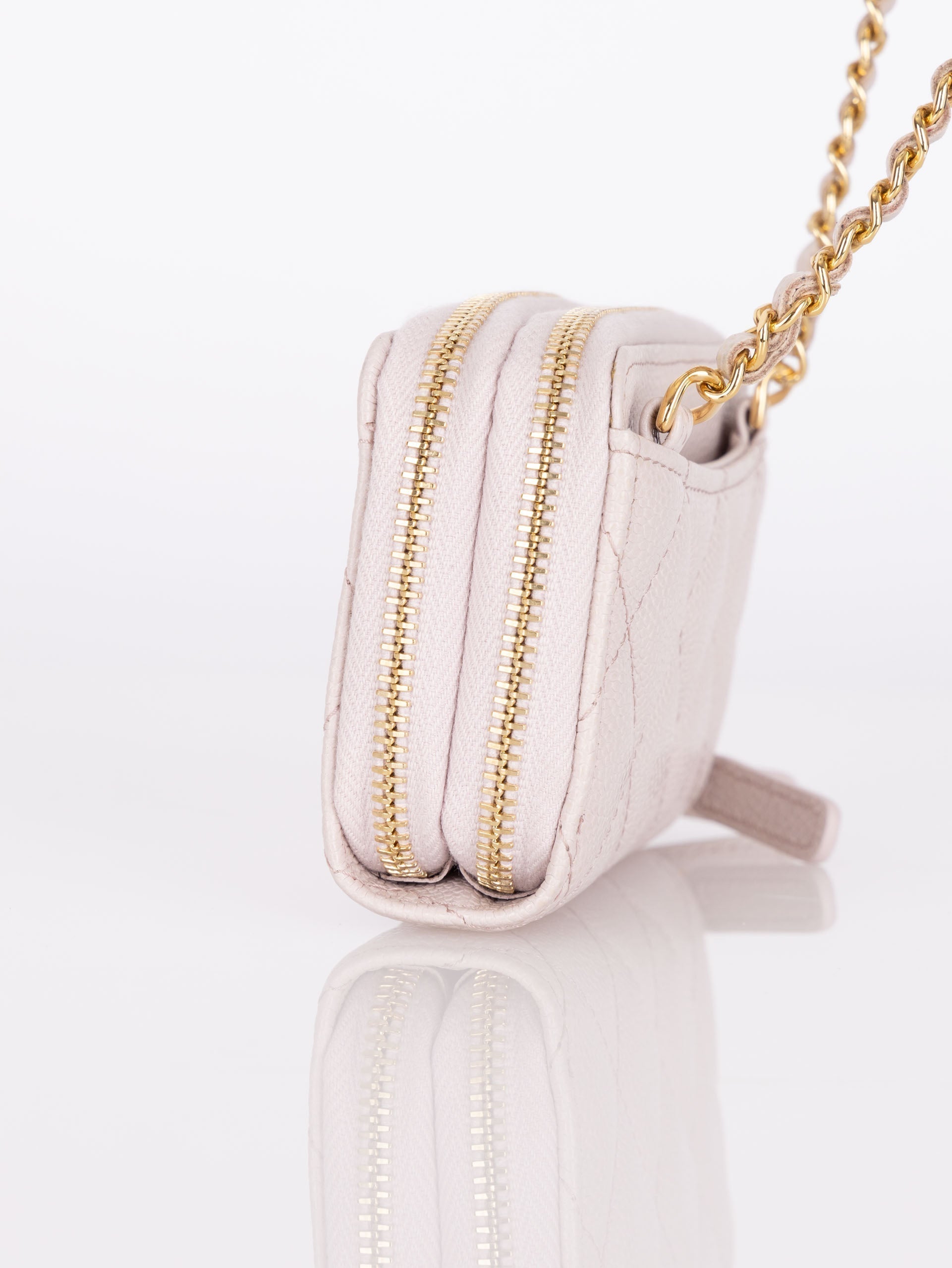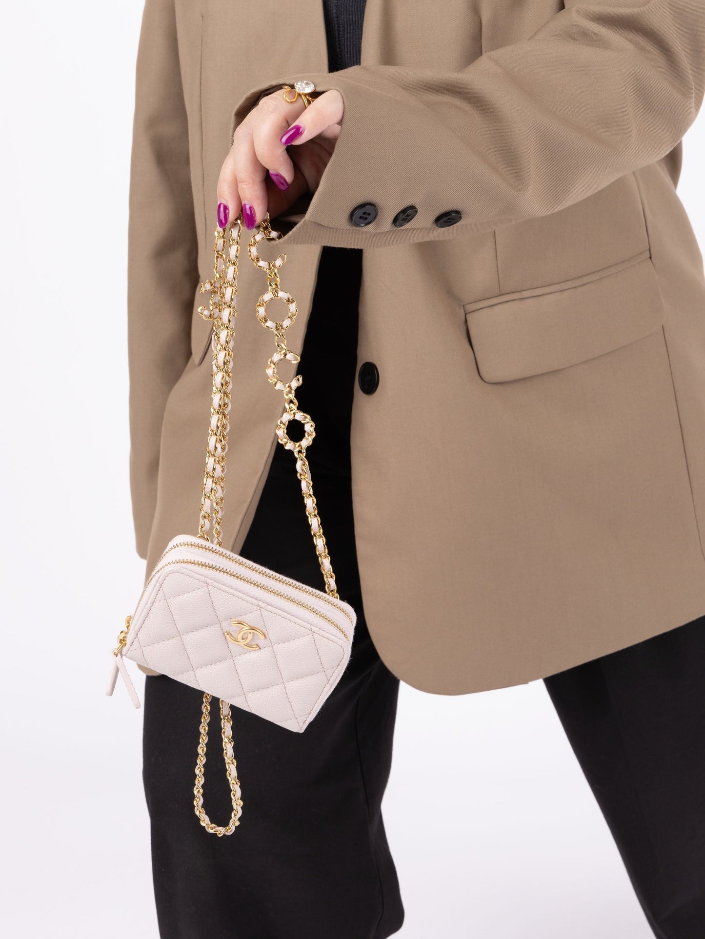 Dropping a chic Chanel caviar cardholder, but with a stunning COCO chain! This very light lilac and gold hardware piece is a collector's item, and will definitely turn heads at any event this season.