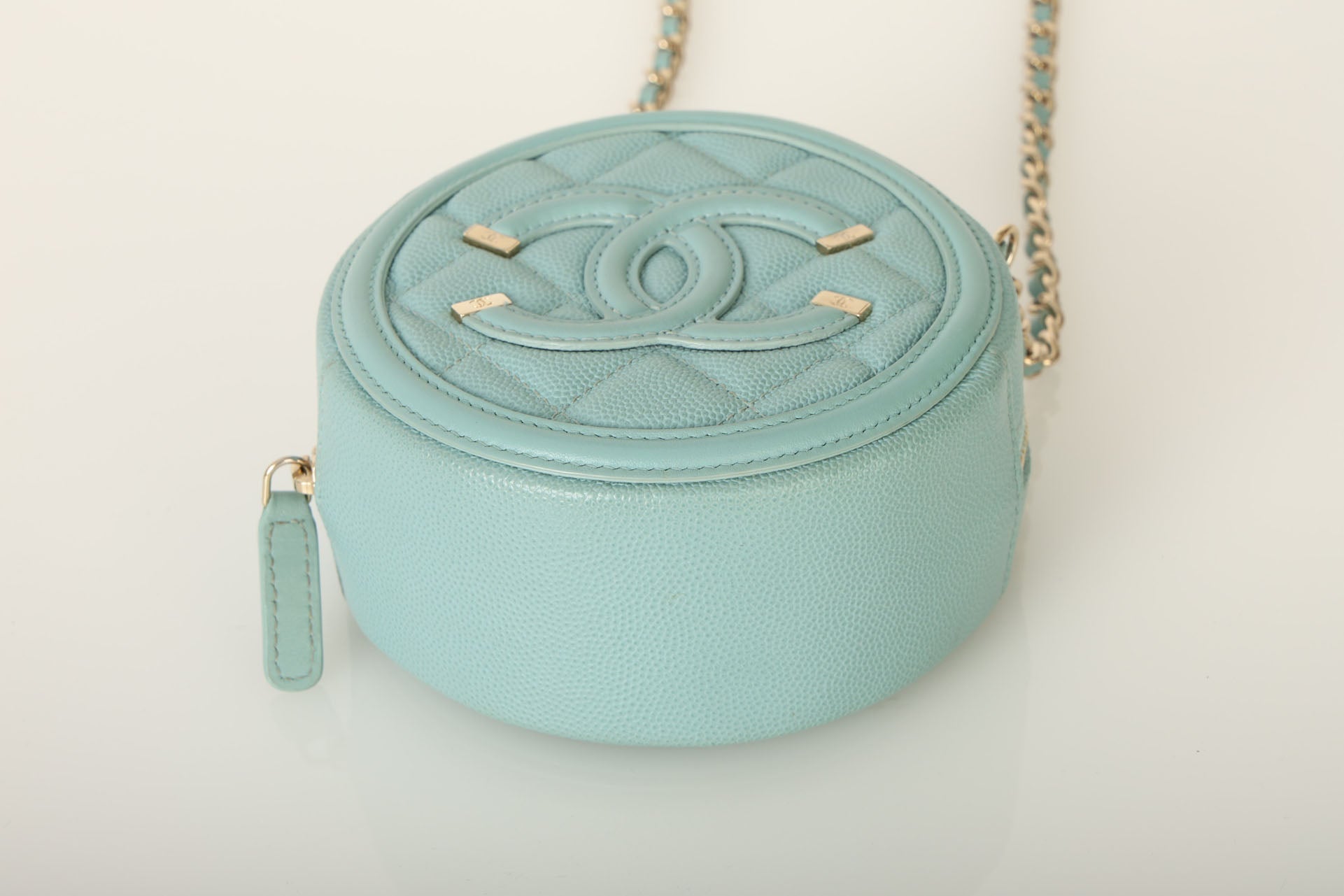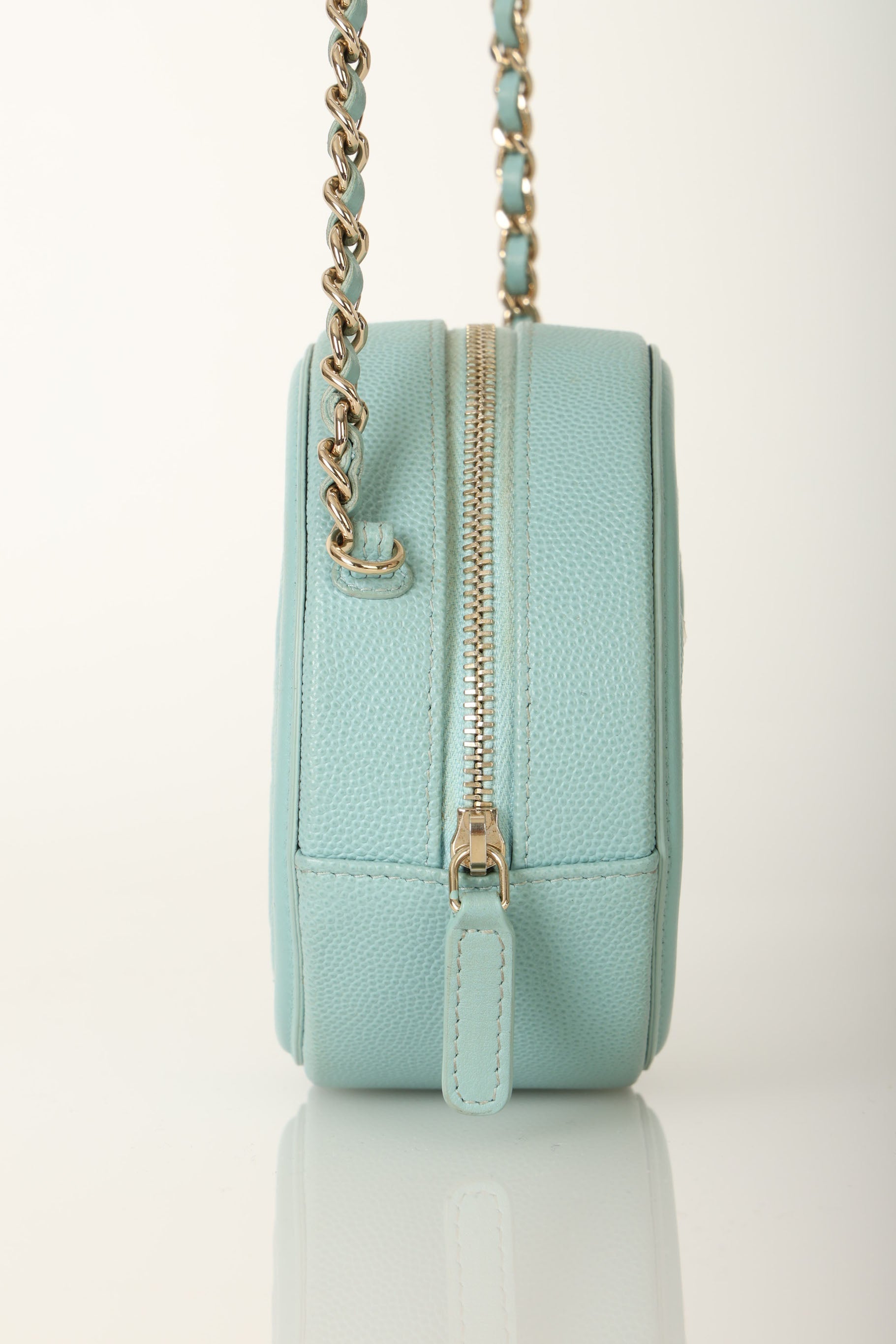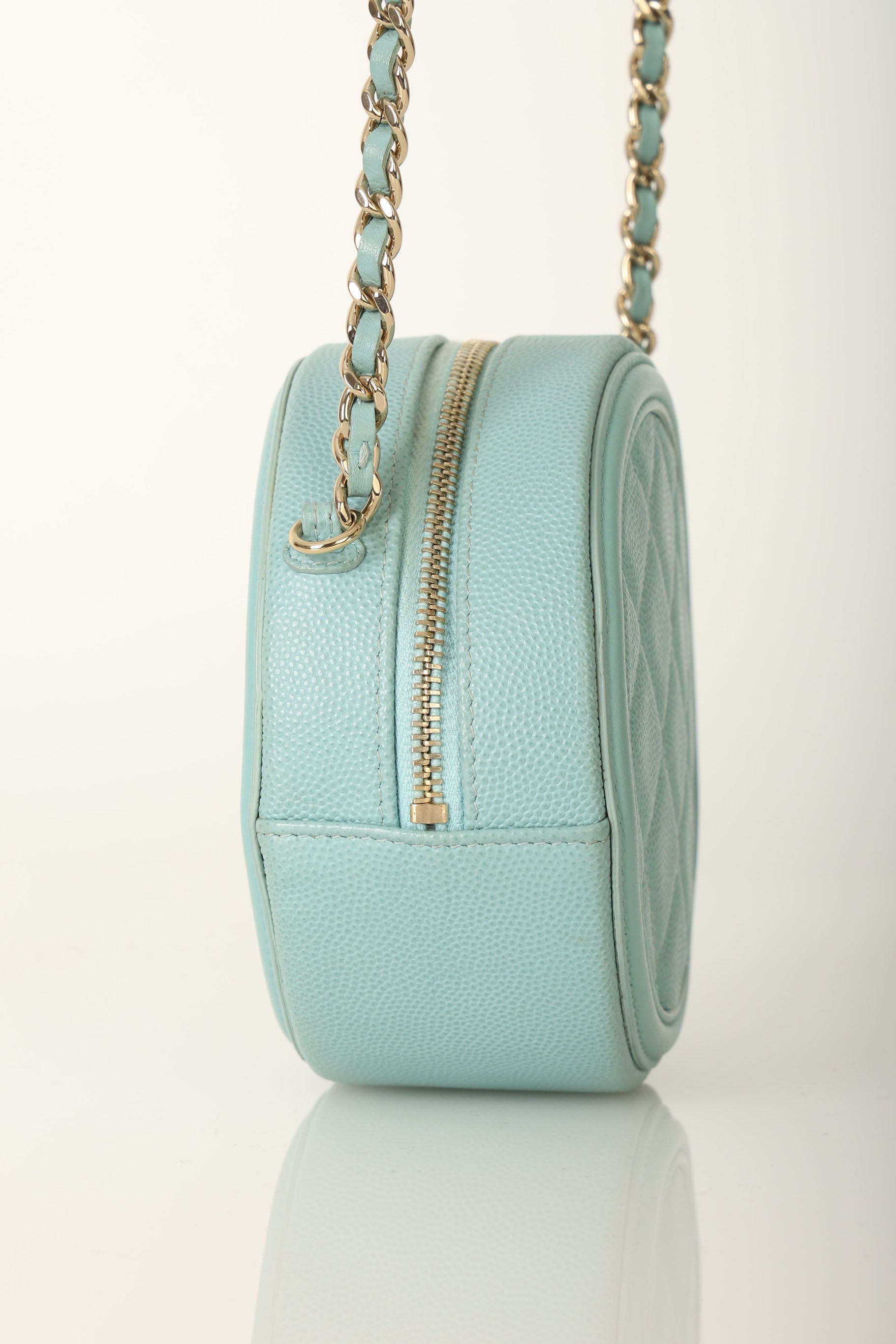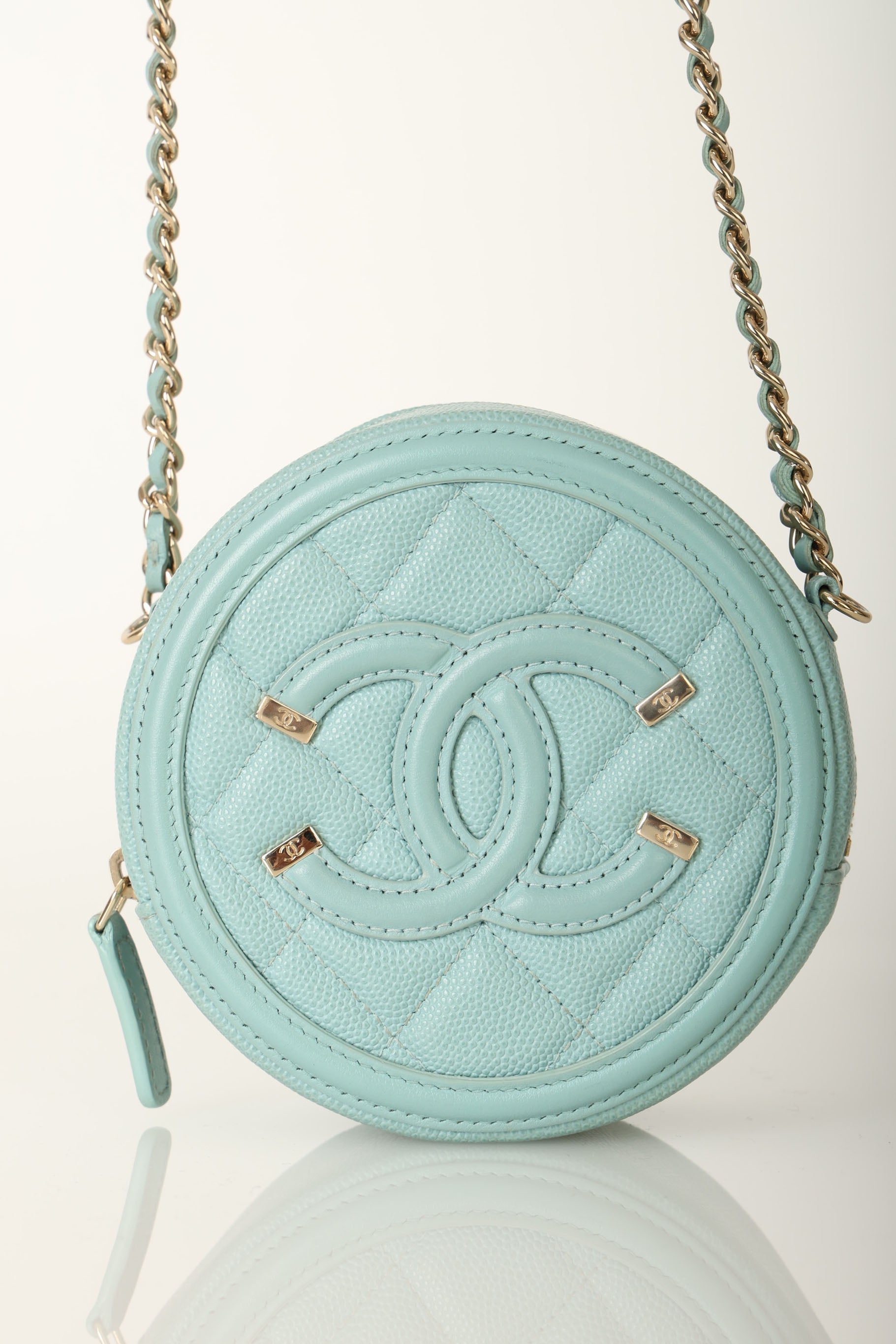 The cutest robin's egg Chanel caviar and champagne gold hardware crossbody - perfect for traveling or fun Spring/Summer events! The filigree CC makes such a beautiful statement, and will complement any outfit!