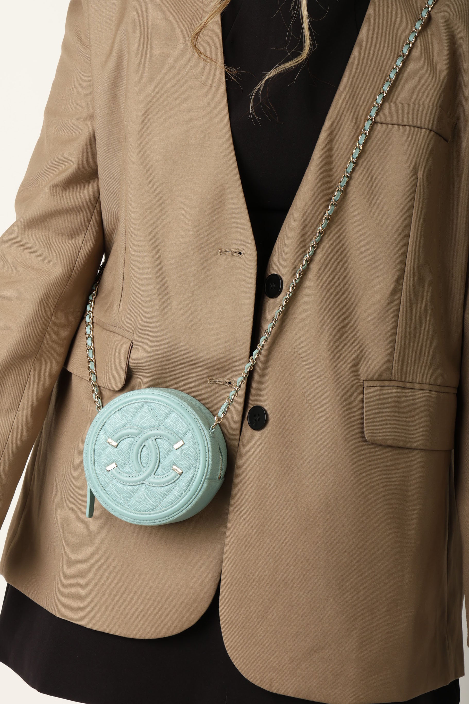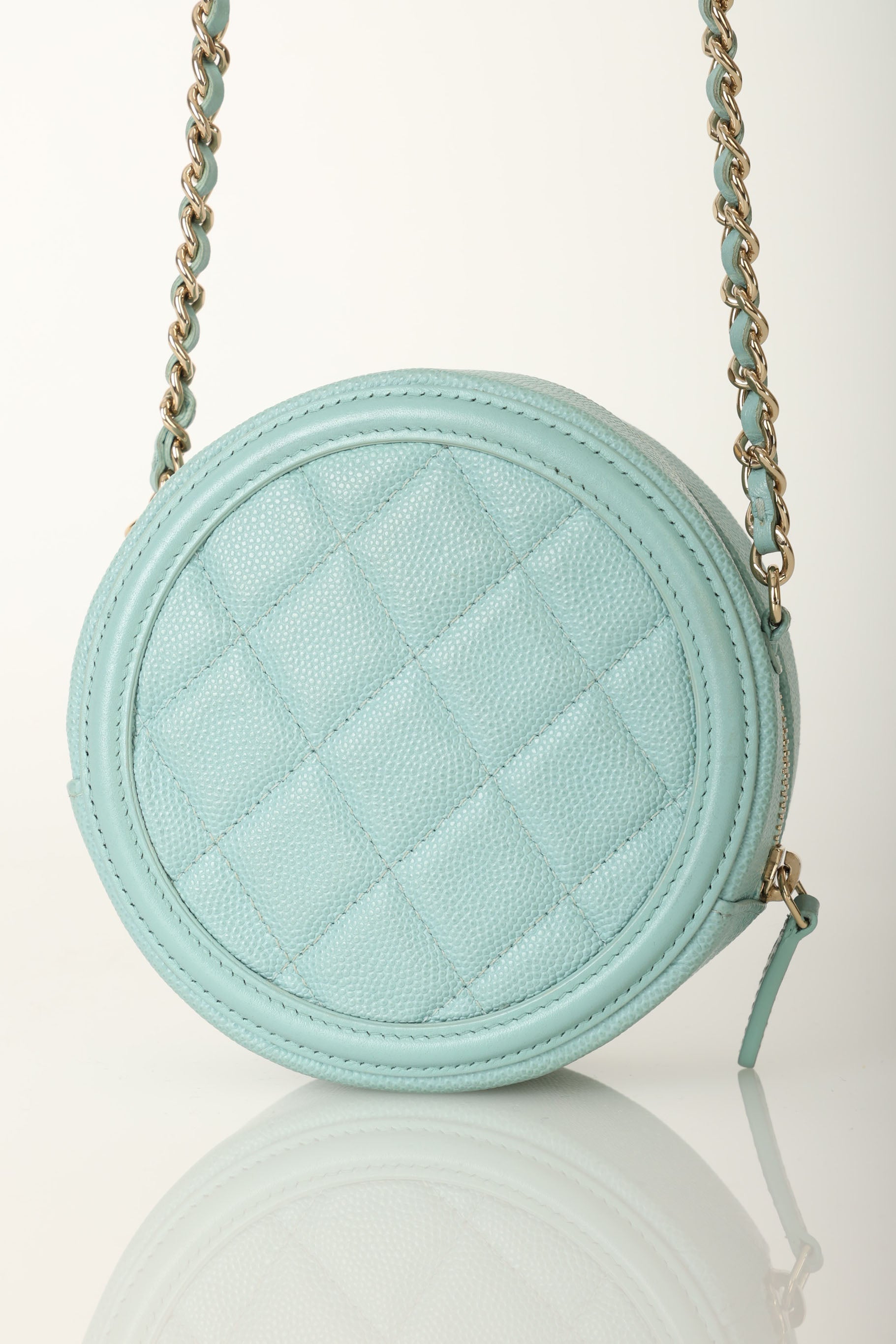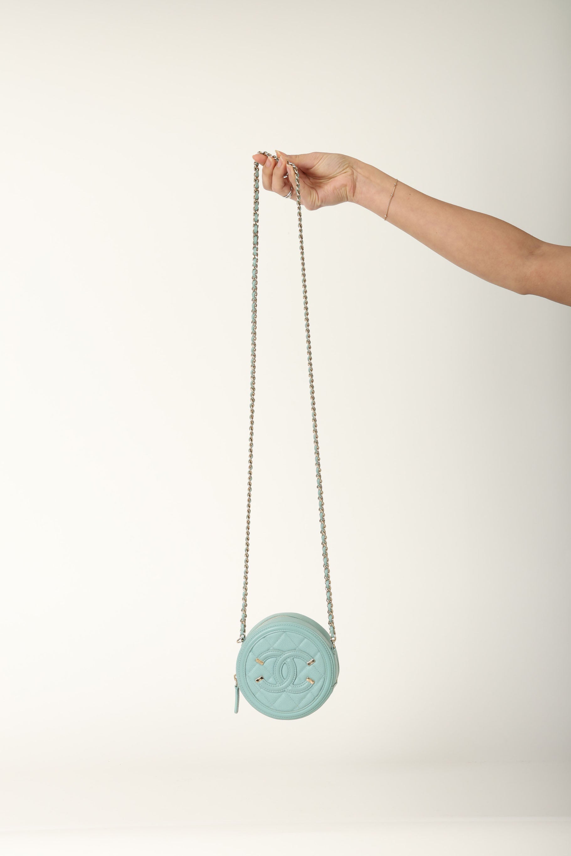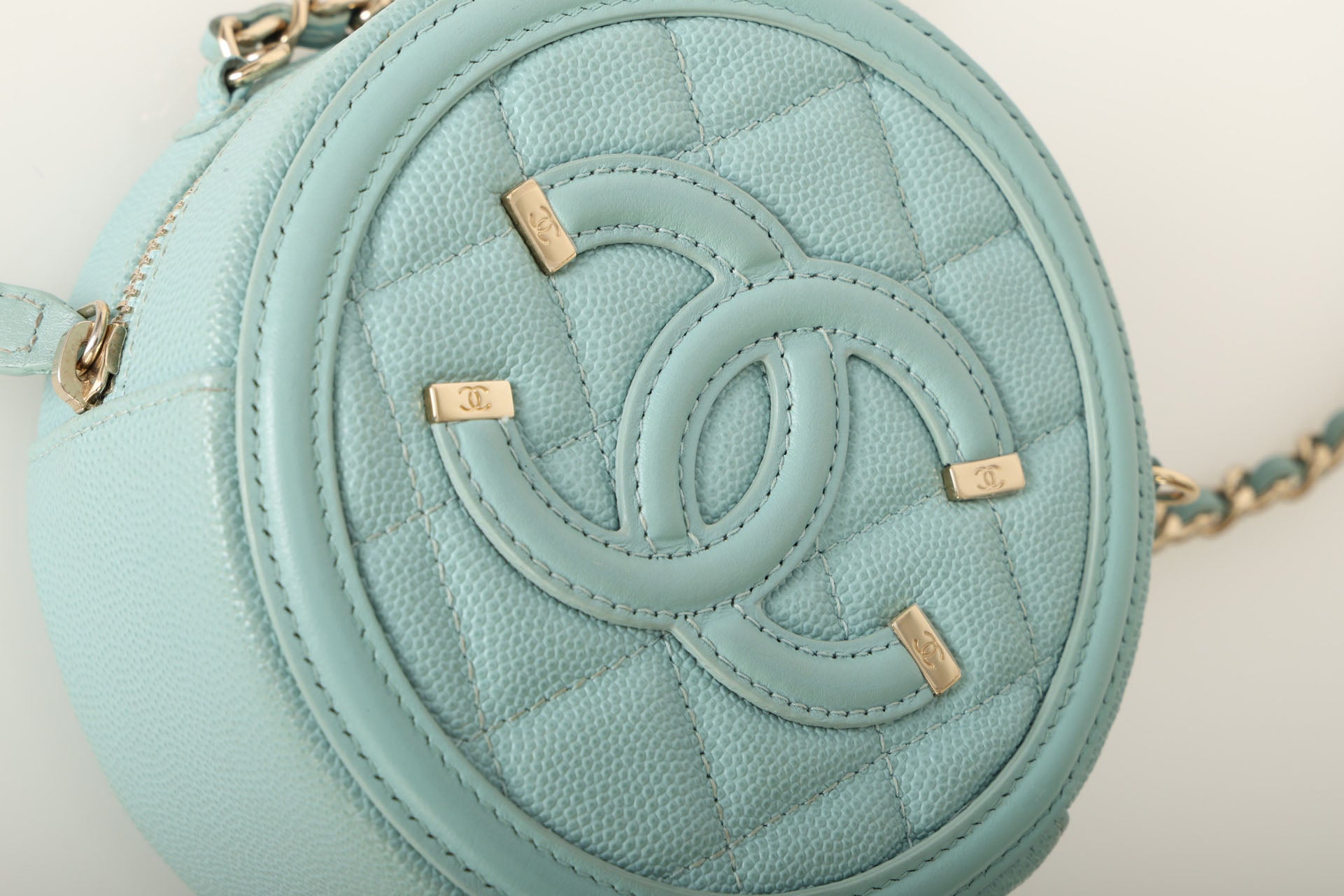 The cutest robin's egg Chanel caviar and champagne gold hardware crossbody - perfect for traveling or fun Spring/Summer events! The filigree CC makes such a beautiful statement, and will complement any outfit!