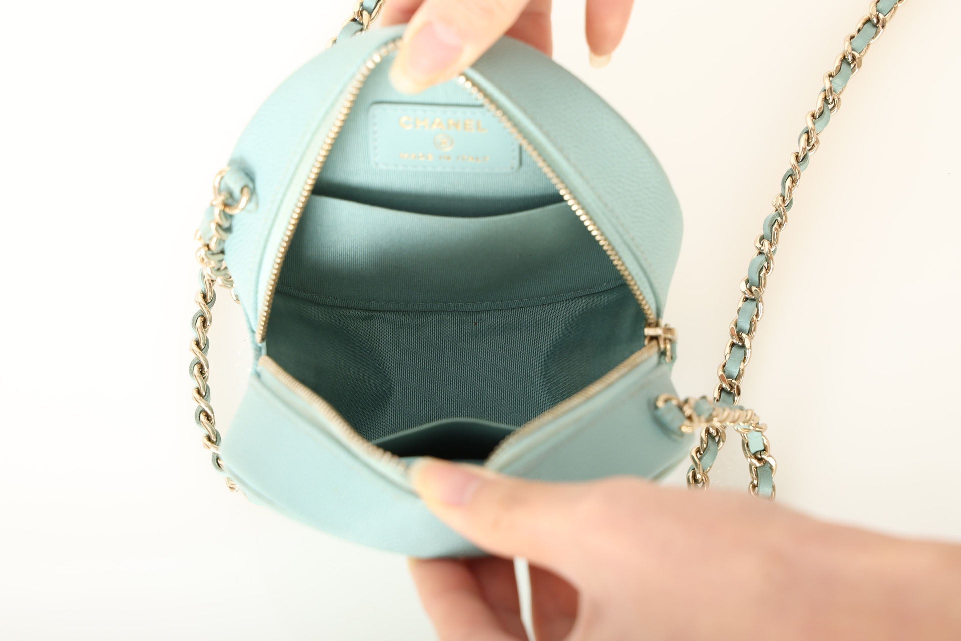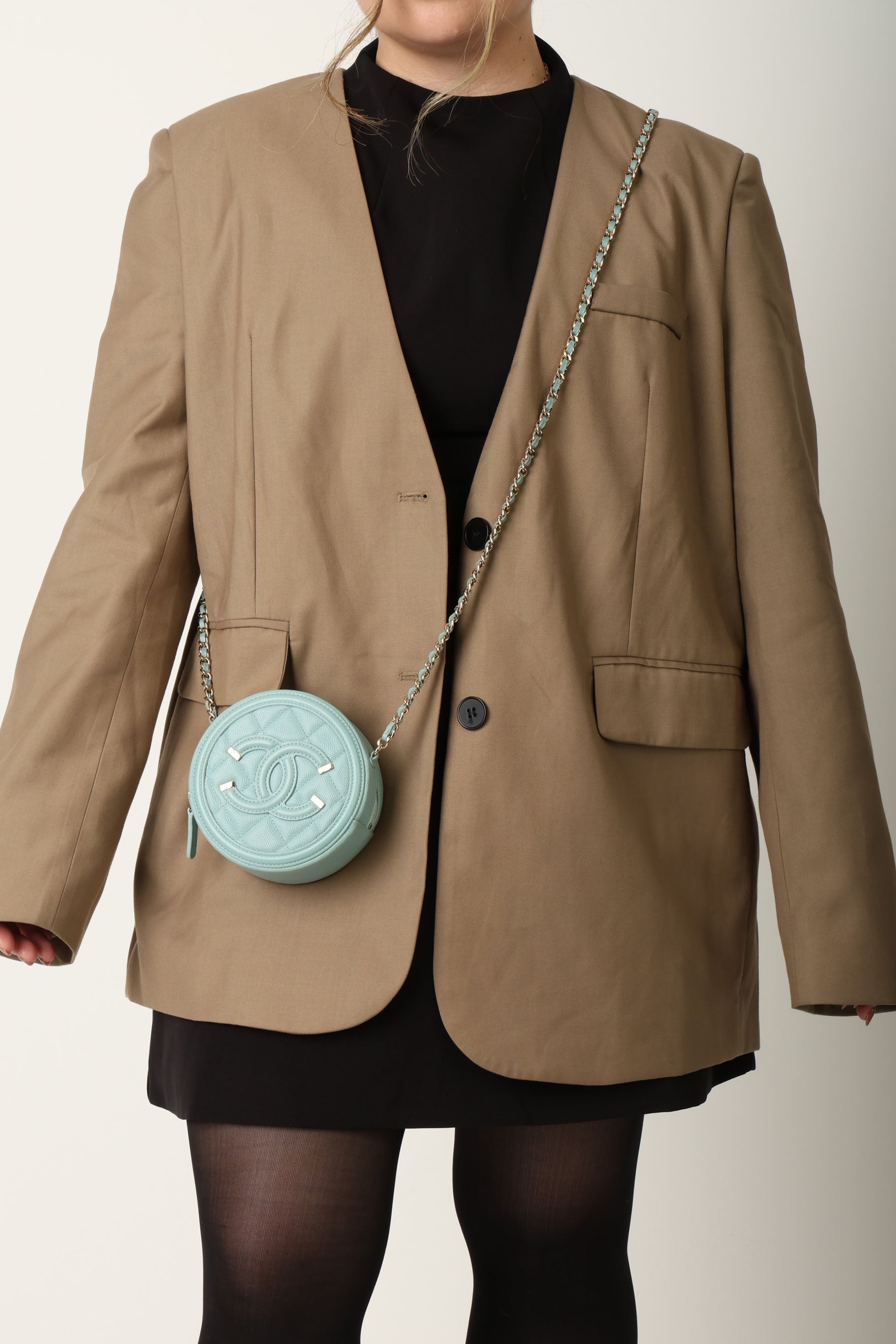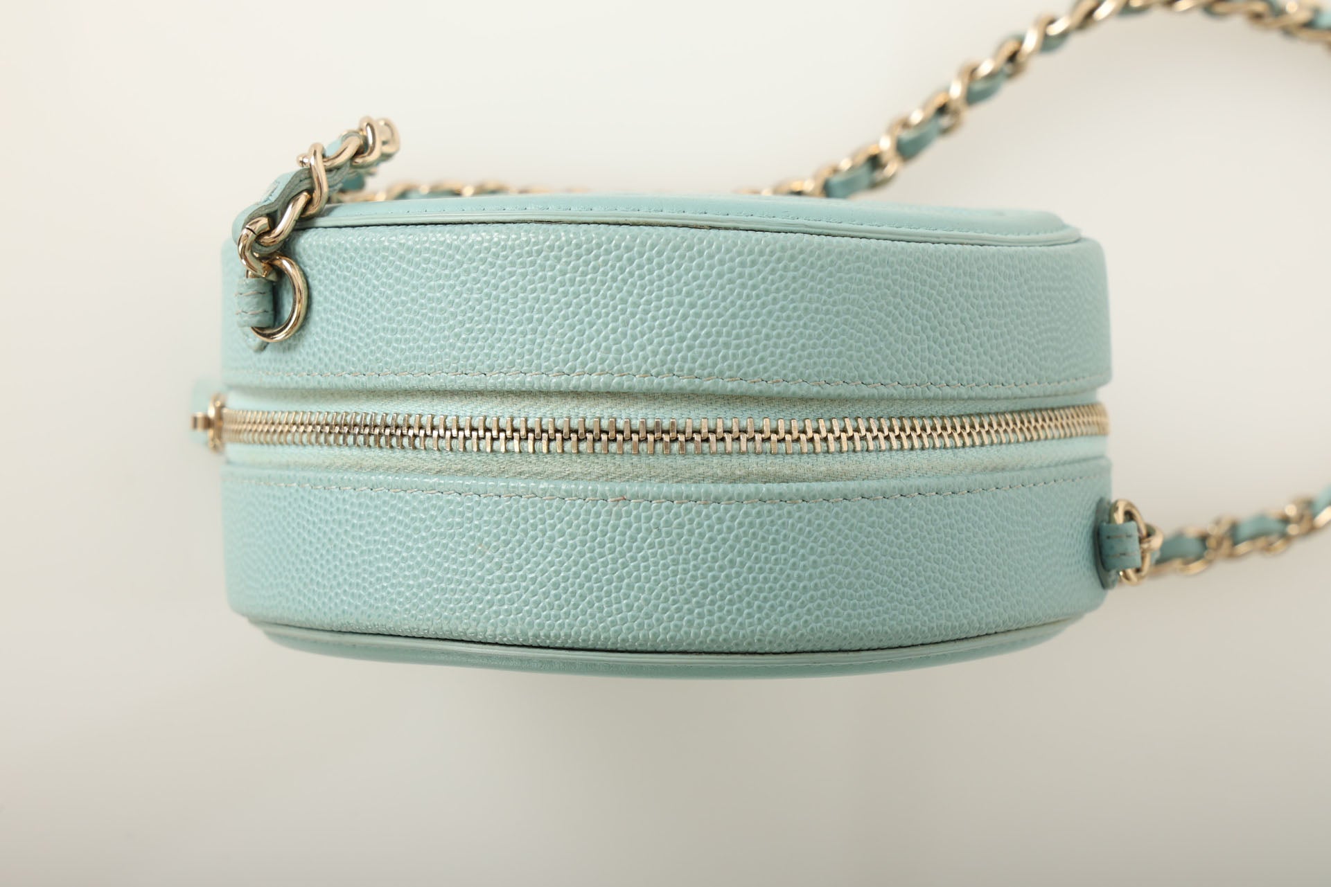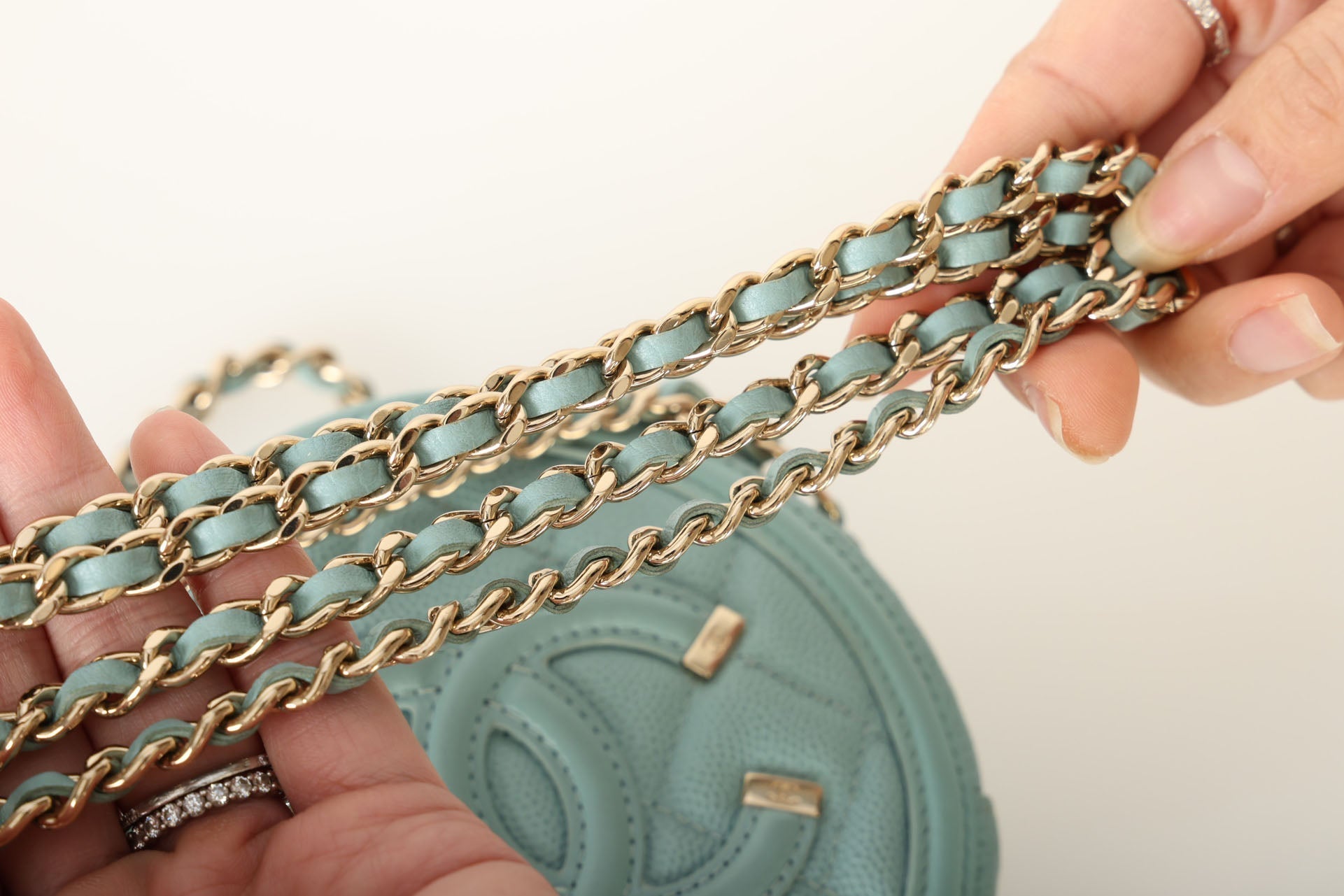 The cutest robin's egg Chanel caviar and champagne gold hardware crossbody - perfect for traveling or fun Spring/Summer events! The filigree CC makes such a beautiful statement, and will complement any outfit!