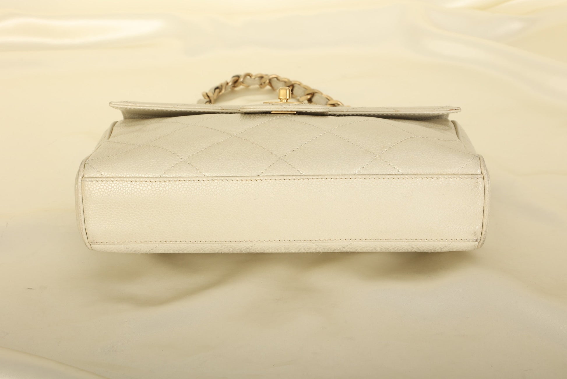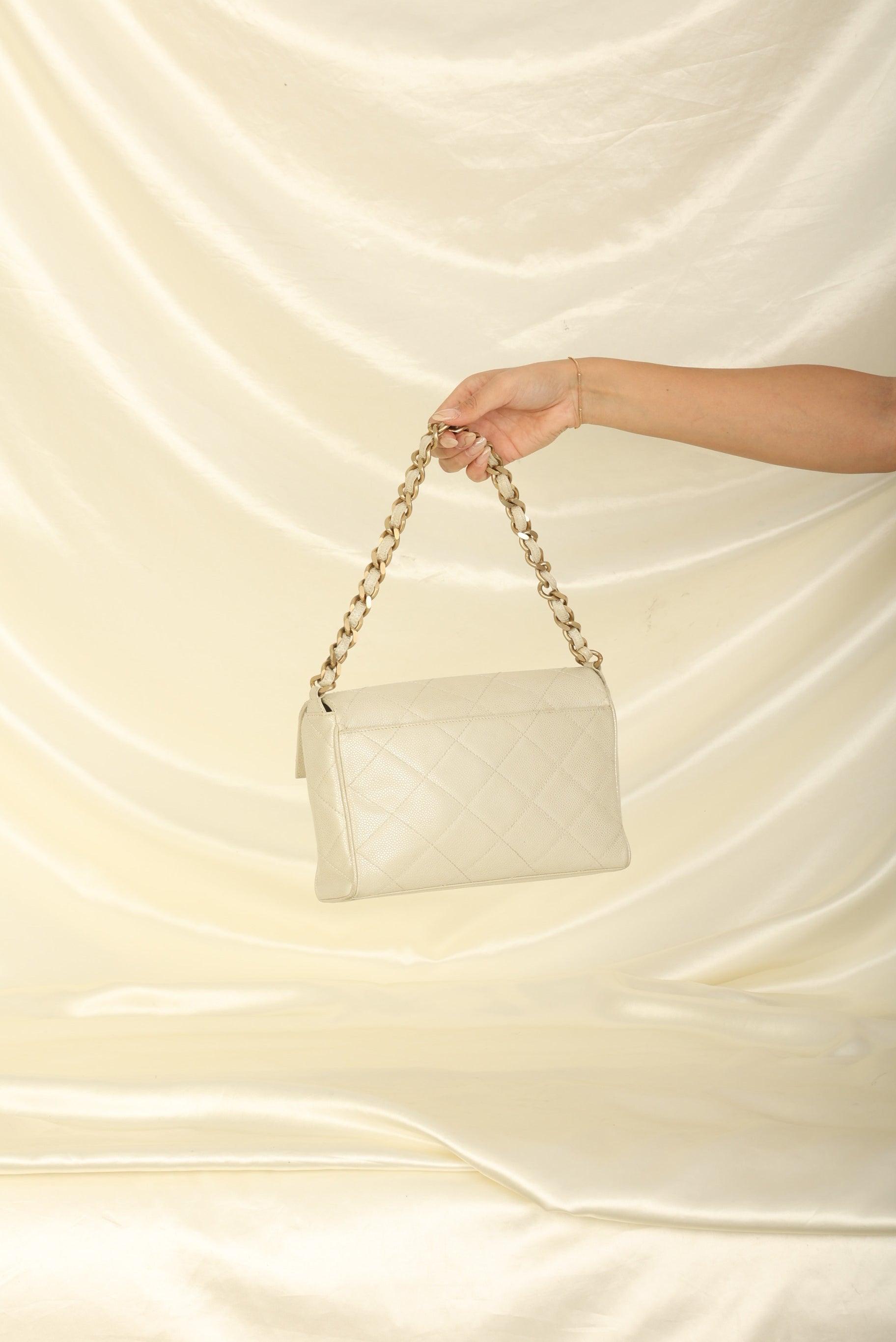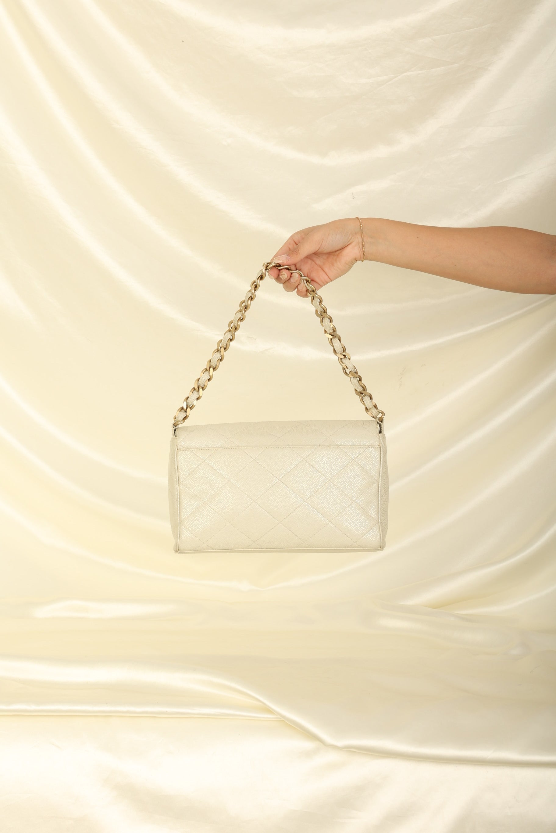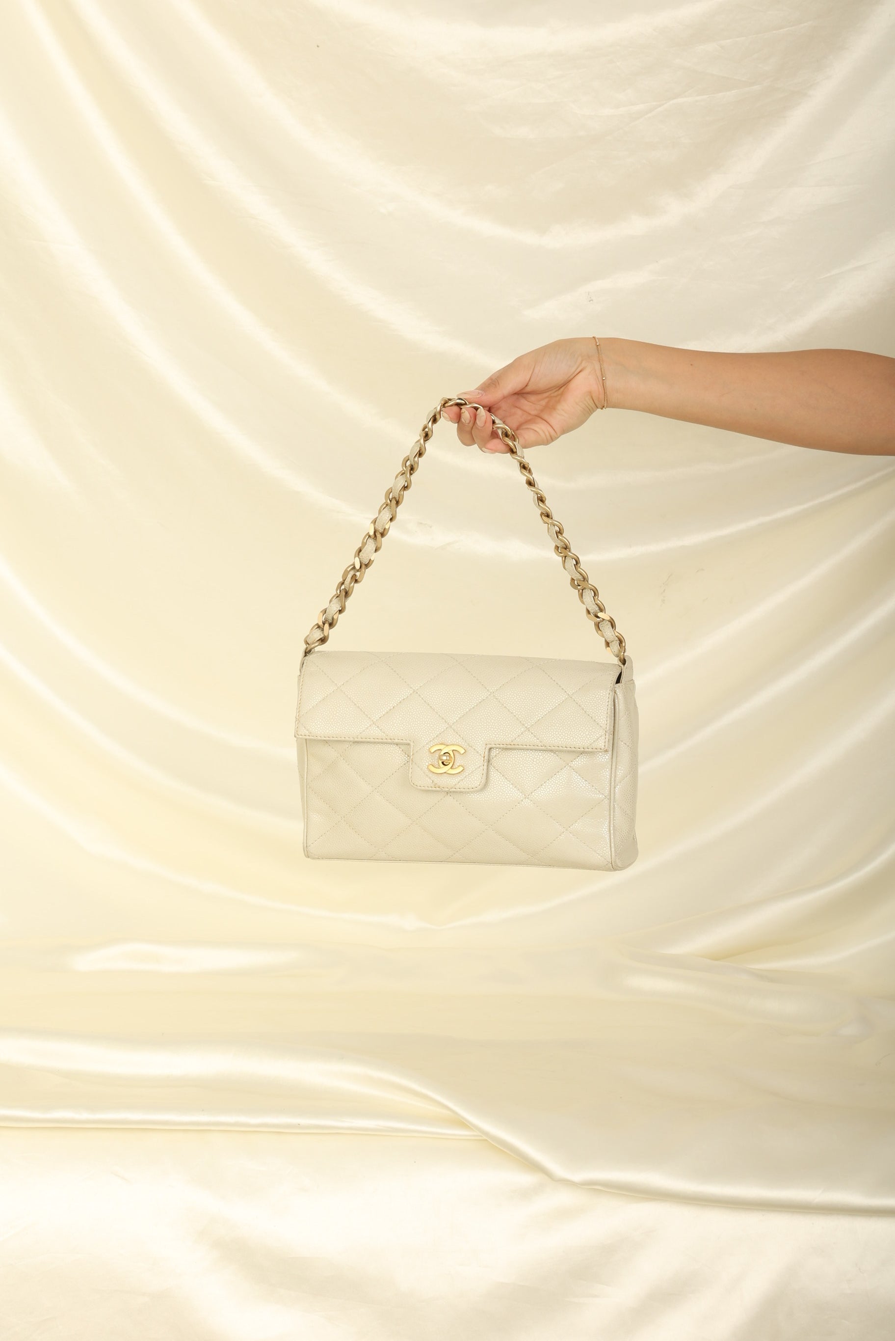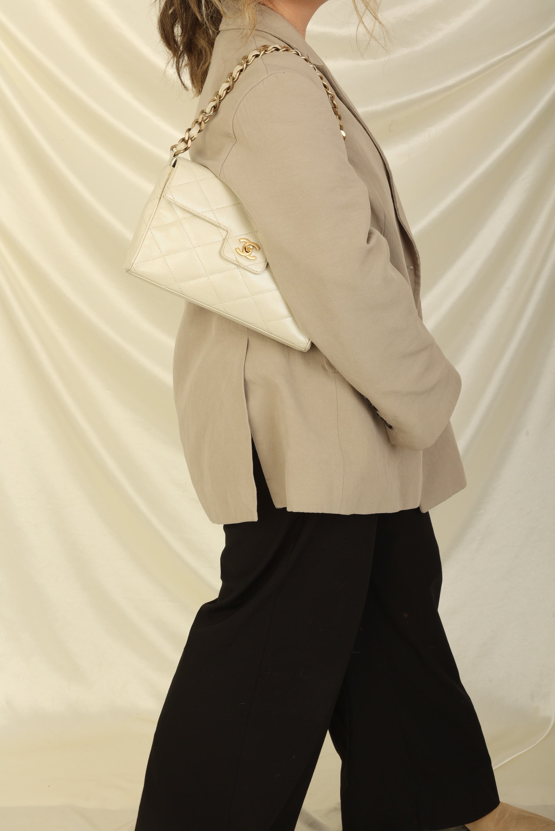 Dropping in the shop is this Chanel Caviar Shoulder Bag that has an incredible iridescent shine making this an eye-catching piece perfect to wear with any neutral outfit. The caviar material allows for extreme durability?and the gorgeous pearl color is complimented by?champagne gold hardware. You can fit your phone, wallet, sunglasses, keys, and lippie.?