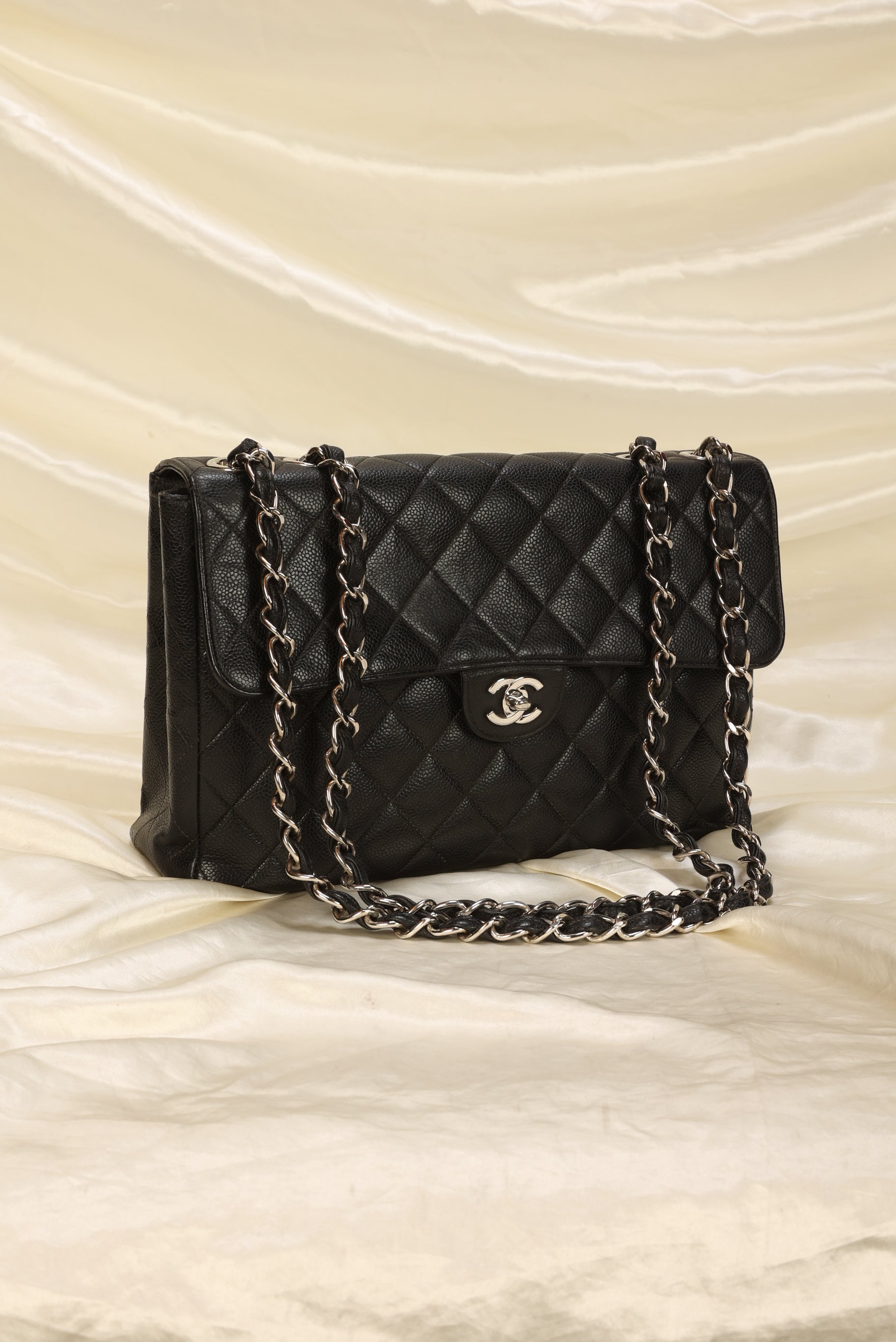 Big bags are back! A jumbo classic flap bag crafted in Caviar black leather with shiny silver hardware. An New investment piece that can be enjoyed for years to come.