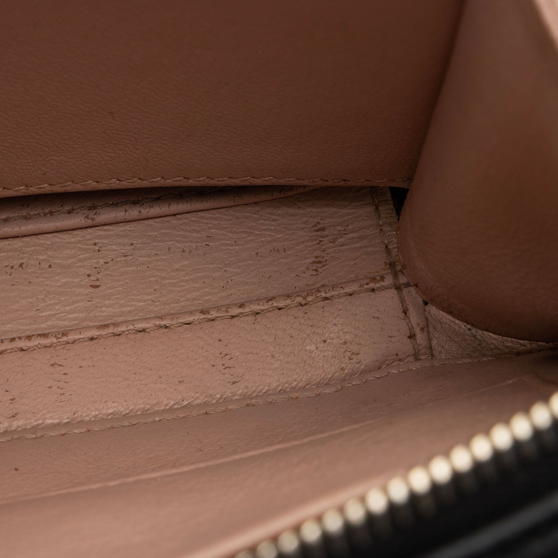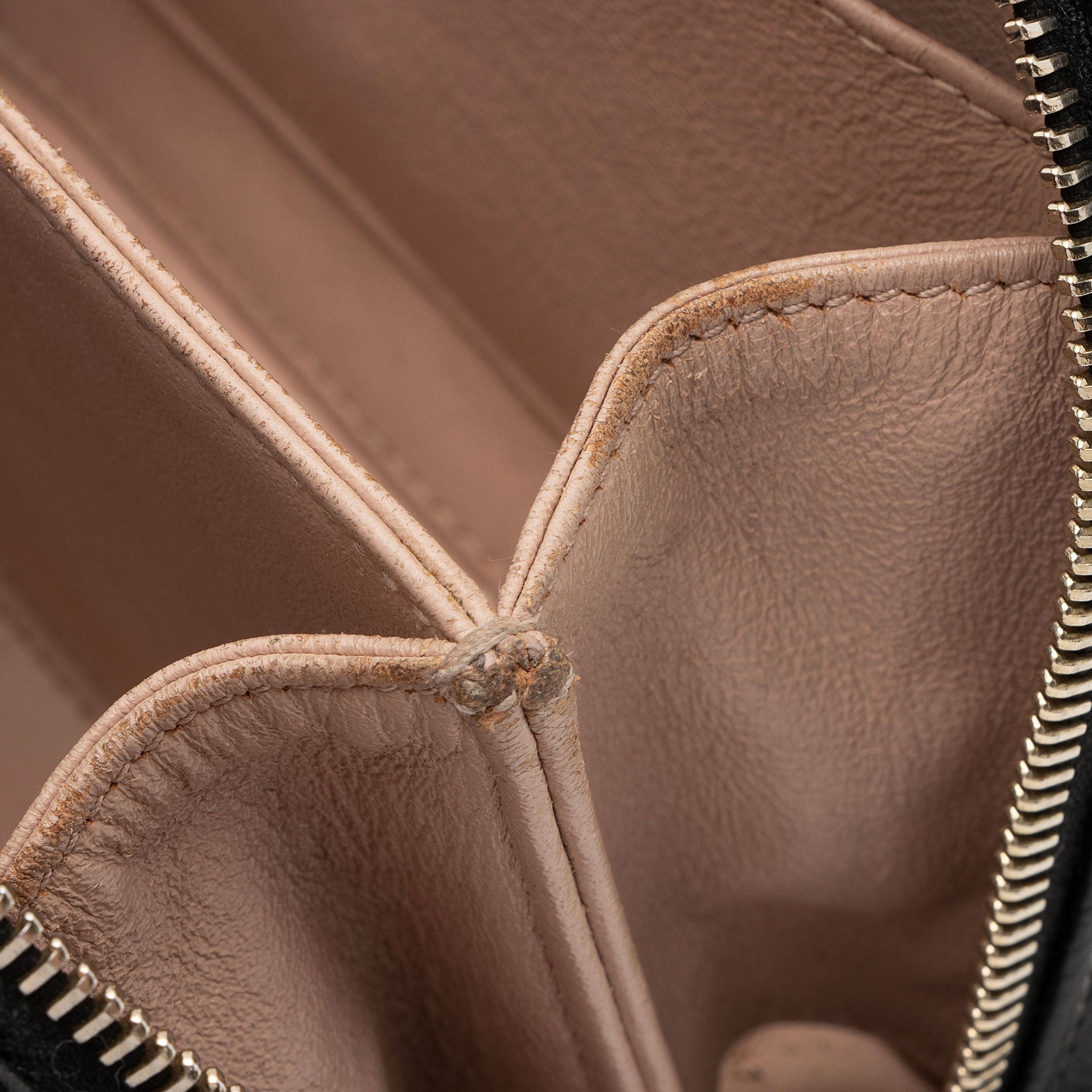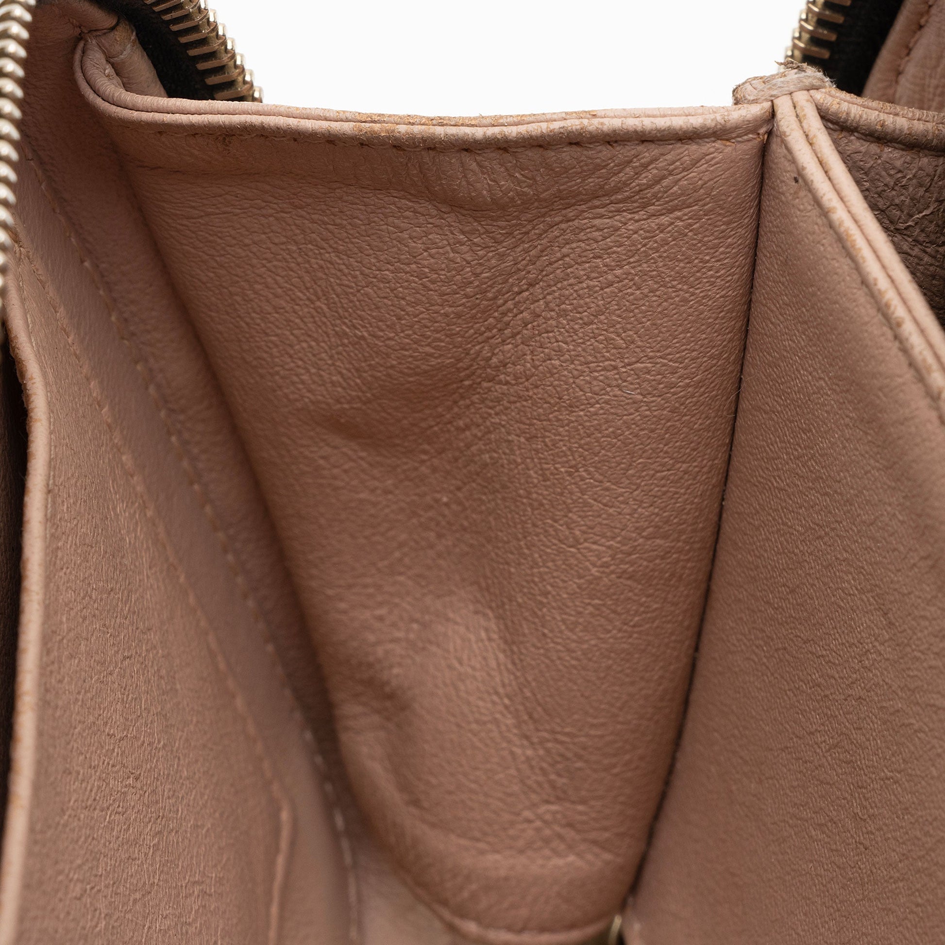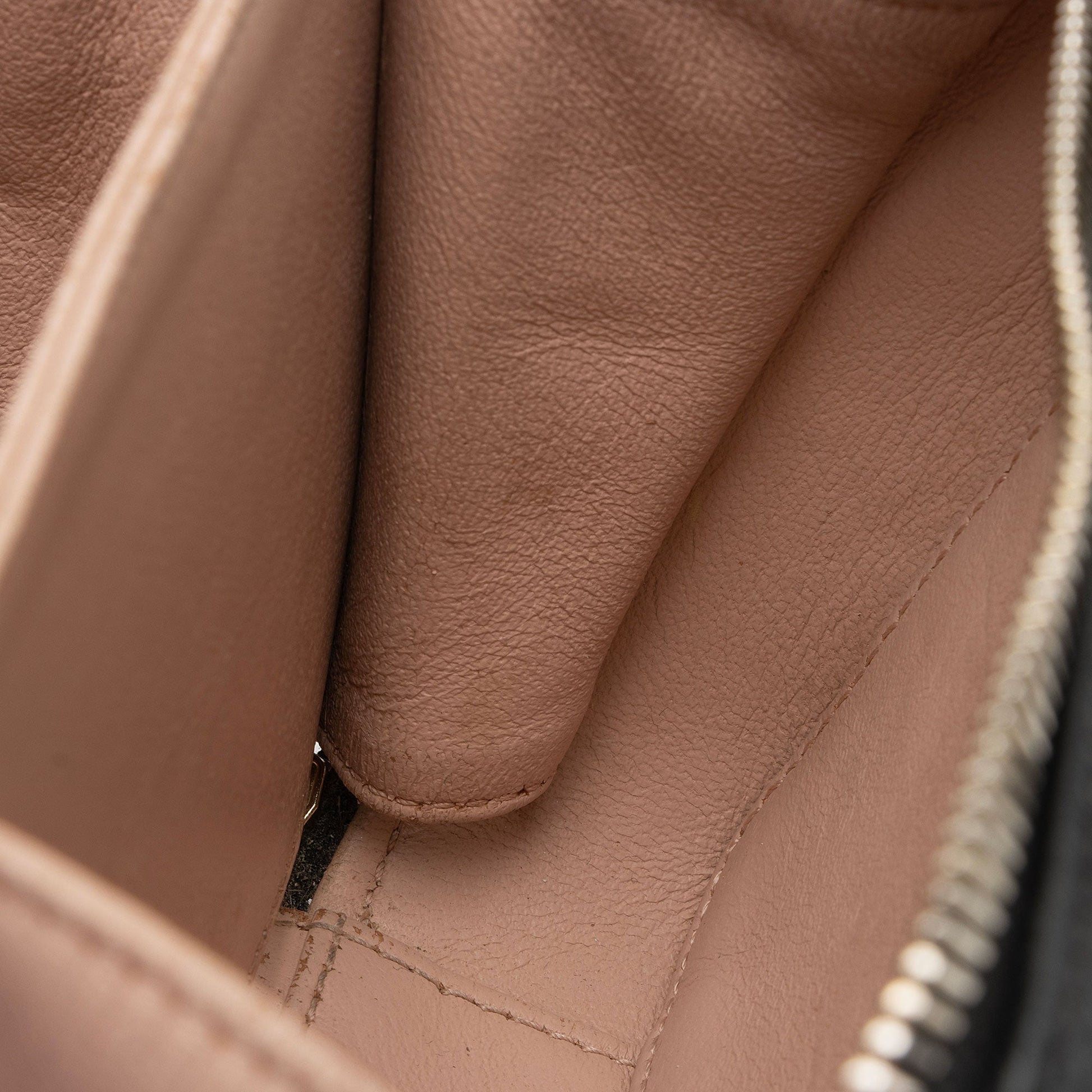 Condition Notes: Visible cracking and wear throughout clochettes. Scuffs to exterior corners. Visible scuffs and wear throughout handle. Moderate surface scratches and tarnishing to hardware. Moderate scuffs and light peeling throughout interior.