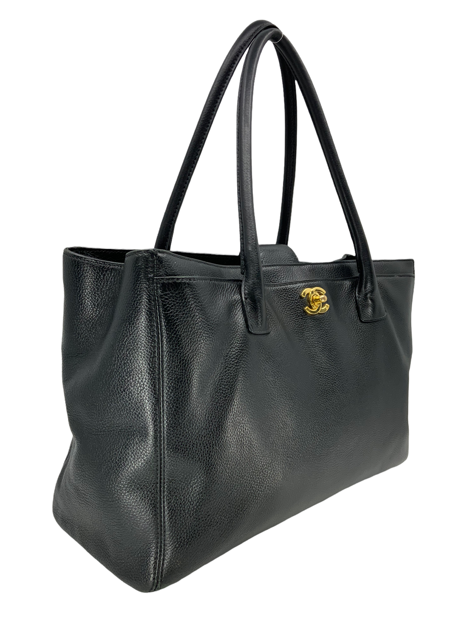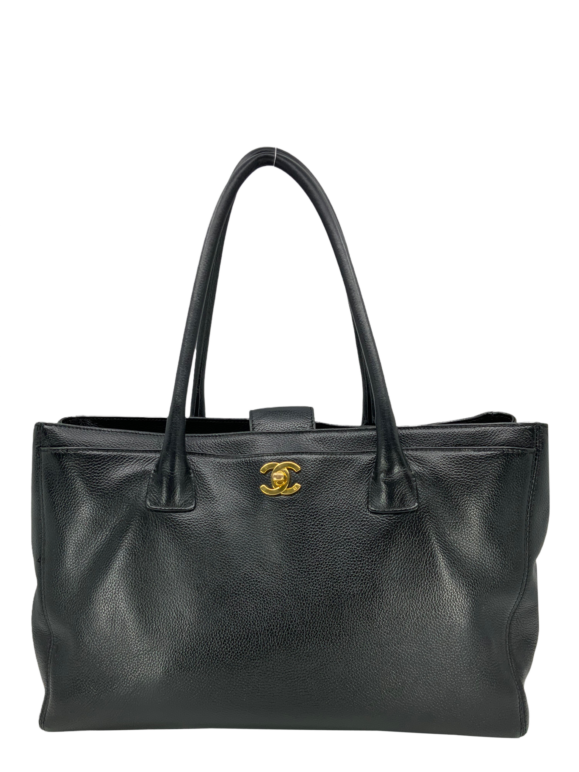 Add this Chanel Caviar Leather Cerf Executive Tote Bag to your collection today! This chic and sophisticated tote has a sleek design and is beautifully?crafted from?durable black caviar leather with rolled leather tote straps.?Featuring?a signature gold-tone 'CC' turn-lock, exterior front an rear compartments and a center dividing removable zip pouch.?Shop designer handbags by Chanel?at?.