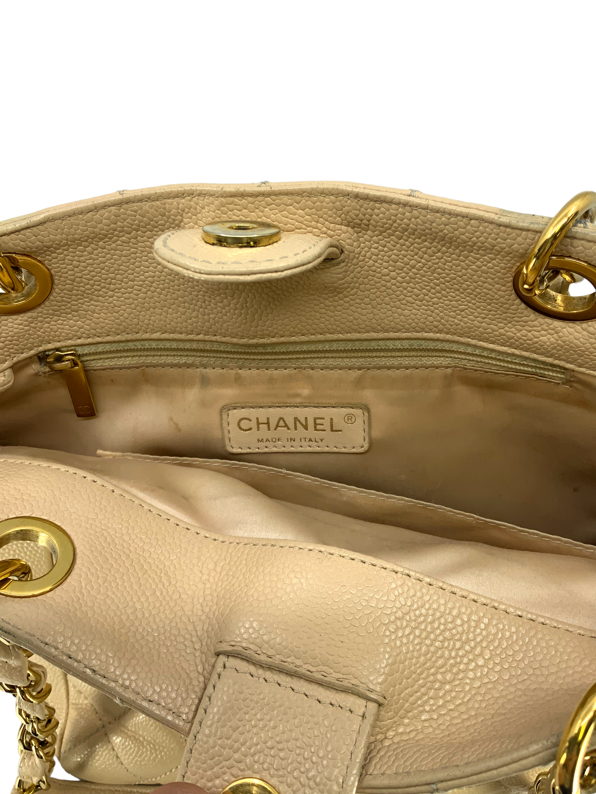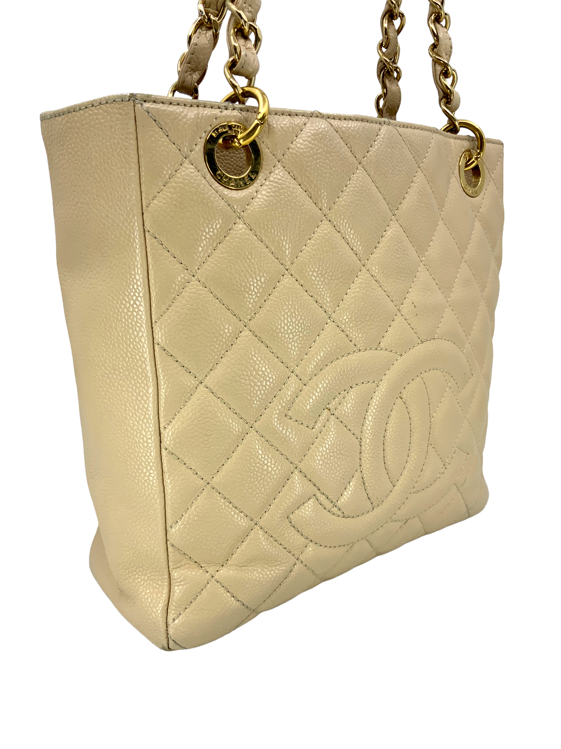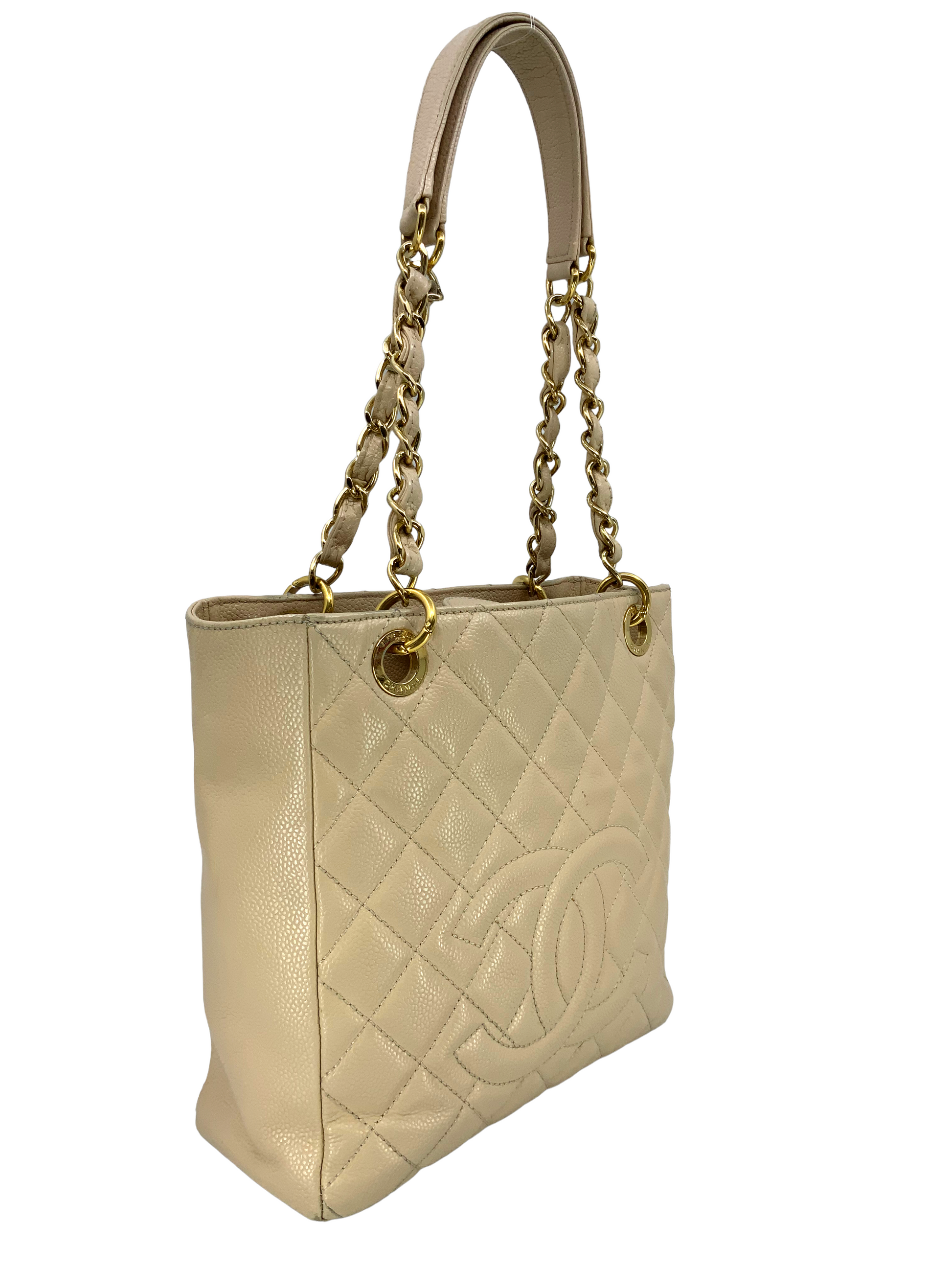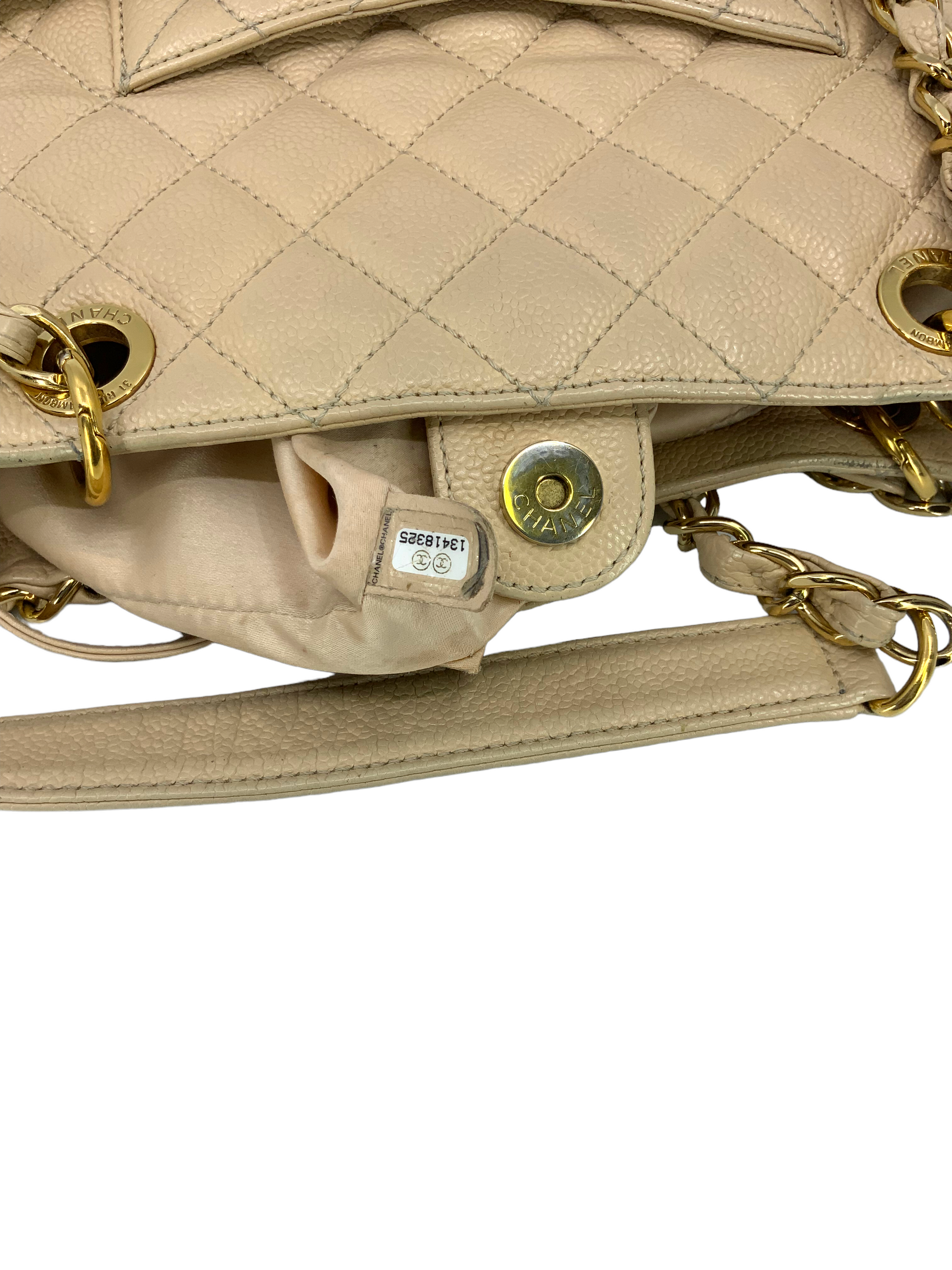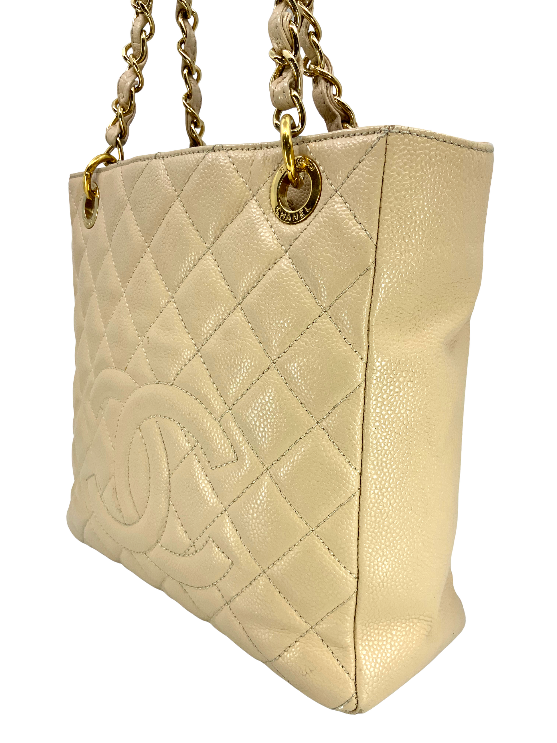 We the ity of this?CHANEL Caviar Leather Petite Shopping Tote PST crafted from beige quilted caviar?leather and gold-tone hardware. This versatile bag features a large embossed 'CC' logo at center, dual chain link shoulder straps threaded with tonal leather and?a secure magnetic snap?closure.?
