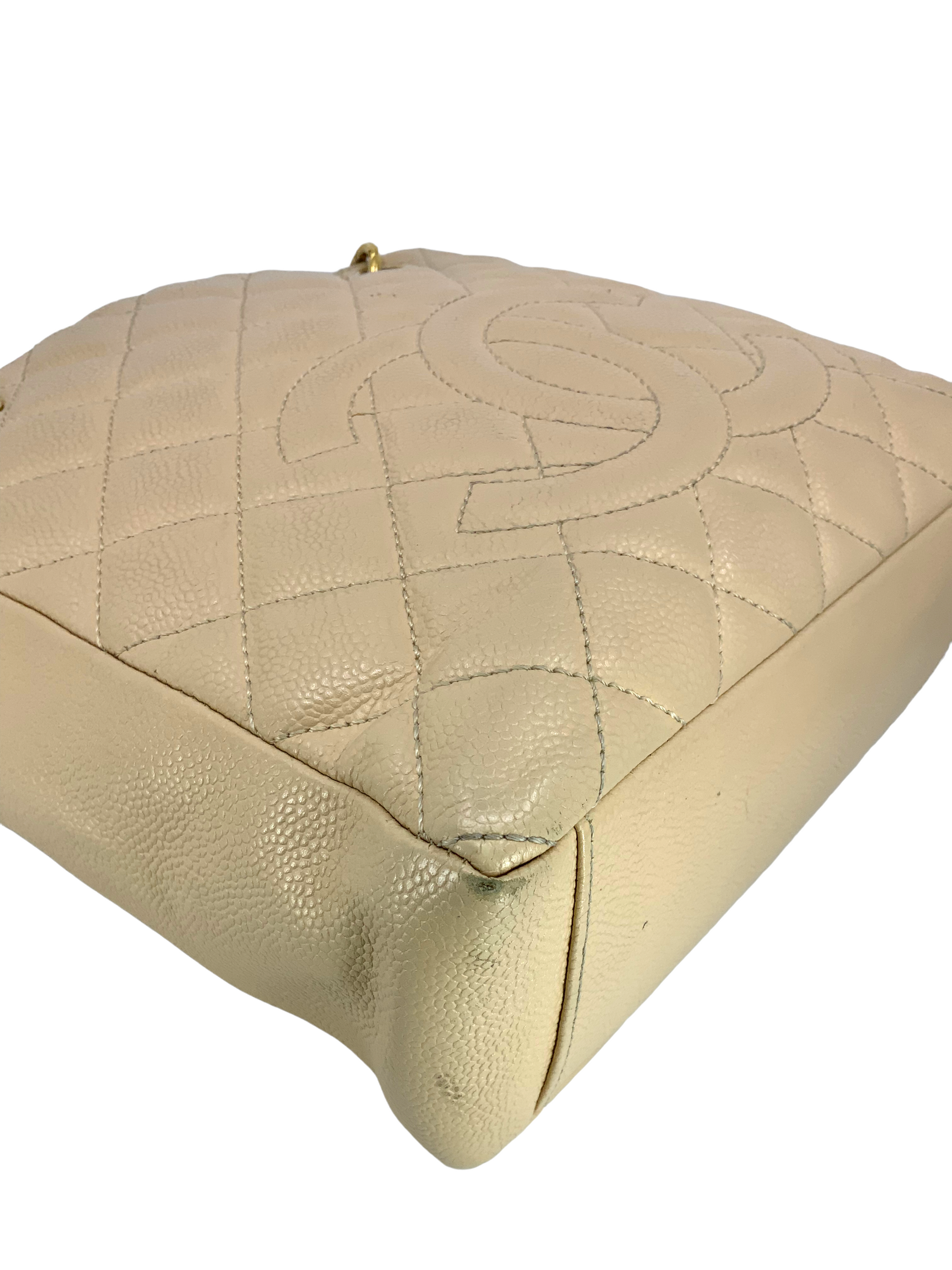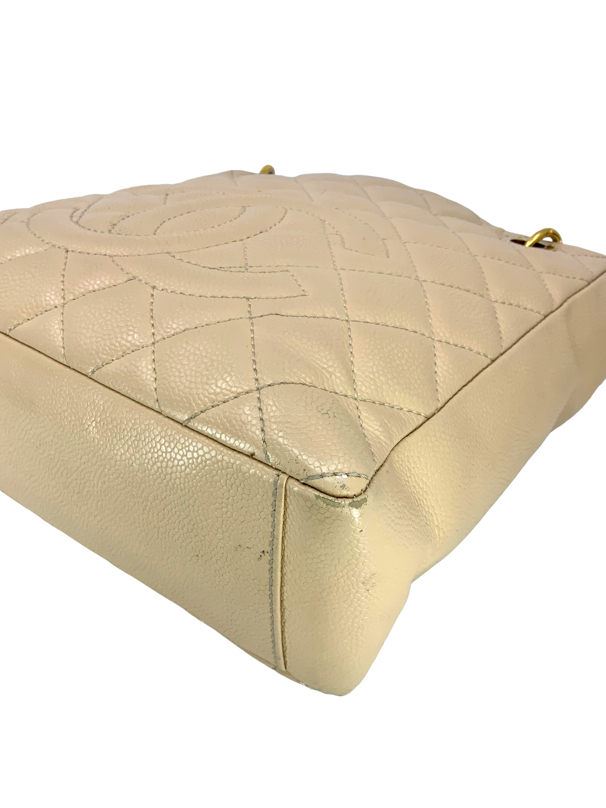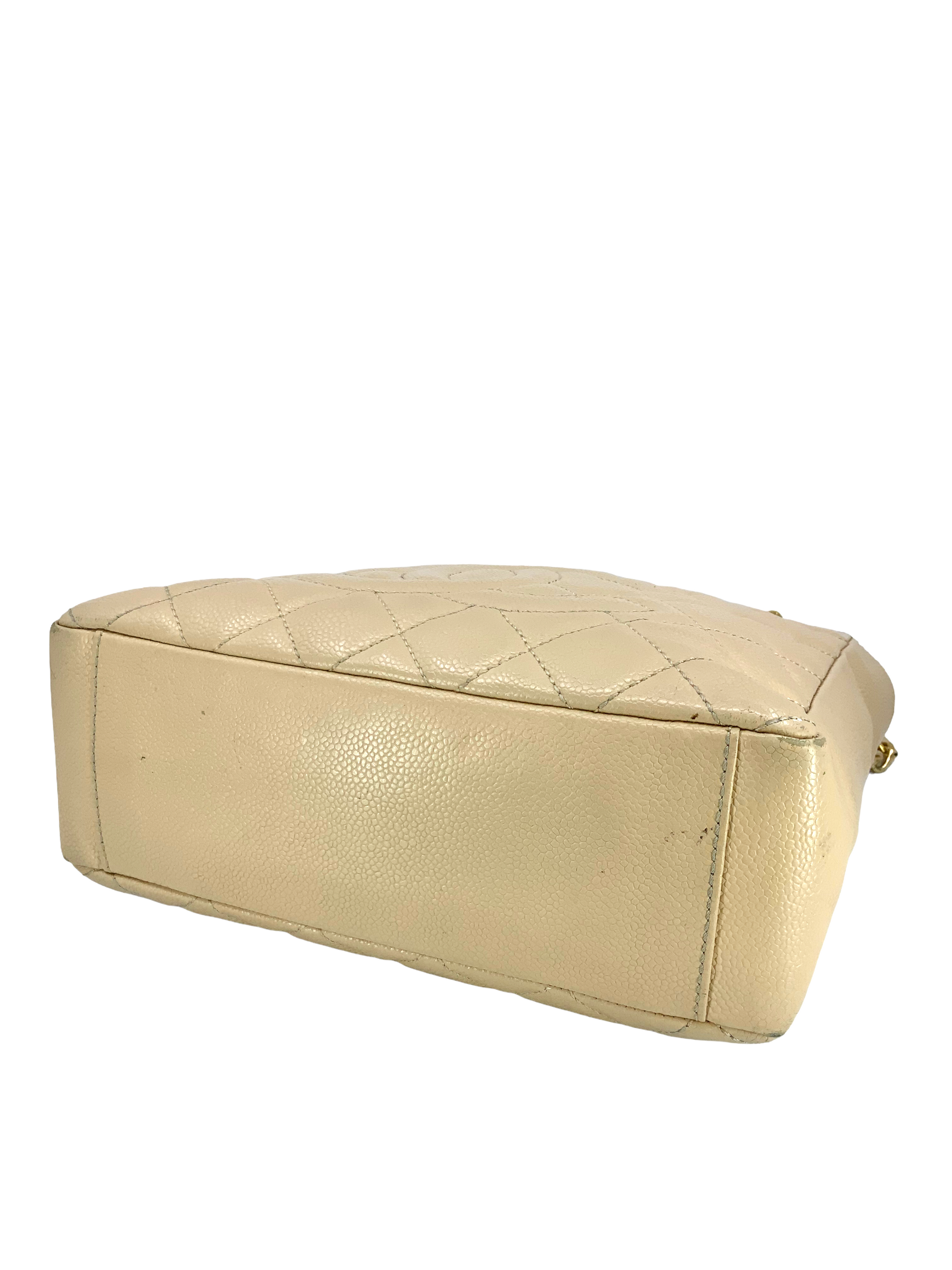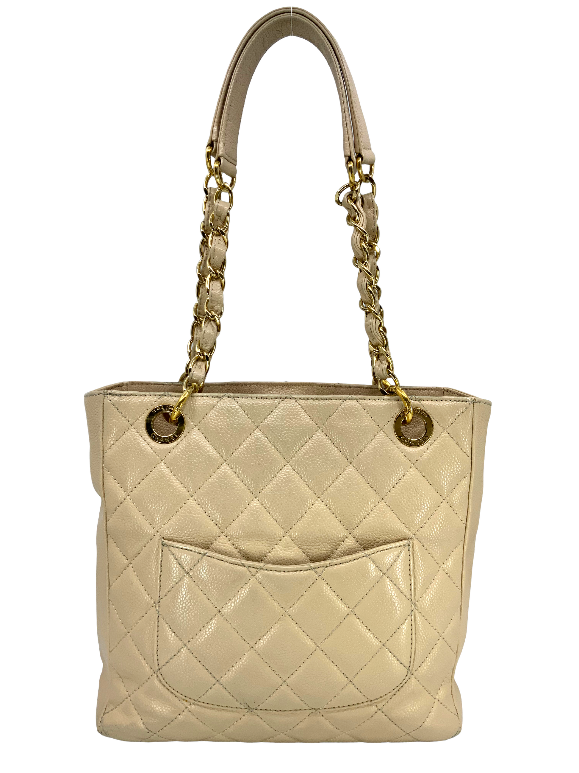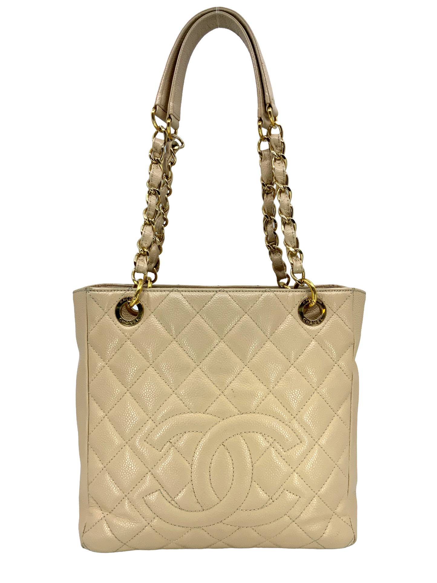 We the ity of this?CHANEL Caviar Leather Petite Shopping Tote PST crafted from beige quilted caviar?leather and gold-tone hardware. This versatile bag features a large embossed 'CC' logo at center, dual chain link shoulder straps threaded with tonal leather and?a secure magnetic snap?closure.?