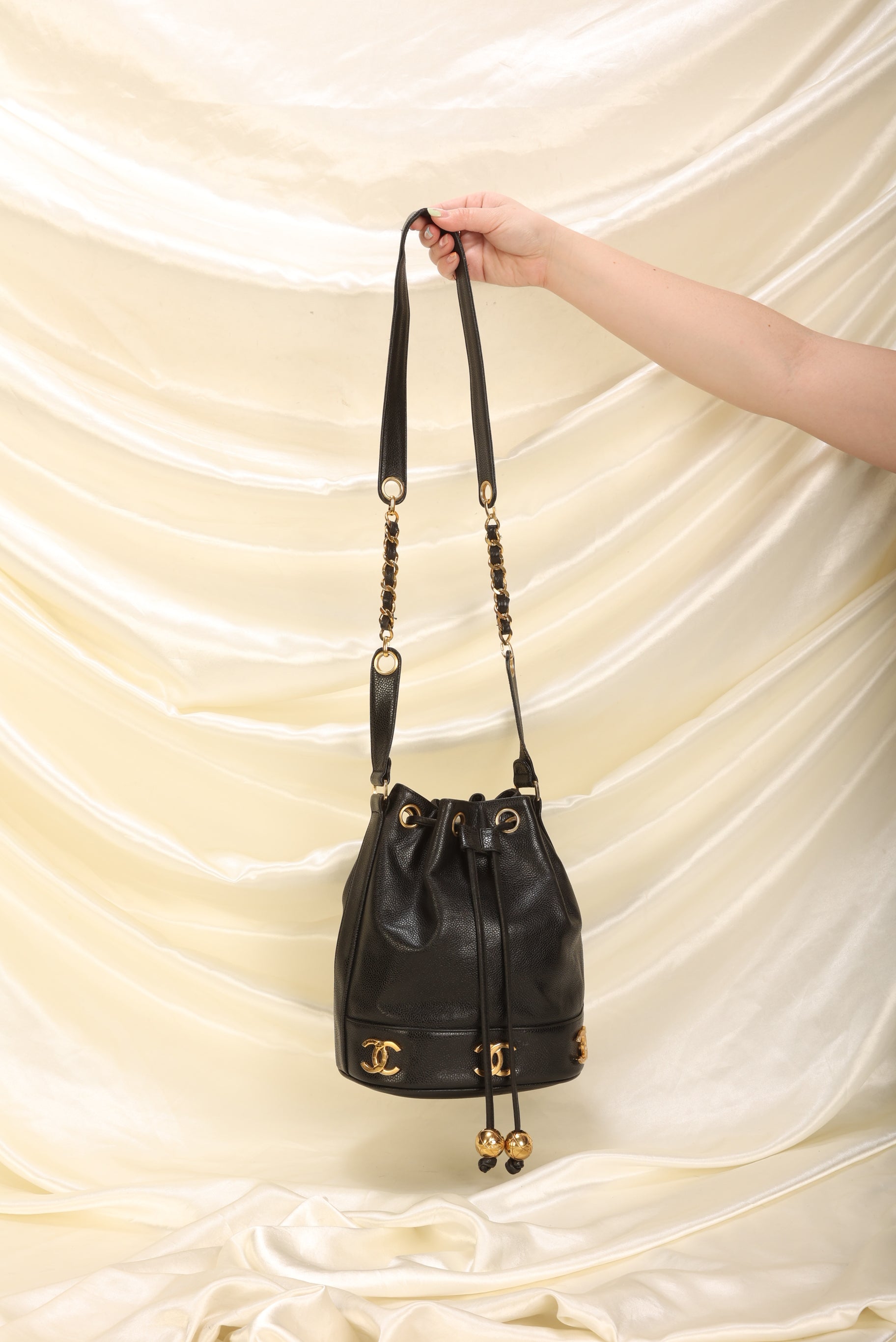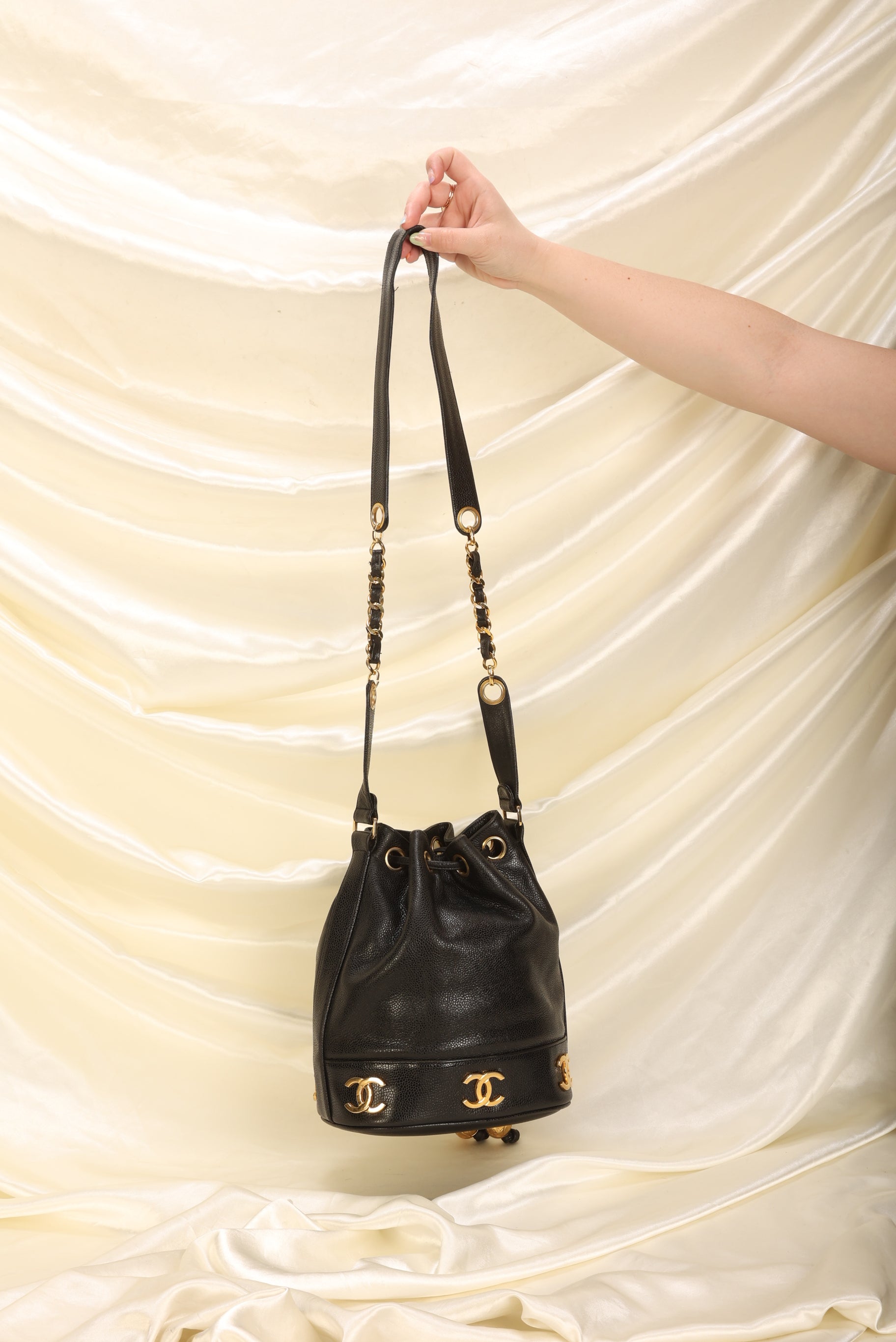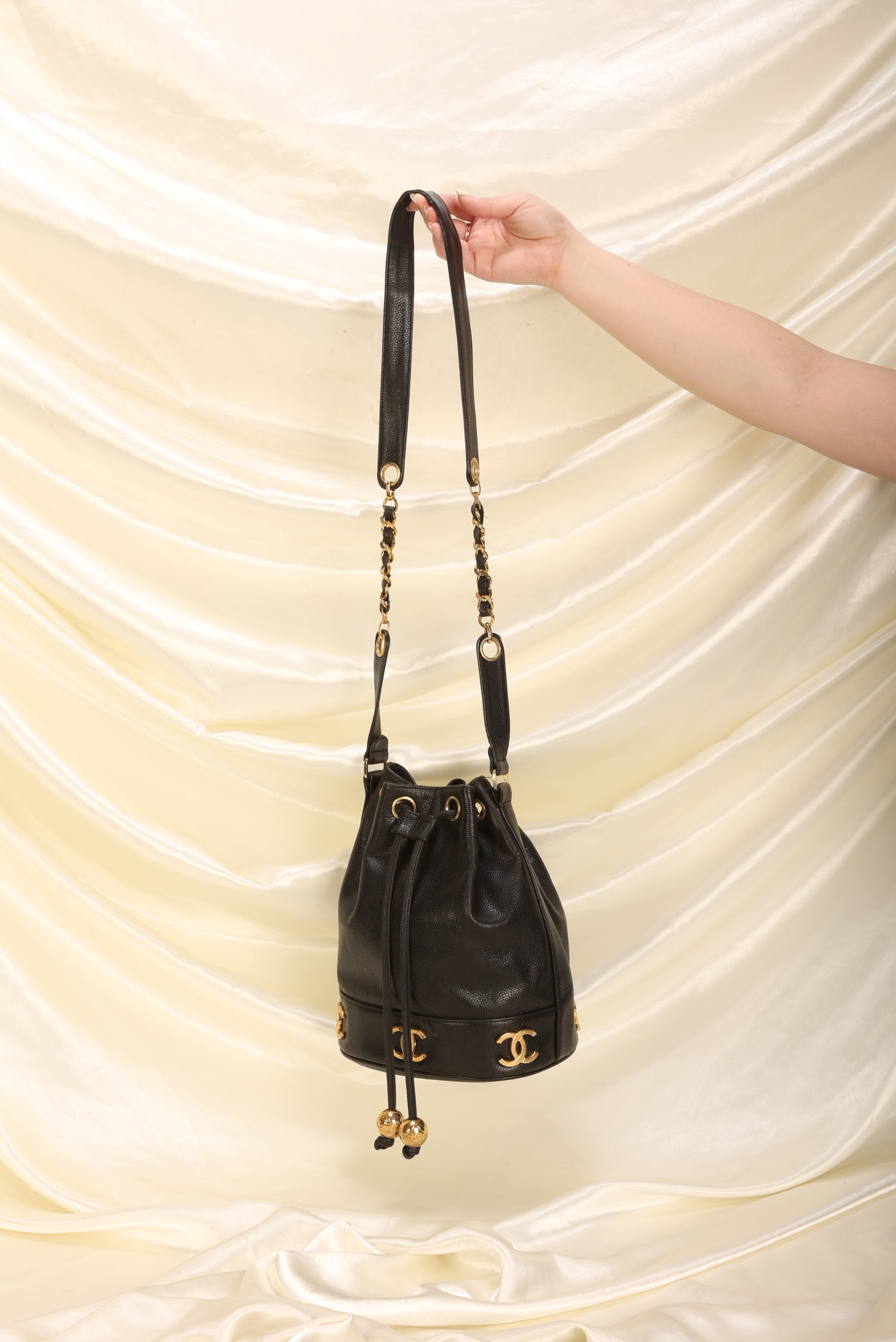 The classic caviar leather is perfectly complemented by the stunning 24k gold plated logos that adorn the bottom of the bucket, creating a look that's both timeless and modern. This bucket bag is spacious enough to carry all of your daily essentials, making it perfect for both work and play. The??Logo Bucket is enhanced by the high-end craftsmanship that goes into each piece. The 24K gold plated logos add a touch of sophistication and luxury that's sure to turn heads.