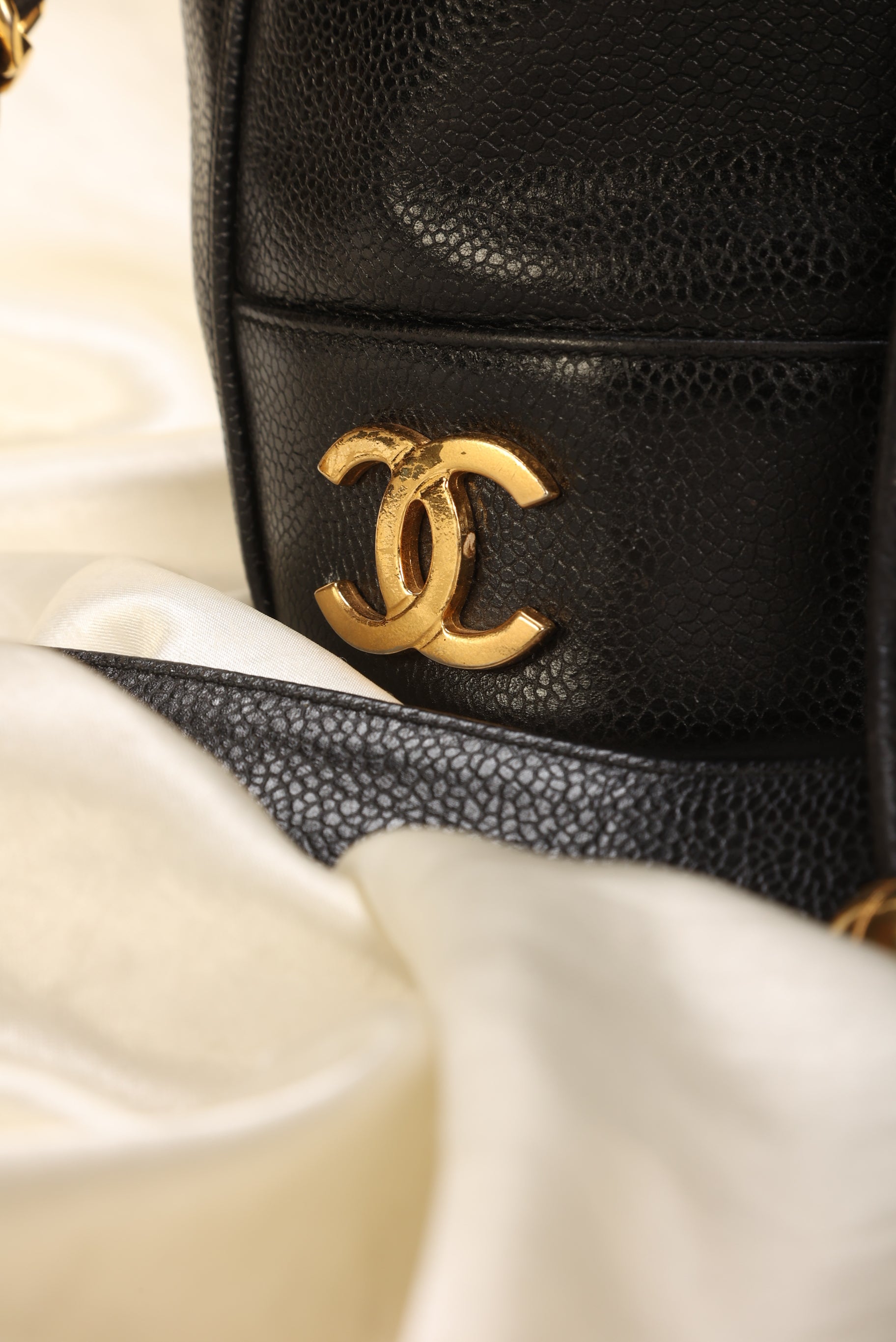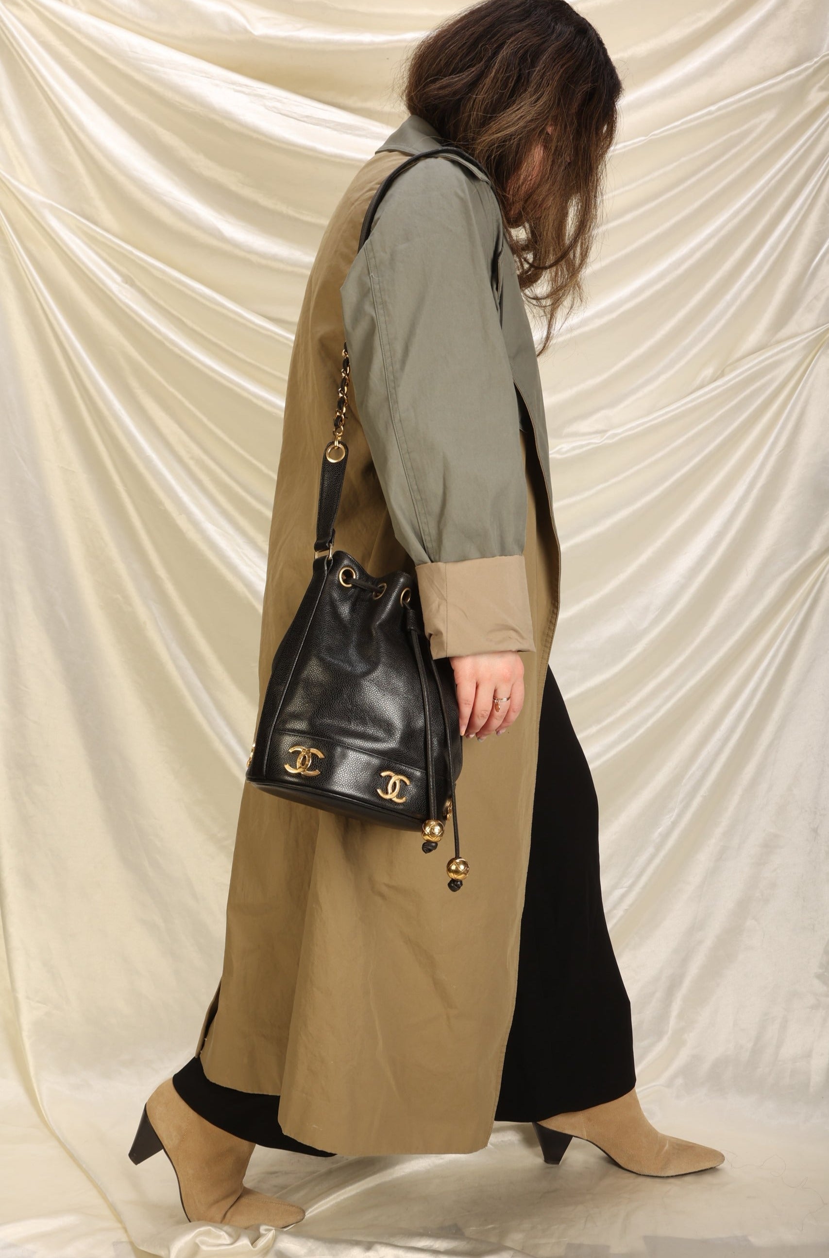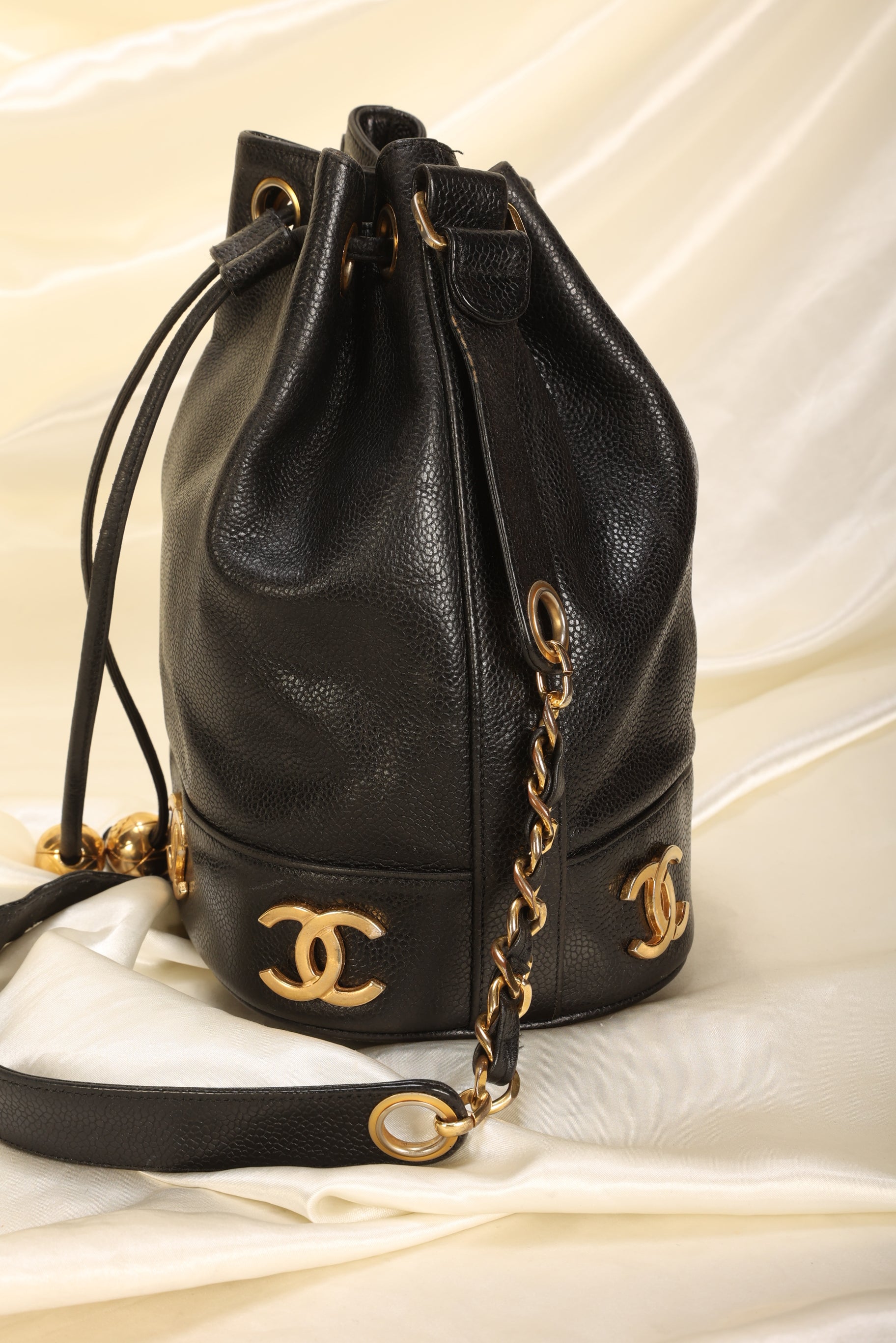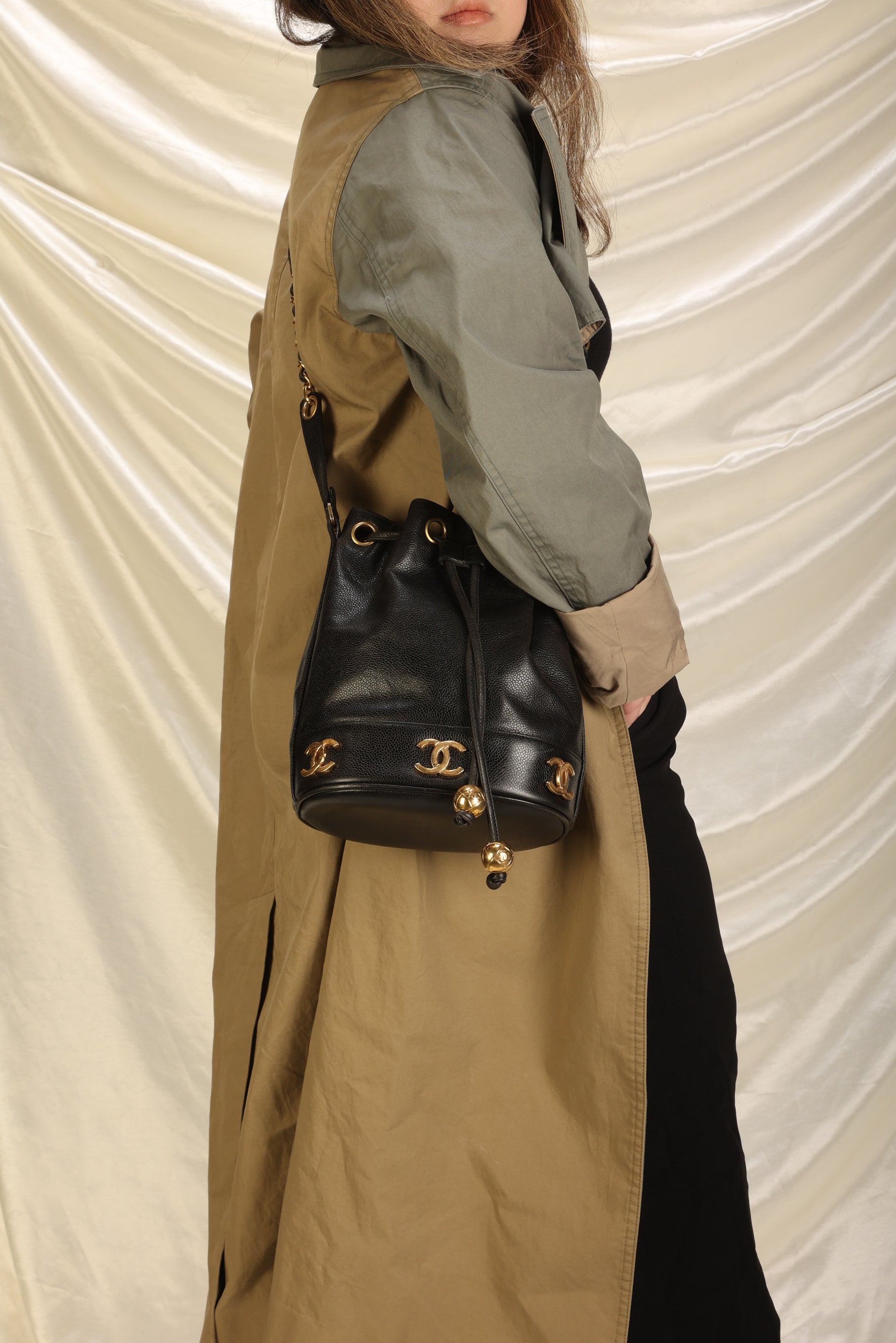 The classic caviar leather is perfectly complemented by the stunning 24k gold plated logos that adorn the bottom of the bucket, creating a look that's both timeless and modern. This bucket bag is spacious enough to carry all of your daily essentials, making it perfect for both work and play. The??Logo Bucket is enhanced by the high-end craftsmanship that goes into each piece. The 24K gold plated logos add a touch of sophistication and luxury that's sure to turn heads.