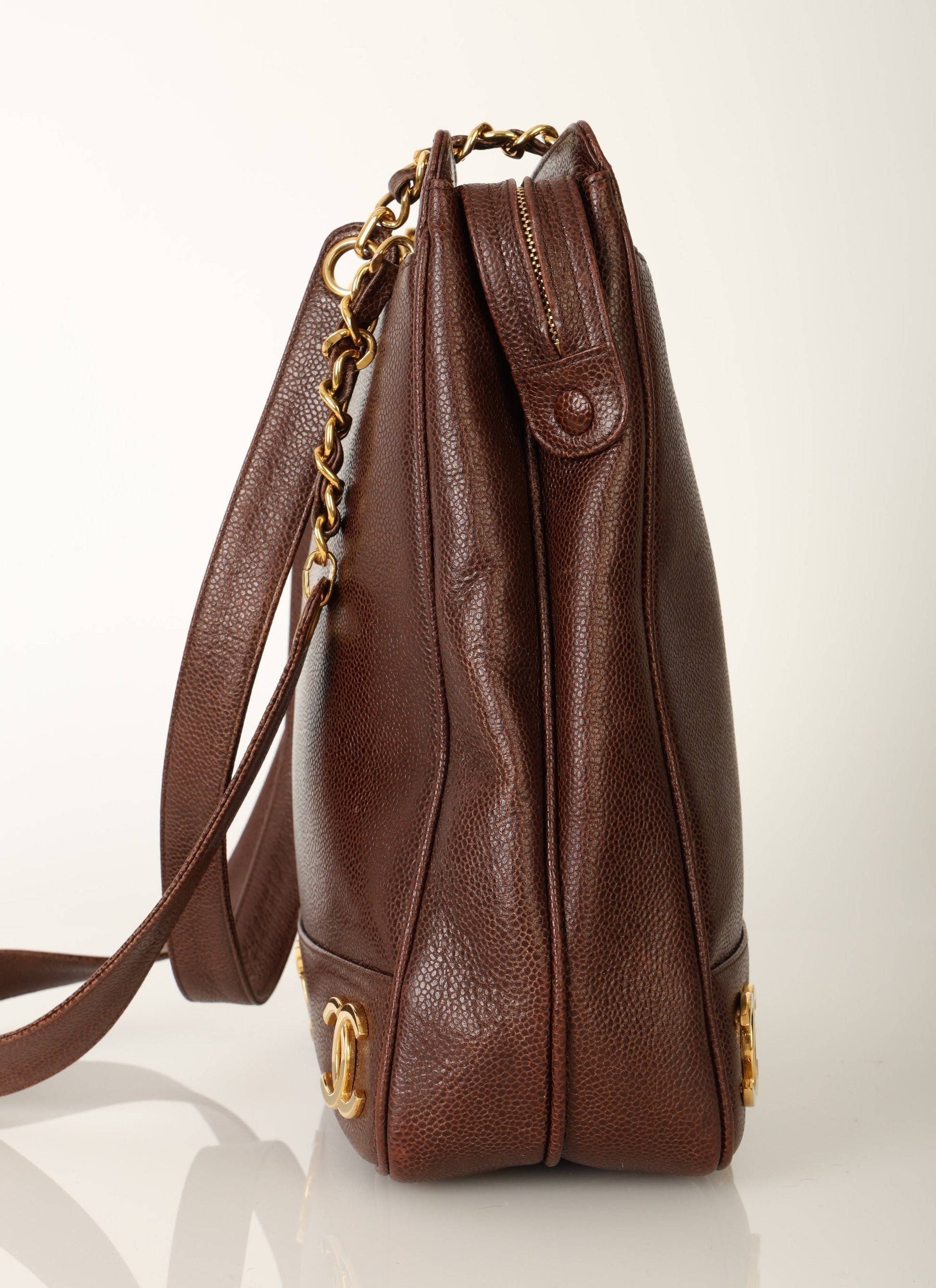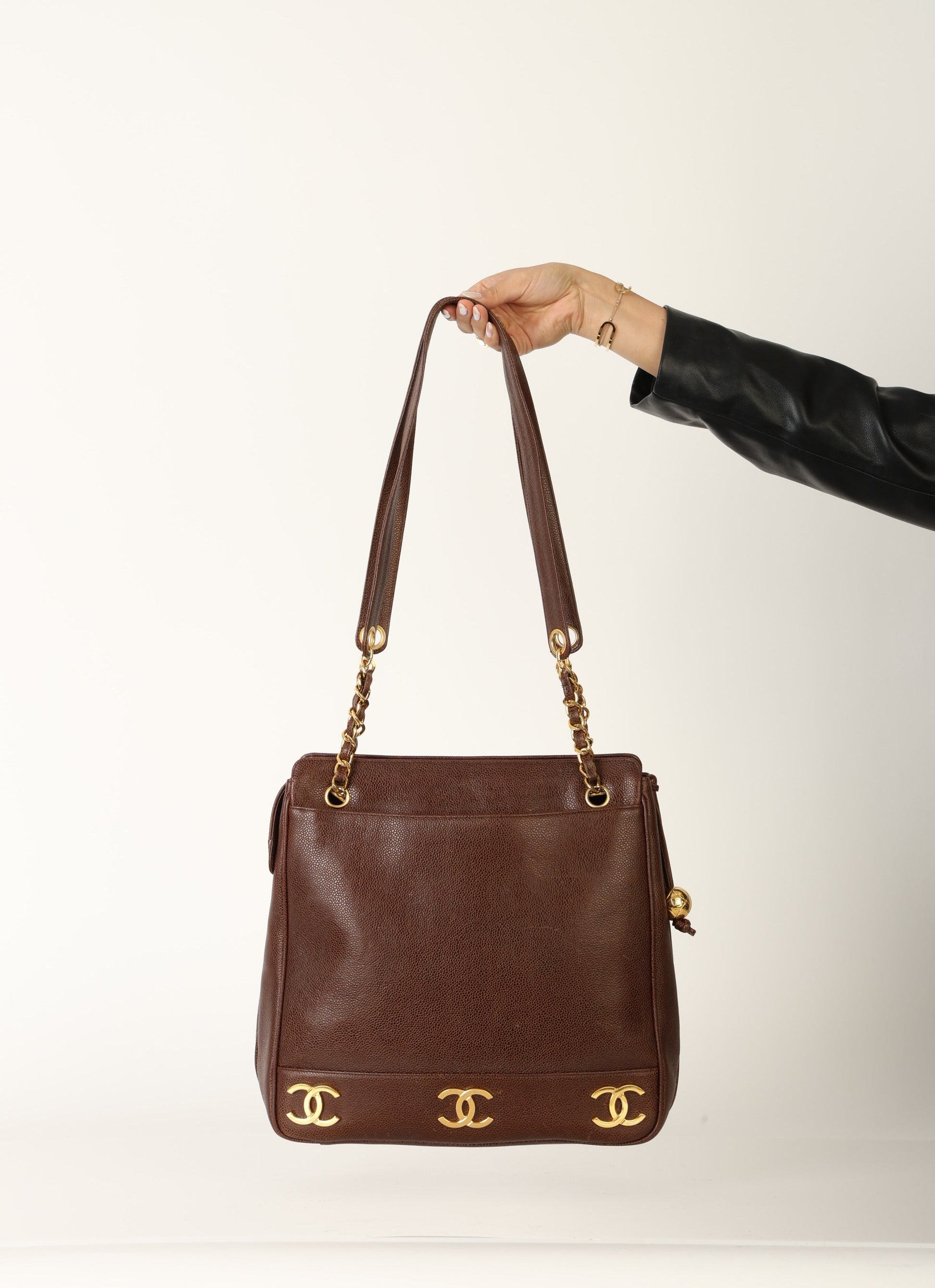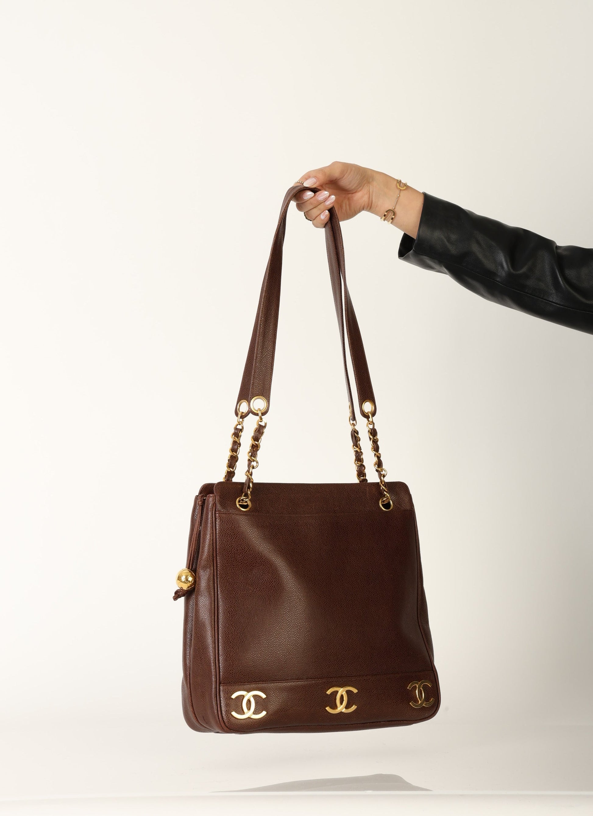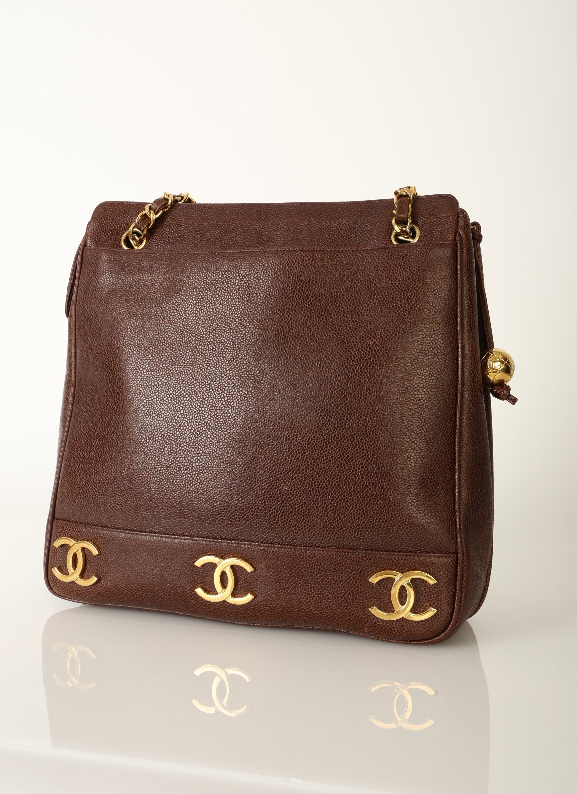 Dropping in the shop?is a stunning Chanel?Caviar Logo Tote in chocolate brown with gold hardware. The beautiful gold chain hardware and 6 Chanel logos all along the bottom with a Chanel ball charm as a zipper pull tie this piece together beautifully. New size allows this piece to be a great outing bag and fits your iPad, or a 13" laptop (vertically). A classic piece to enjoy for years!