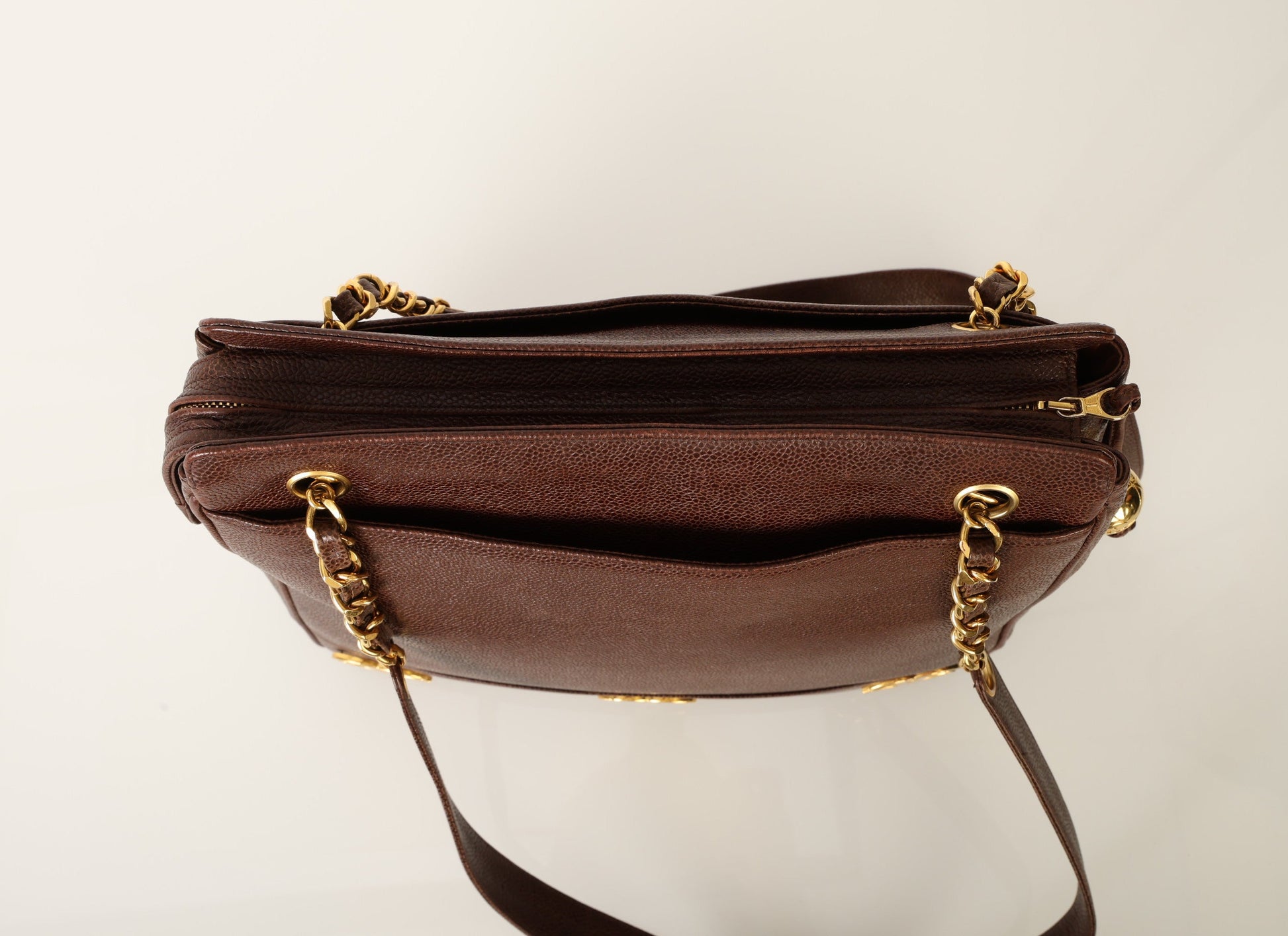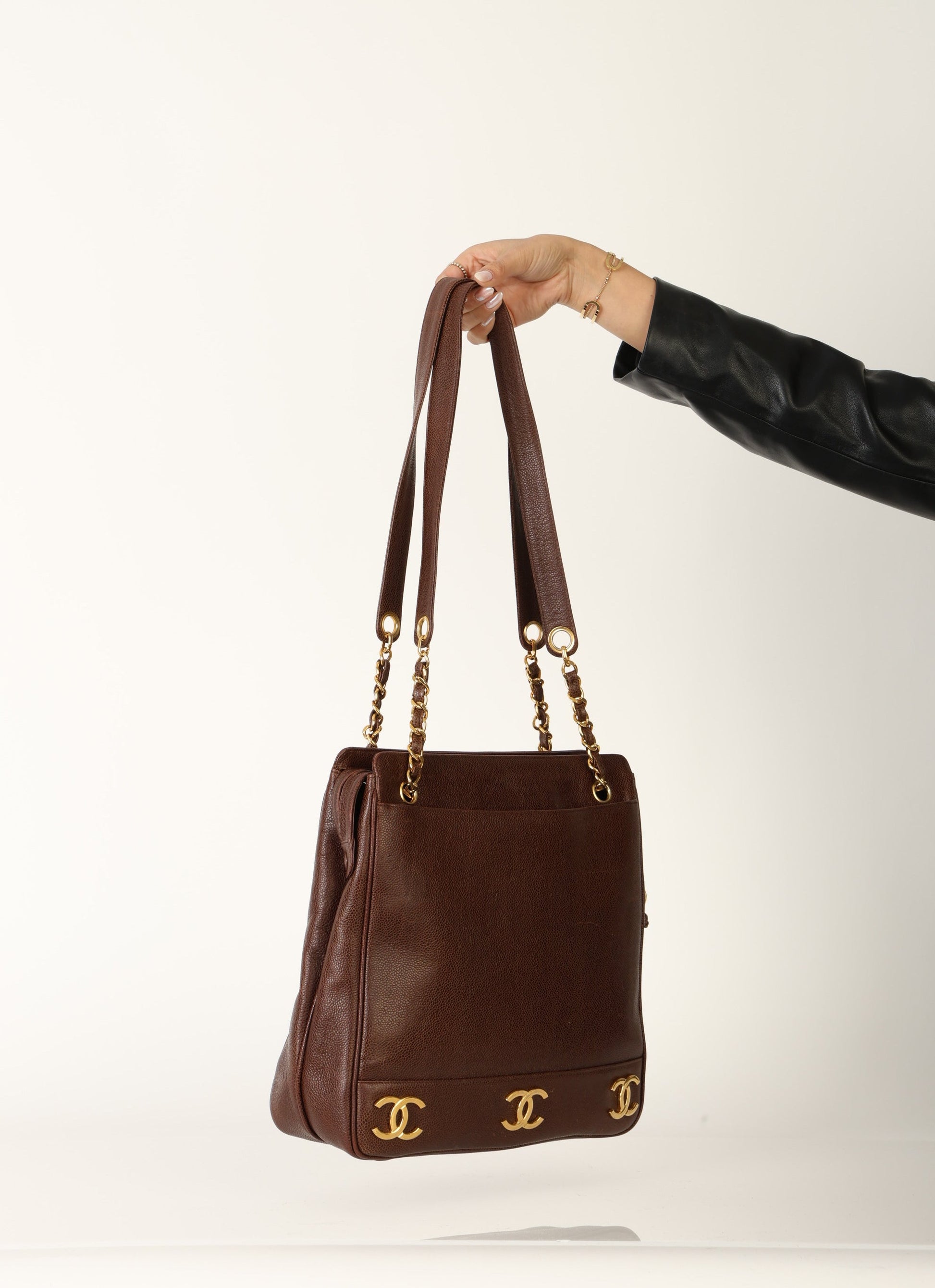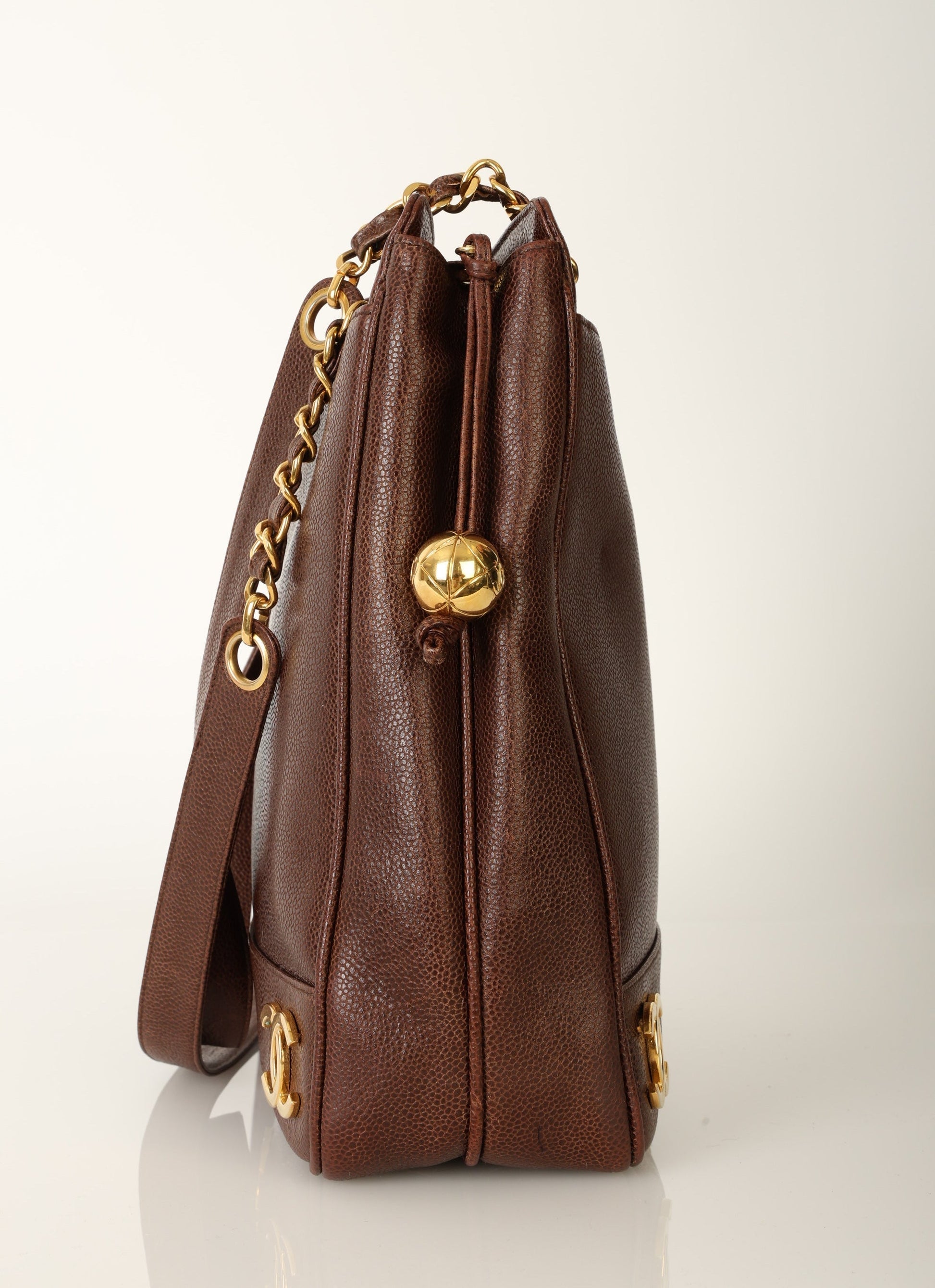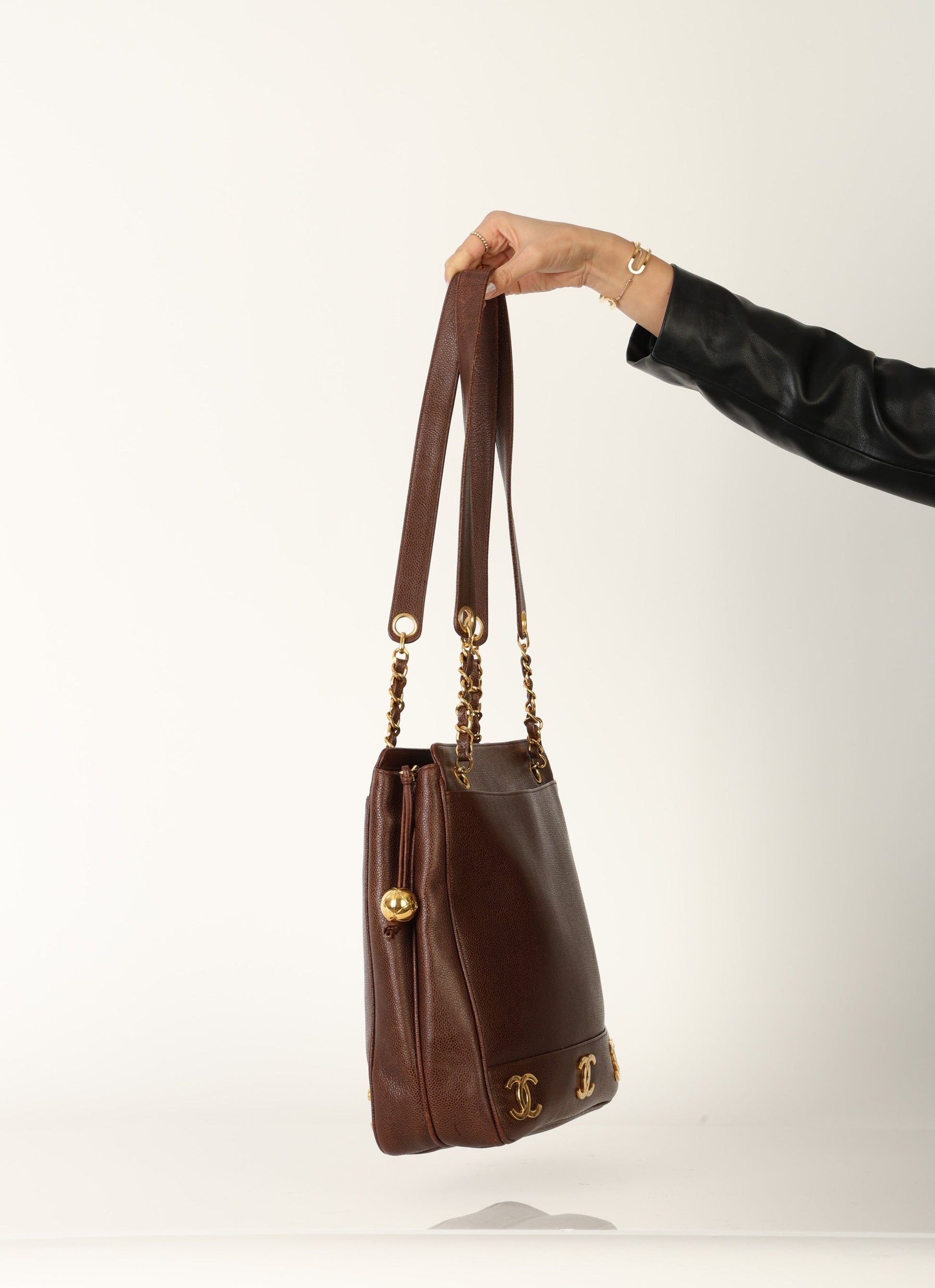 Dropping in the shop?is a stunning Chanel?Caviar Logo Tote in chocolate brown with gold hardware. The beautiful gold chain hardware and 6 Chanel logos all along the bottom with a Chanel ball charm as a zipper pull tie this piece together beautifully. New size allows this piece to be a great outing bag and fits your iPad, or a 13" laptop (vertically). A classic piece to enjoy for years!