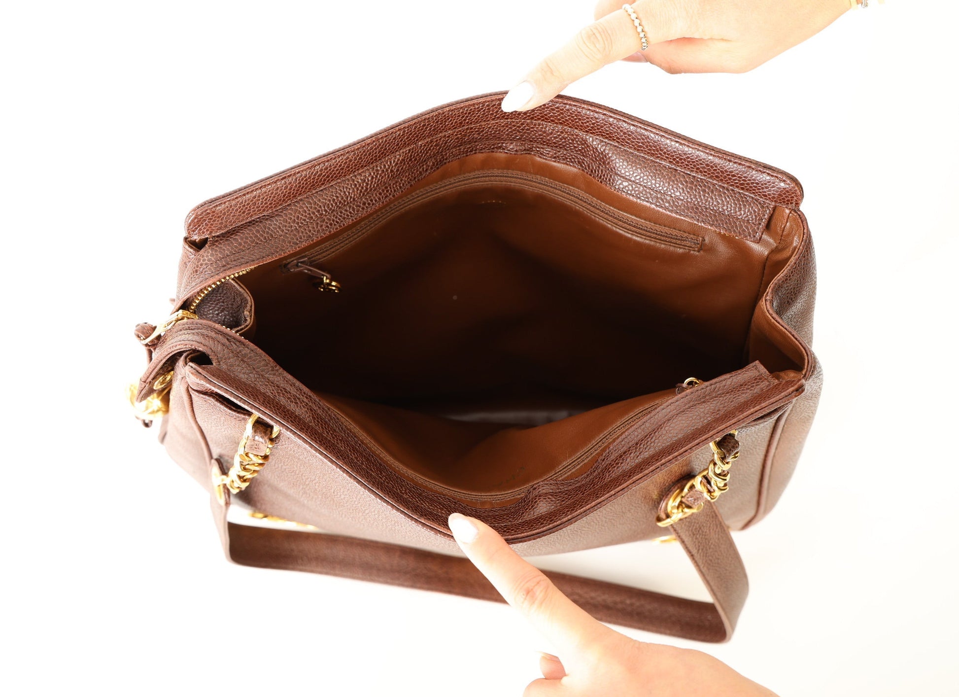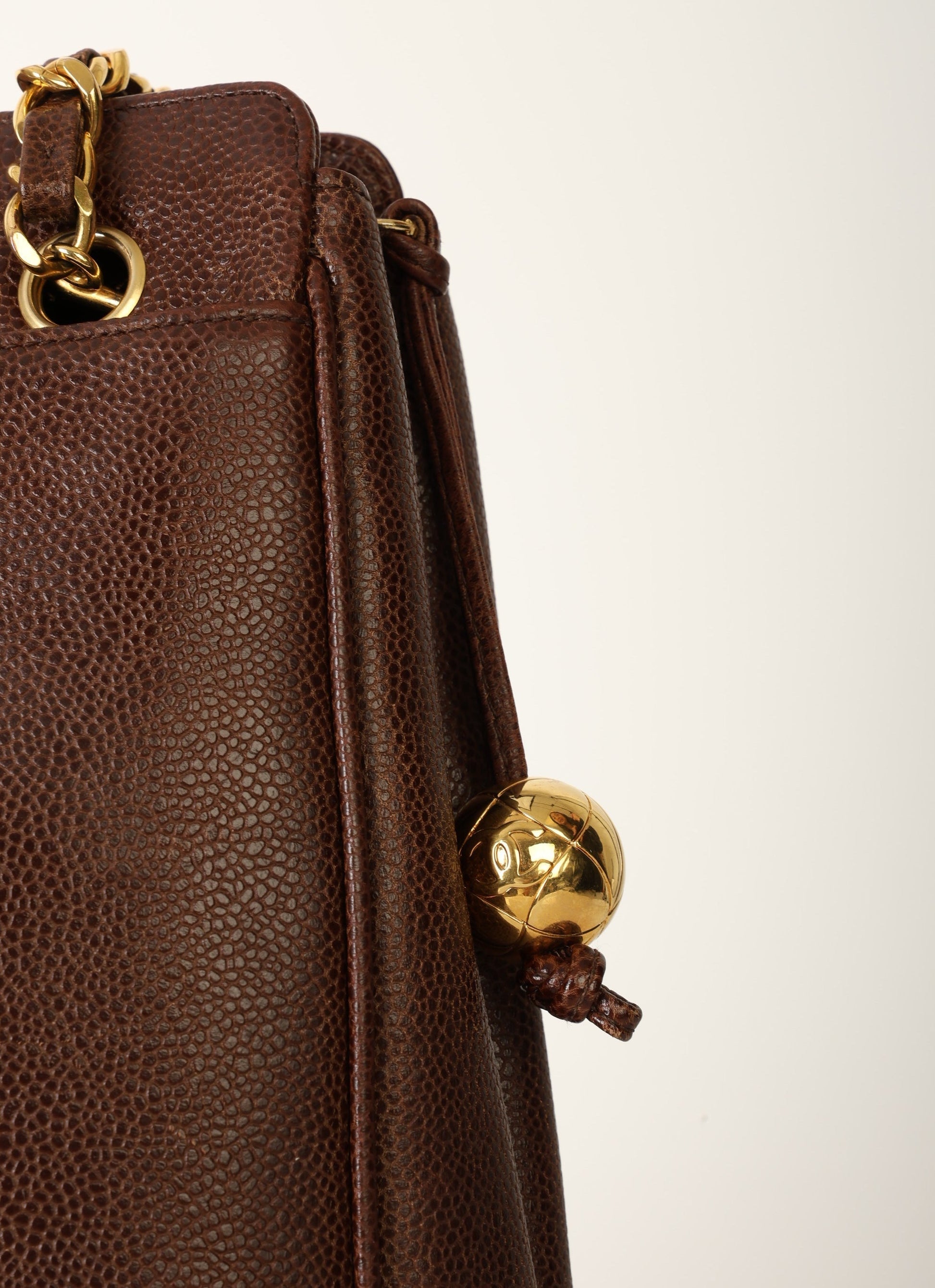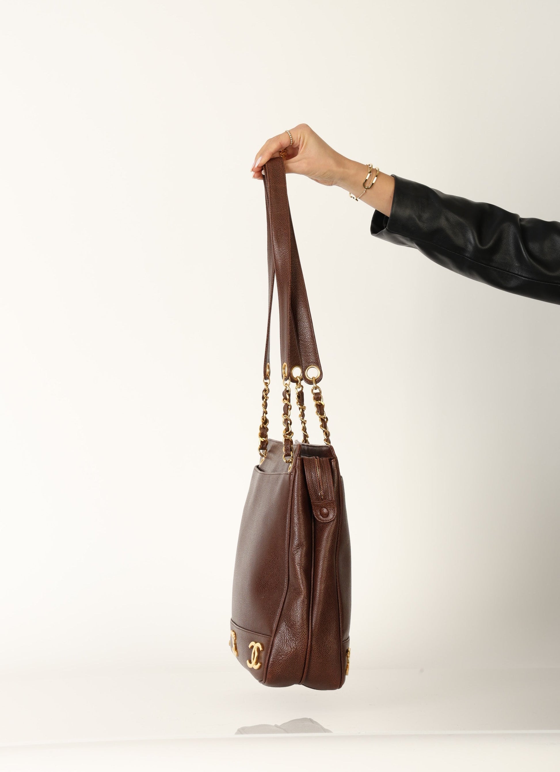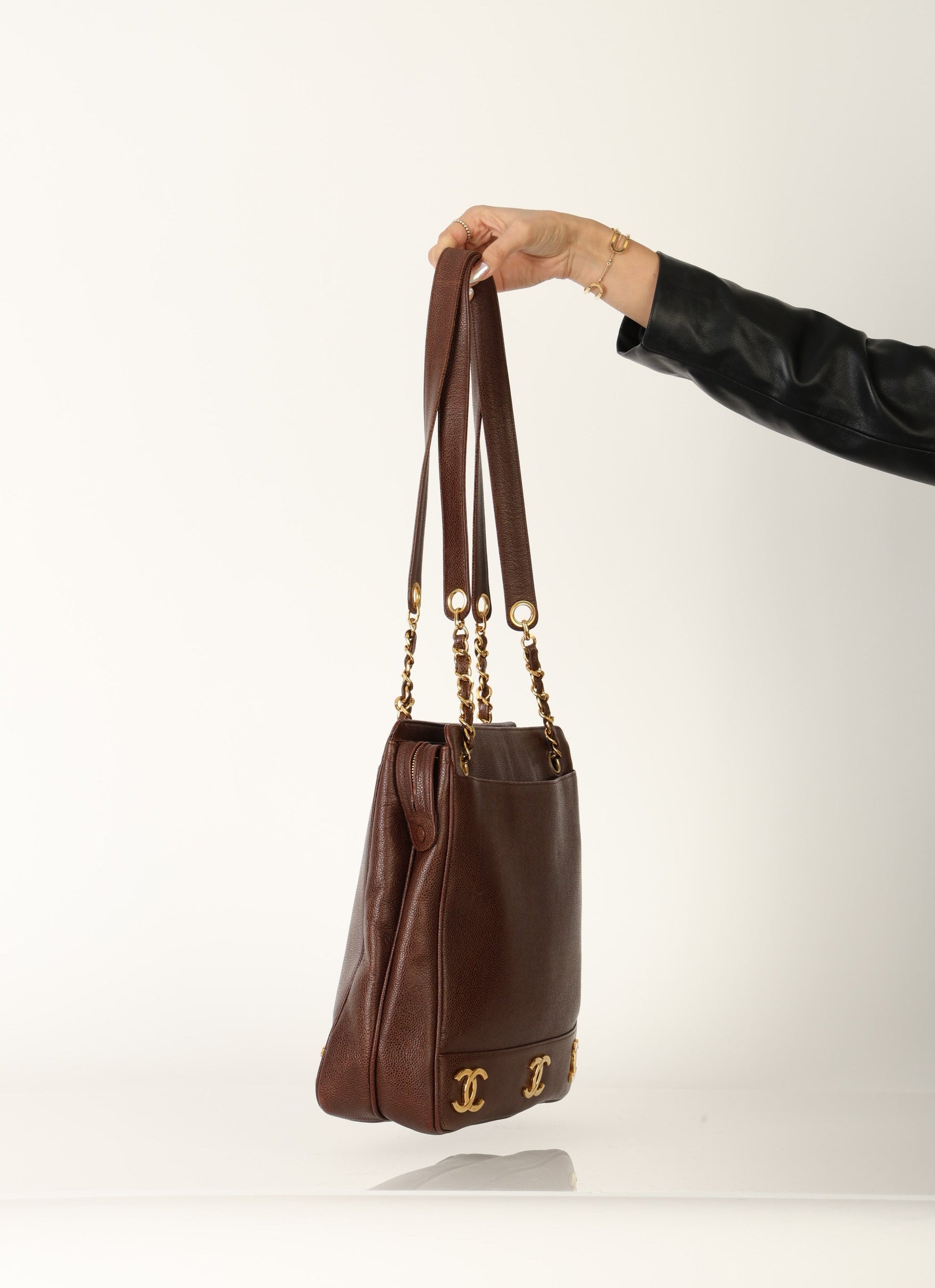 Dropping in the shop?is a stunning Chanel?Caviar Logo Tote in chocolate brown with gold hardware. The beautiful gold chain hardware and 6 Chanel logos all along the bottom with a Chanel ball charm as a zipper pull tie this piece together beautifully. New size allows this piece to be a great outing bag and fits your iPad, or a 13" laptop (vertically). A classic piece to enjoy for years!