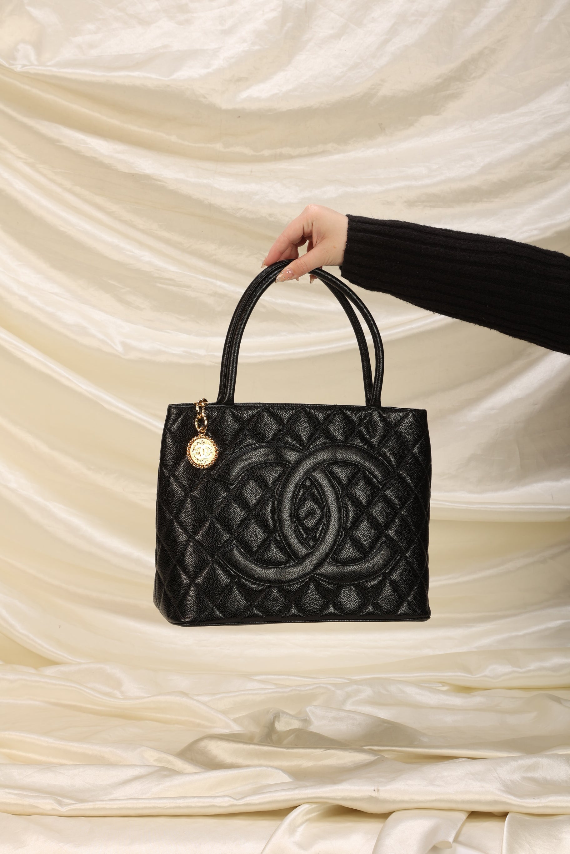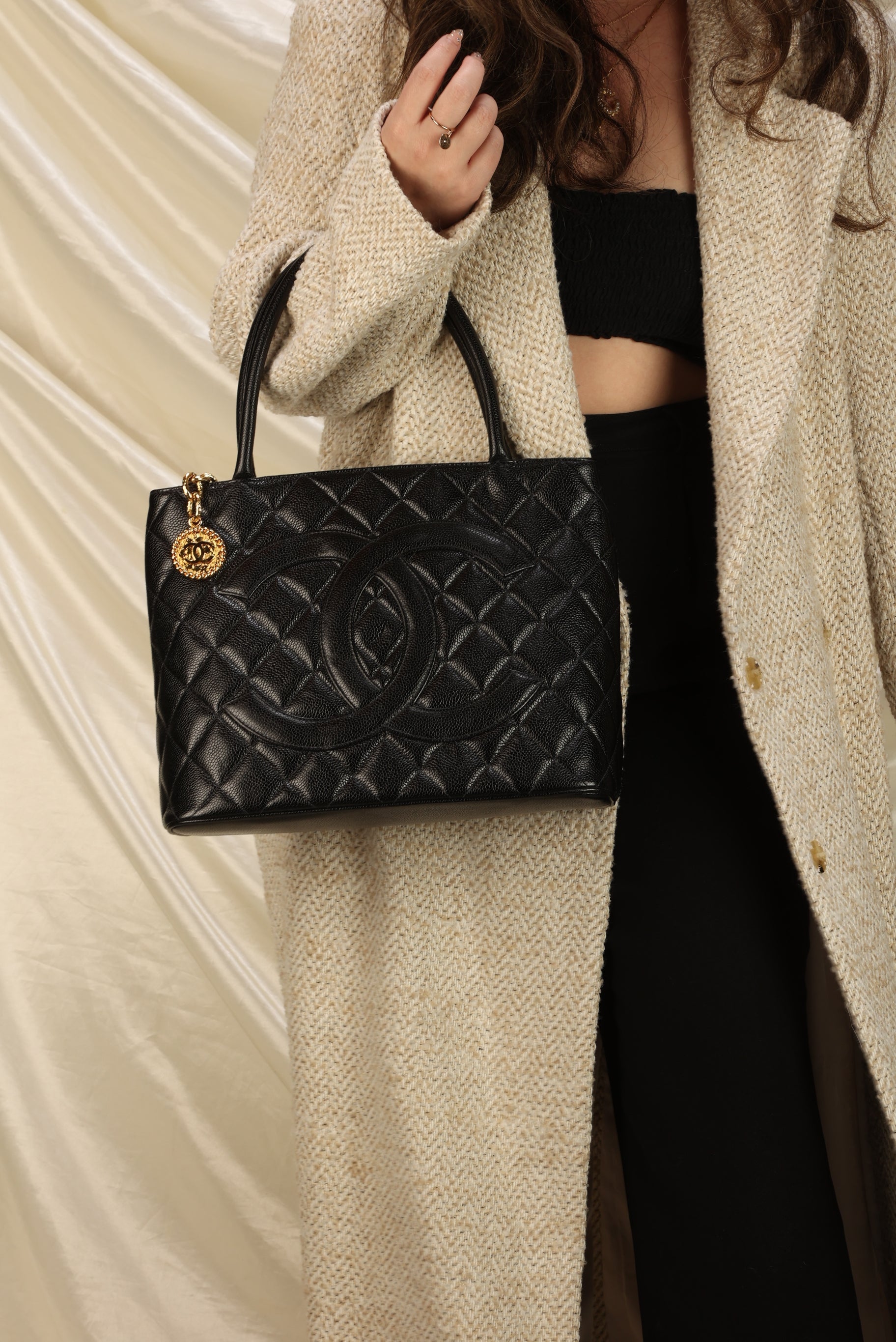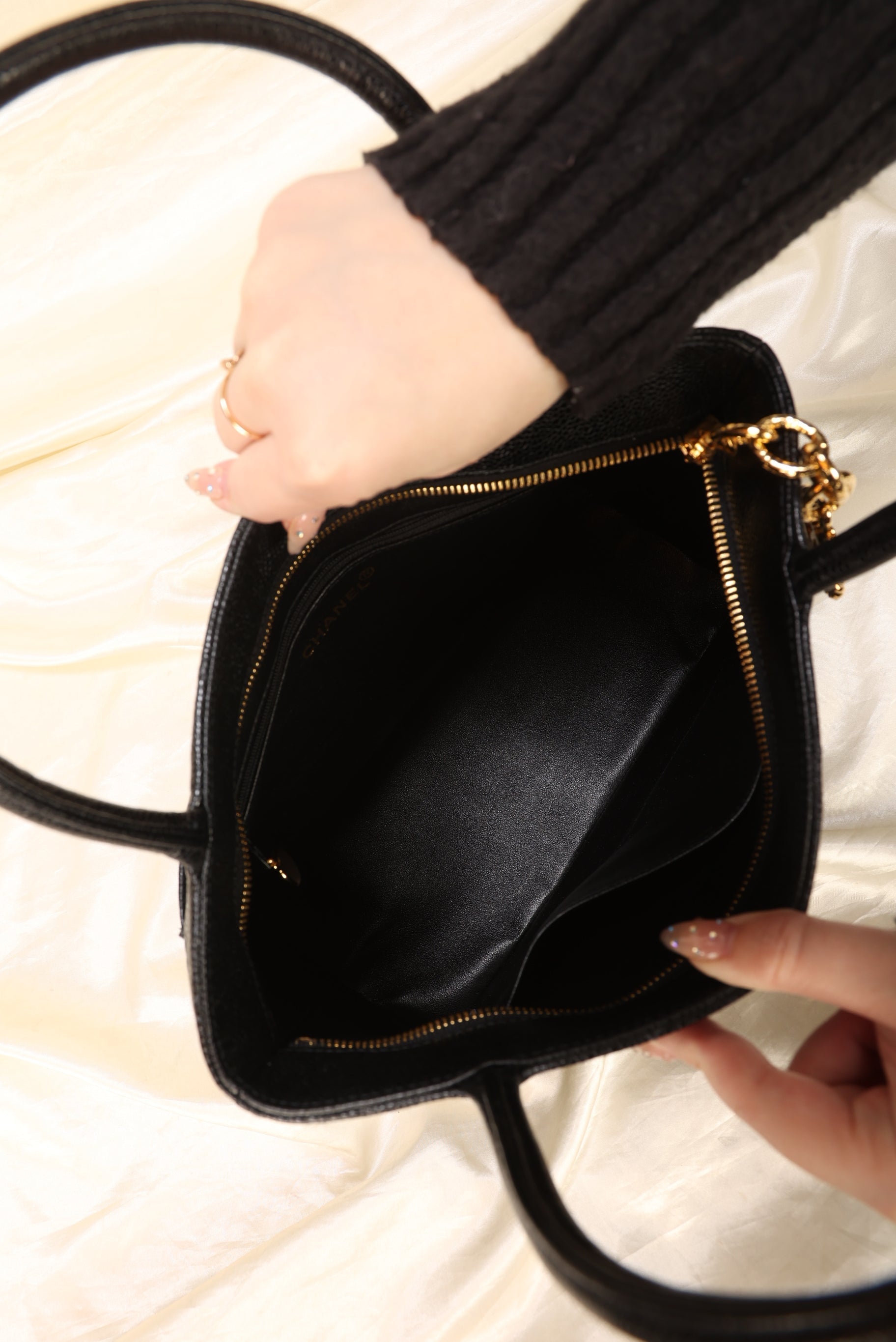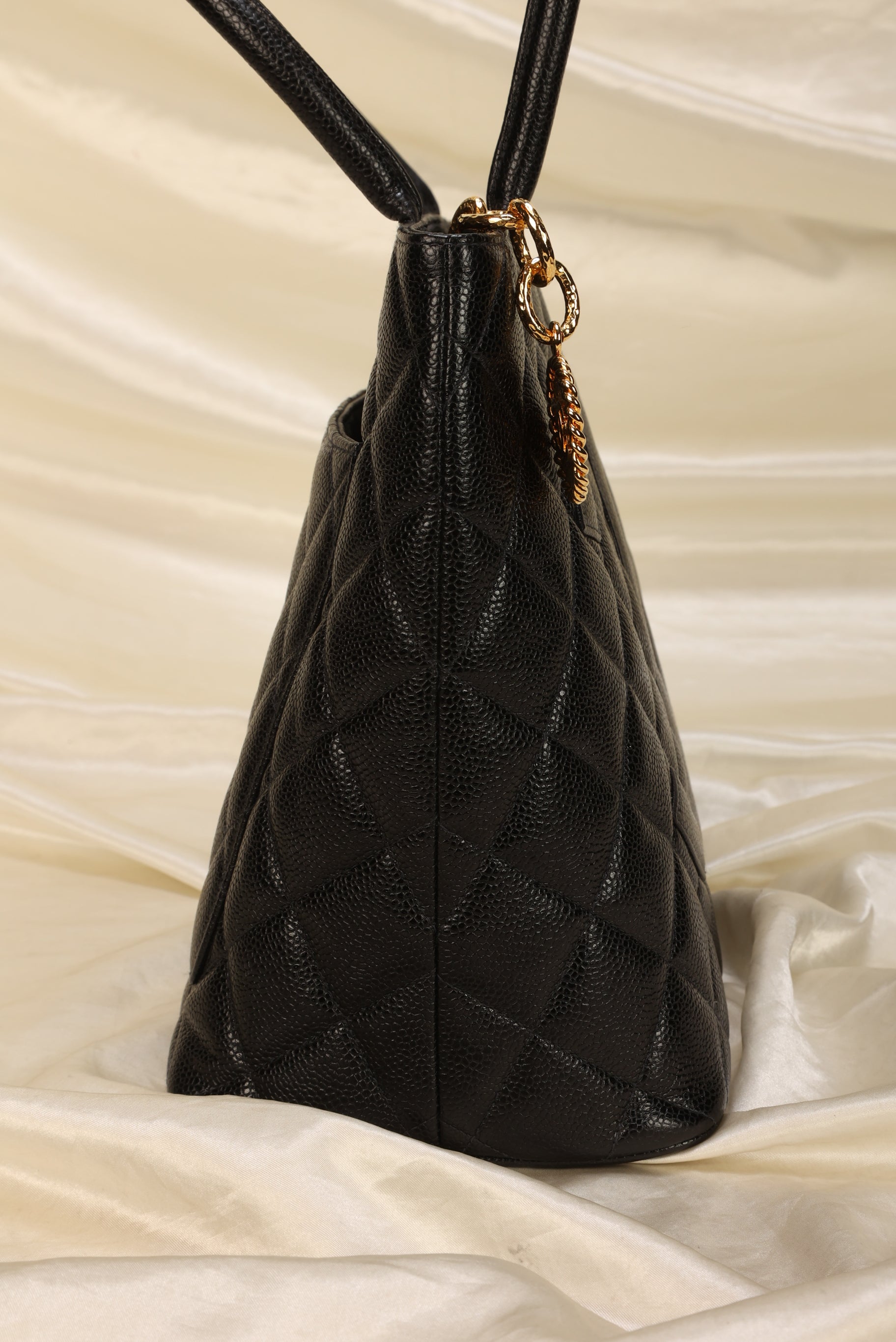 Up for grabs is one of Chanel???s most classic and popular styles! A stunning Chanel caviar tote with a large Chanel medallion charm featured as the zipper pull. Caviar leather allows for extreme durability. A classic piece to enjoy for years to come!