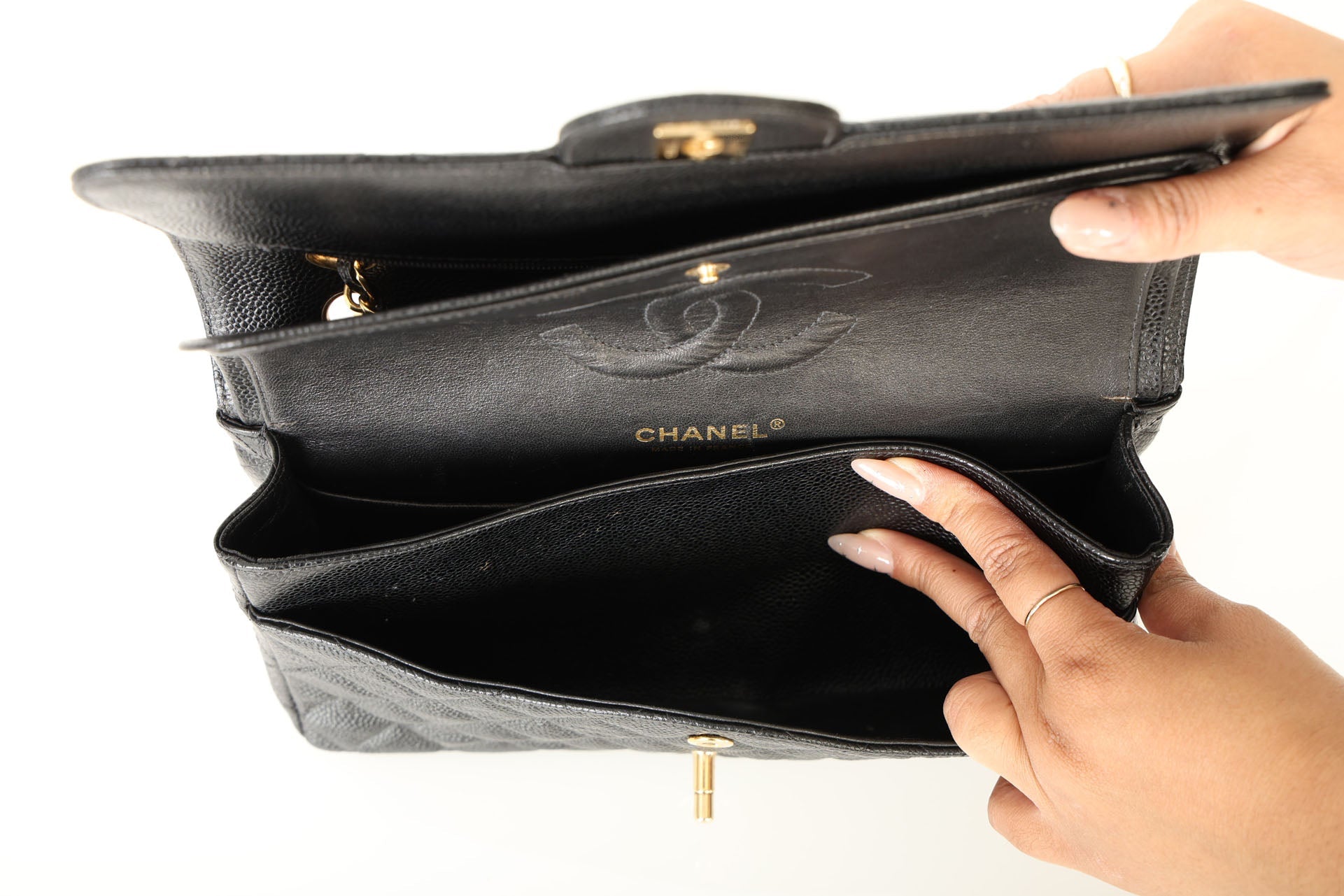 Please note: Light scratches on turnlock part of CC. Light peel in the side interior (see pic 13). Slight wear on caviar due to normal use. Please refer to photos for more details.?