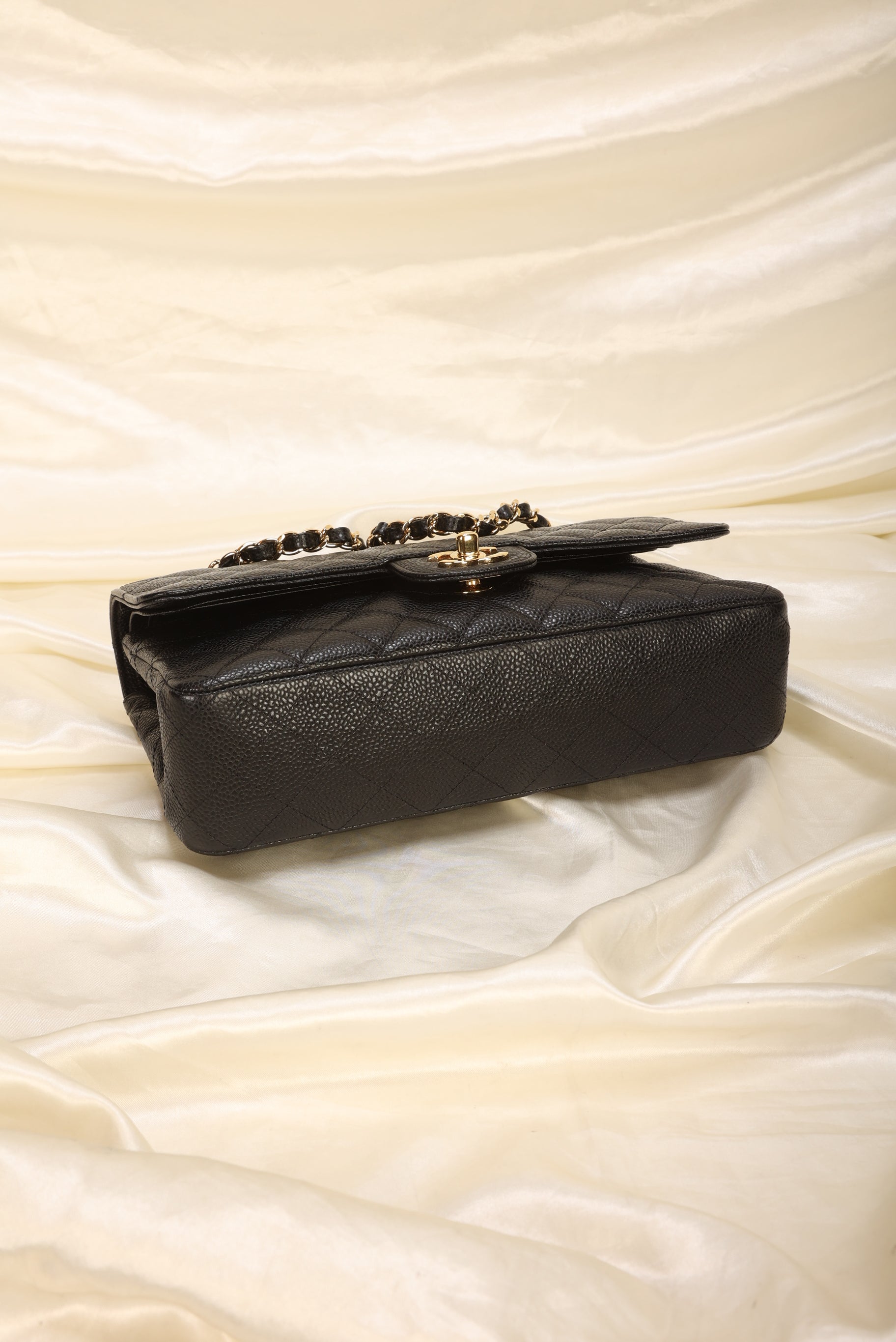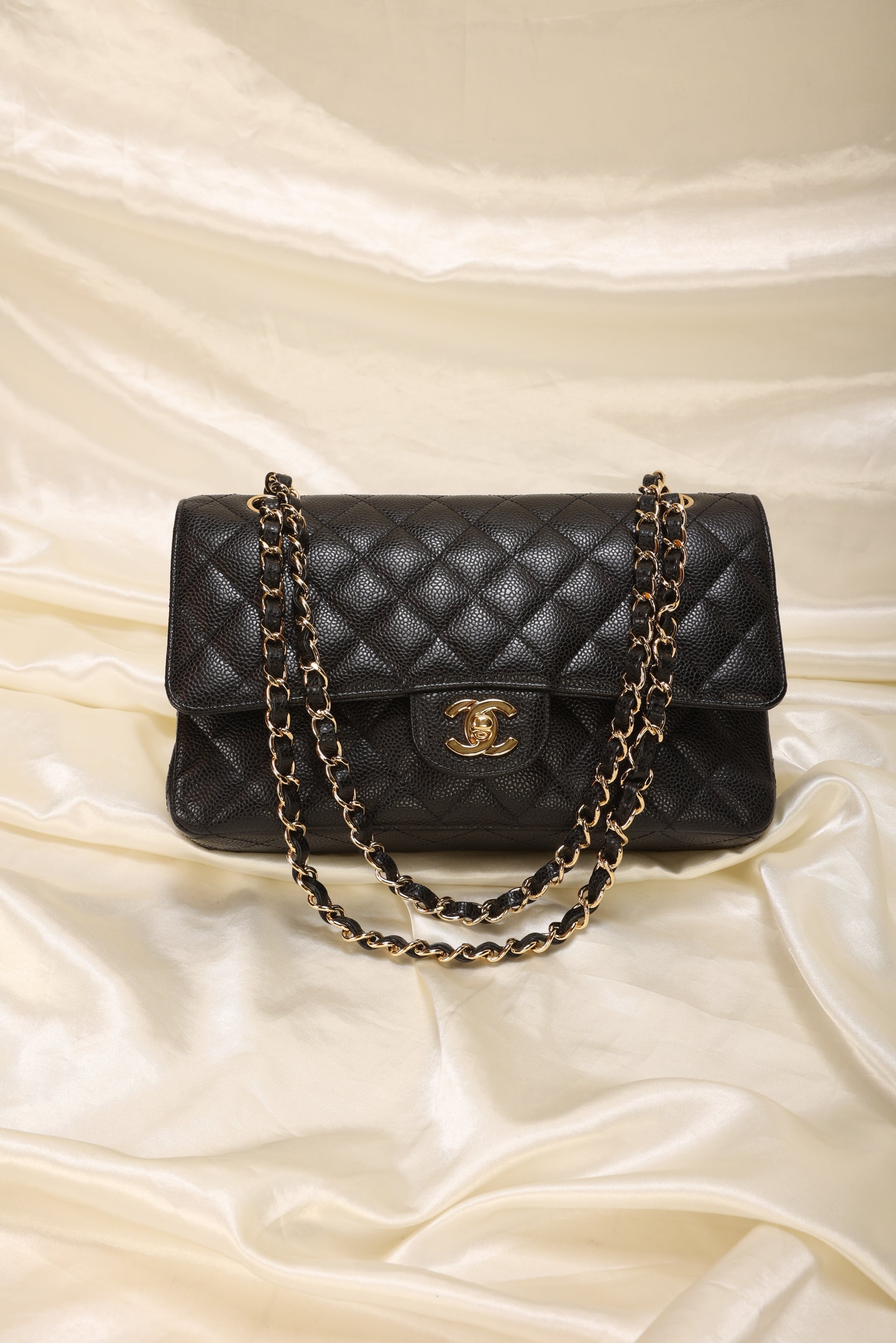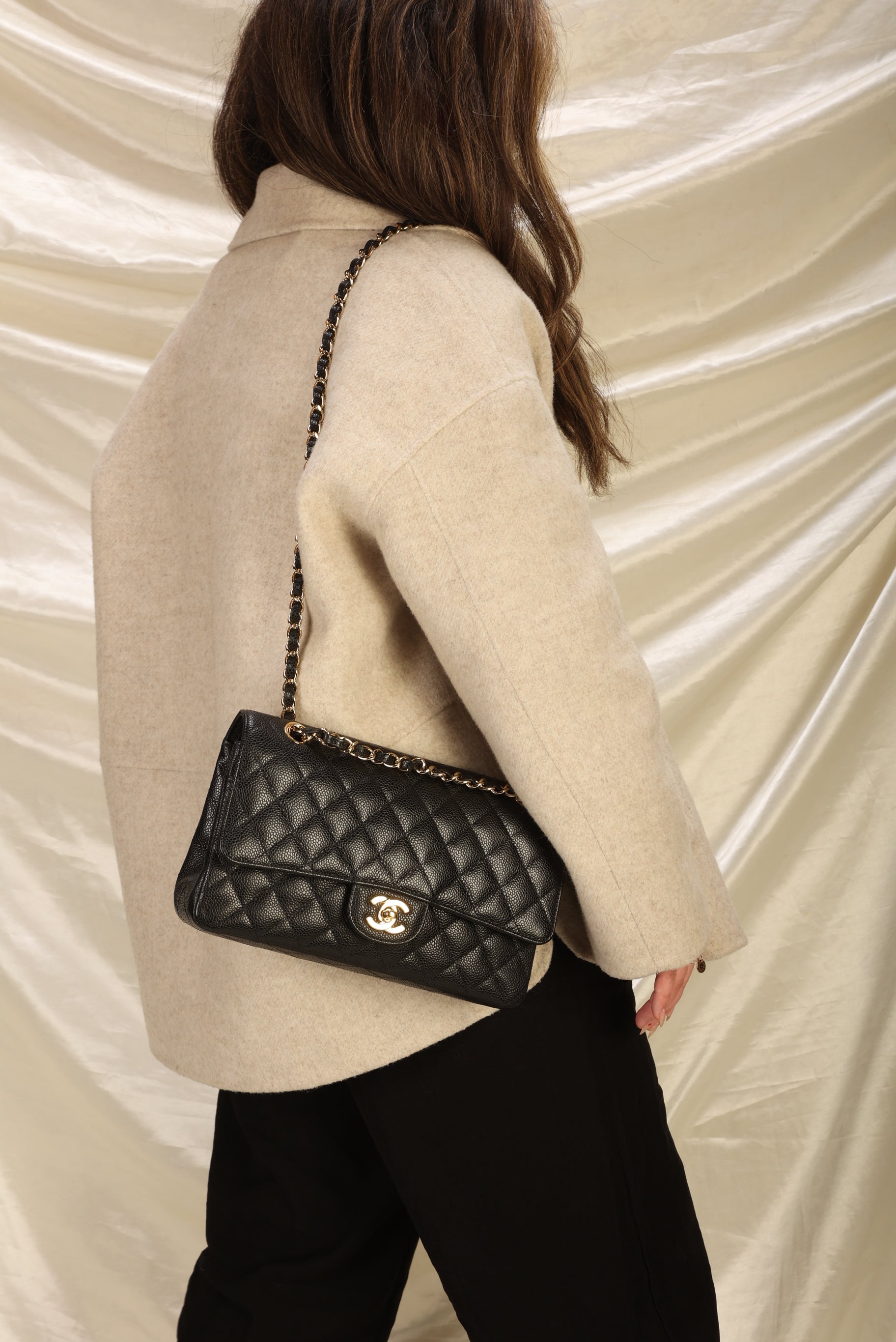 Twin with me! My favorite style by Chanel, the Classic Double Flap! This piece is crafted with the coveted black and gold combo!! Caviar leather and gold hardware. This piece is extremely difficult to come by at this and in this color combo.?? In this combo and condition, bag goes for between 9k-10k on the resale market! Extremely versatile piece can be as a??long or short??shoulder bag.??