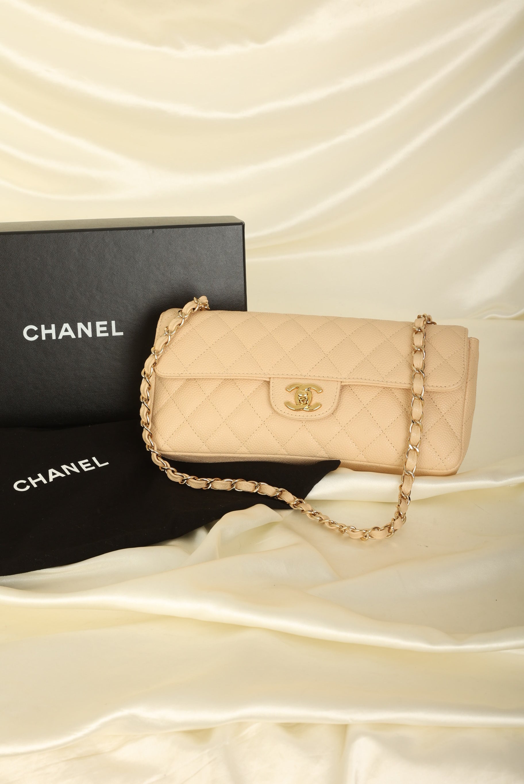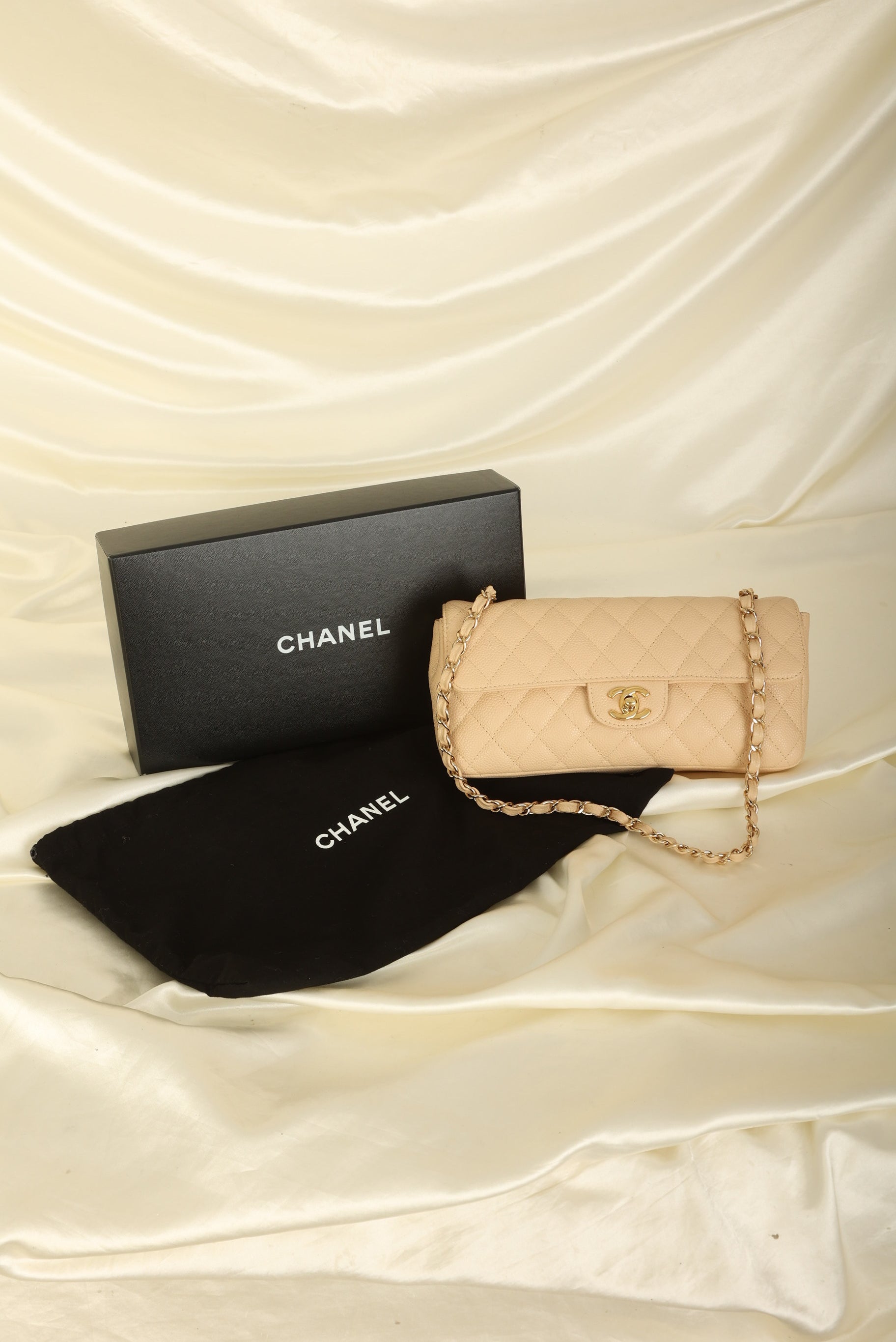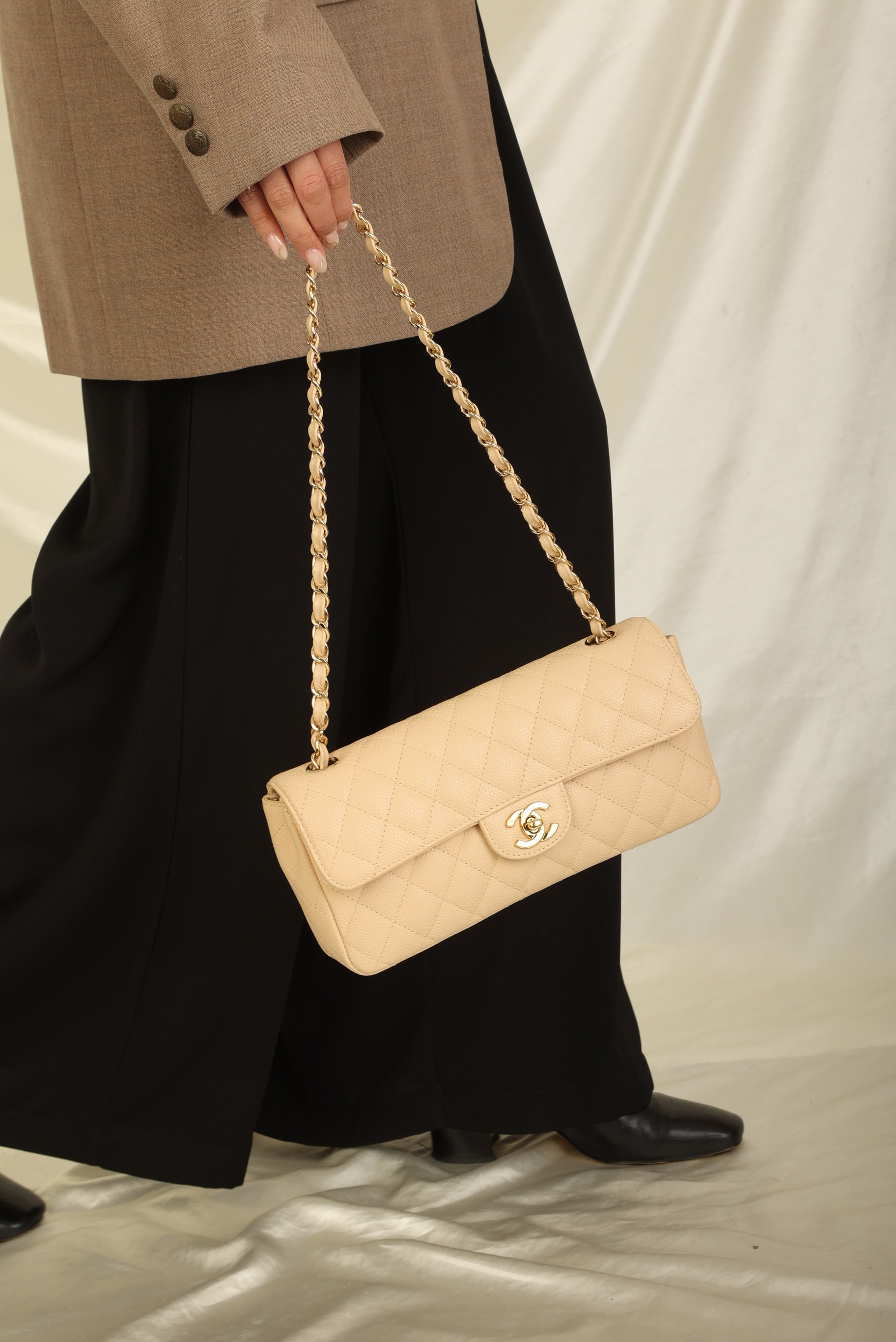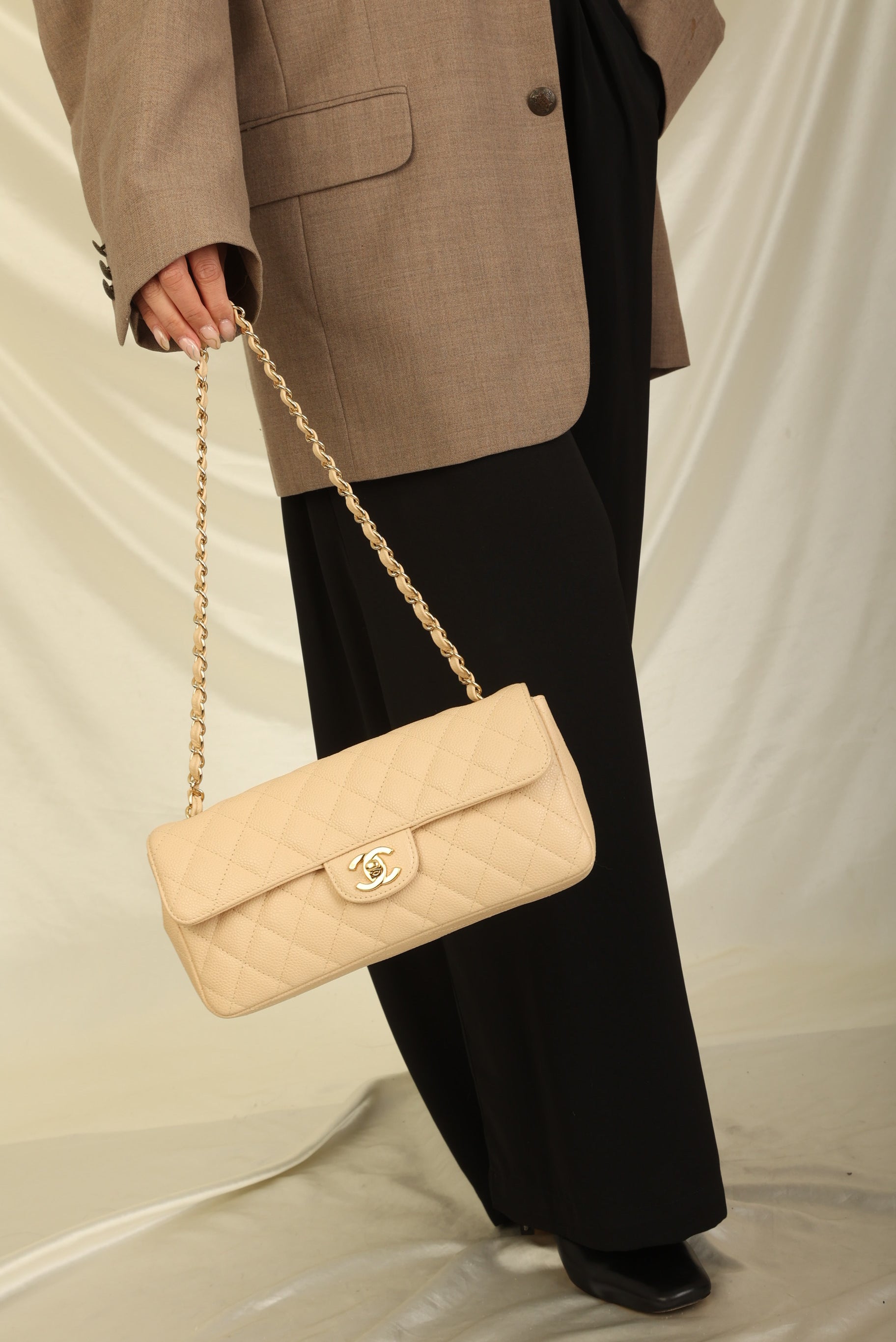 The classic East West flap - the chic sister to the classic flap! Crafted in beige caviar and 24kt gold plated hardware - the diamond quilting is a rare find for this style! Can be as a long or short shoulder bag with a chain length adjuster. You can fit your phone, keys, wallet, sunglasses, and a few of your smaller essentials.