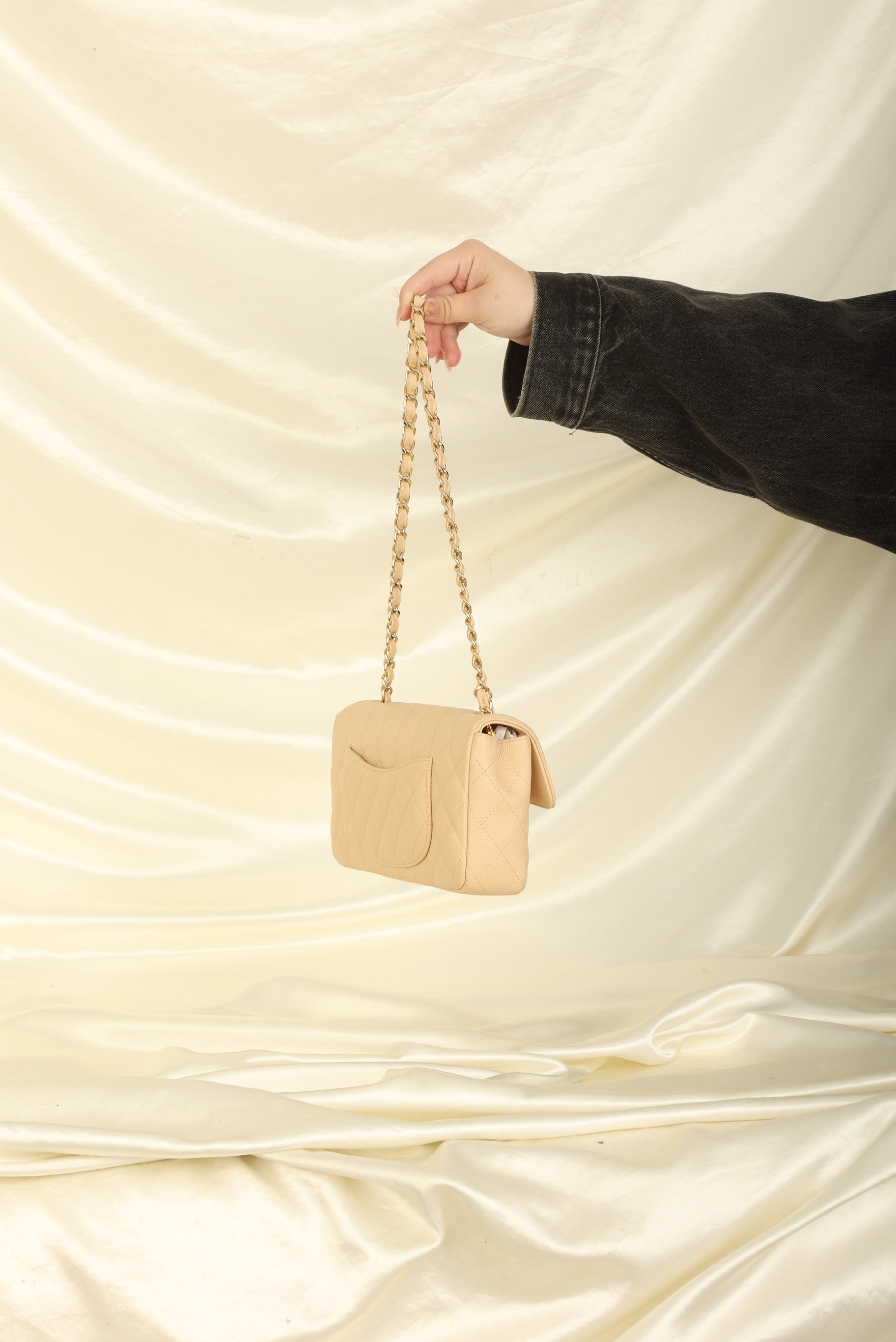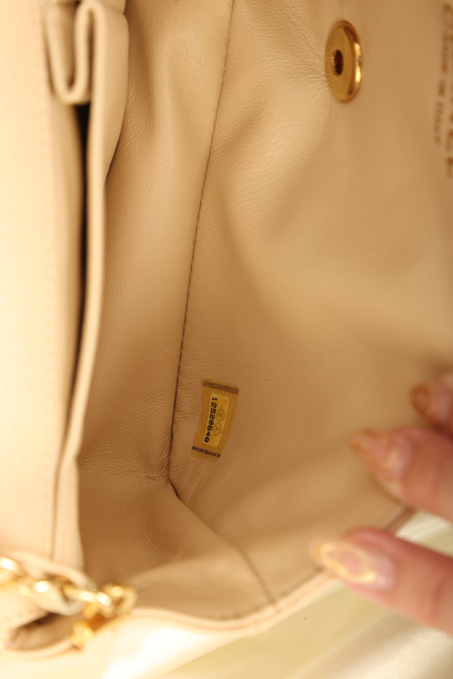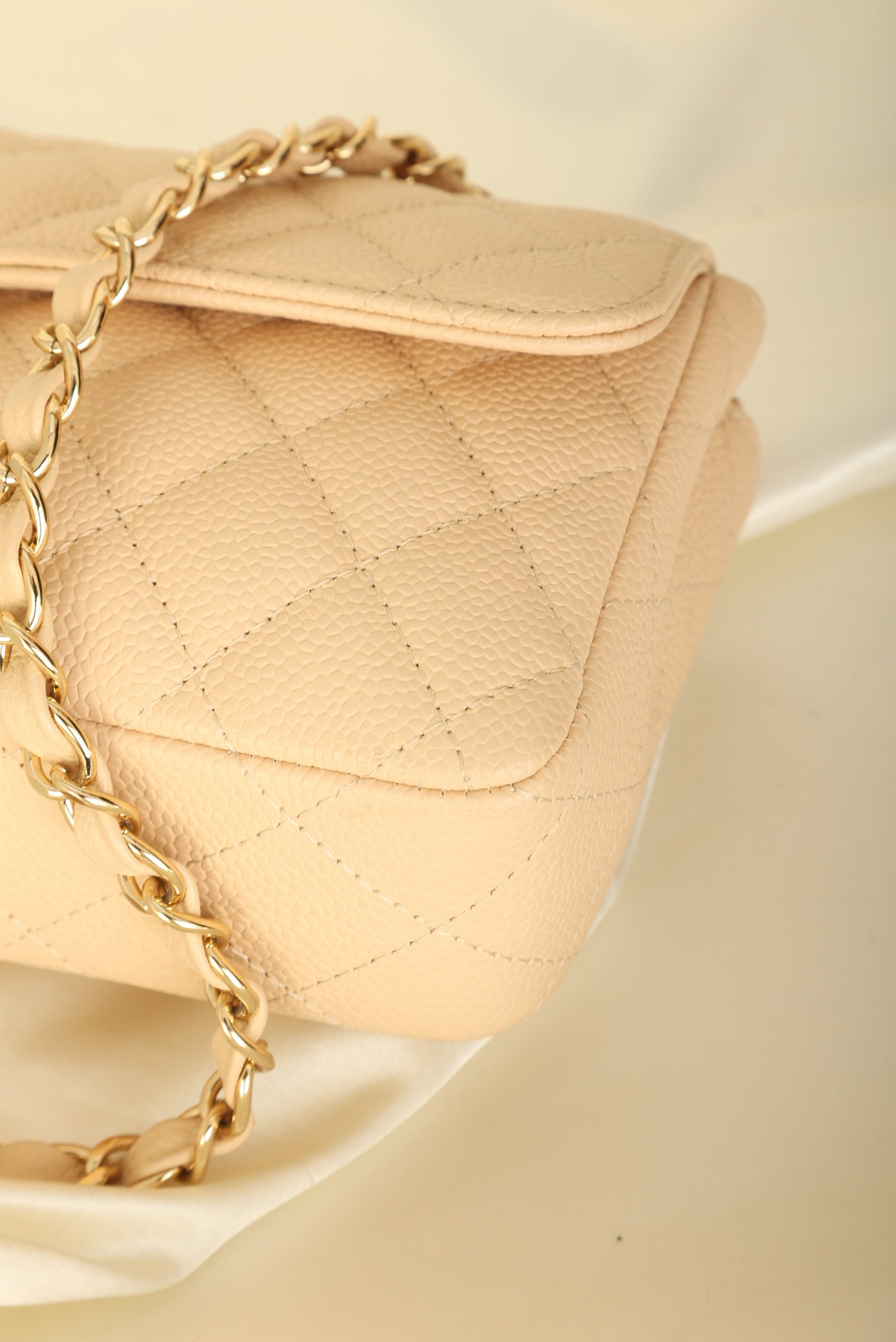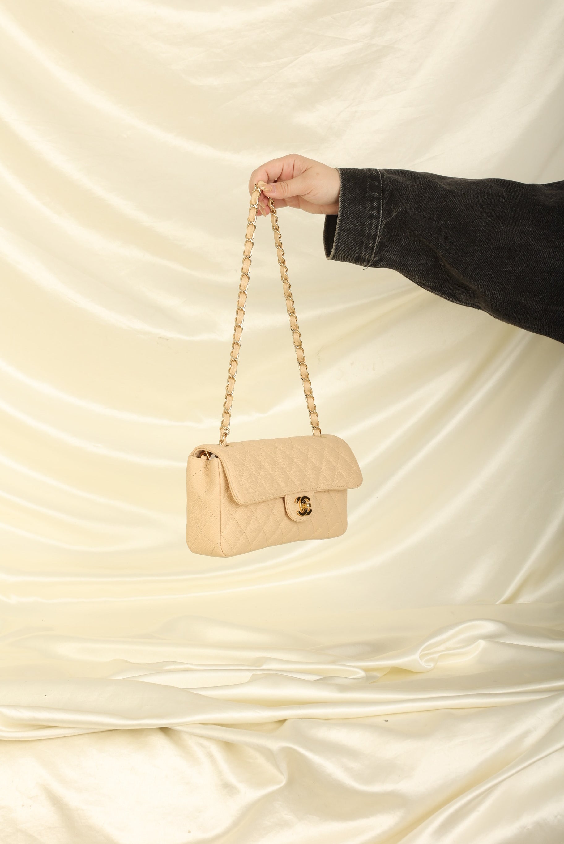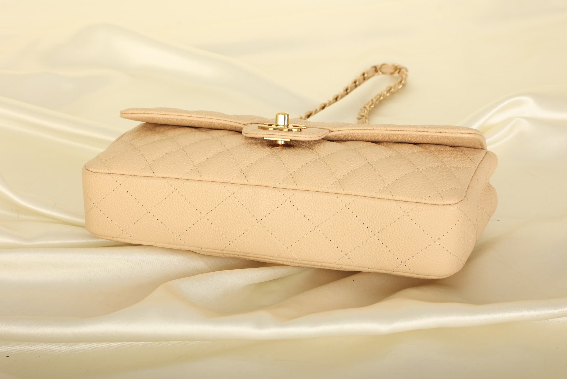 The classic East West flap - the chic sister to the classic flap! Crafted in beige caviar and 24kt gold plated hardware - the diamond quilting is a rare find for this style! Can be as a long or short shoulder bag with a chain length adjuster. You can fit your phone, keys, wallet, sunglasses, and a few of your smaller essentials.