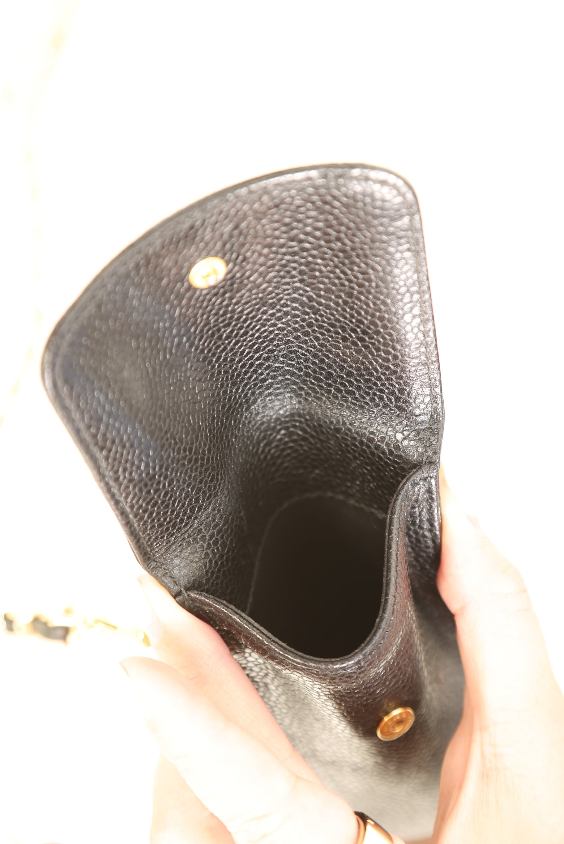 Crafted from??caviar material, this??pouch boasts a classy??gold Chanel logo??that is both subtle and sophisticated.??Despite its compact size, this micro flap is incredibly versatile. The interior can hold keys and cards.