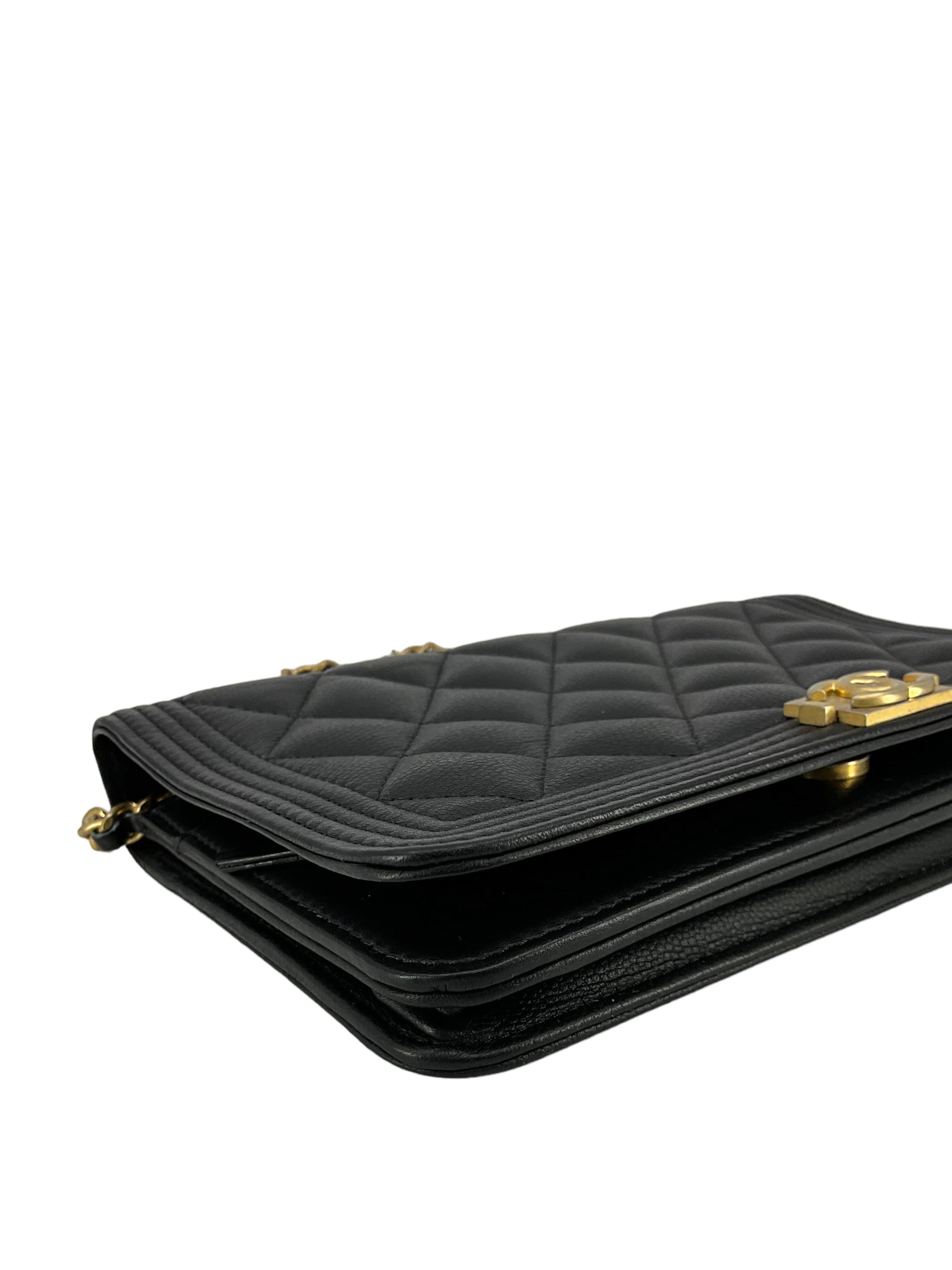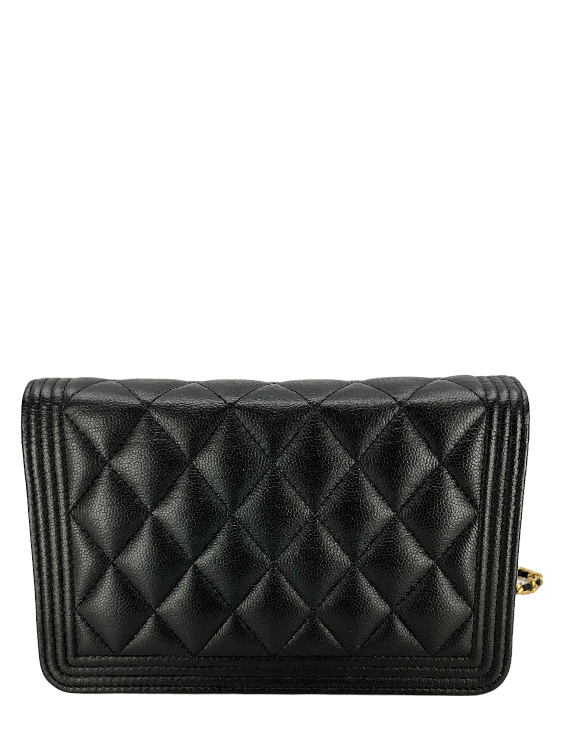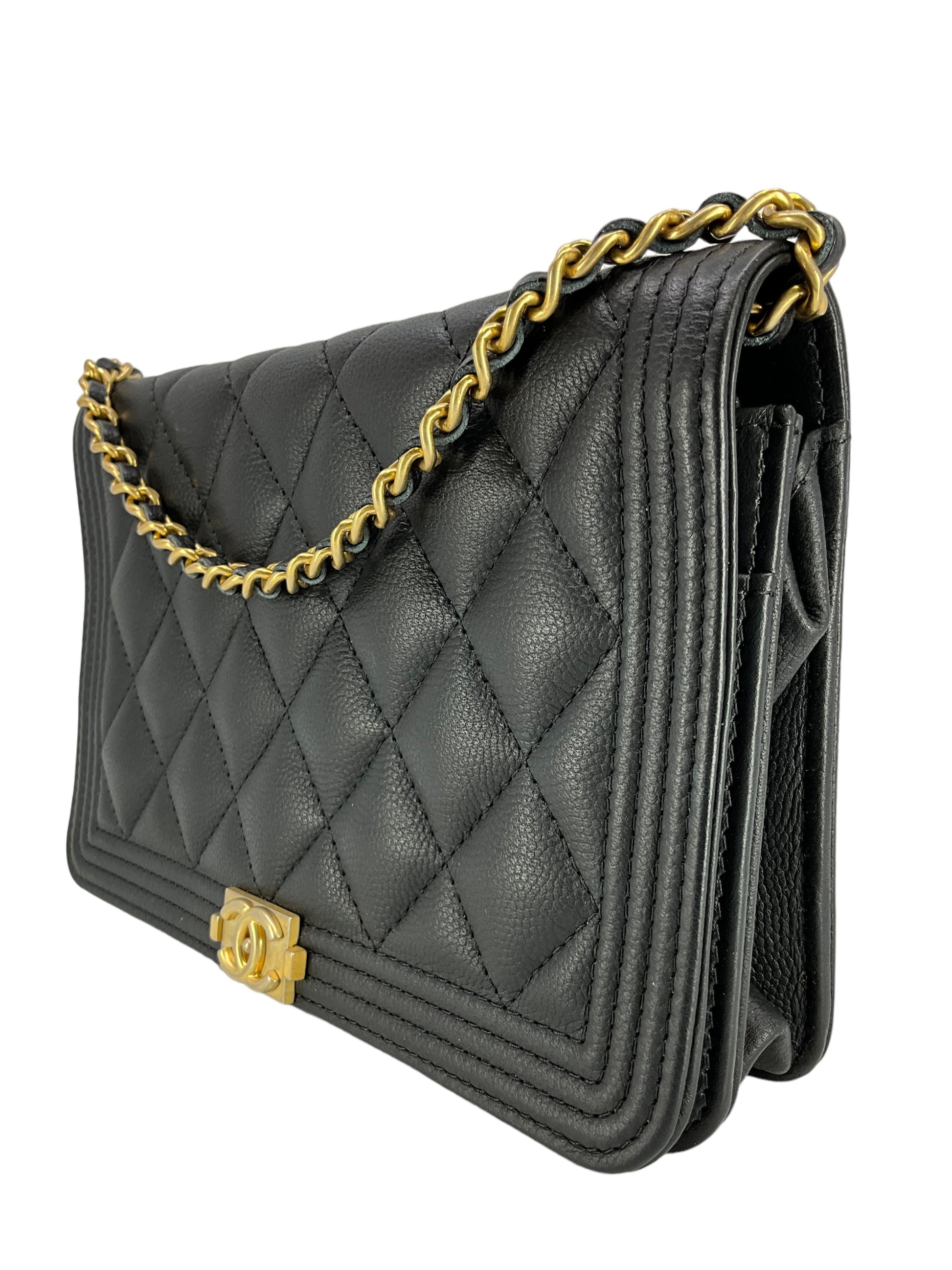 CHANEL Caviar Quilted Boy Wallet On Chain WOC Bag crafted from beautiful black caviar leather and gold-tone metal hardware. Featuring a chain link strap threaded with tonal black leather that can easily be tucked inside the bag and carried under the arm as a clutch. The front flap with secure signature CC turn-lock closure opens to a fabric lined interior with multiple credit card slots.