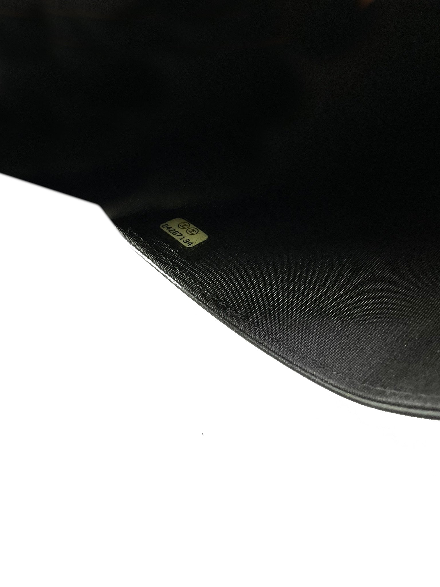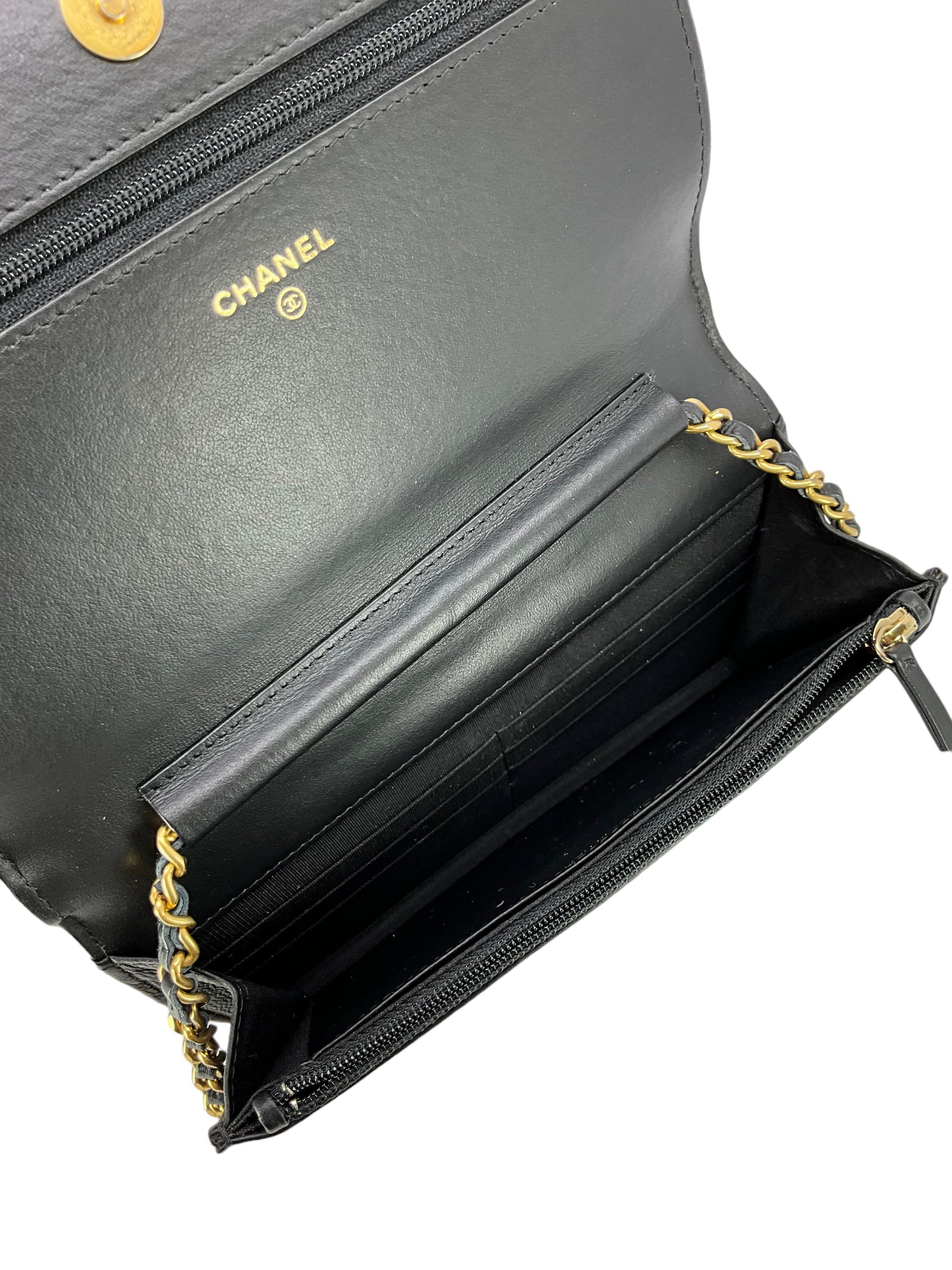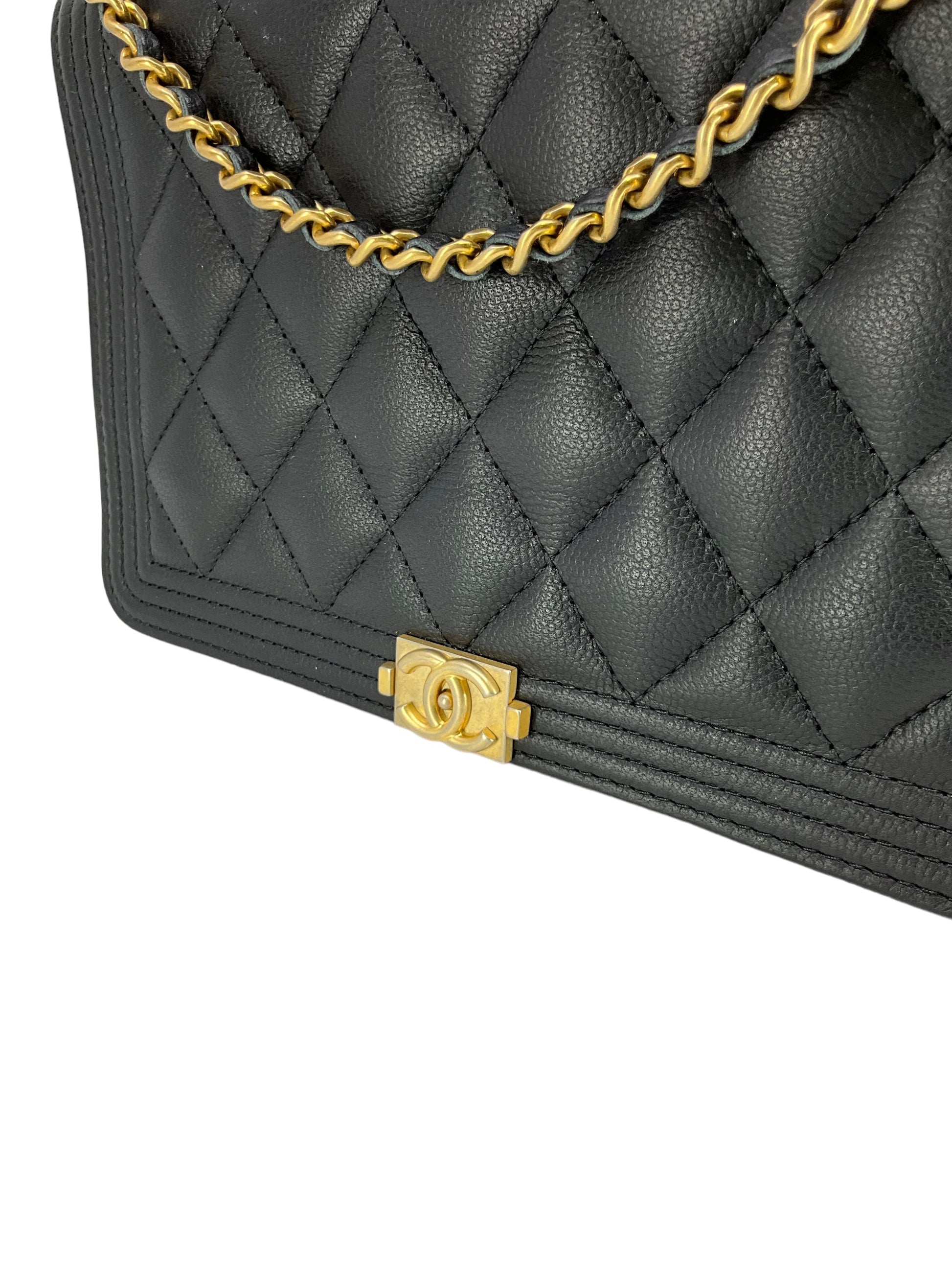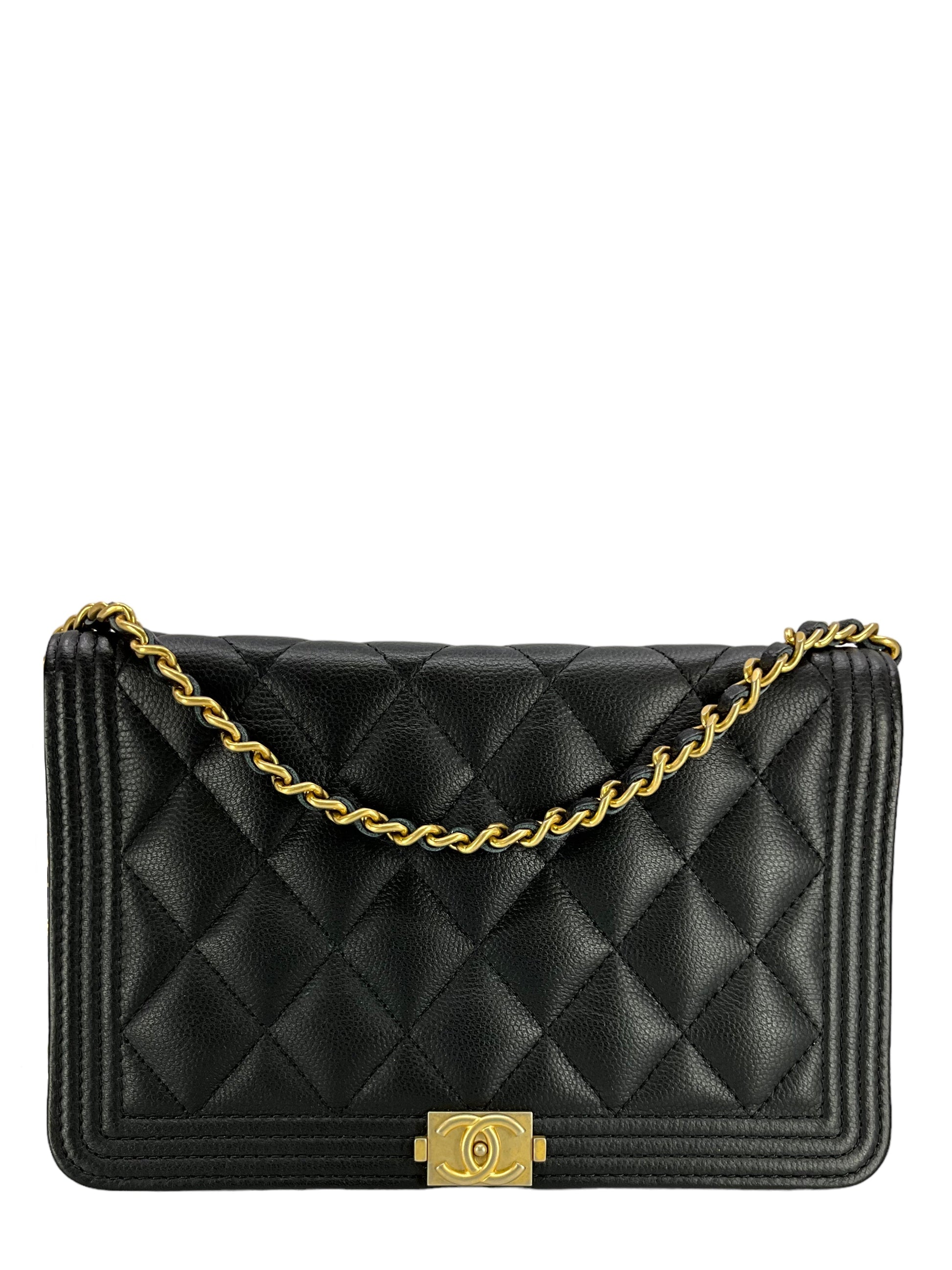 CHANEL Caviar Quilted Boy Wallet On Chain WOC Bag crafted from beautiful black caviar leather and gold-tone metal hardware. Featuring a chain link strap threaded with tonal black leather that can easily be tucked inside the bag and carried under the arm as a clutch. The front flap with secure signature CC turn-lock closure opens to a fabric lined interior with multiple credit card slots.