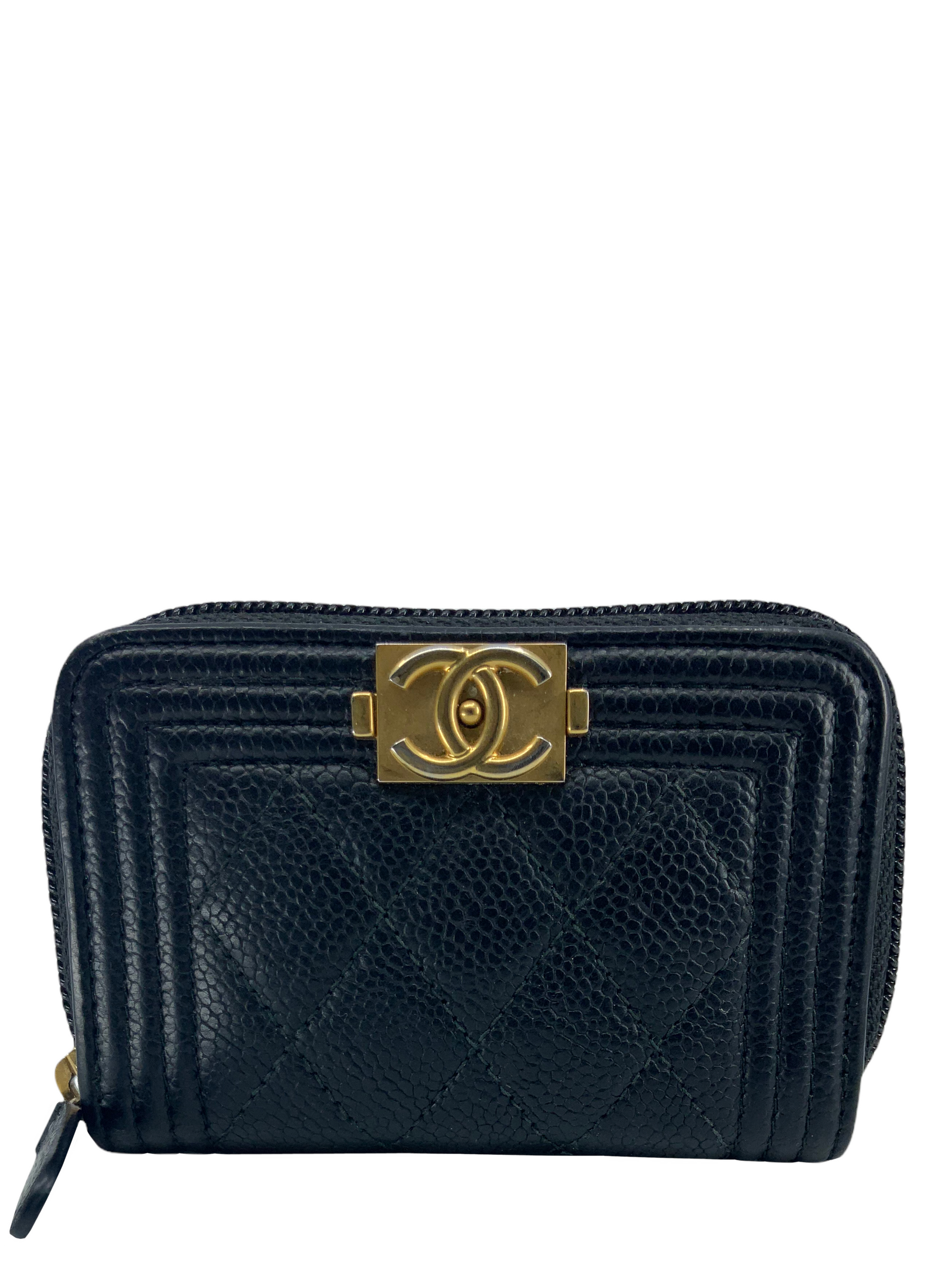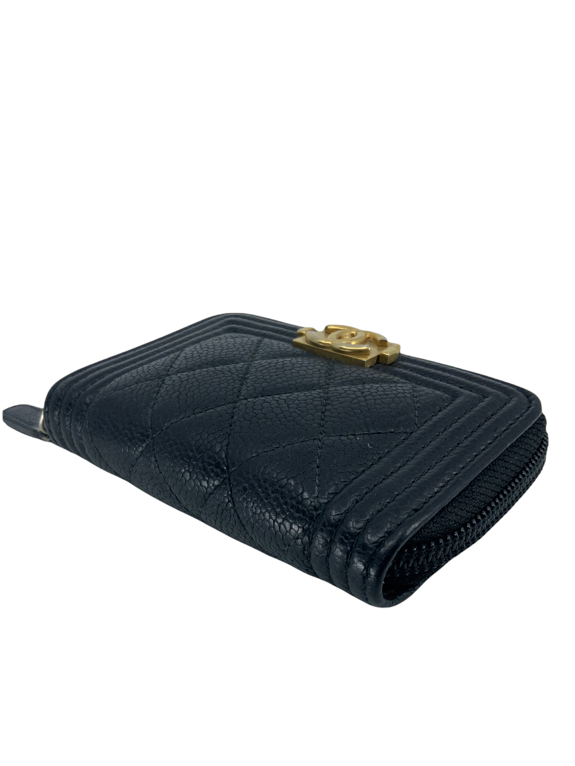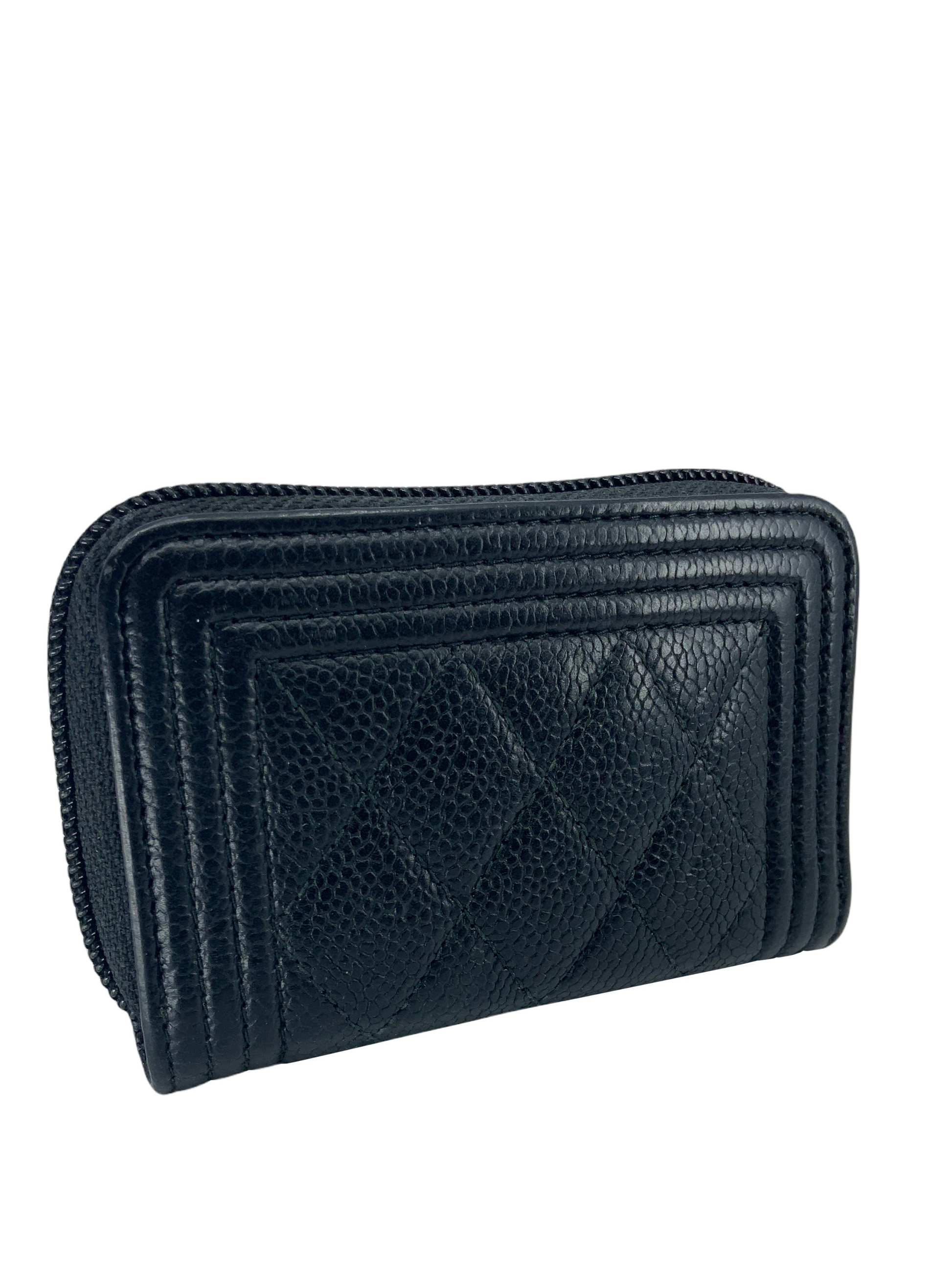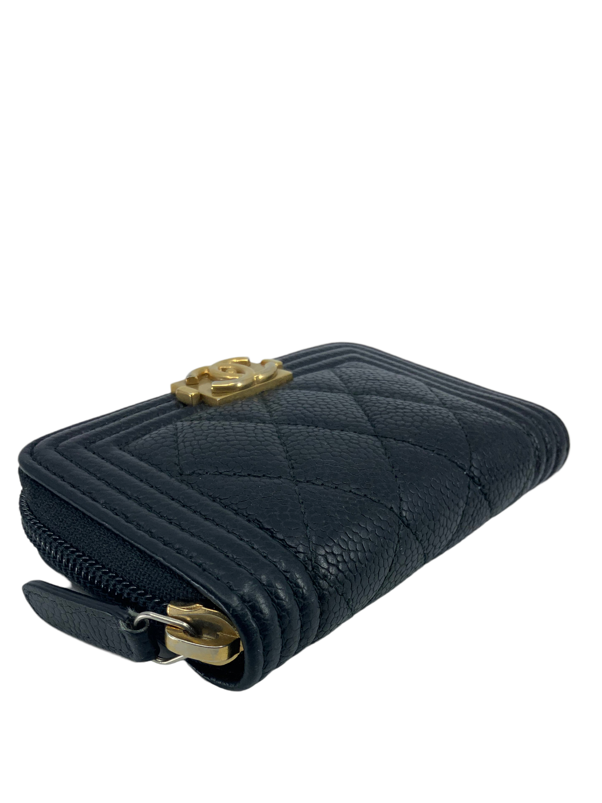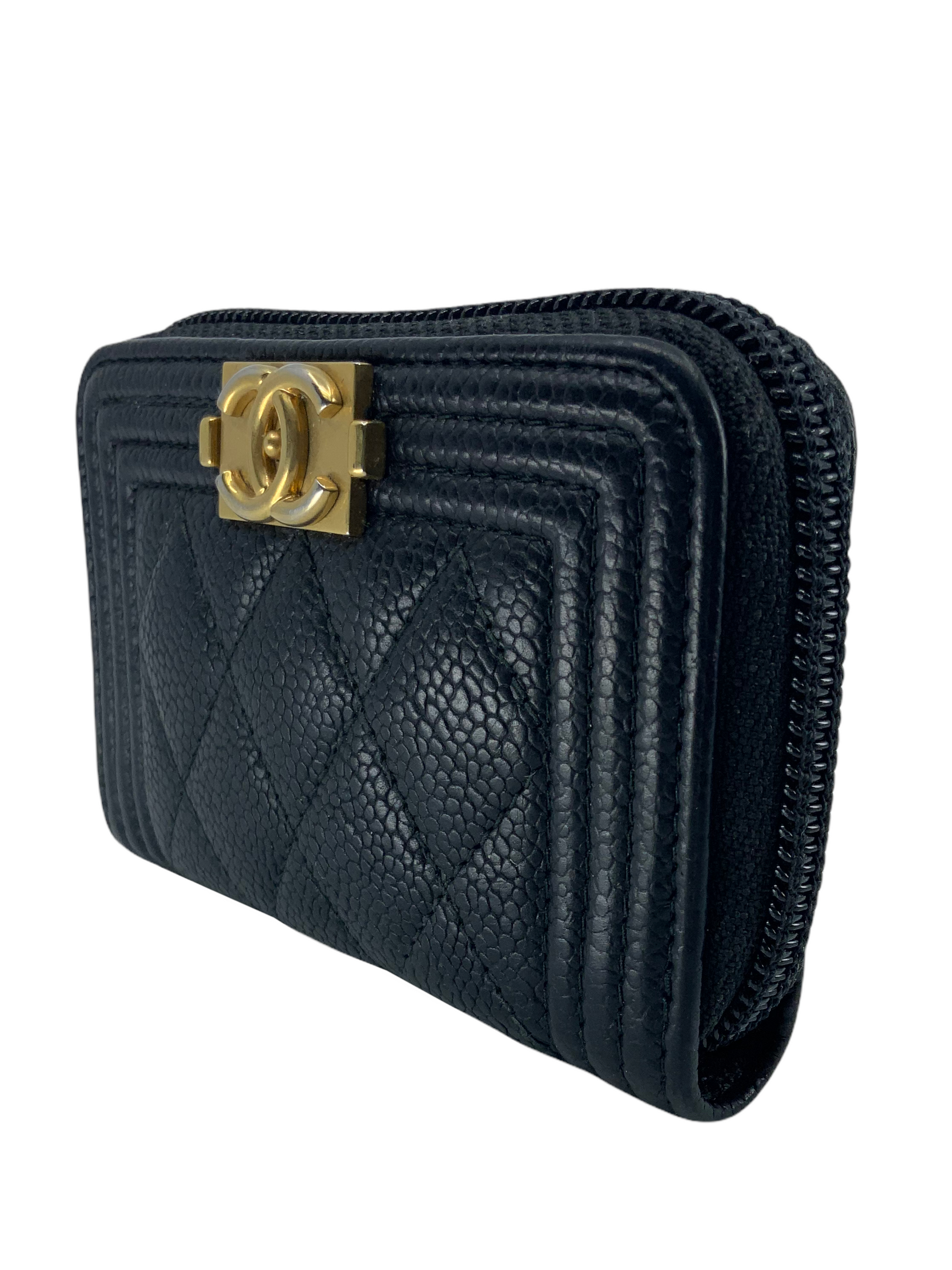 We the ity of this CHANEL Caviar Quilted Boy Zip Around Coin Purse Wallet crafted in diamond quilted black?leather. Featuring a?signature gold-tone 'CC' logo plate? and a zip-around closure that opens to triple?card slots compartments.