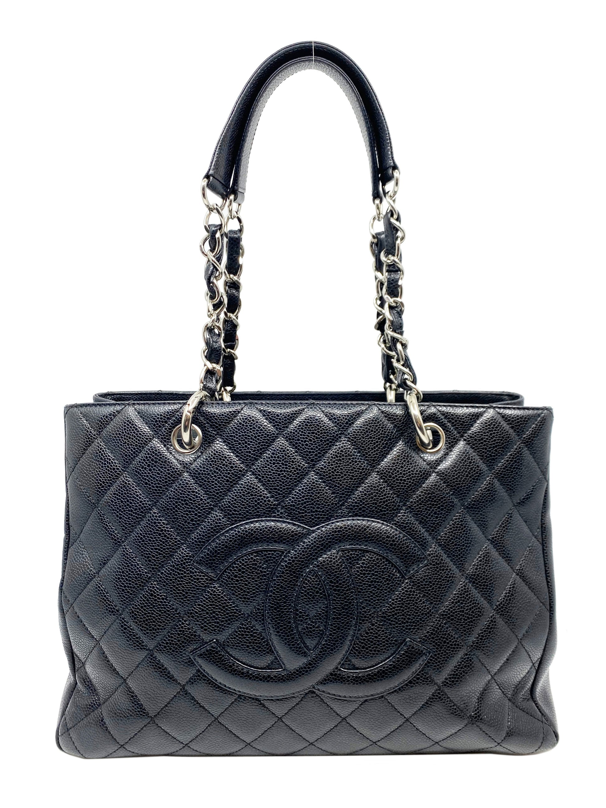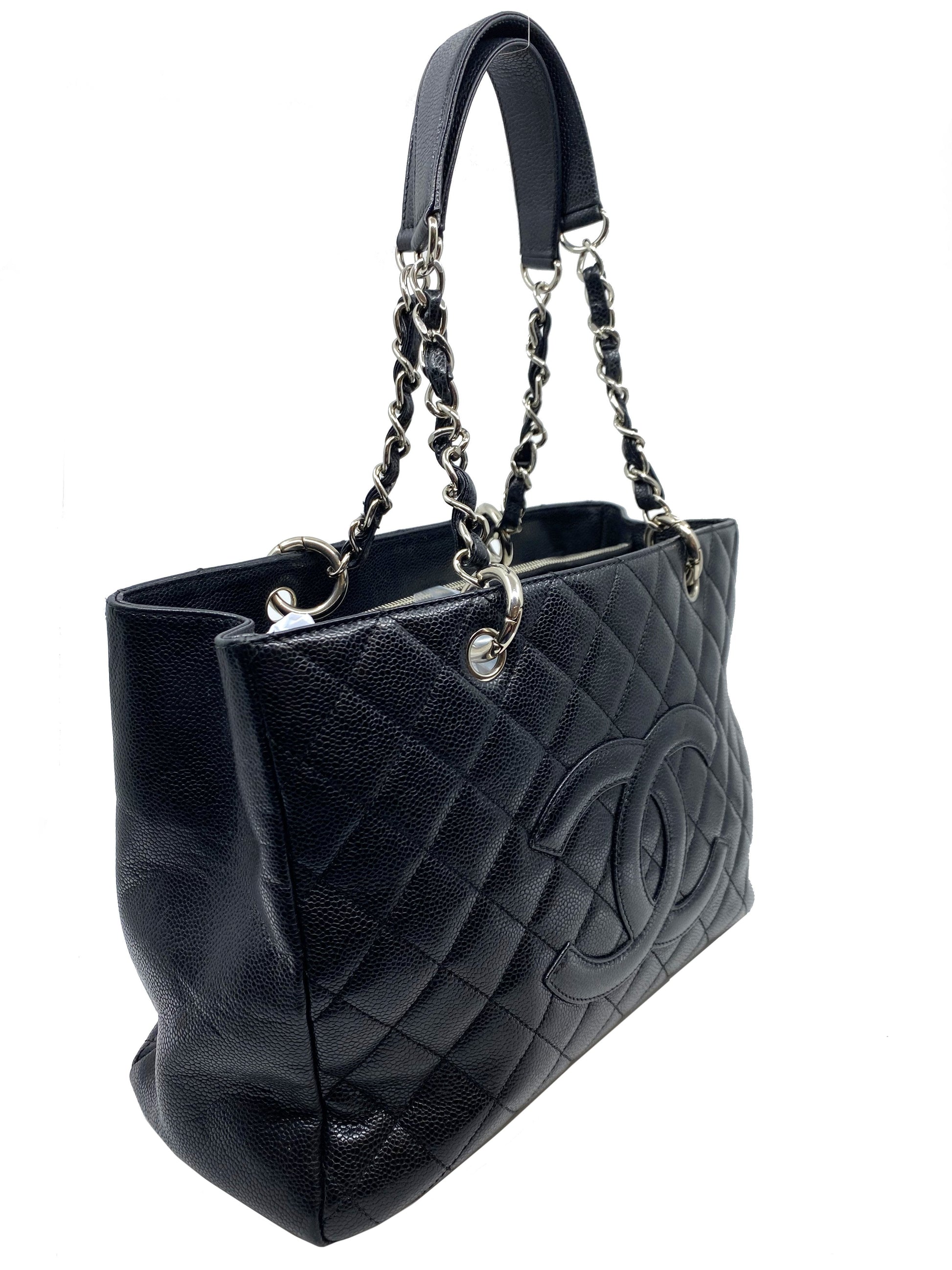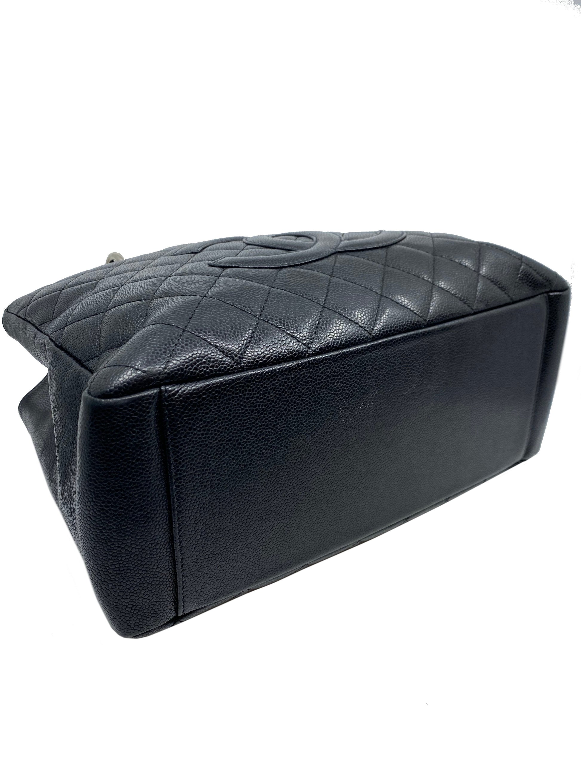 Add to your collection this?d Chanel Caviar Quilted Grand Shopping Tote GST Bag crafted from beautiful?black quilted?caviar leather which continuously increases in value and is from Chanel's classic caviar collection. This?chic and gorgeous bag features a?signature embossed 'CC' logo at center,?elegant silver-tone hardware and dual chain link shoulder straps threaded with red leather.