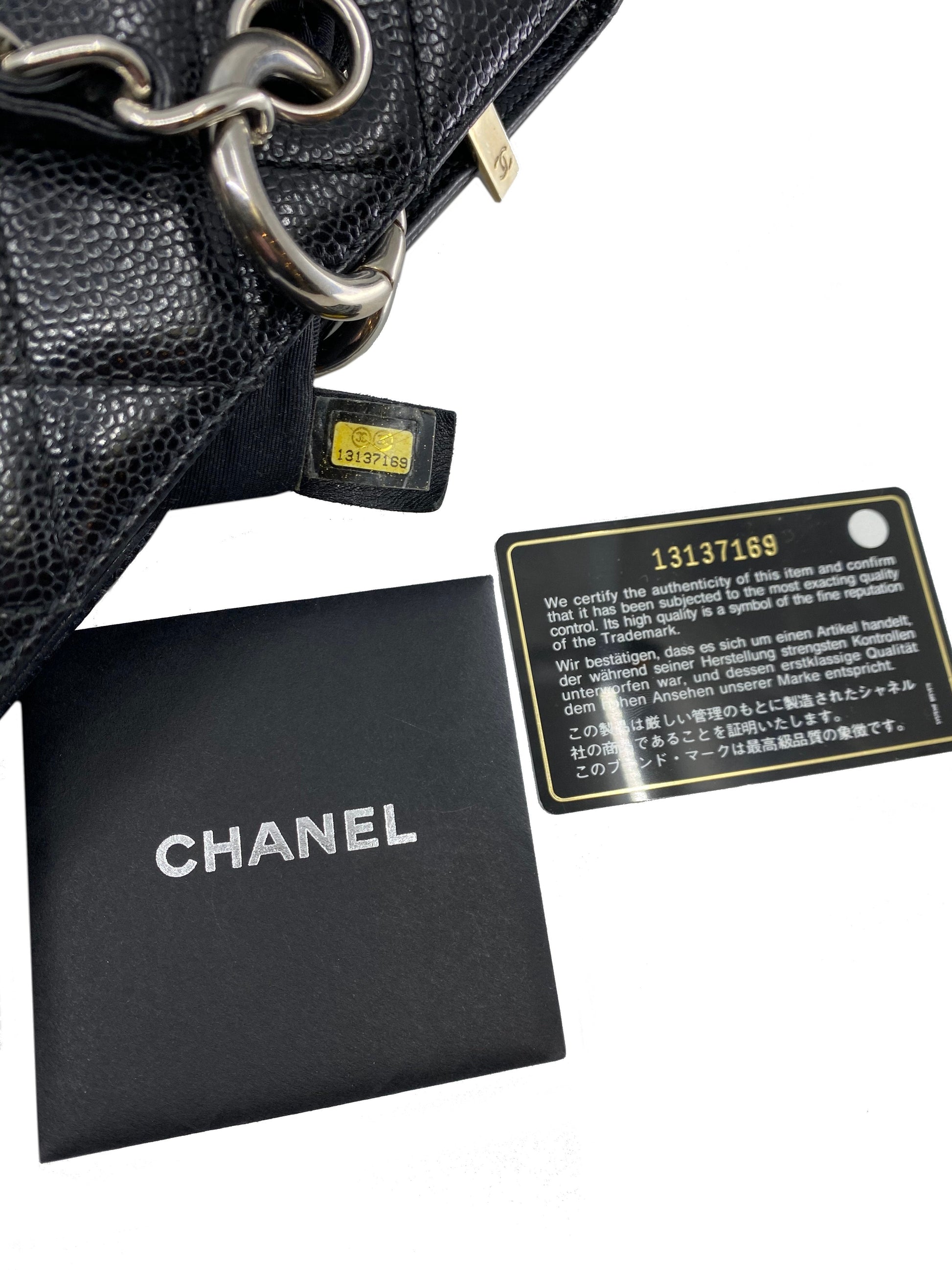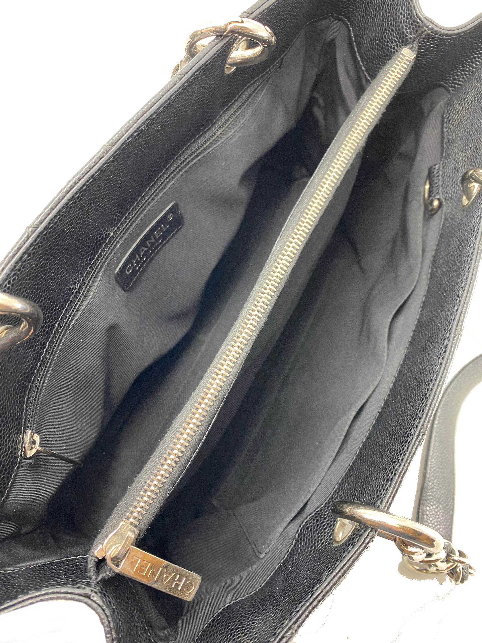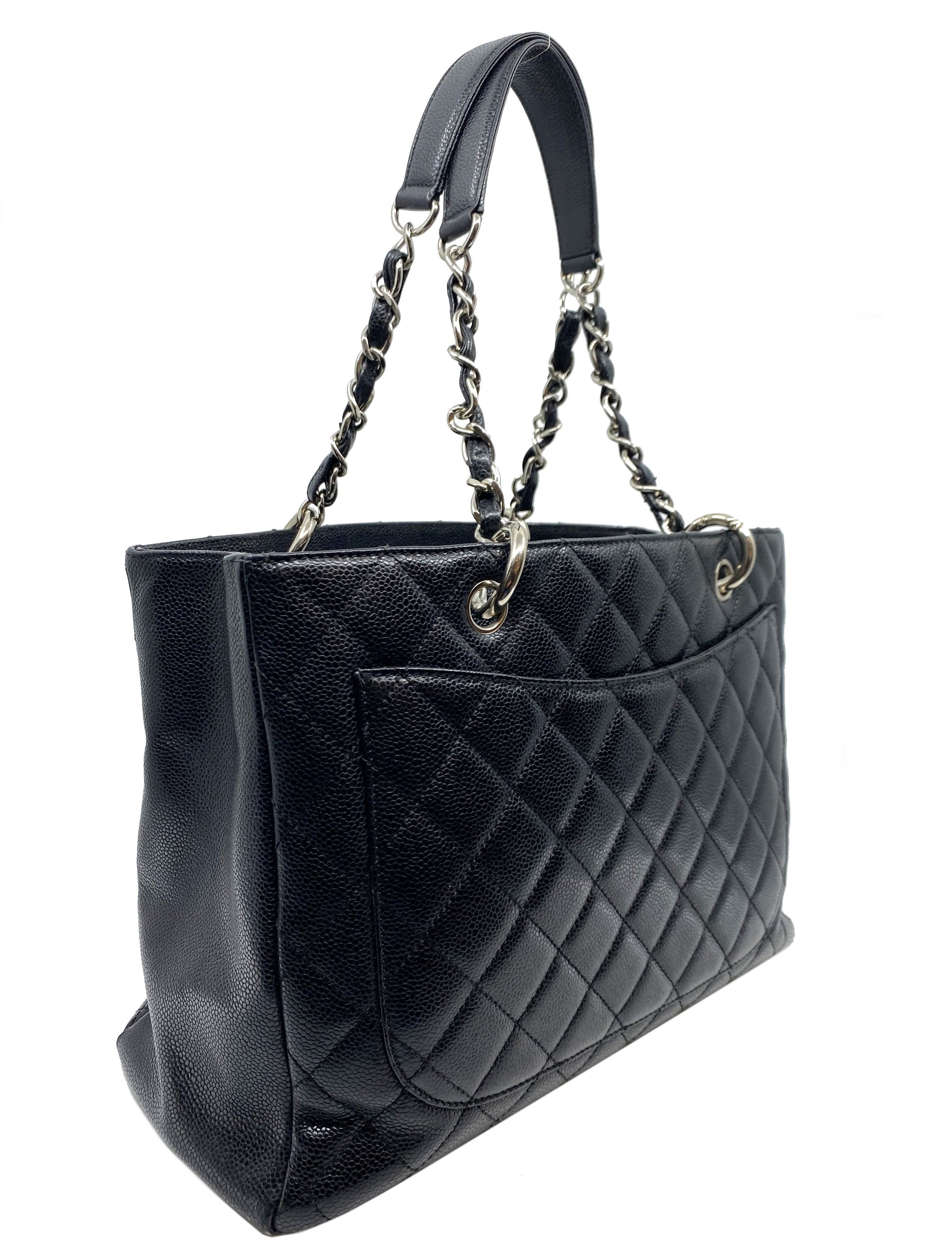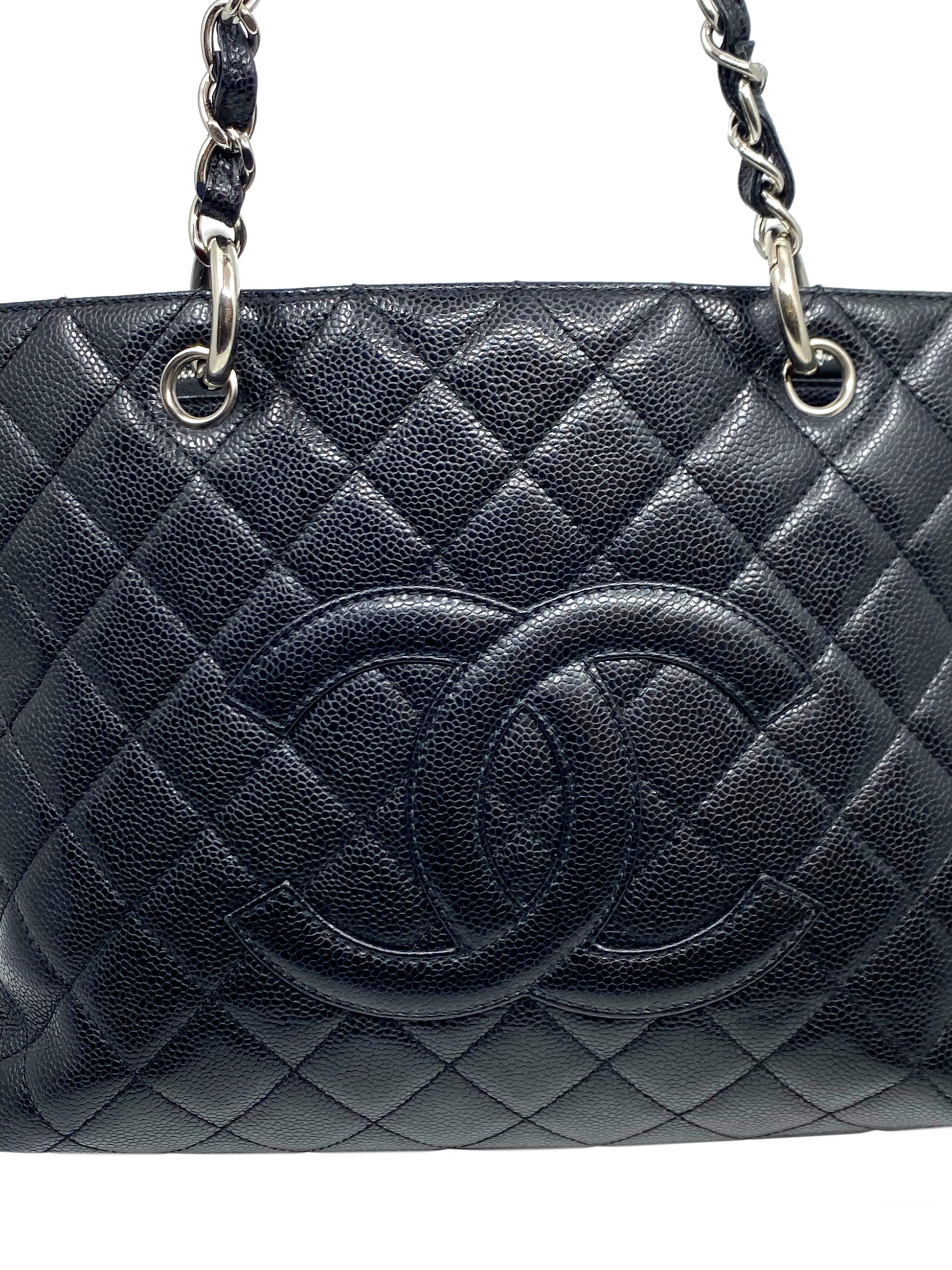 Add to your collection this?d Chanel Caviar Quilted Grand Shopping Tote GST Bag crafted from beautiful?black quilted?caviar leather which continuously increases in value and is from Chanel's classic caviar collection. This?chic and gorgeous bag features a?signature embossed 'CC' logo at center,?elegant silver-tone hardware and dual chain link shoulder straps threaded with red leather.
