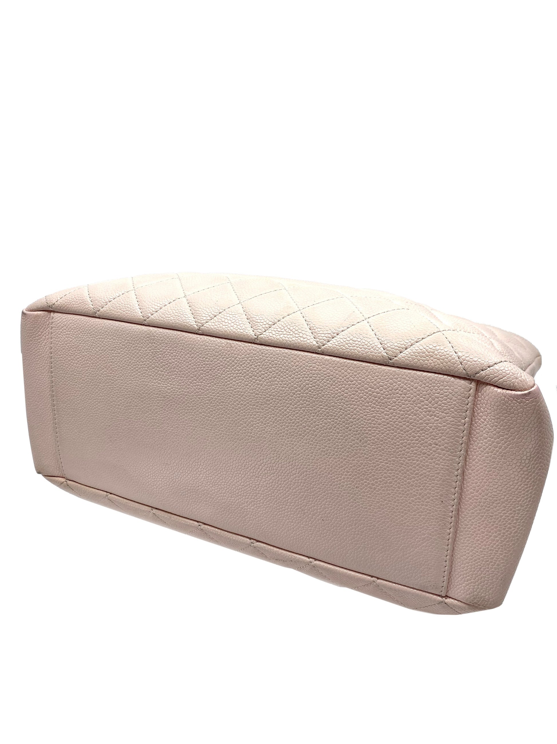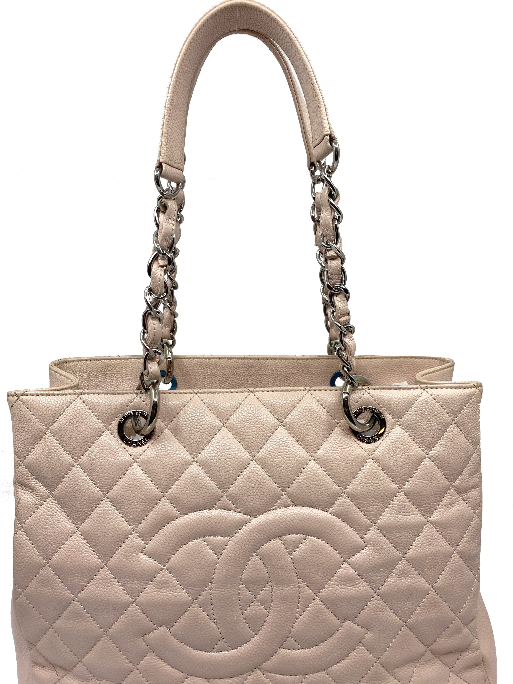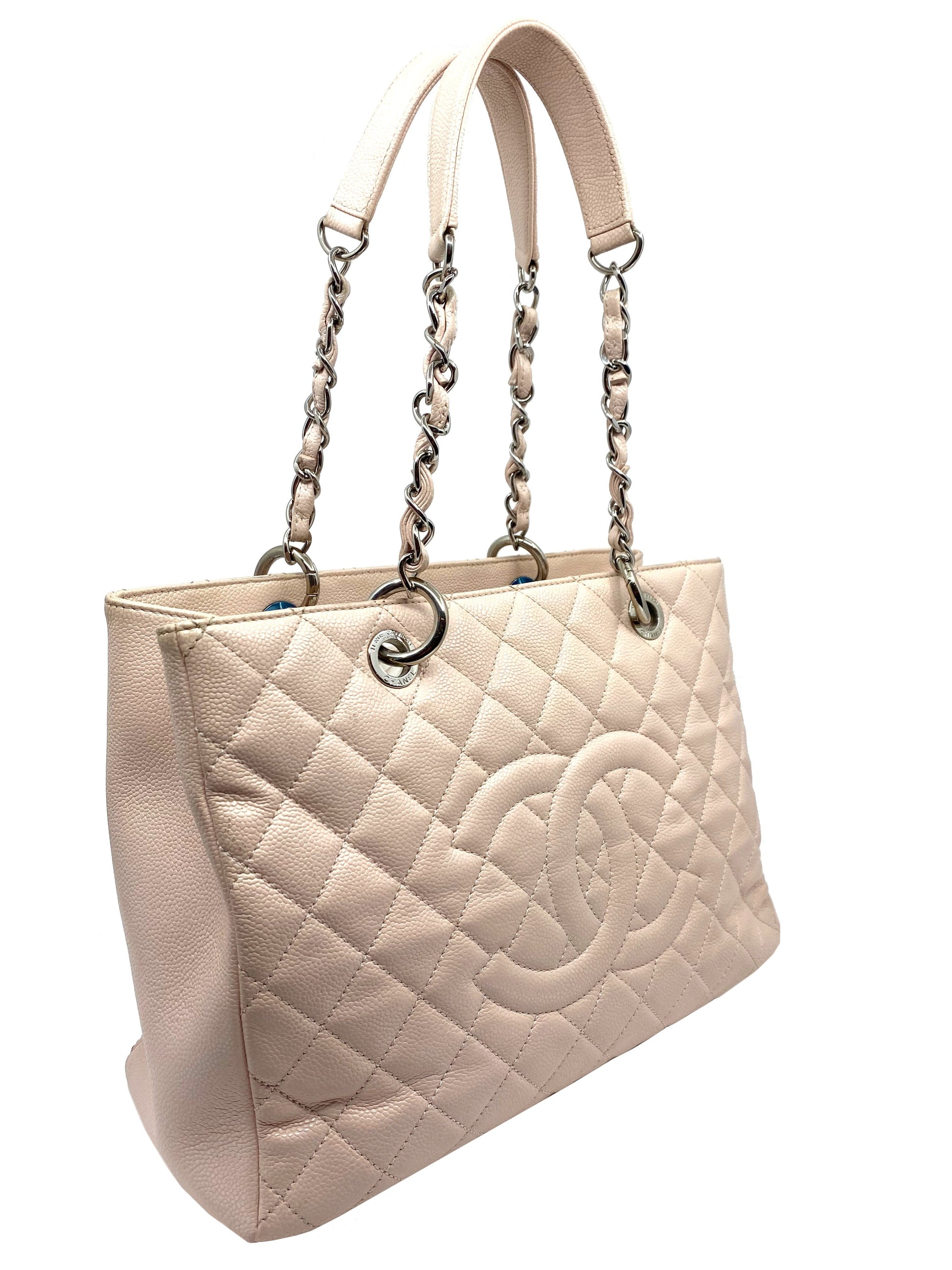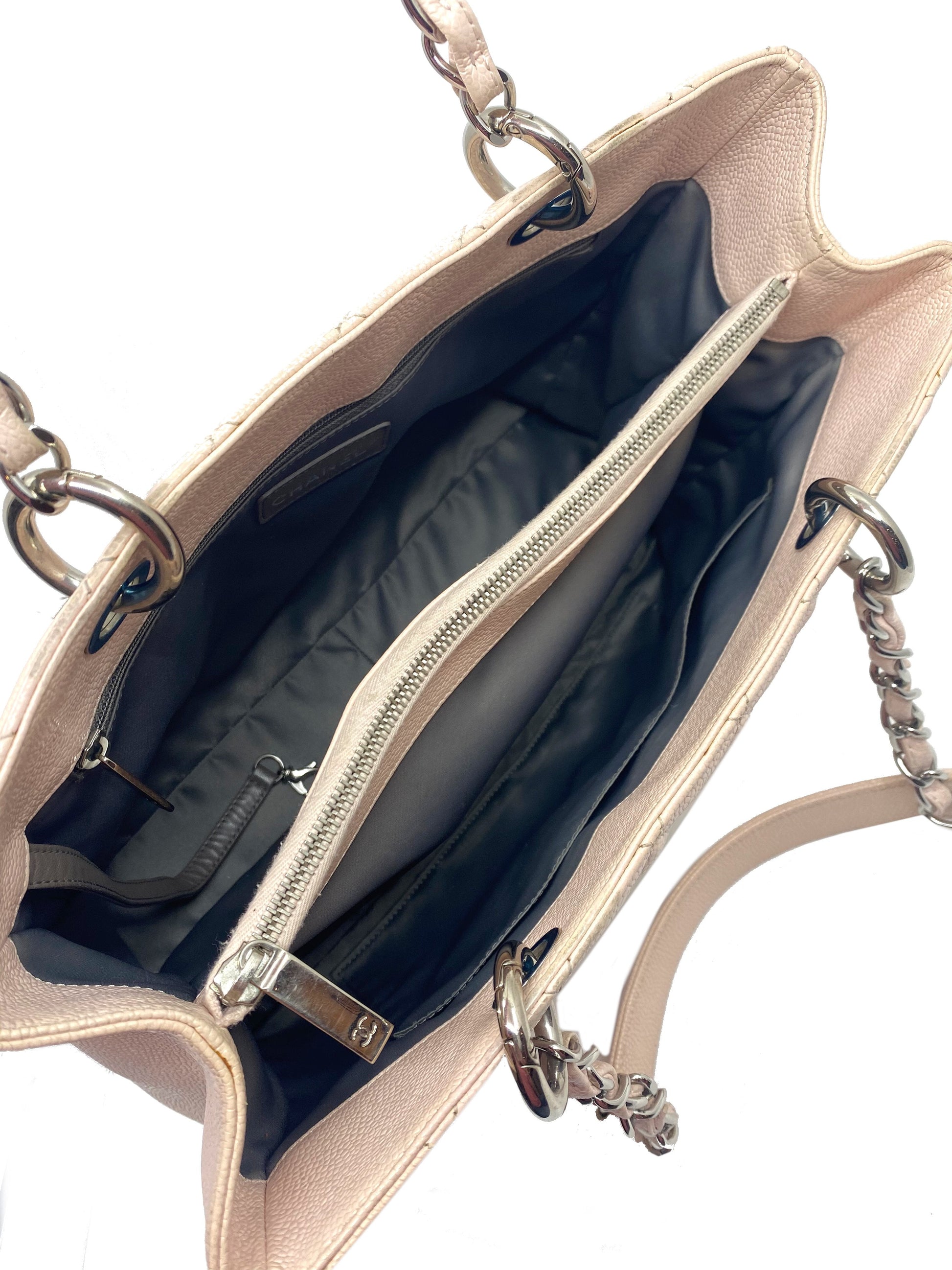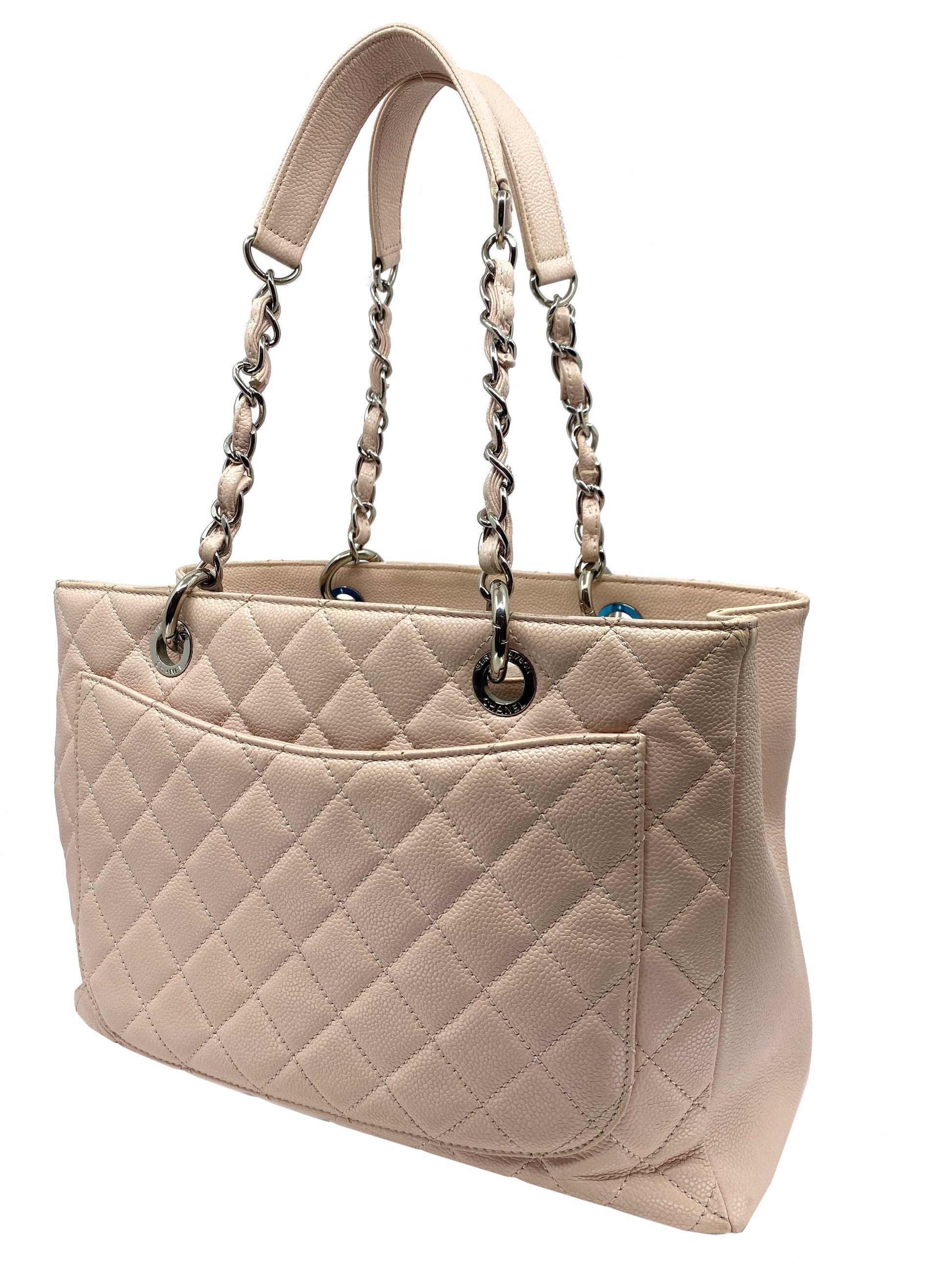 Add to your collection this?d Chanel Caviar Quilted Grand Shopping Tote GST Bag crafted from beautiful?light pink quilted?caviar leather which continuously increases in value and is from Chanel's classic caviar collection. This?chic and gorgeous bag features a?signature embossed 'CC' logo at center,?elegant silver-tone hardware and dual chain link shoulder straps threaded with?beige?leather.