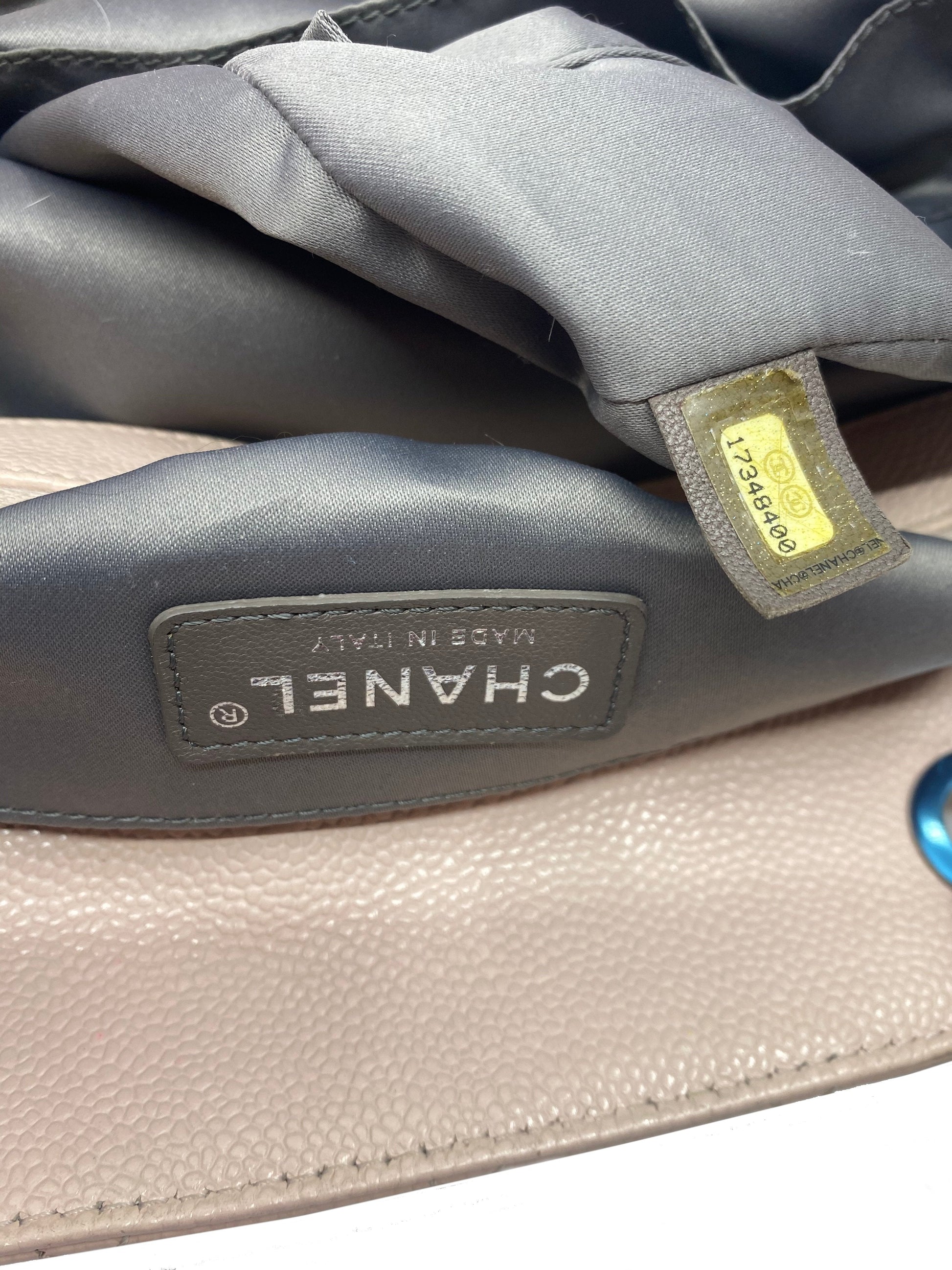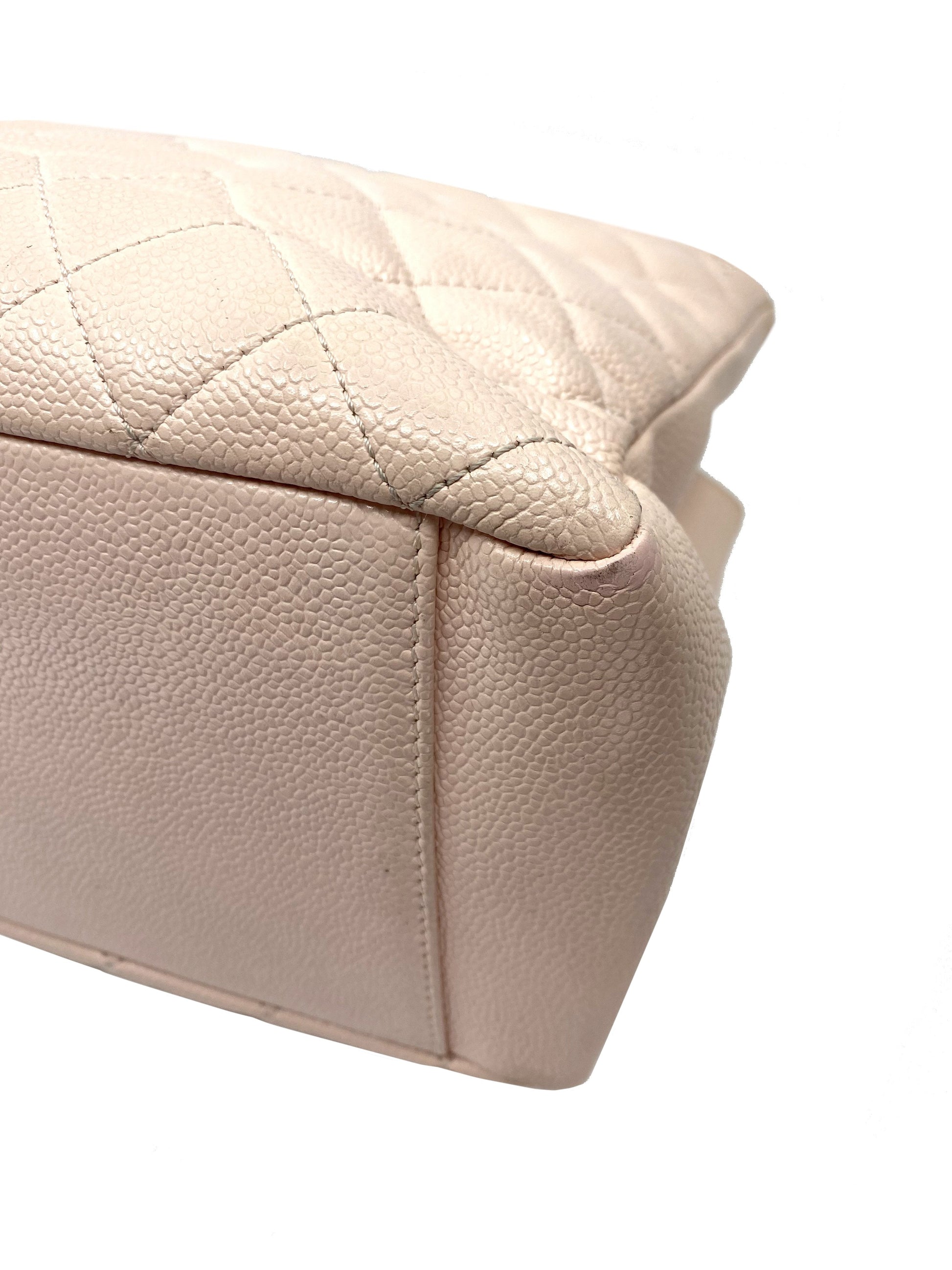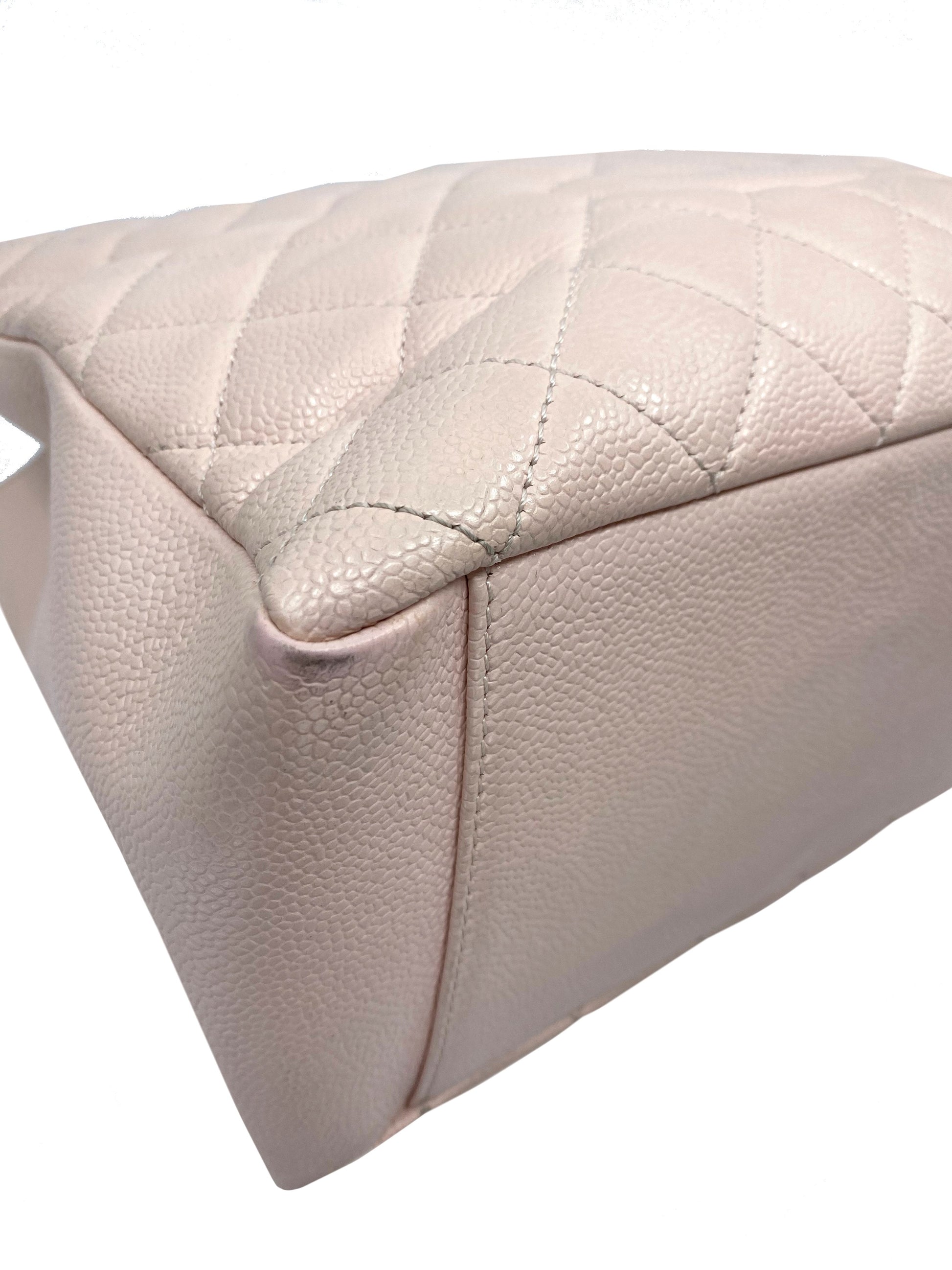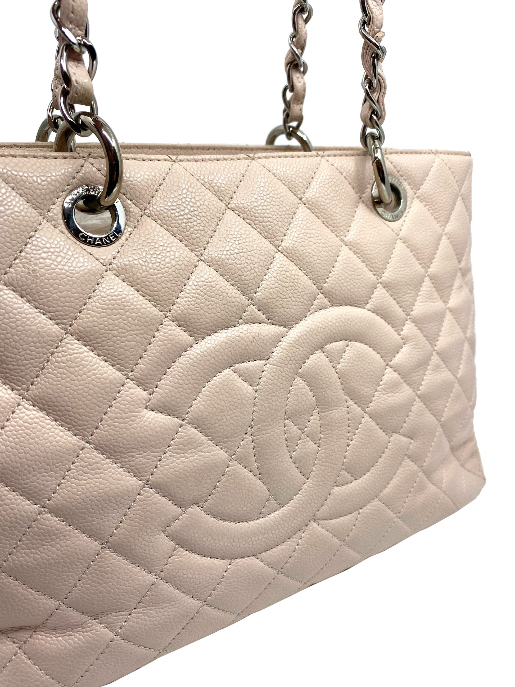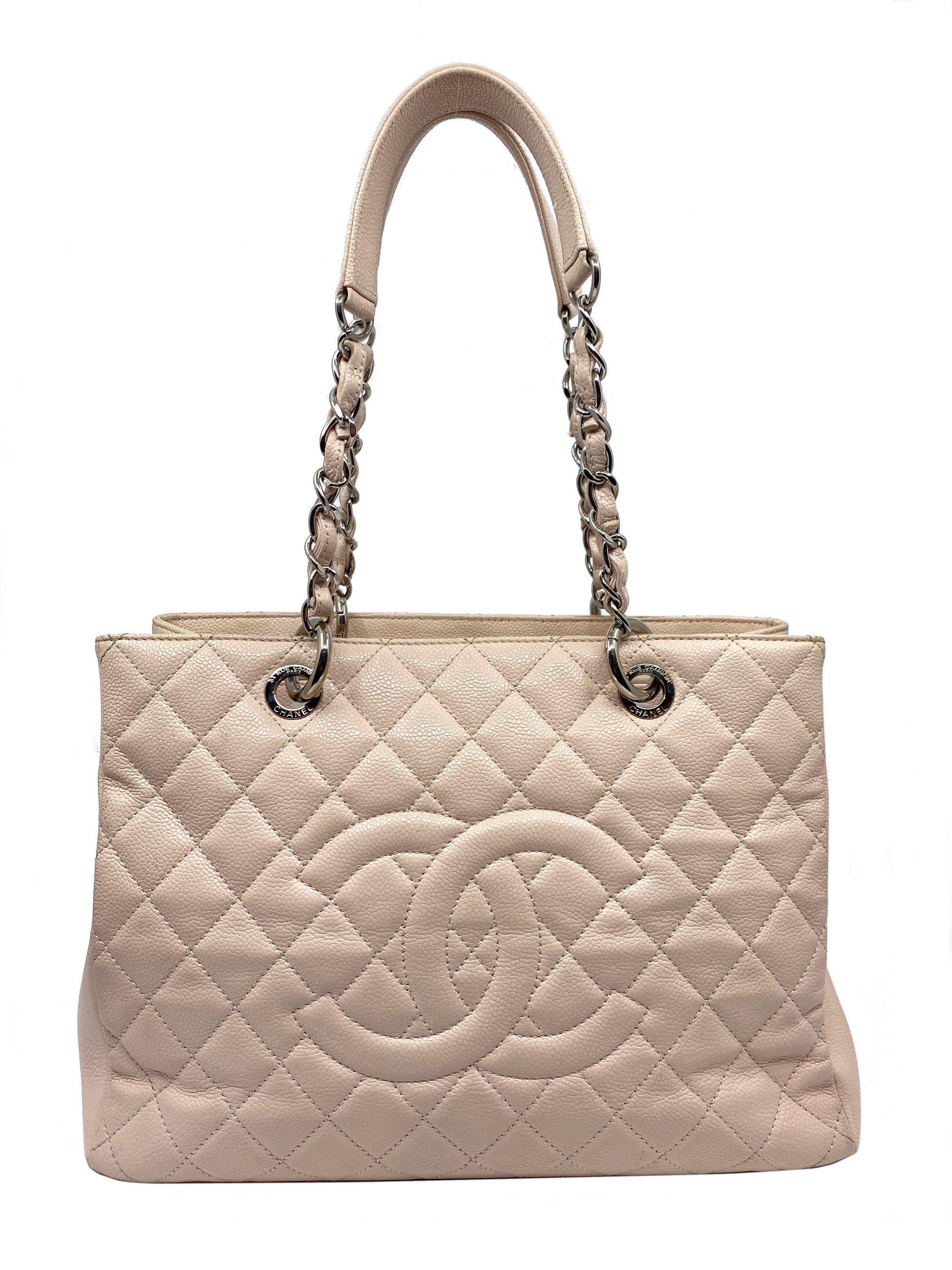 Add to your collection this?d Chanel Caviar Quilted Grand Shopping Tote GST Bag crafted from beautiful?light pink quilted?caviar leather which continuously increases in value and is from Chanel's classic caviar collection. This?chic and gorgeous bag features a?signature embossed 'CC' logo at center,?elegant silver-tone hardware and dual chain link shoulder straps threaded with?beige?leather.