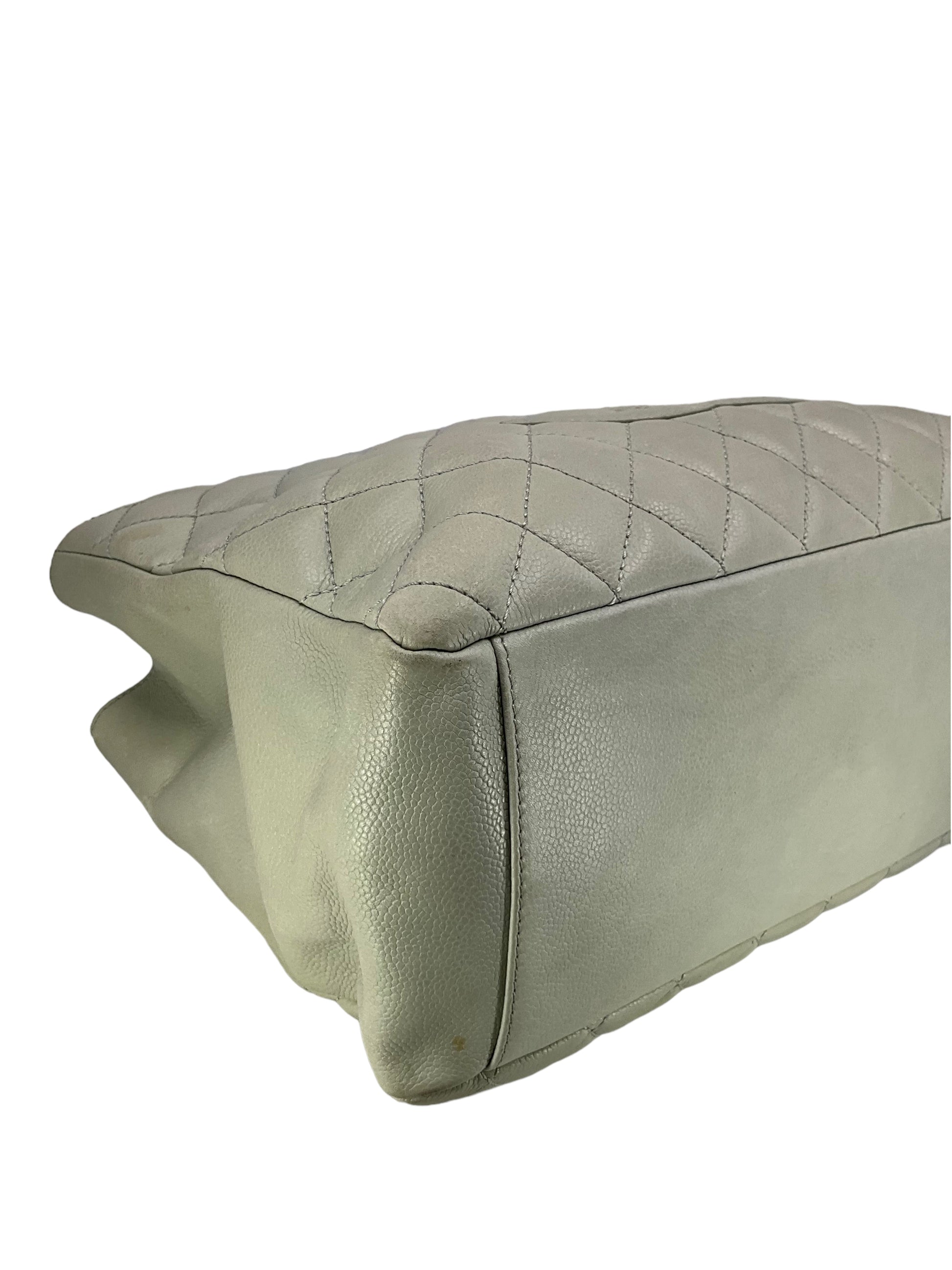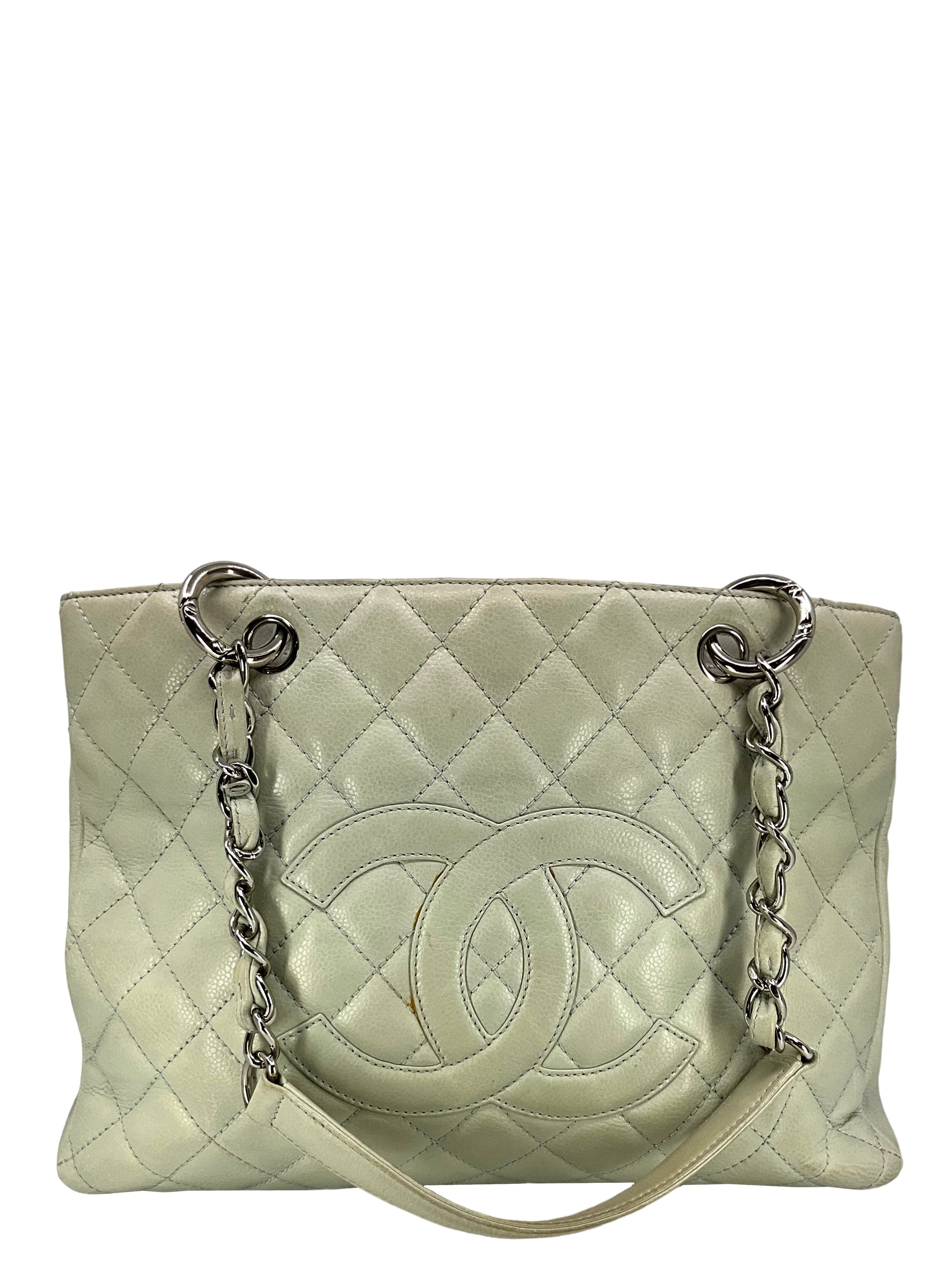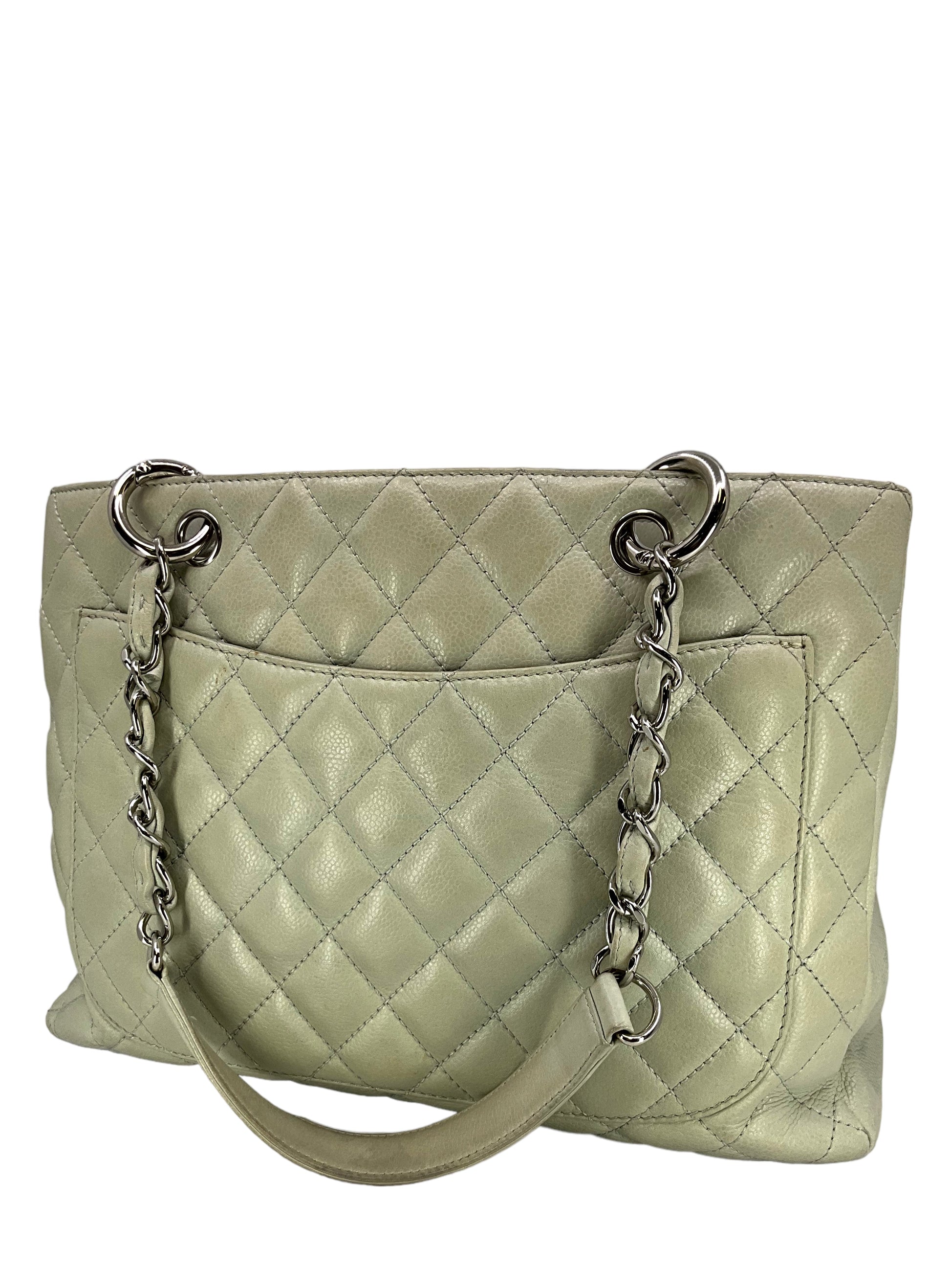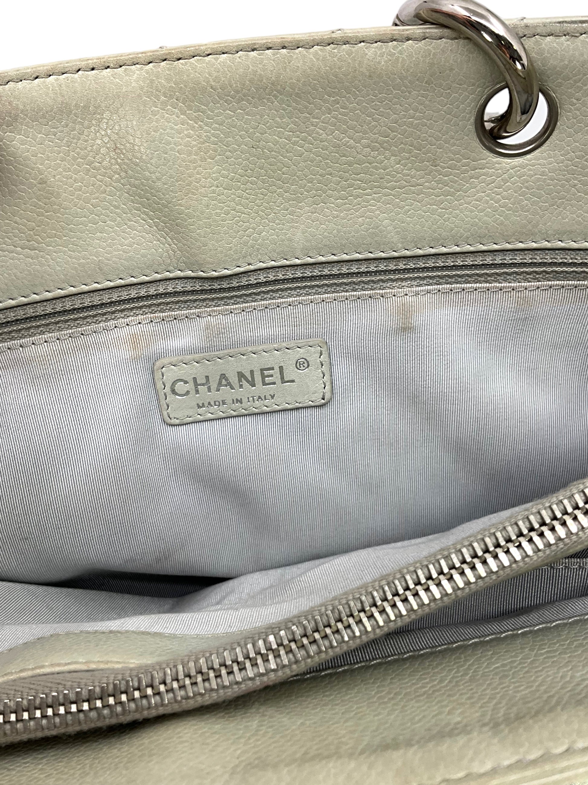 Add to your collection this?d Chanel Caviar Quilted Grand Shopping Tote GST Bag crafted from beautiful?gray/green quilted?caviar leather which continuously increases in value and is from Chanel's classic caviar collection. This?chic and gorgeous bag features a?signature embossed 'CC' logo at center,?elegant silver-tone hardware and dual chain link shoulder straps threaded with red leather.