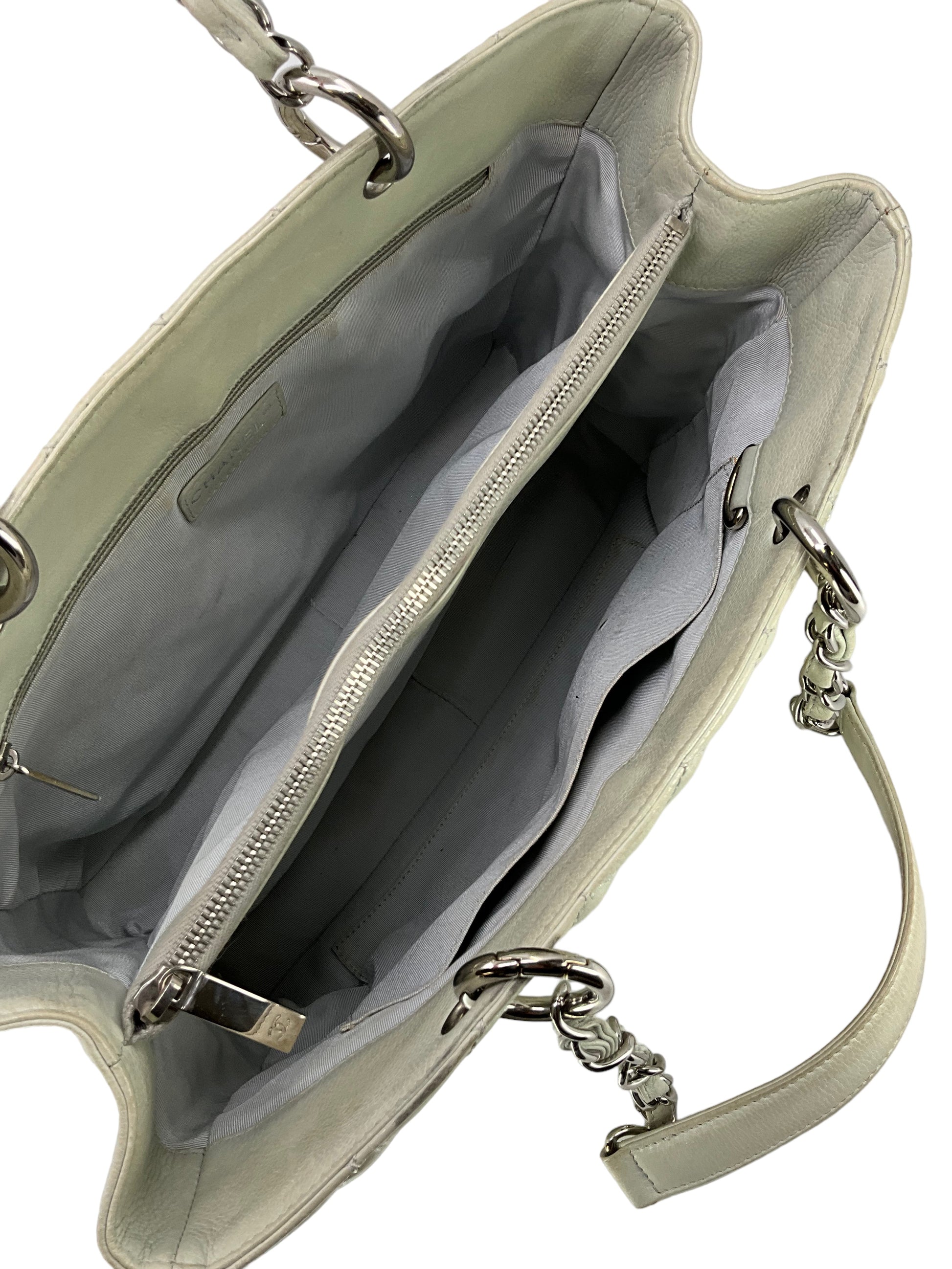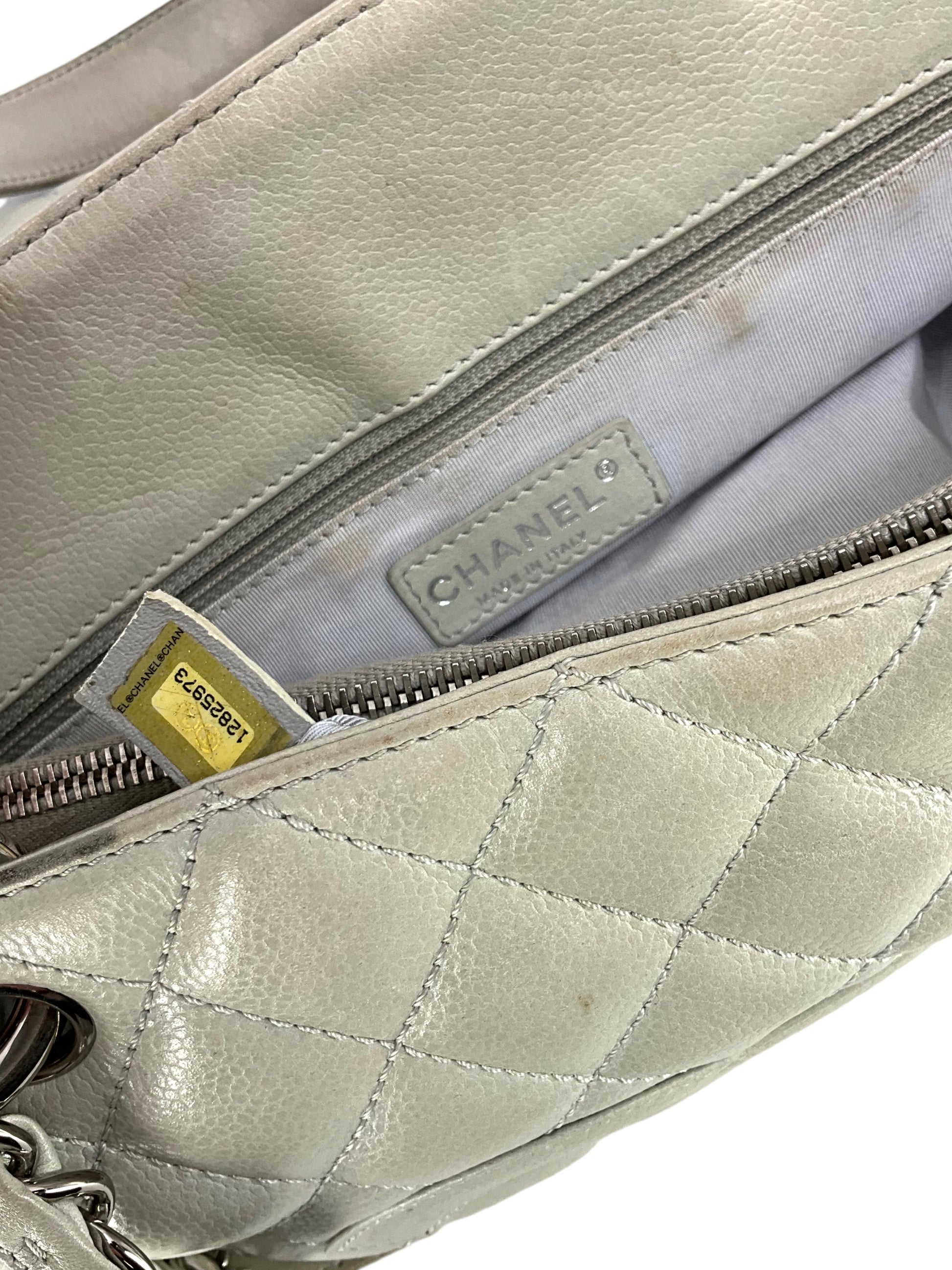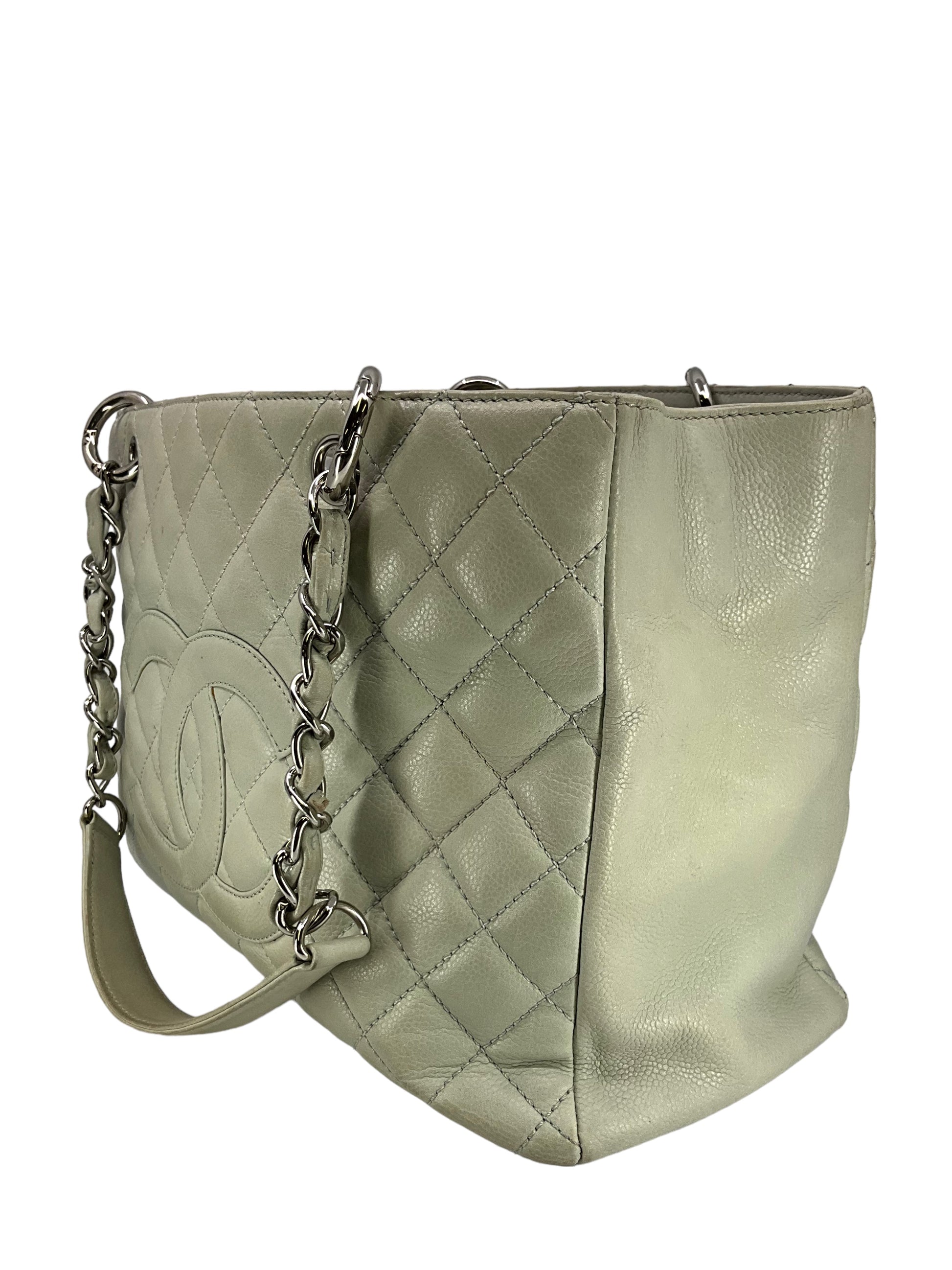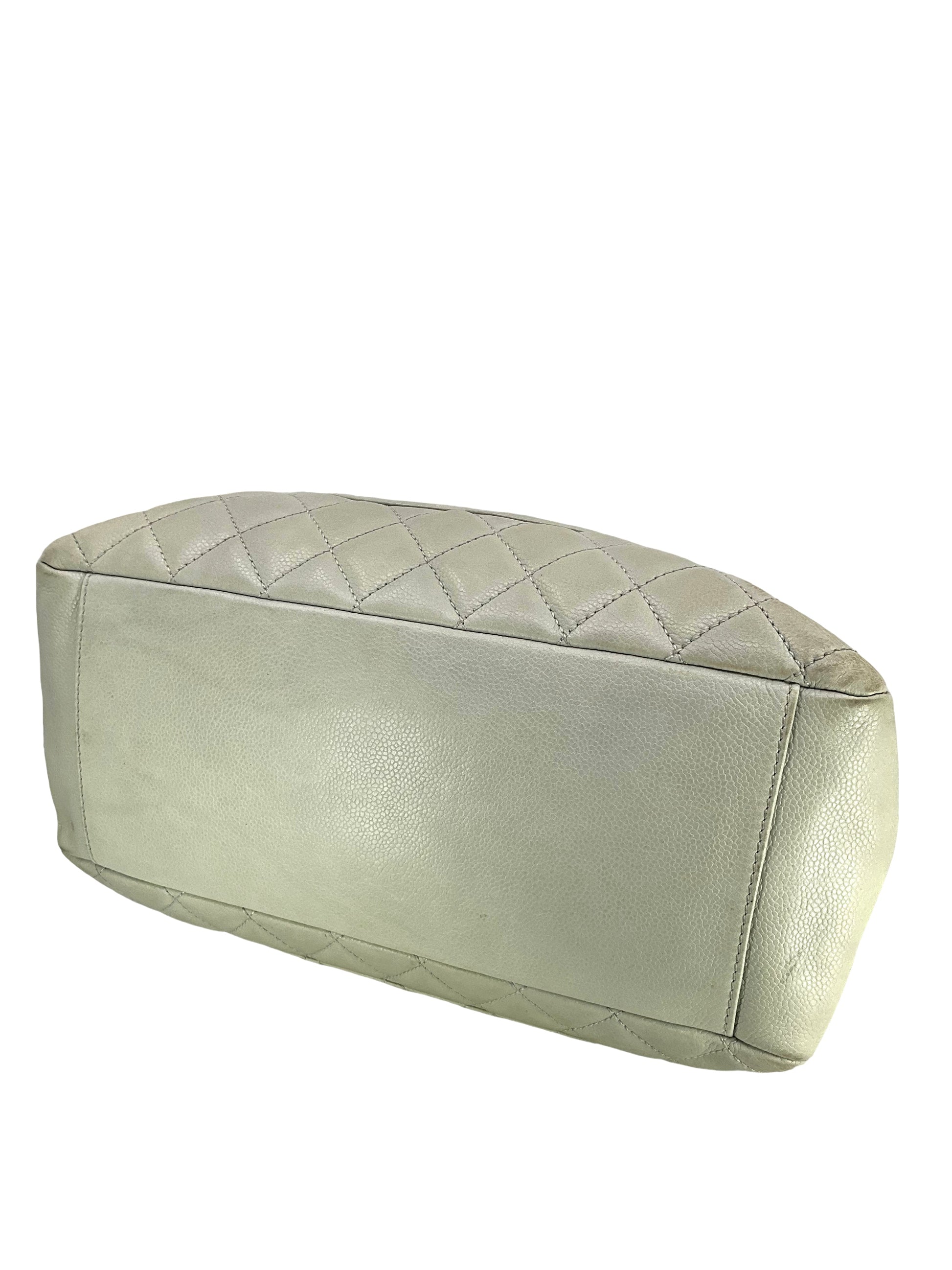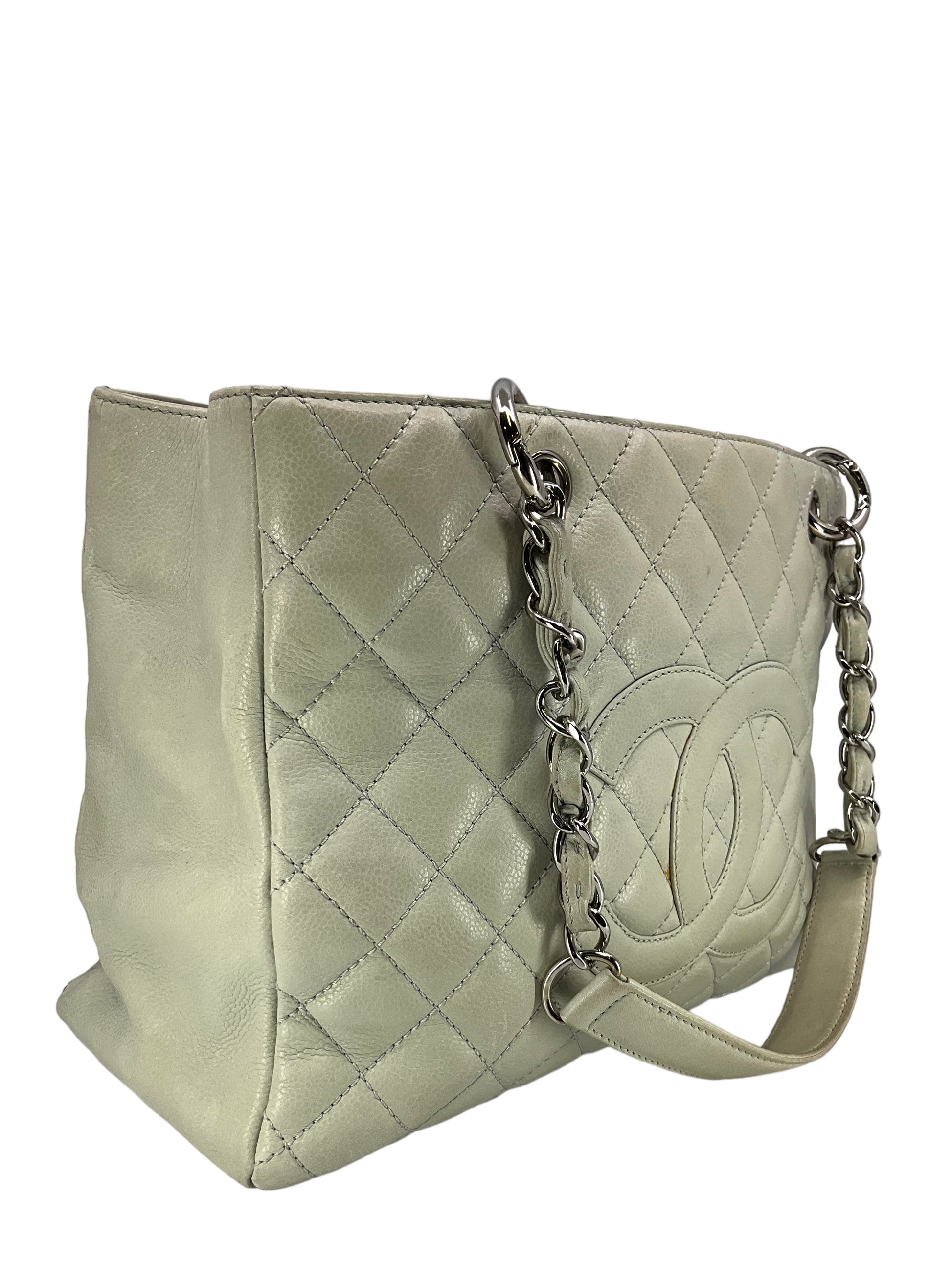 Add to your collection this?d Chanel Caviar Quilted Grand Shopping Tote GST Bag crafted from beautiful?gray/green quilted?caviar leather which continuously increases in value and is from Chanel's classic caviar collection. This?chic and gorgeous bag features a?signature embossed 'CC' logo at center,?elegant silver-tone hardware and dual chain link shoulder straps threaded with red leather.