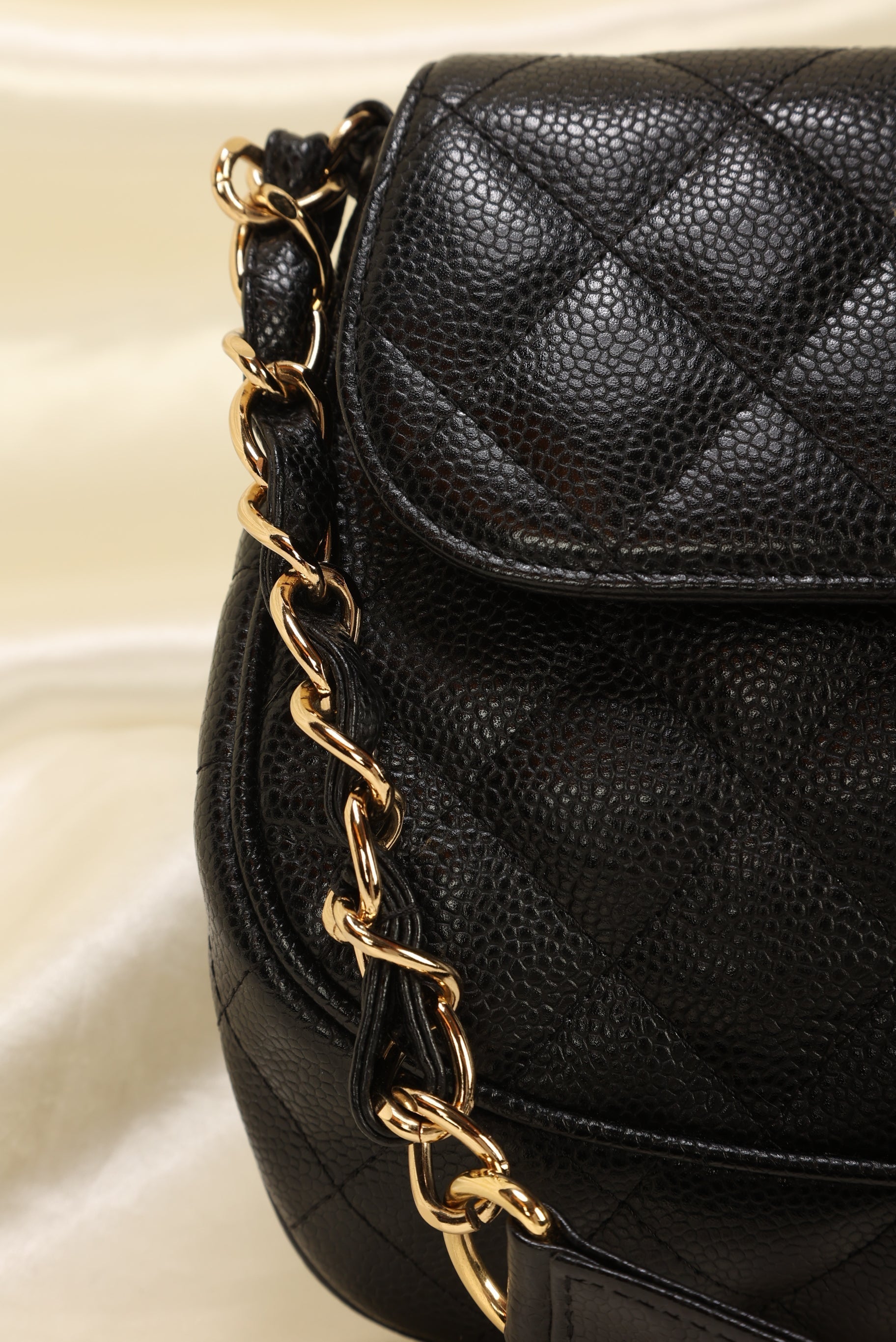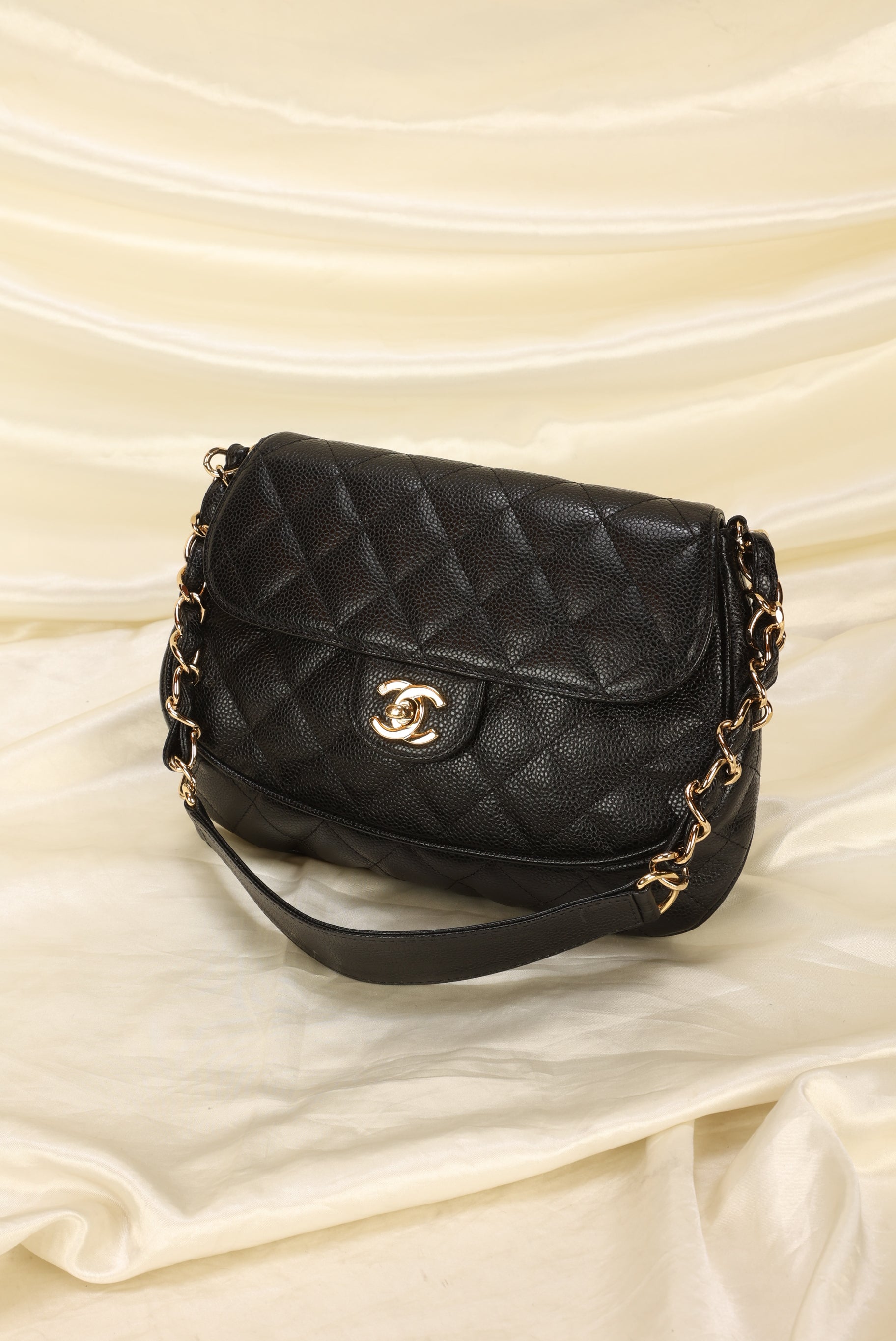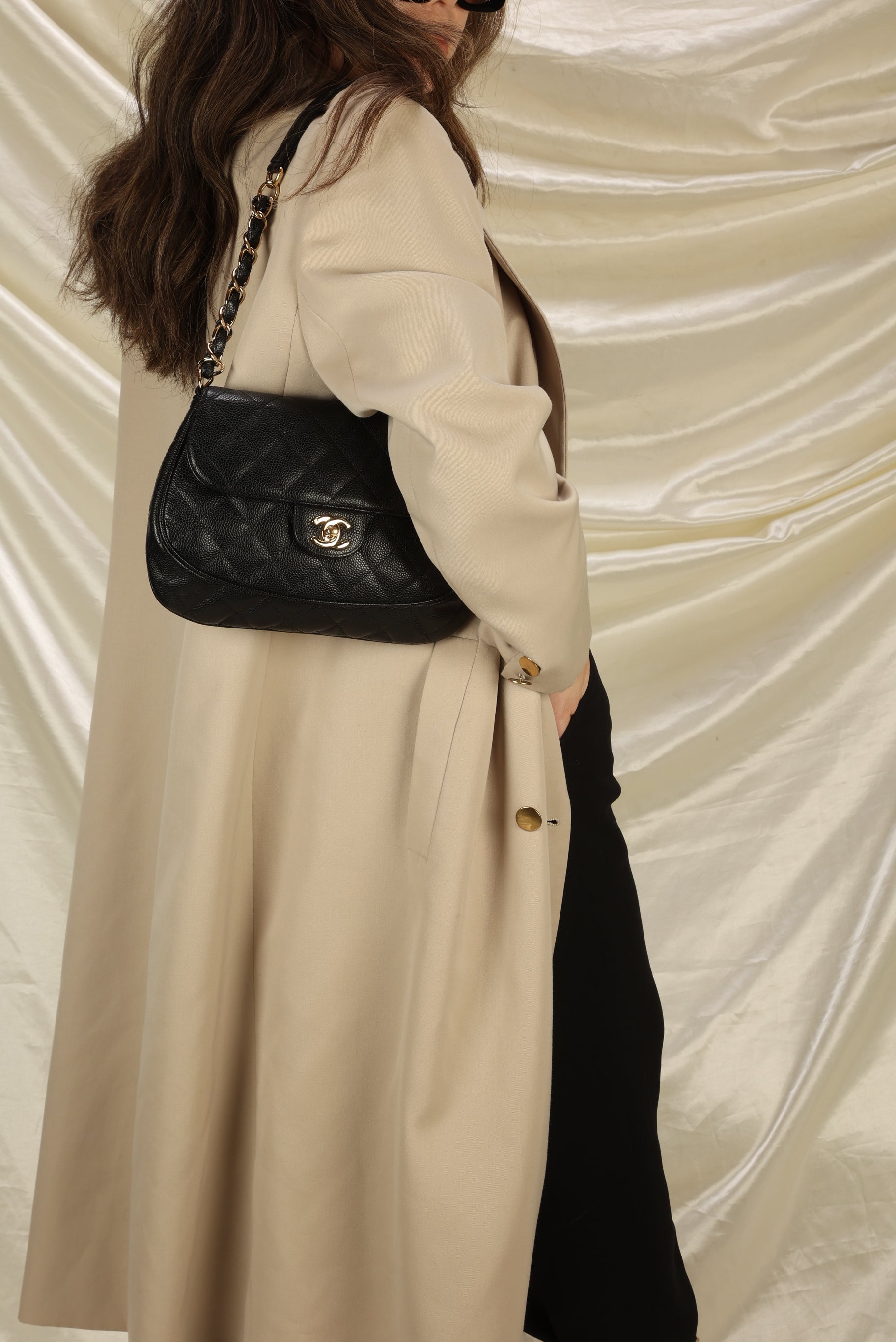 Bringing to the shop an extremely rare Chanel caviar flap bag. This bag has a classic, yet modern twist. Reminiscent in shape to the extremely popular Prada Cleo, yet classic in style to the highly coveted Chanel classic flaps, this bag is one you want to add to your collection. The caviar material allows for more durability. Vintage piece = 24K gold plated hardware, not currently available anywhere online!