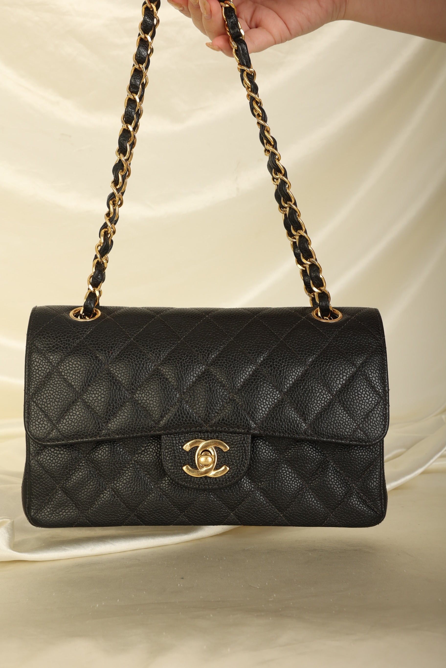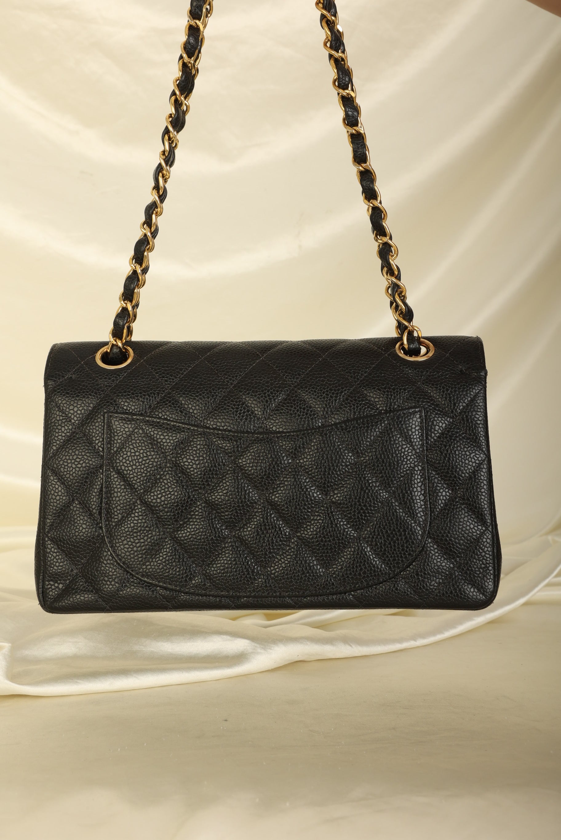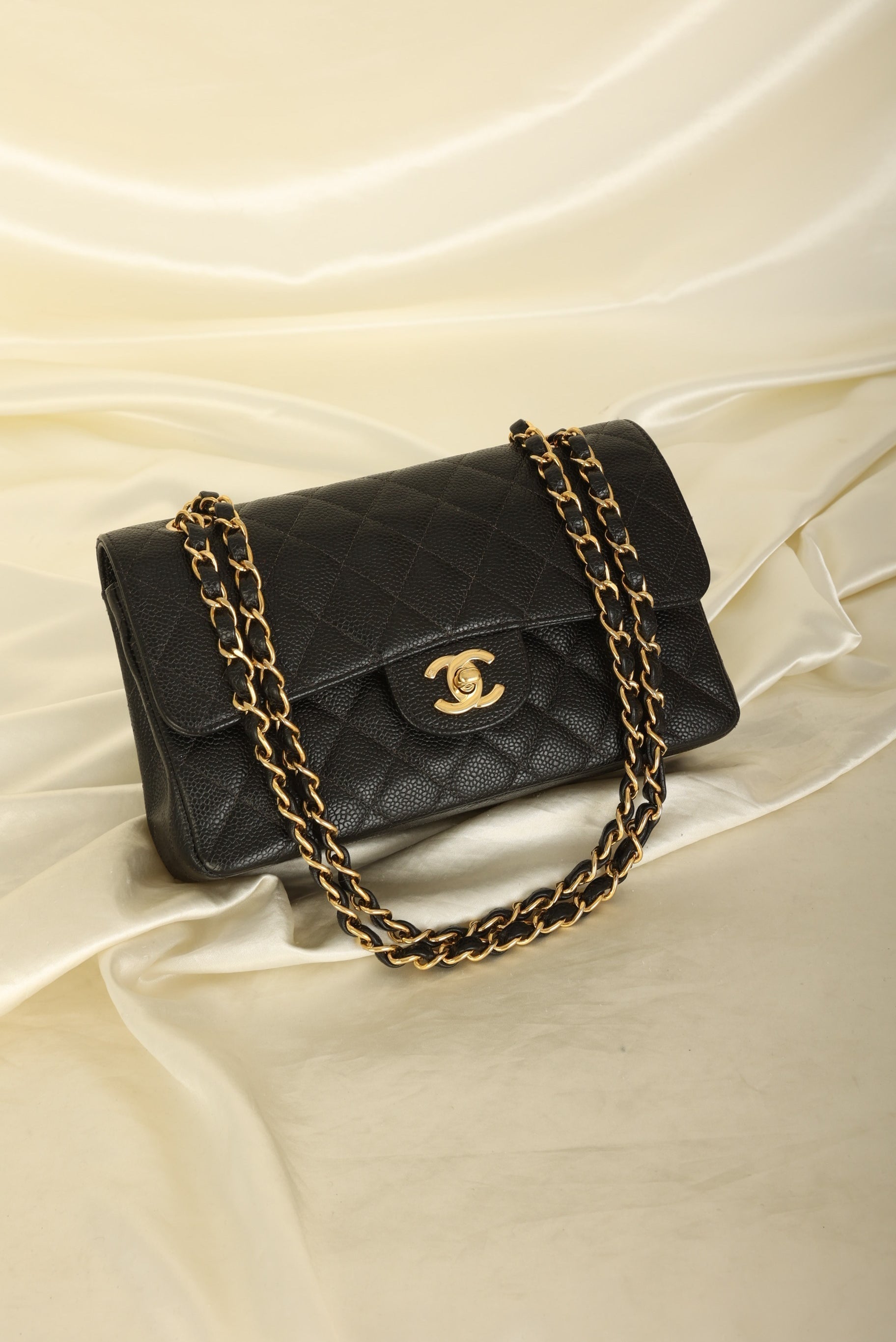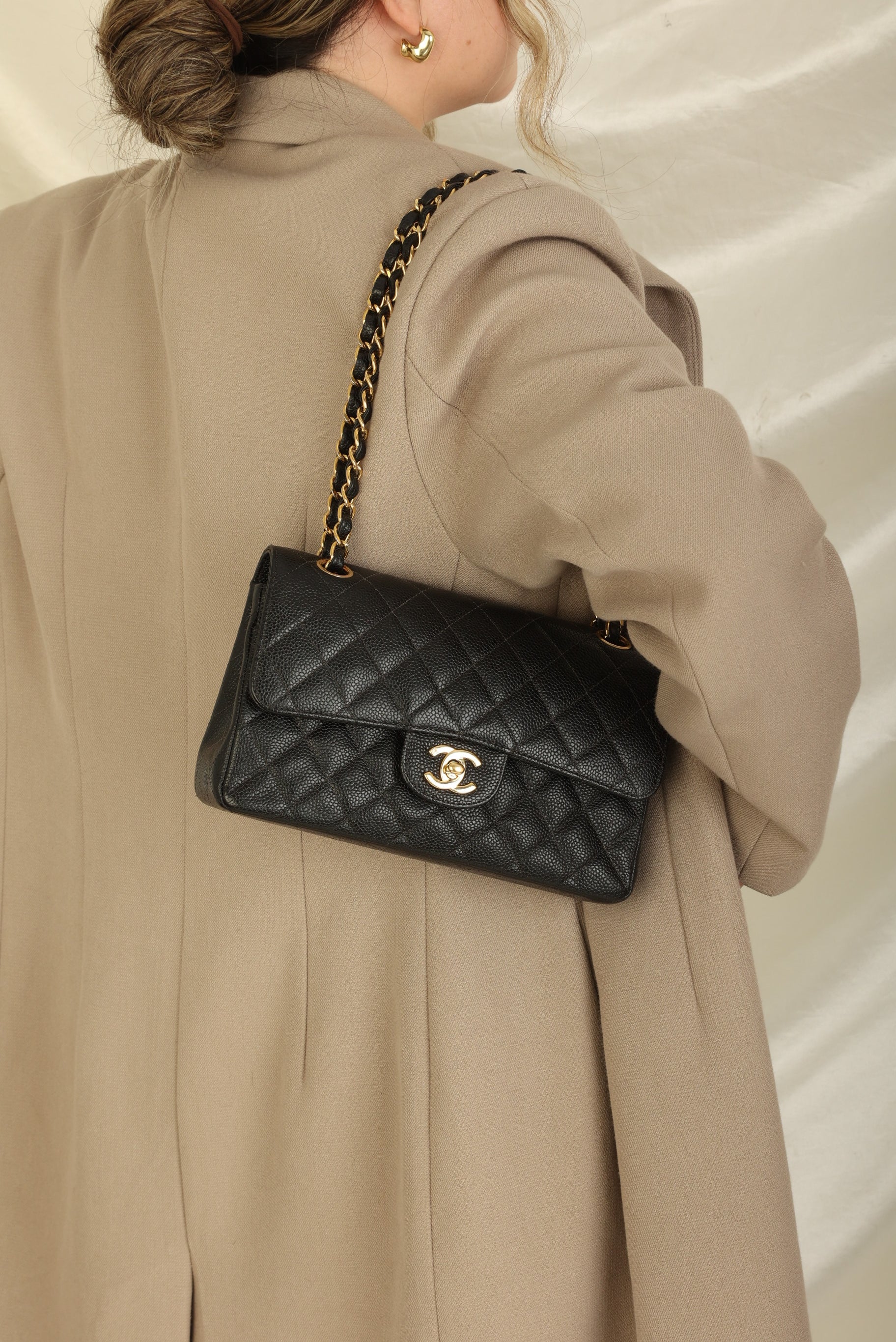 Twin with me! My favorite style by Chanel, the Classic Double Flap! This piece is crafted with the coveted black and gold combo- caviar leather and 24k gold plated hardware. This piece is extremely difficult to come by at this and color combo.??This bag can go for between 9k-10k on the resale market. Extremely versatile piece can be as a??long or short??shoulder bag and can fit all of your daily essentials!??