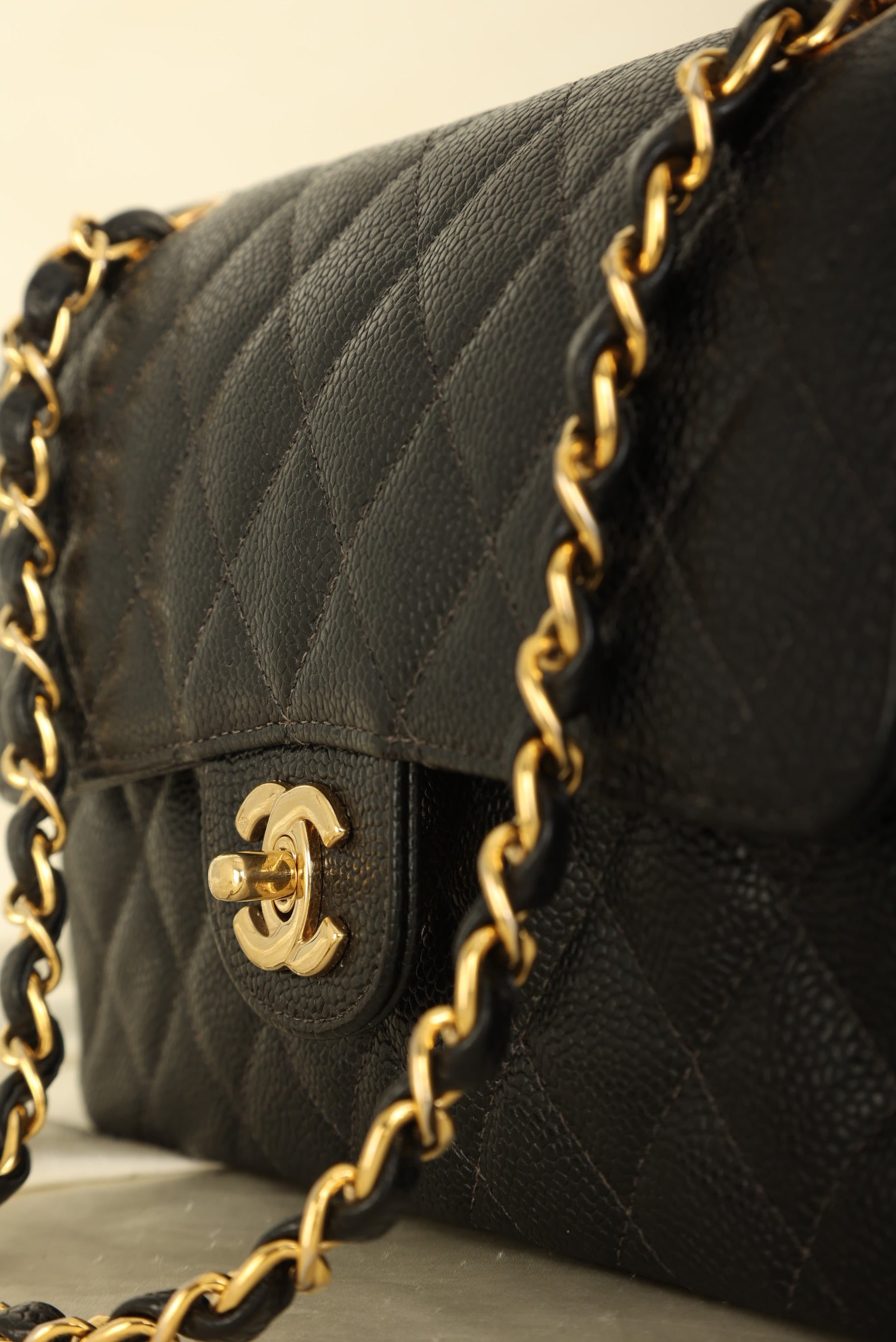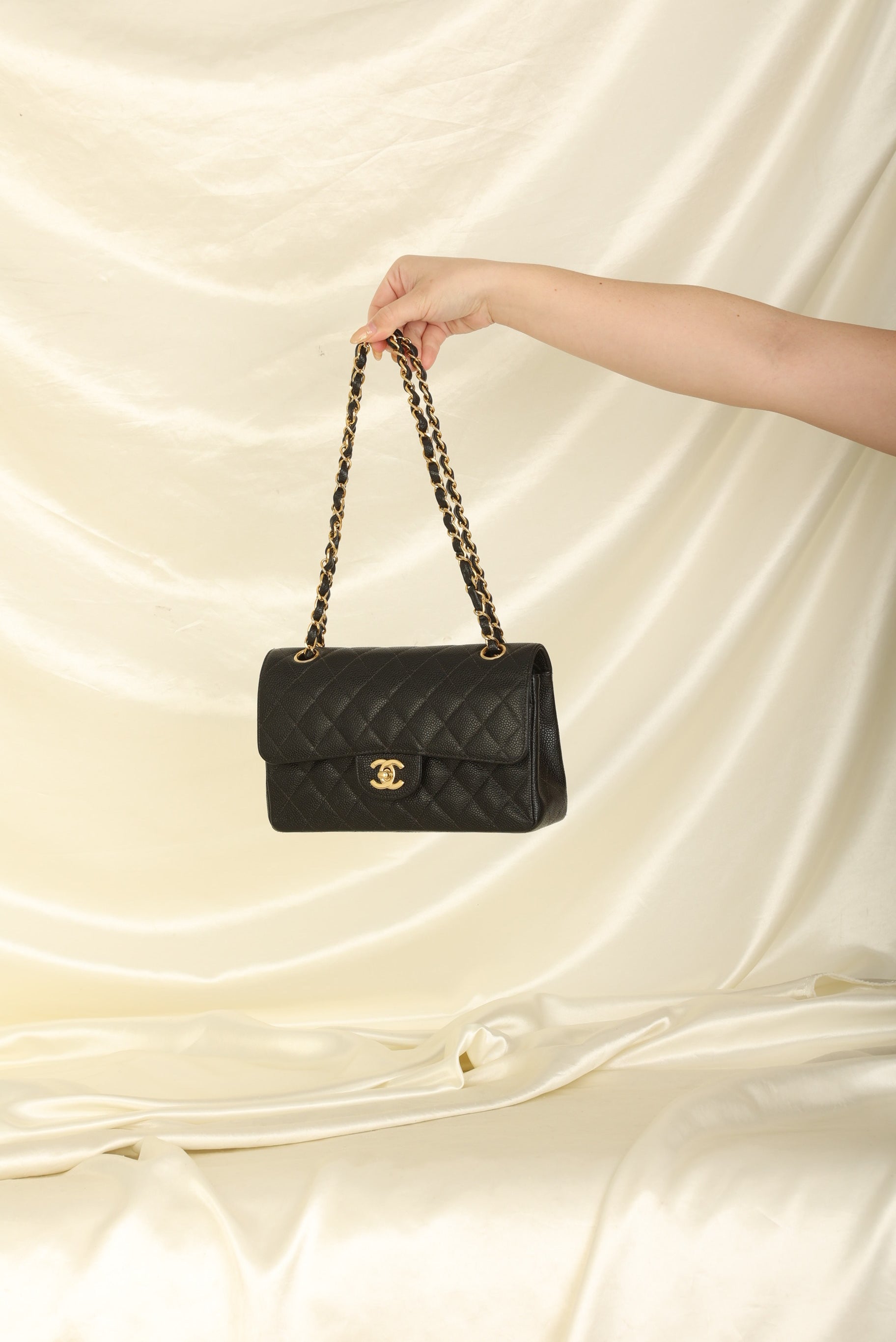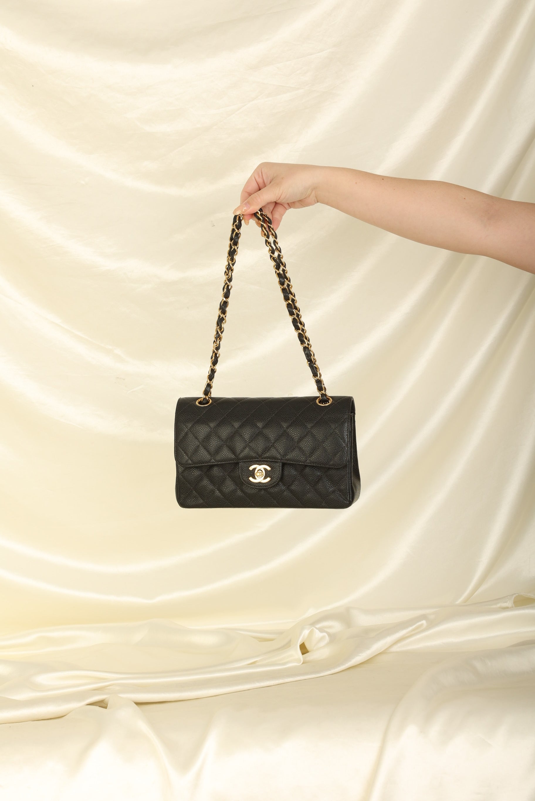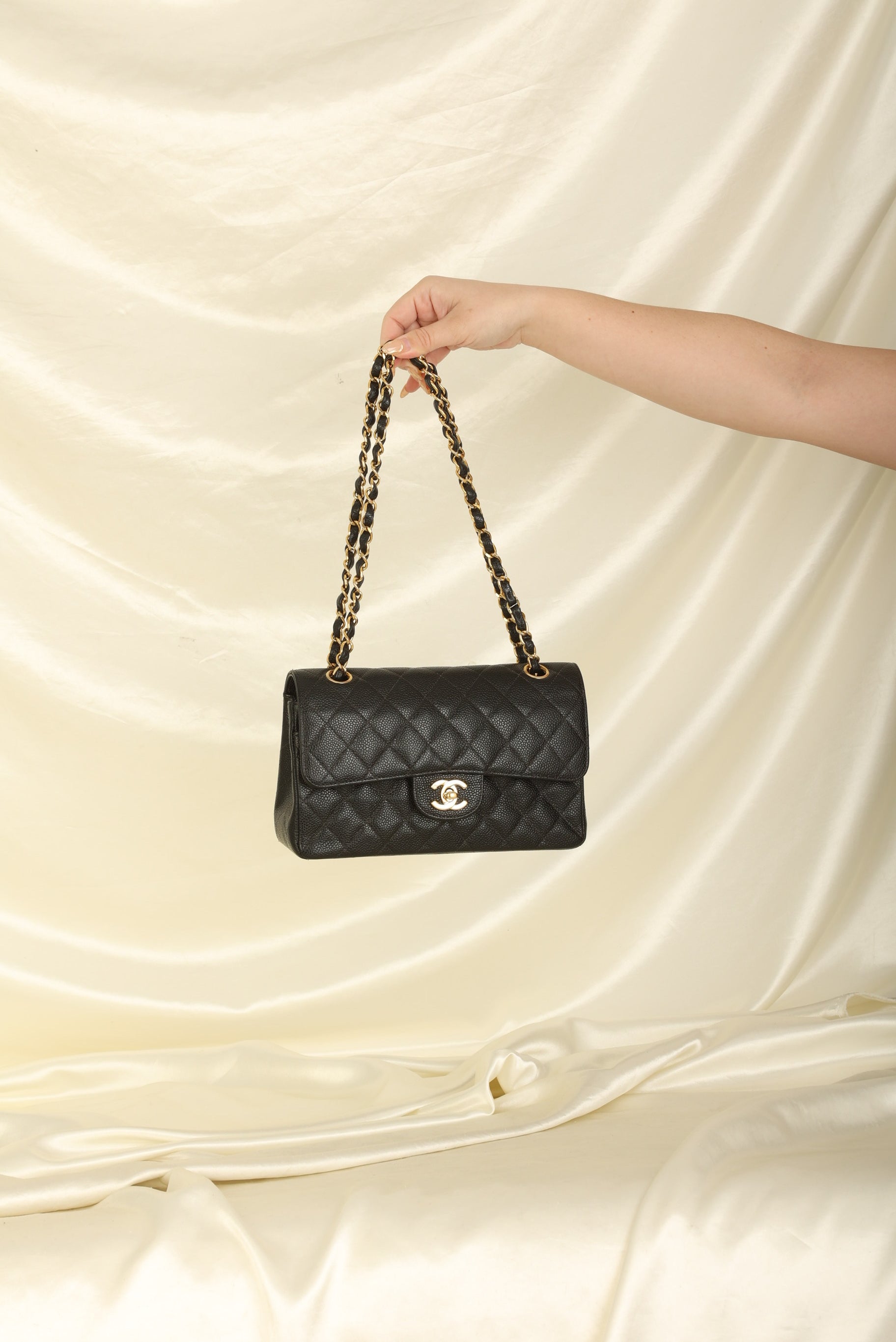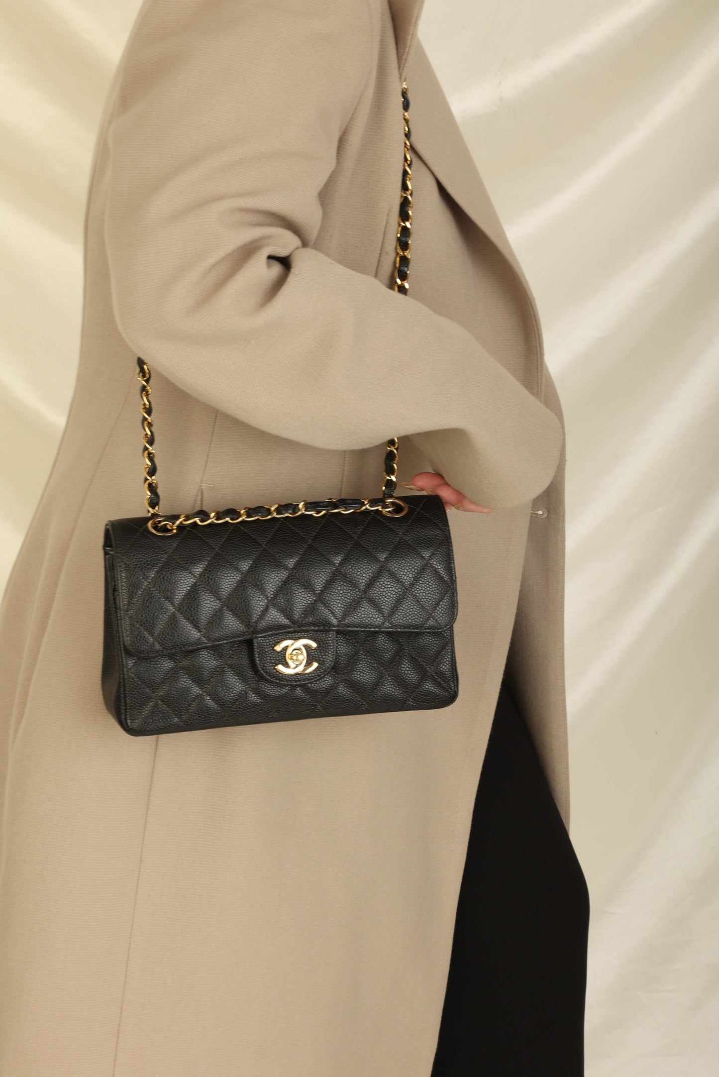 Twin with me! My favorite style by Chanel, the Classic Double Flap! This piece is crafted with the coveted black and gold combo- caviar leather and 24k gold plated hardware. This piece is extremely difficult to come by at this and color combo.??This bag can go for between 9k-10k on the resale market. Extremely versatile piece can be as a??long or short??shoulder bag and can fit all of your daily essentials!??